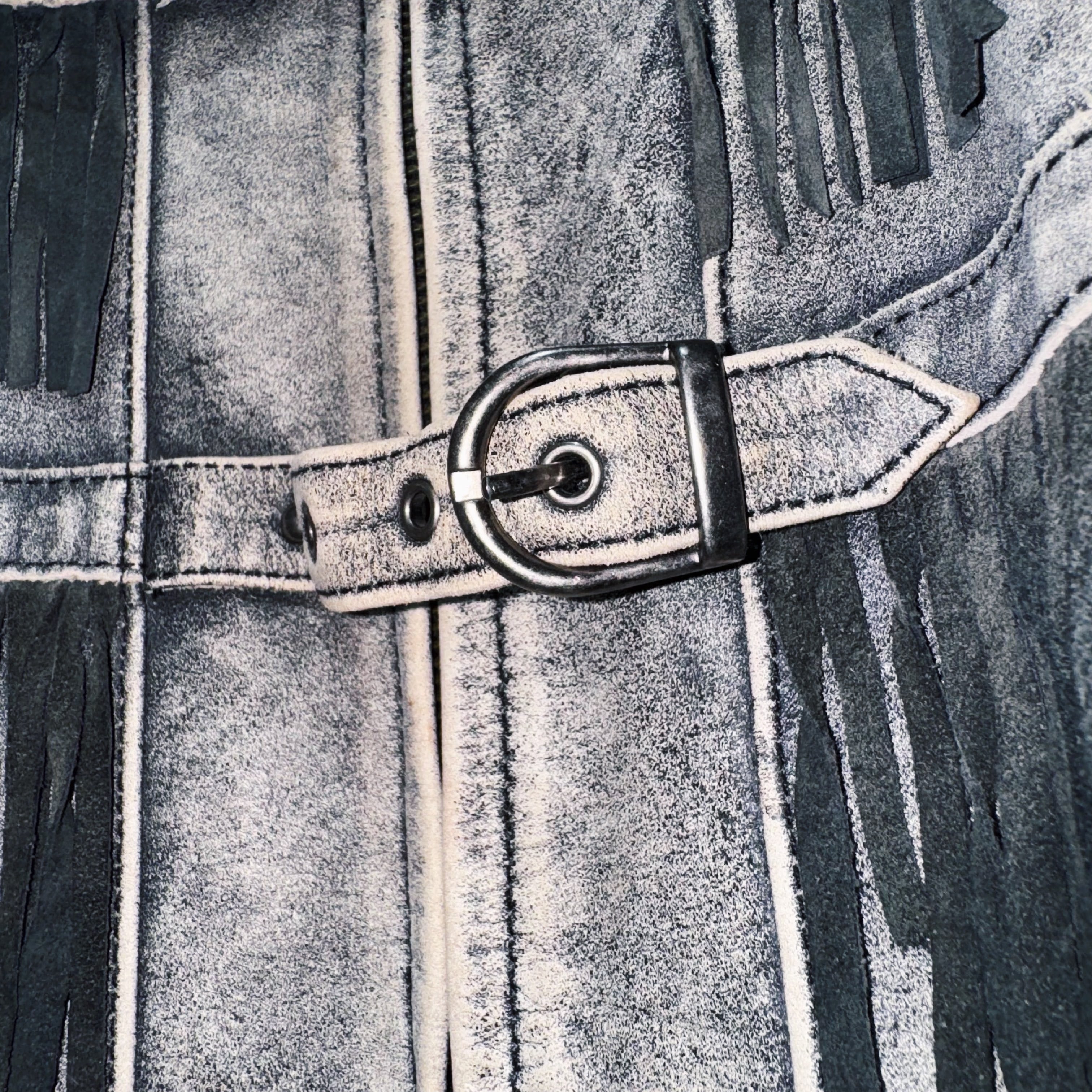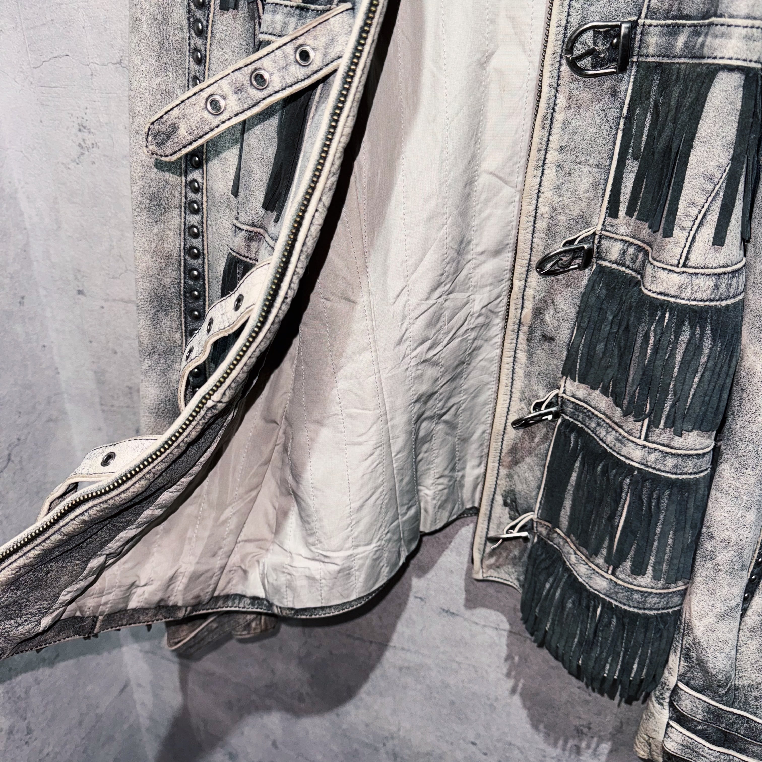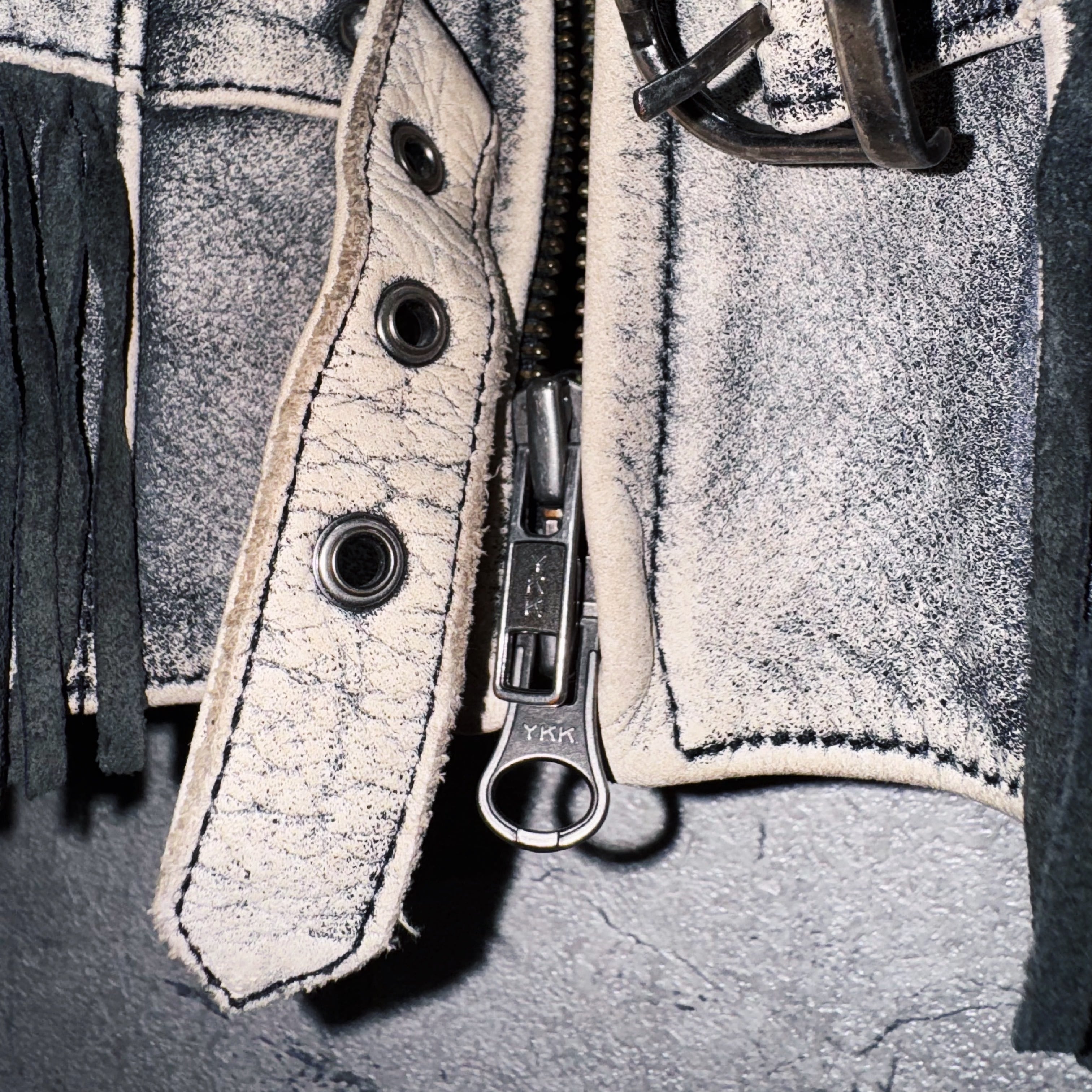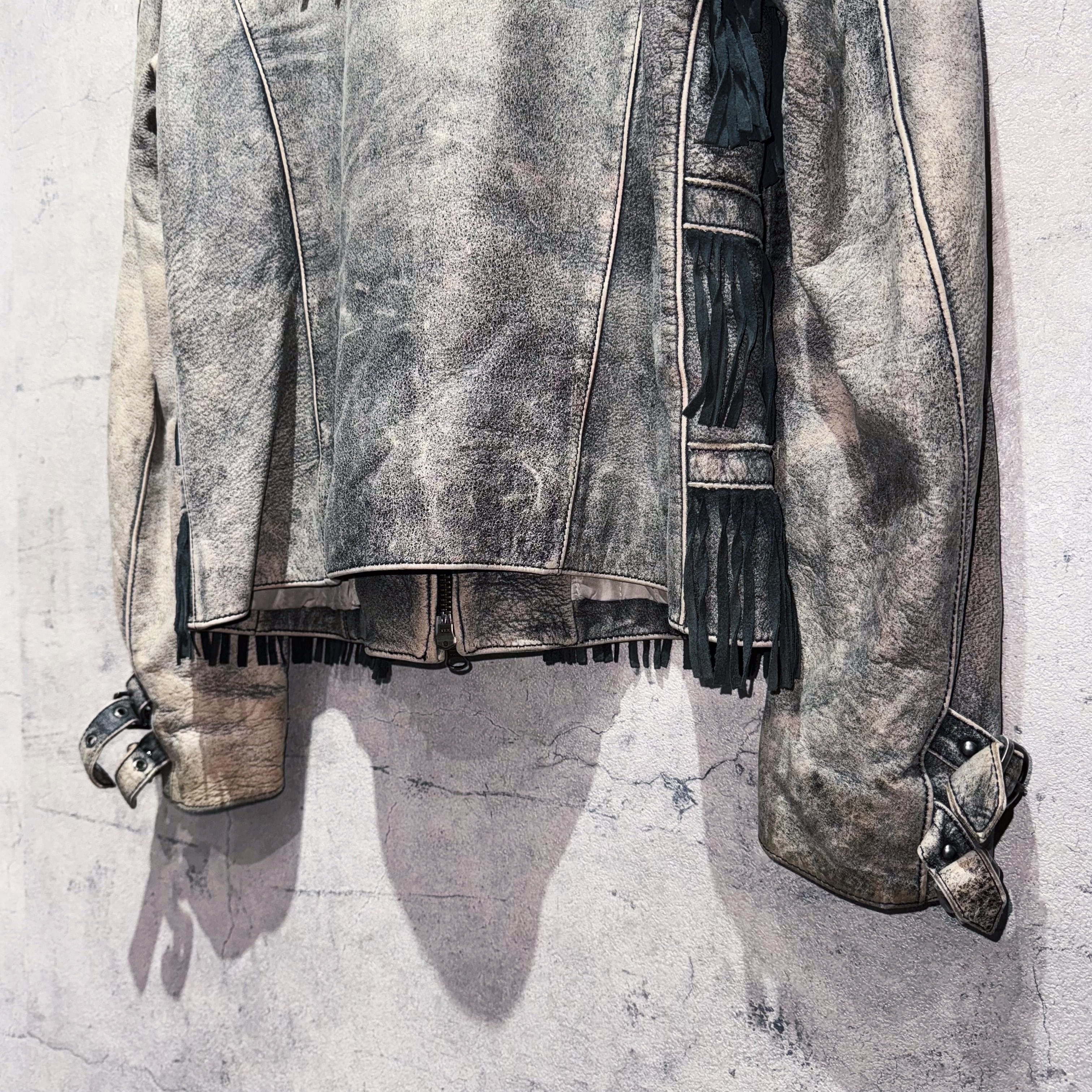 色褪せた退廃的な本革をボディに、フロントと背面にあしらわれたフリンジ、袖のラインと背面にしもあしらったスタッズデザインでパンク且つグランジさも漂うレザージャケット。