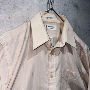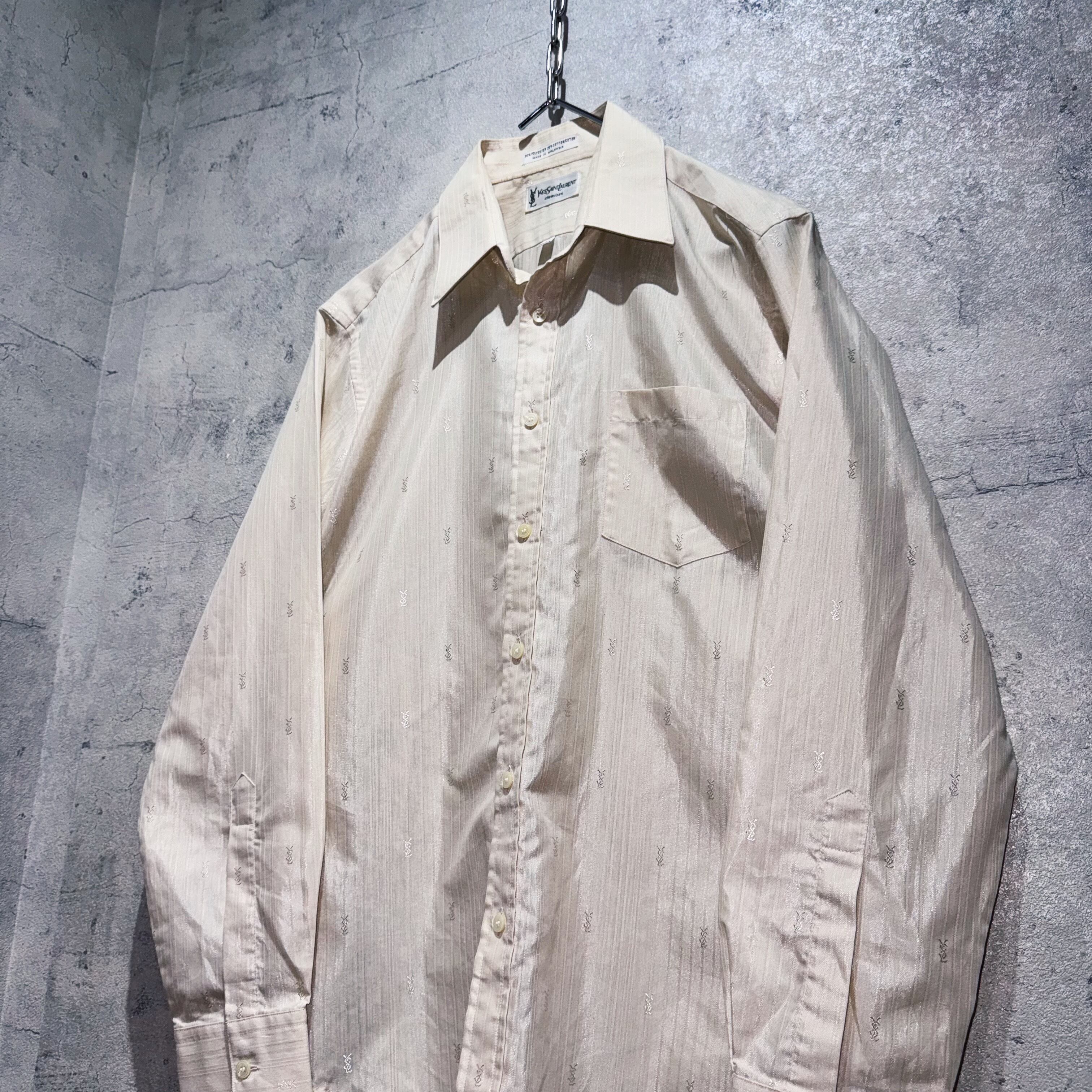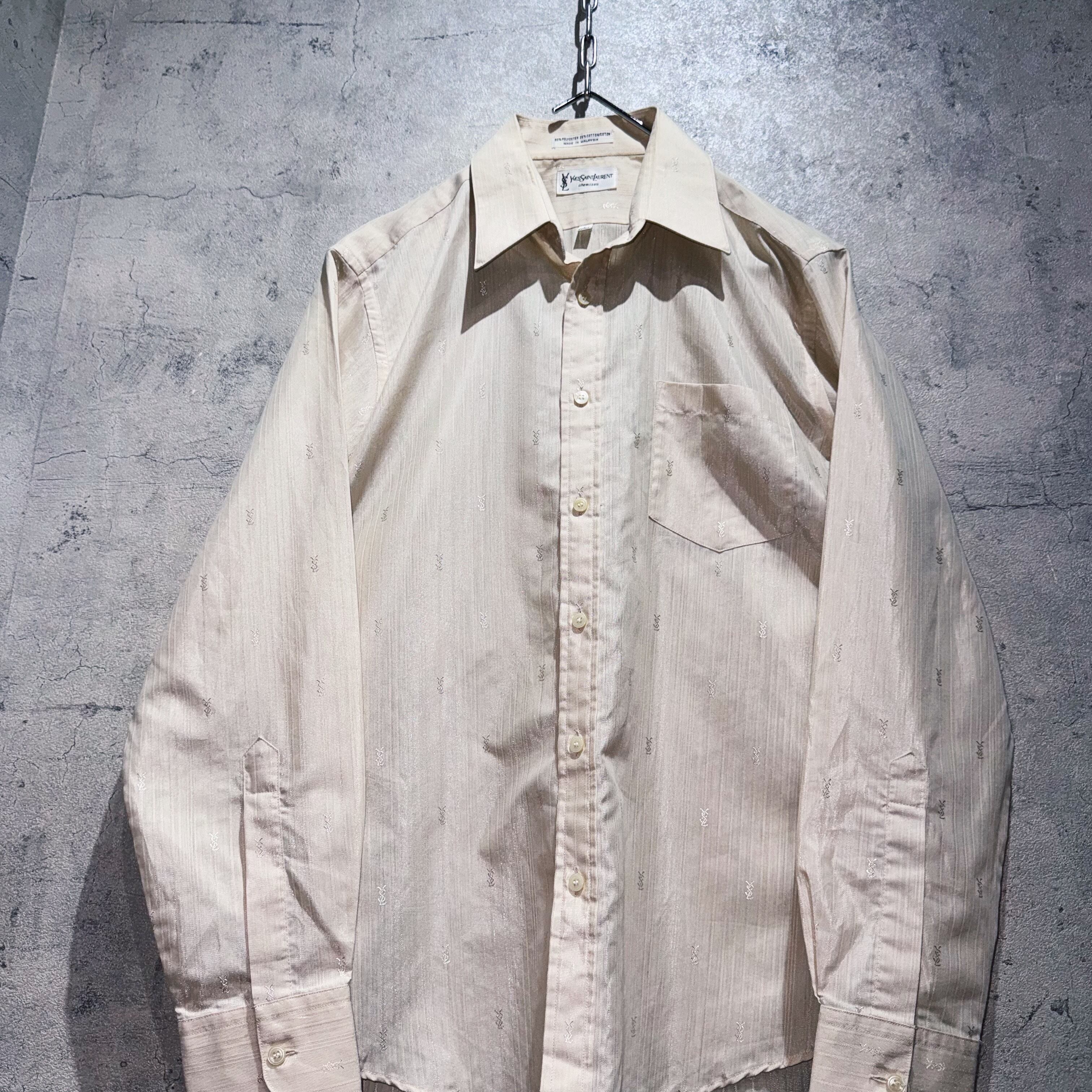 ベージュのボディにストライプと「YSL」のロゴ刺繍を総柄であしらった洗練されたデザインシャツ。