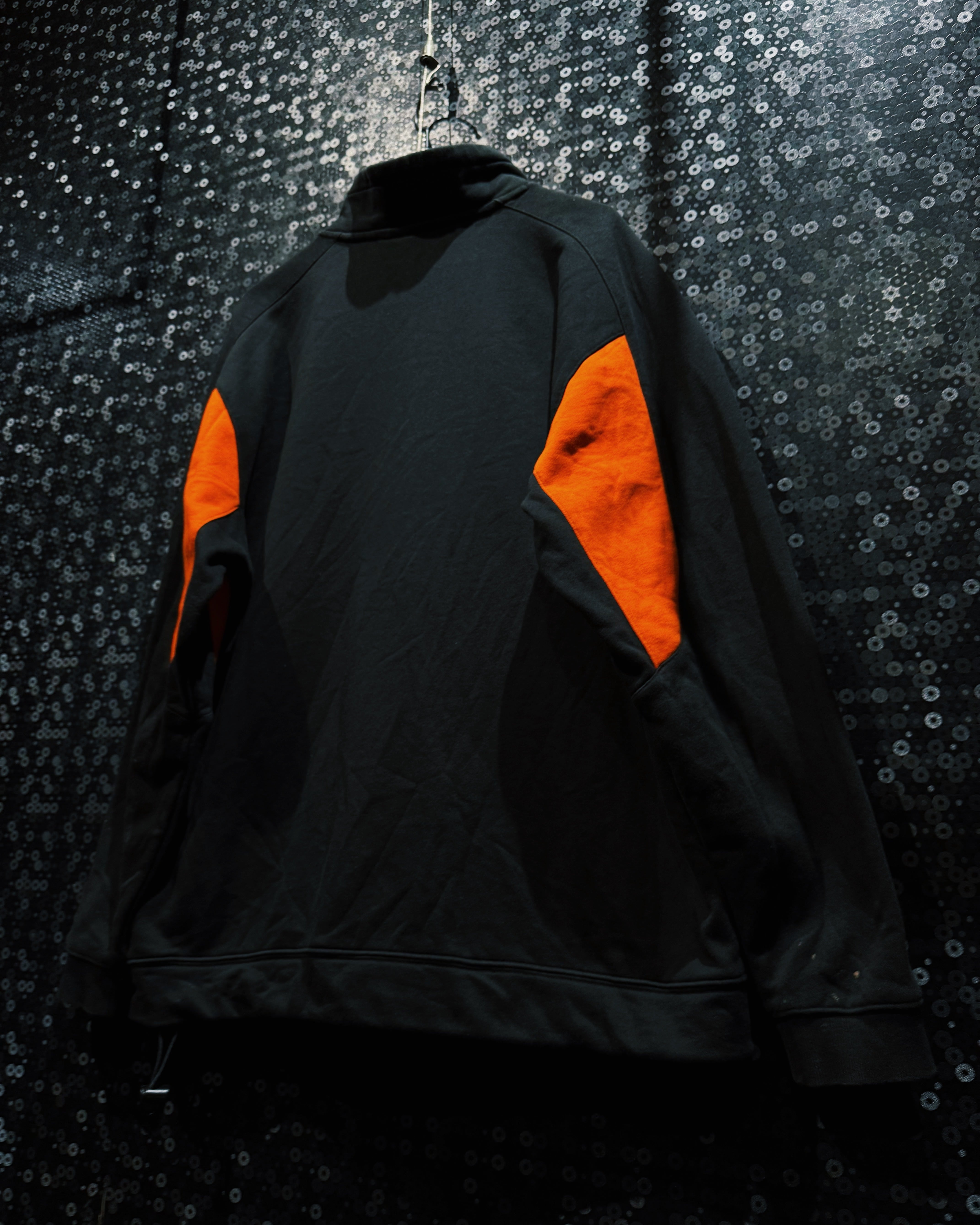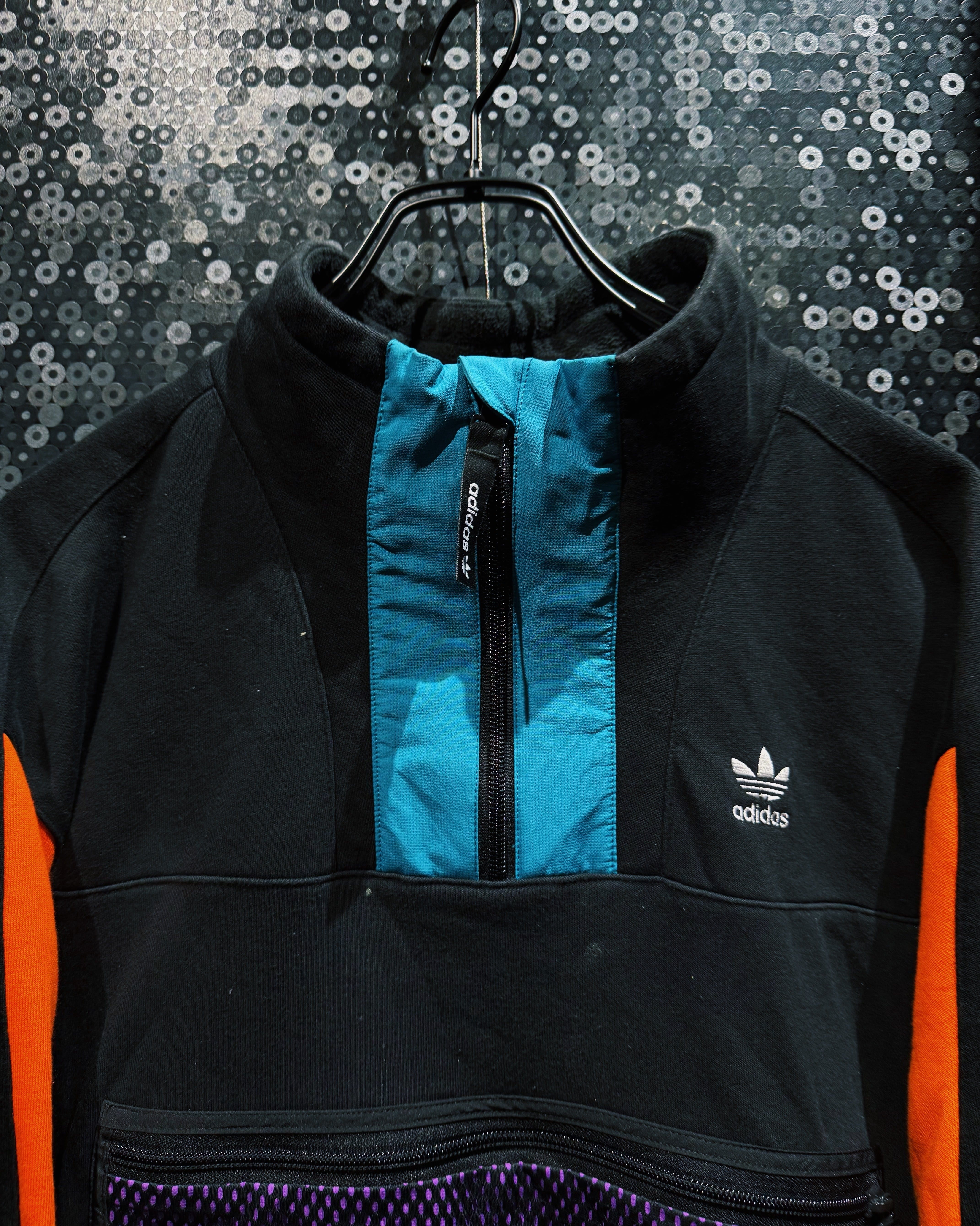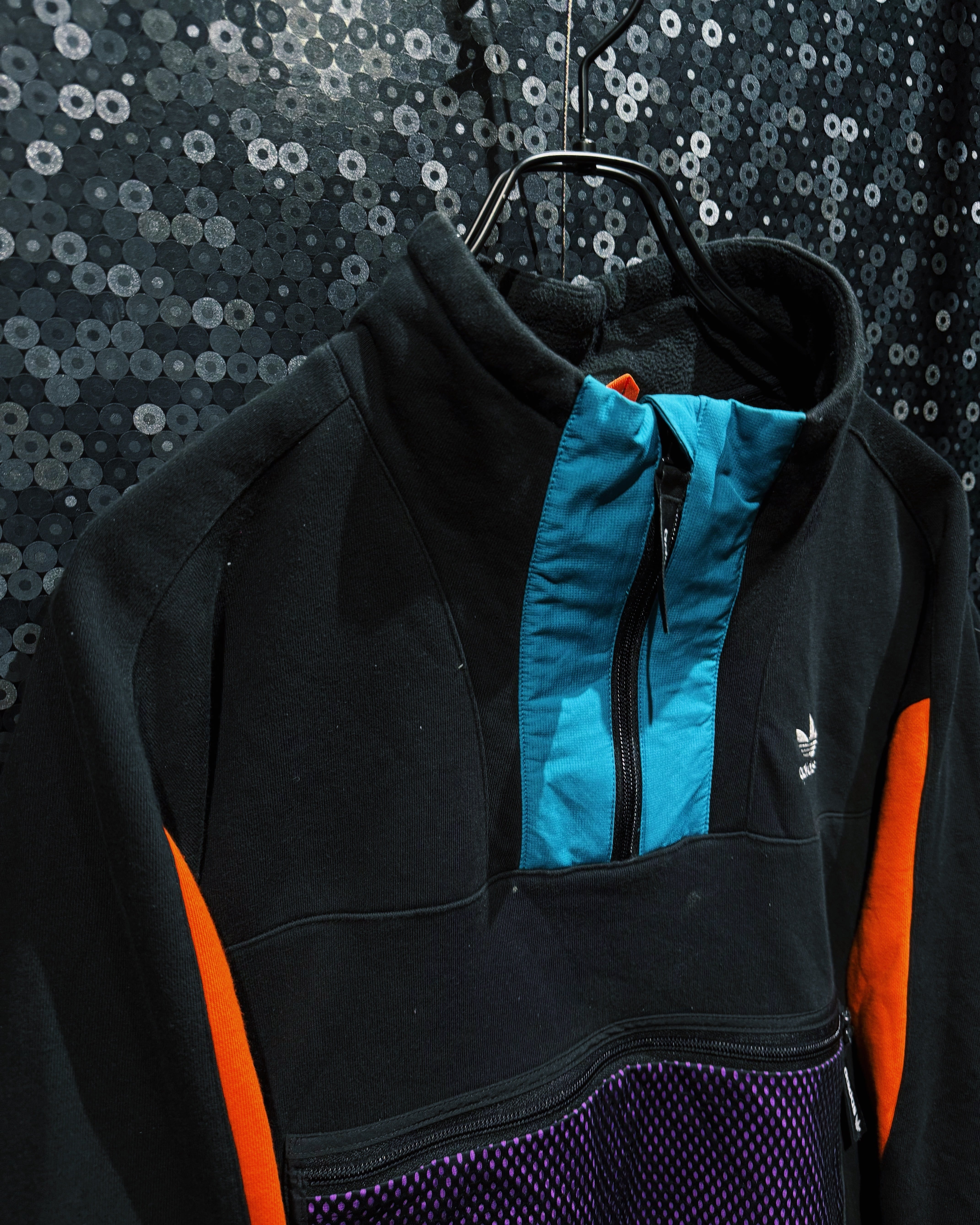 ブラックをベースに、ビビッドなターコイズブルーのフロントジップパネル、サイドにはオレンジのライン切替を配置し、90年代を思わせるレトロスポーティな配色が特徴的。胸元にはホワイトのトレフォイルロゴ刺繍入り。