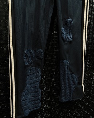 パンツはドレッシーさや、極上のラグジュアリーシルエットゆえにスラックスベースで既存のトラックパンツなどより軽やかでシルエットは最高級、スニーカー、ドレスシューズなどを合わせてもなお雰囲気漂うサイジング。ベルトではなくウエストゴムタイプで至高の履き心地。