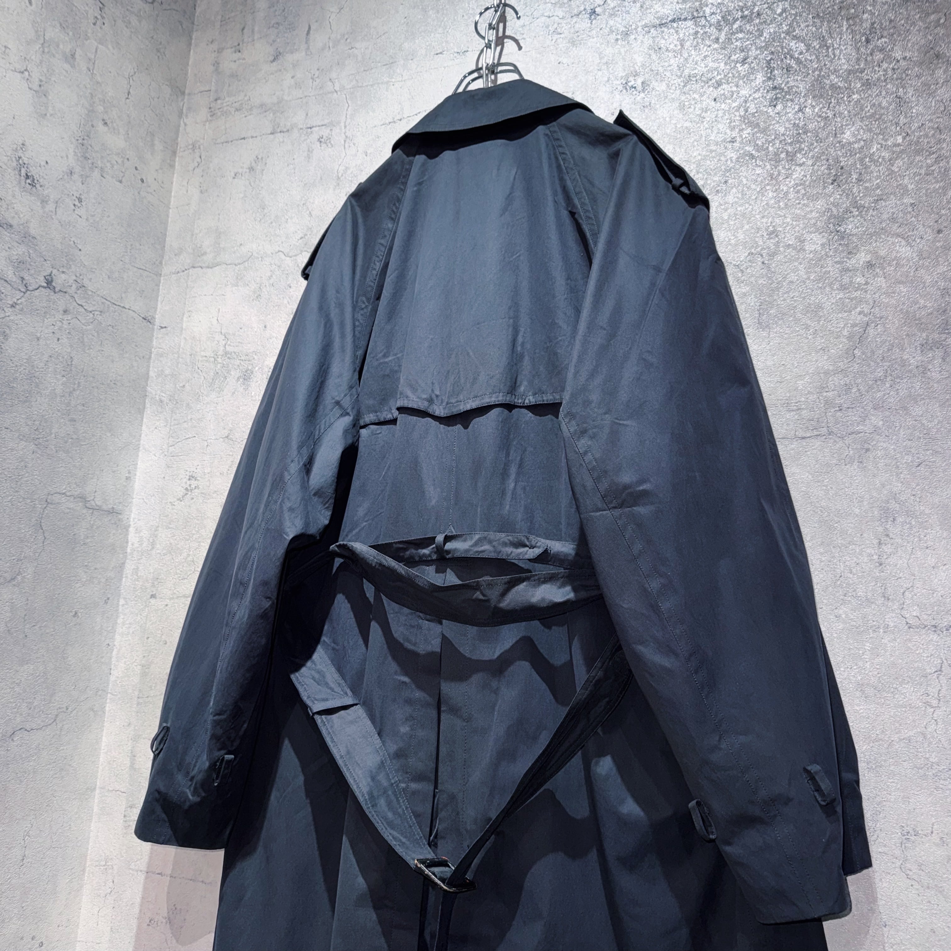 バーバリーのトレンチコートといえばベージュカラーに加え、こちらのダークネイビーカラーも代表的な1着。素材にナイロンをブレンドすることでツルッとしており、高級感のある光沢も身に纏っています。