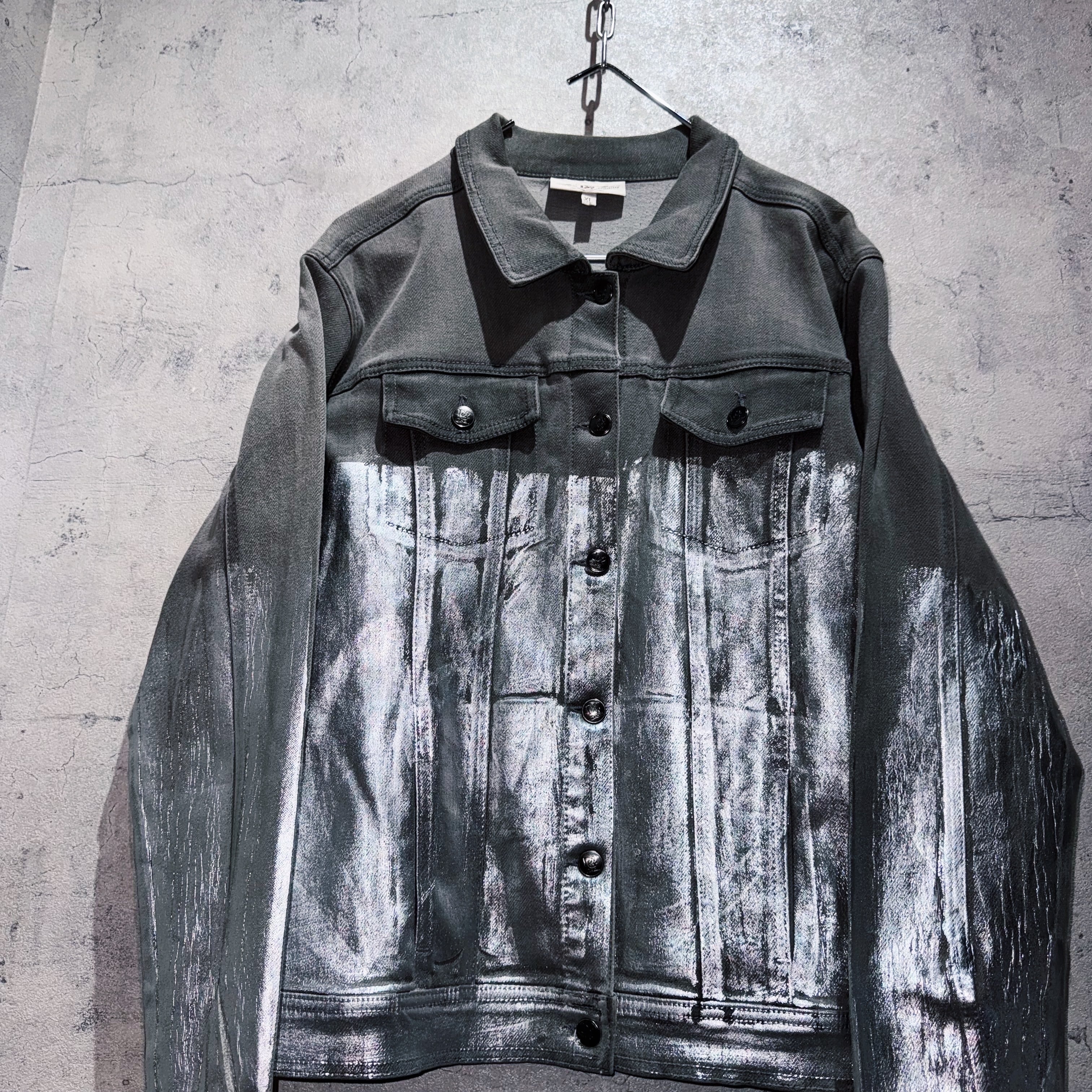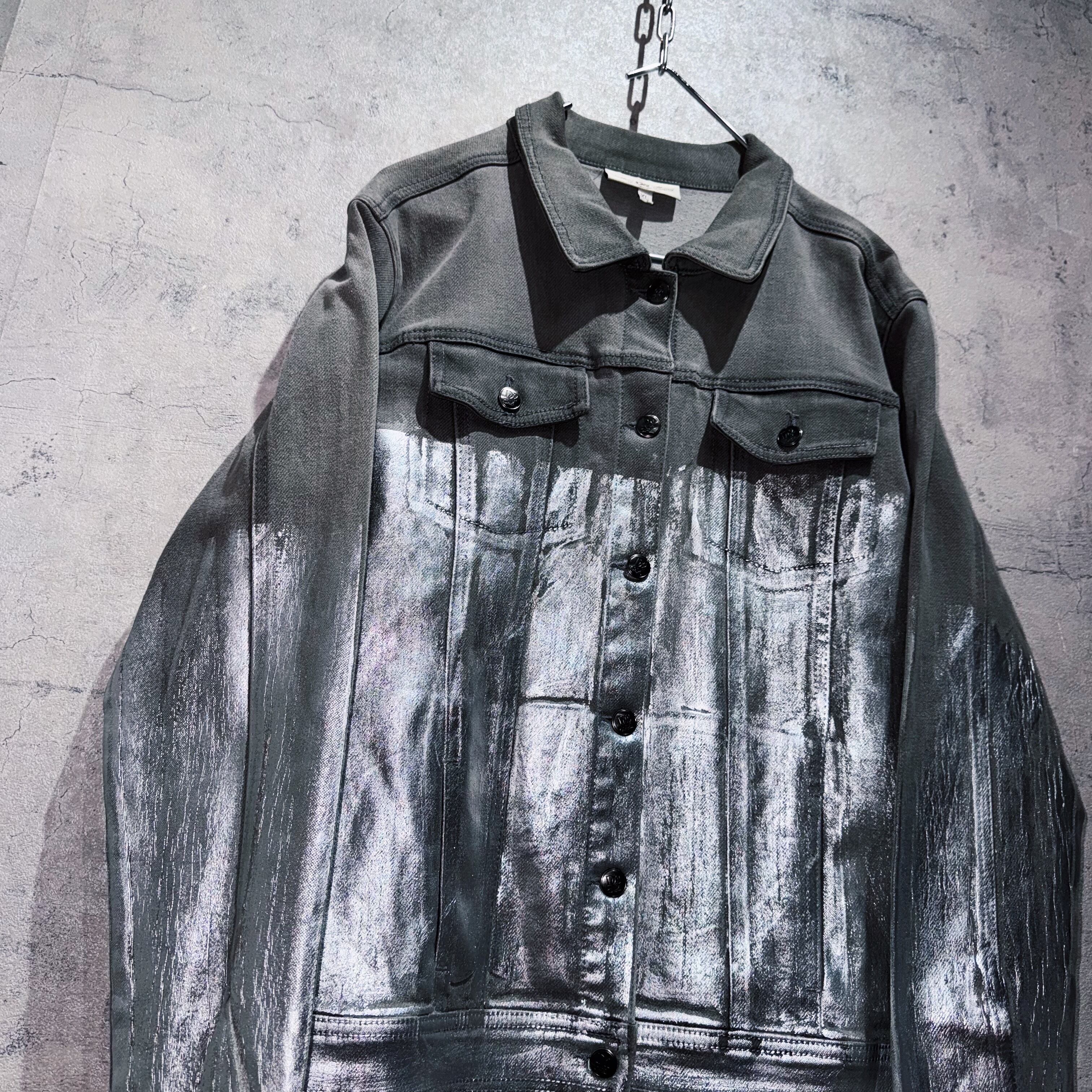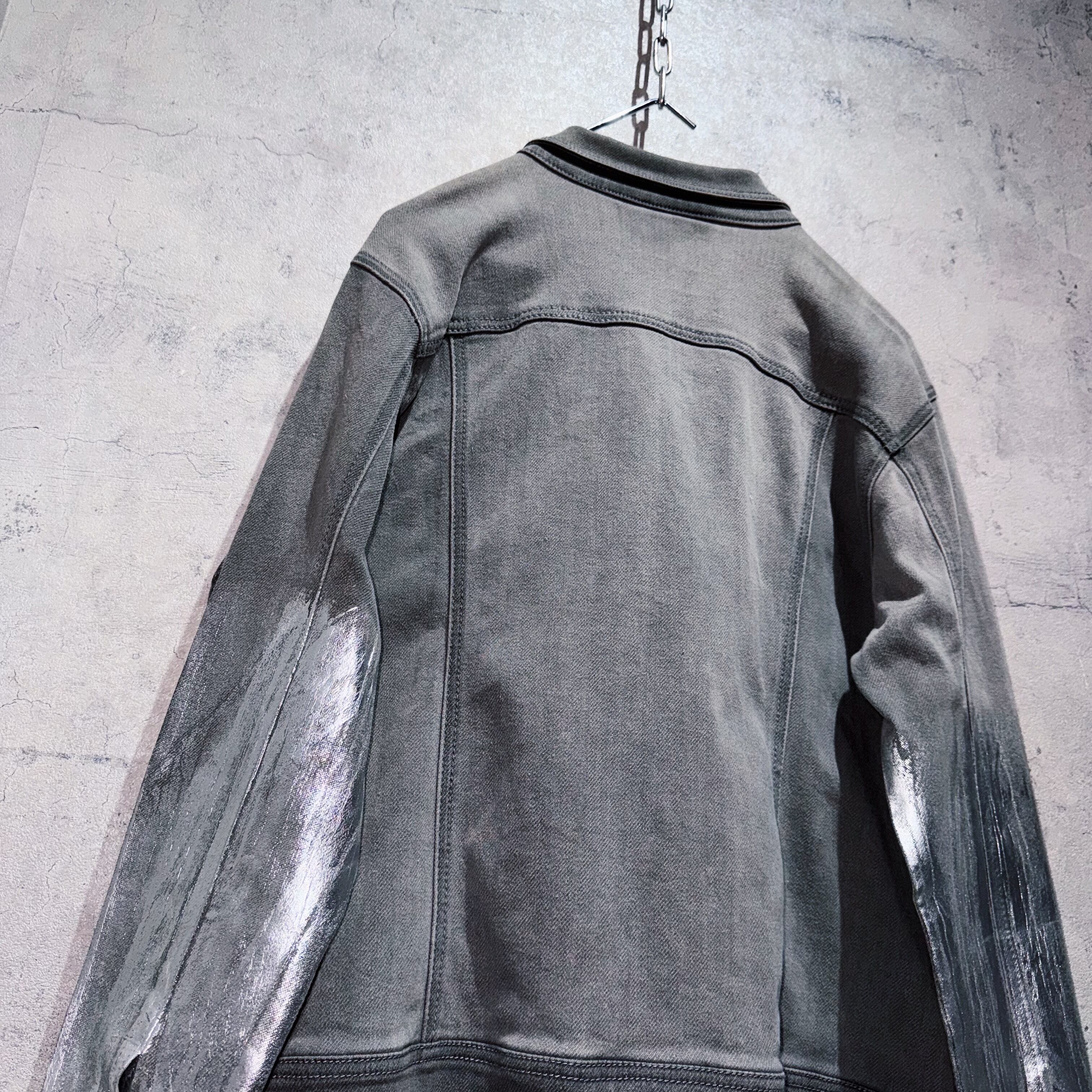 フェードされた墨黒のデニムジャケットの中心から下をシルバーのコーティングデザインで加工したクロップドジャケット。パンク且つアバンギャルドで存在感がありますね。