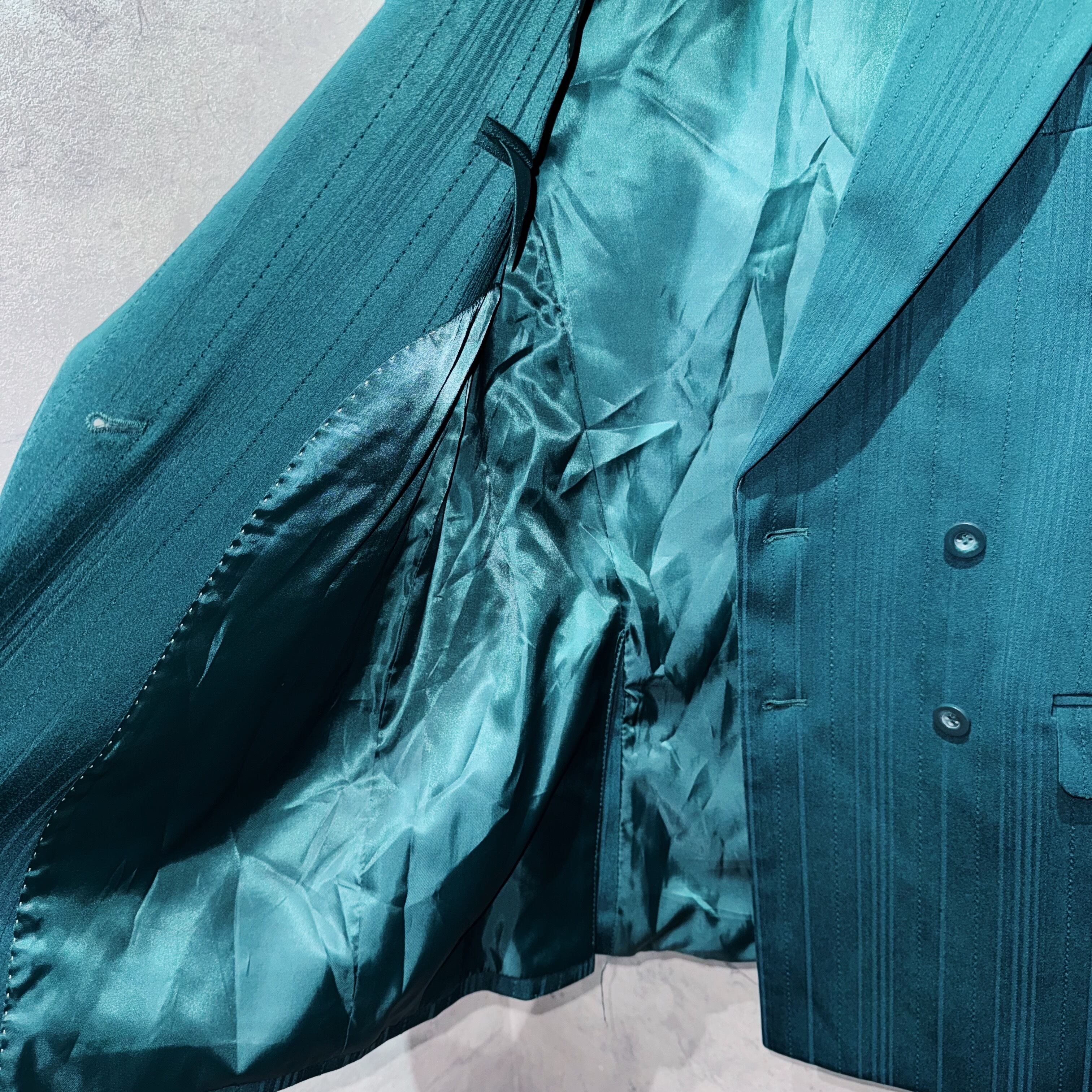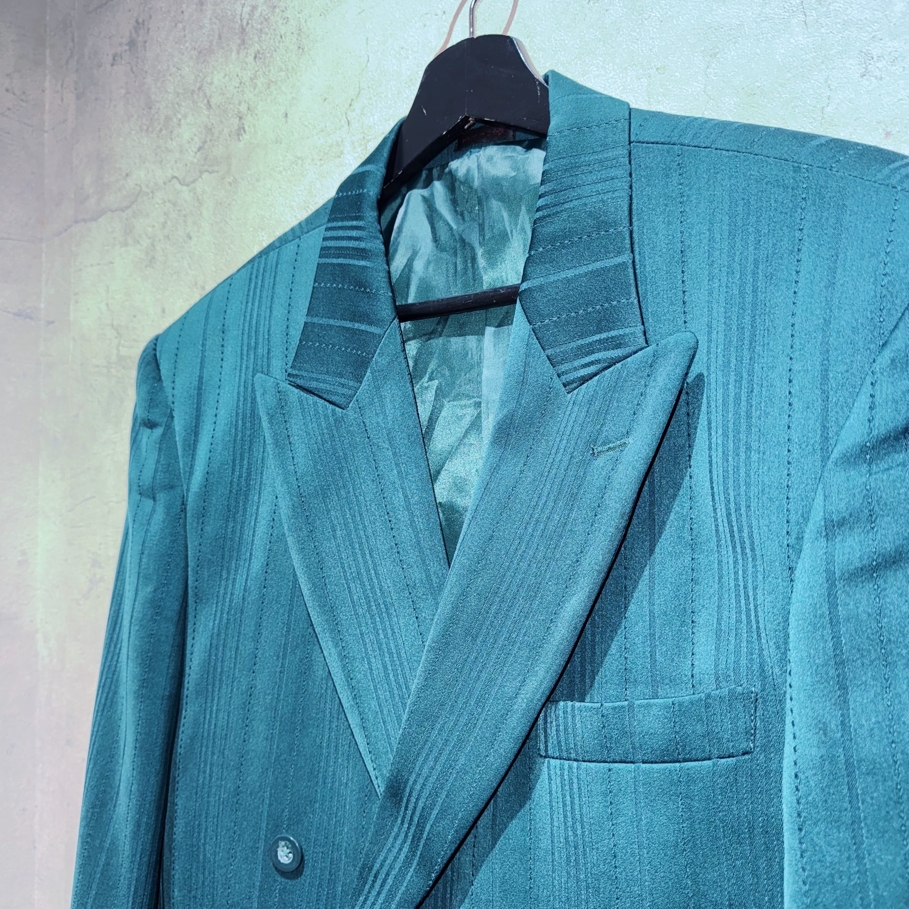 色鮮やかか青緑、テールグリーンを身に纏った圧巻の2ピース。他では中々お目にかかれないダブルに加え、ピークドラペル、パワーショルダーから生まれる立体的なジャケット。