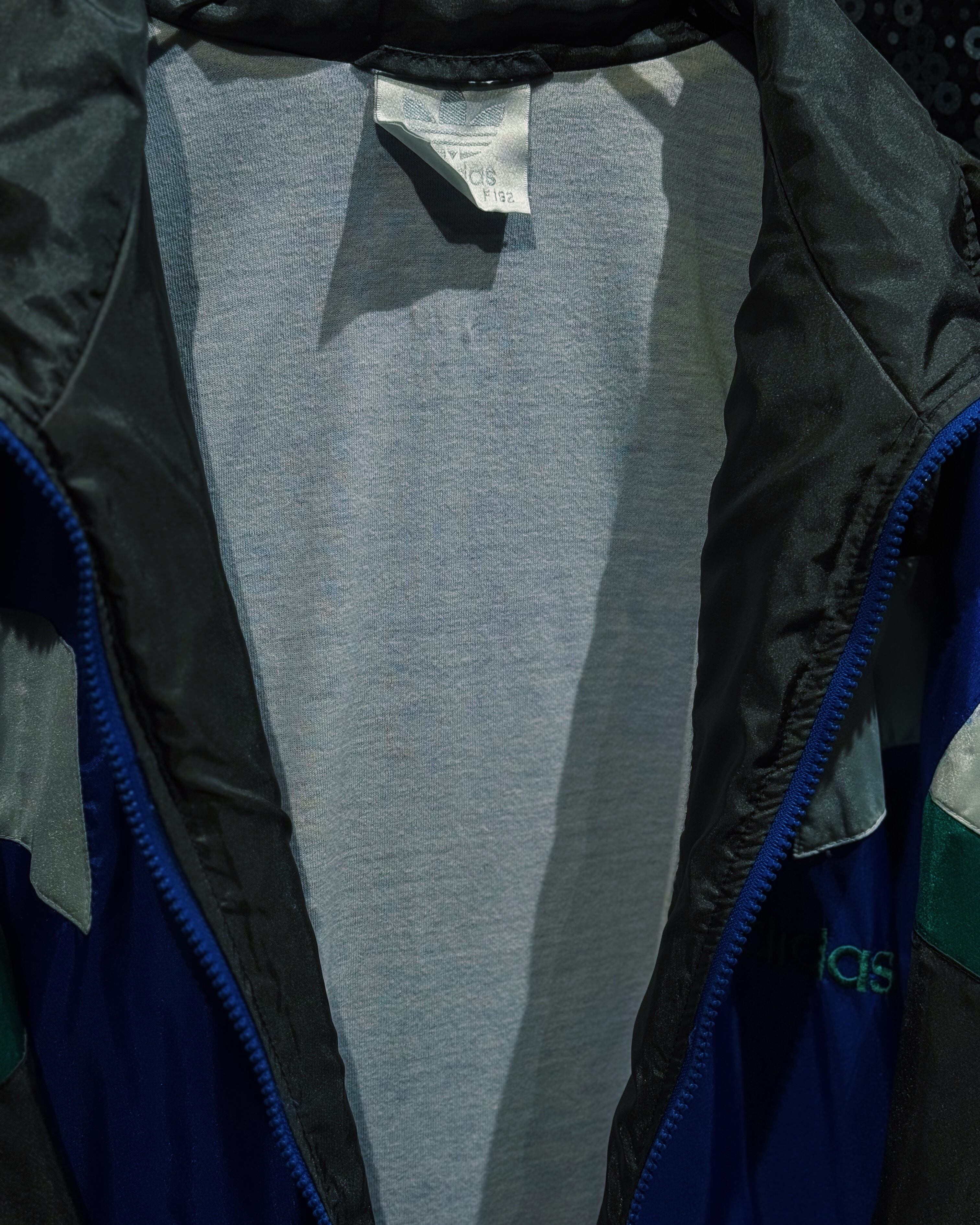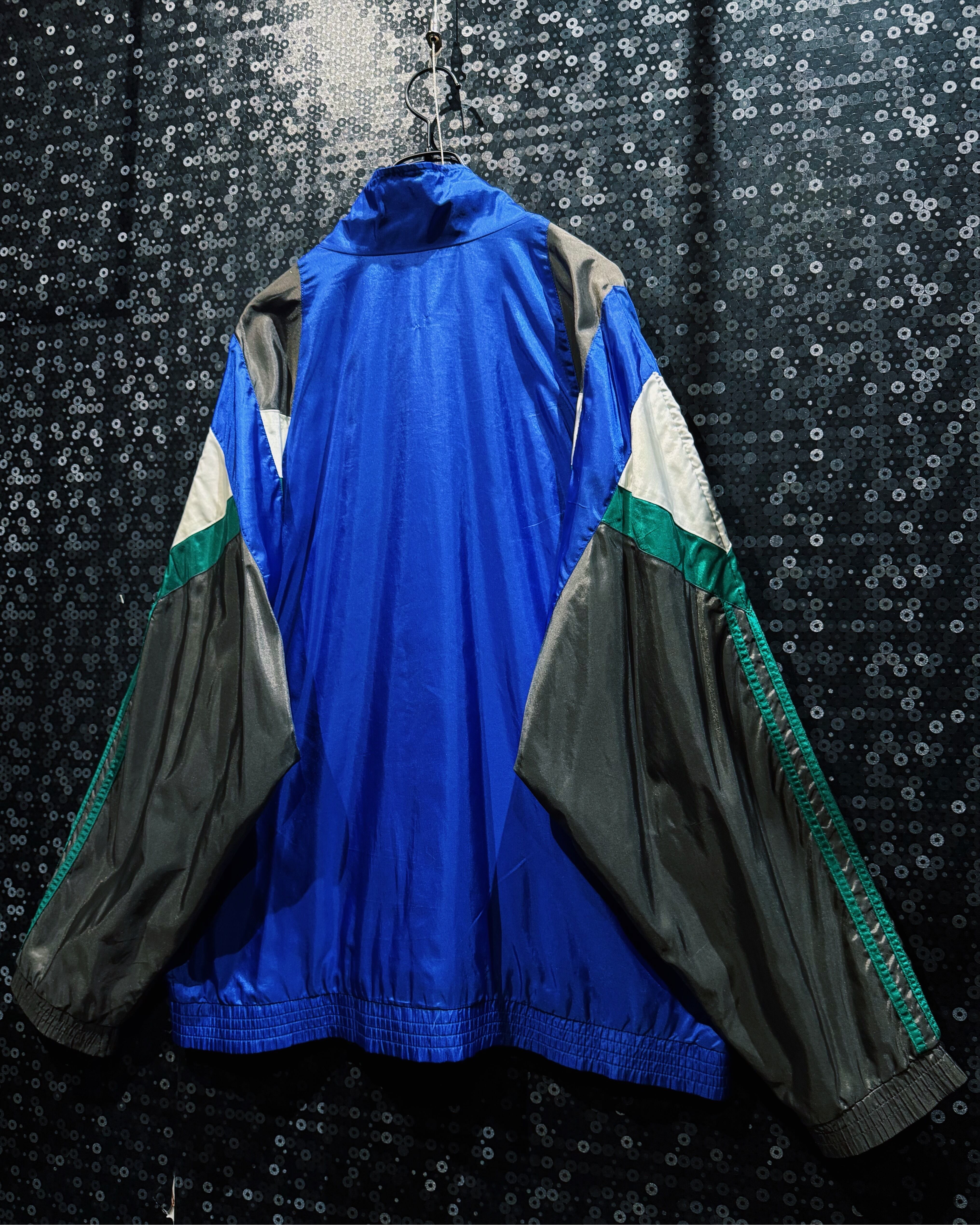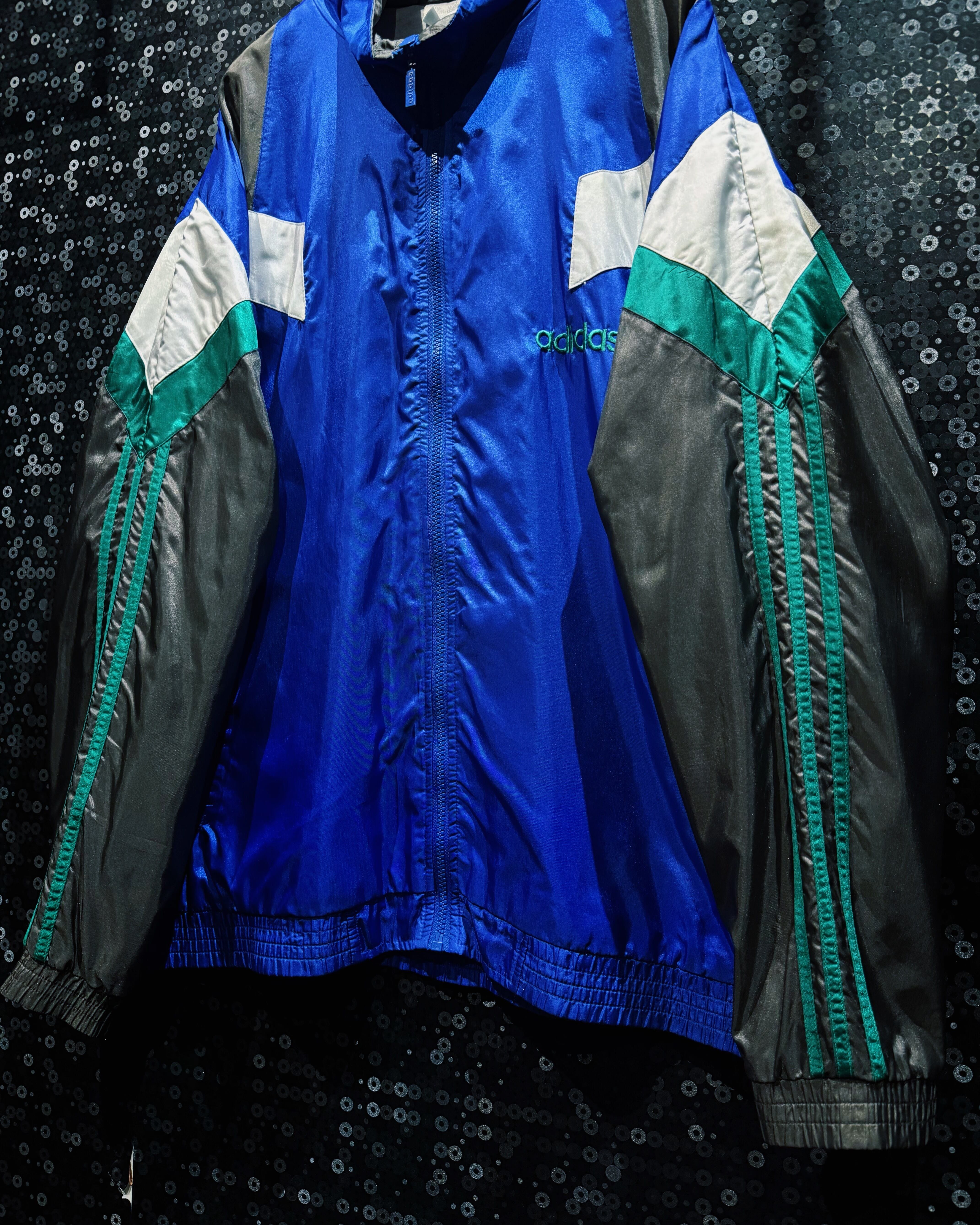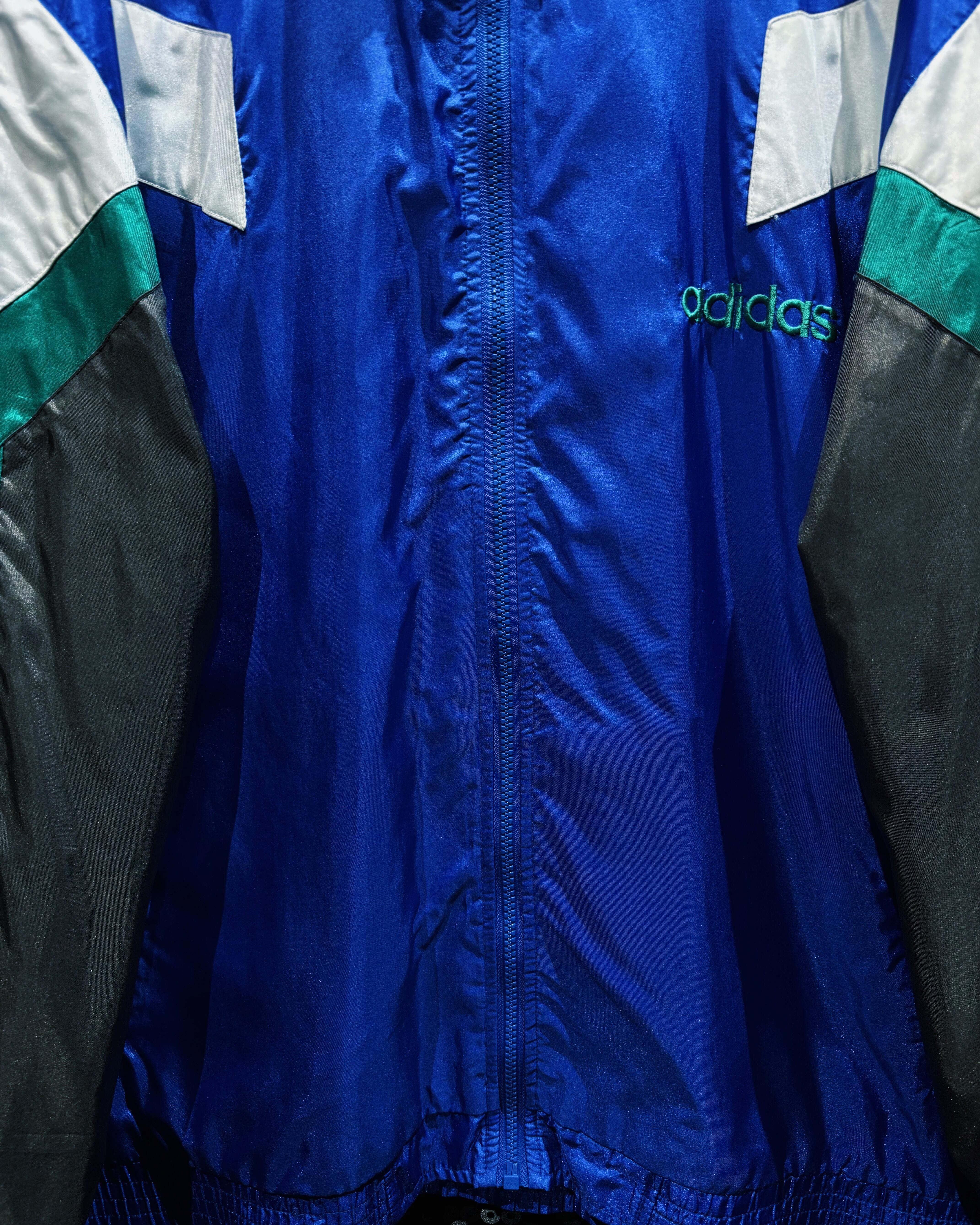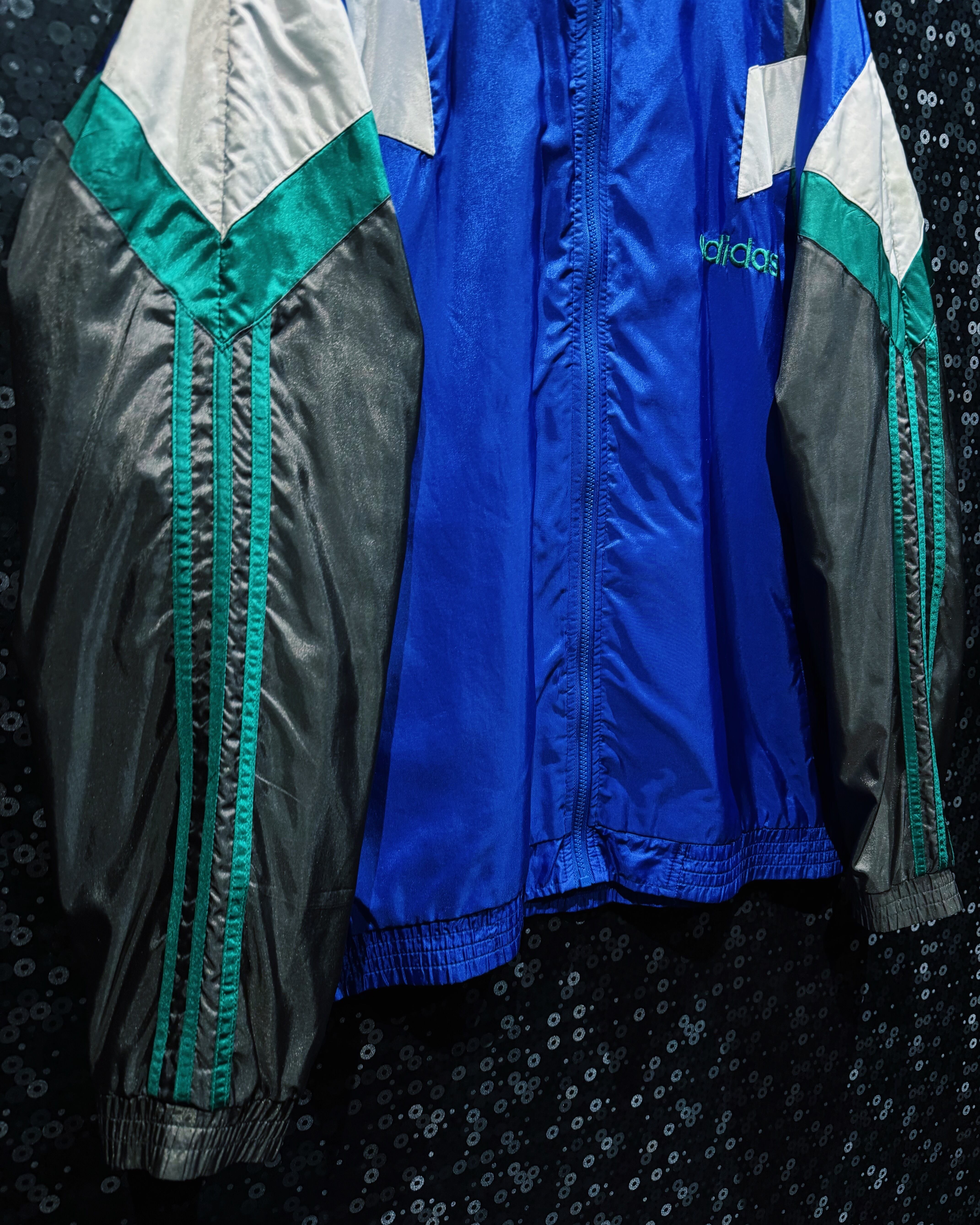 艶のあるブルーナイロンをベースに、グリーンとチャコールグレー、ホワイトを大胆に切り替えた90’sスタイルのadidas Originalsナイロントラックジャケット。