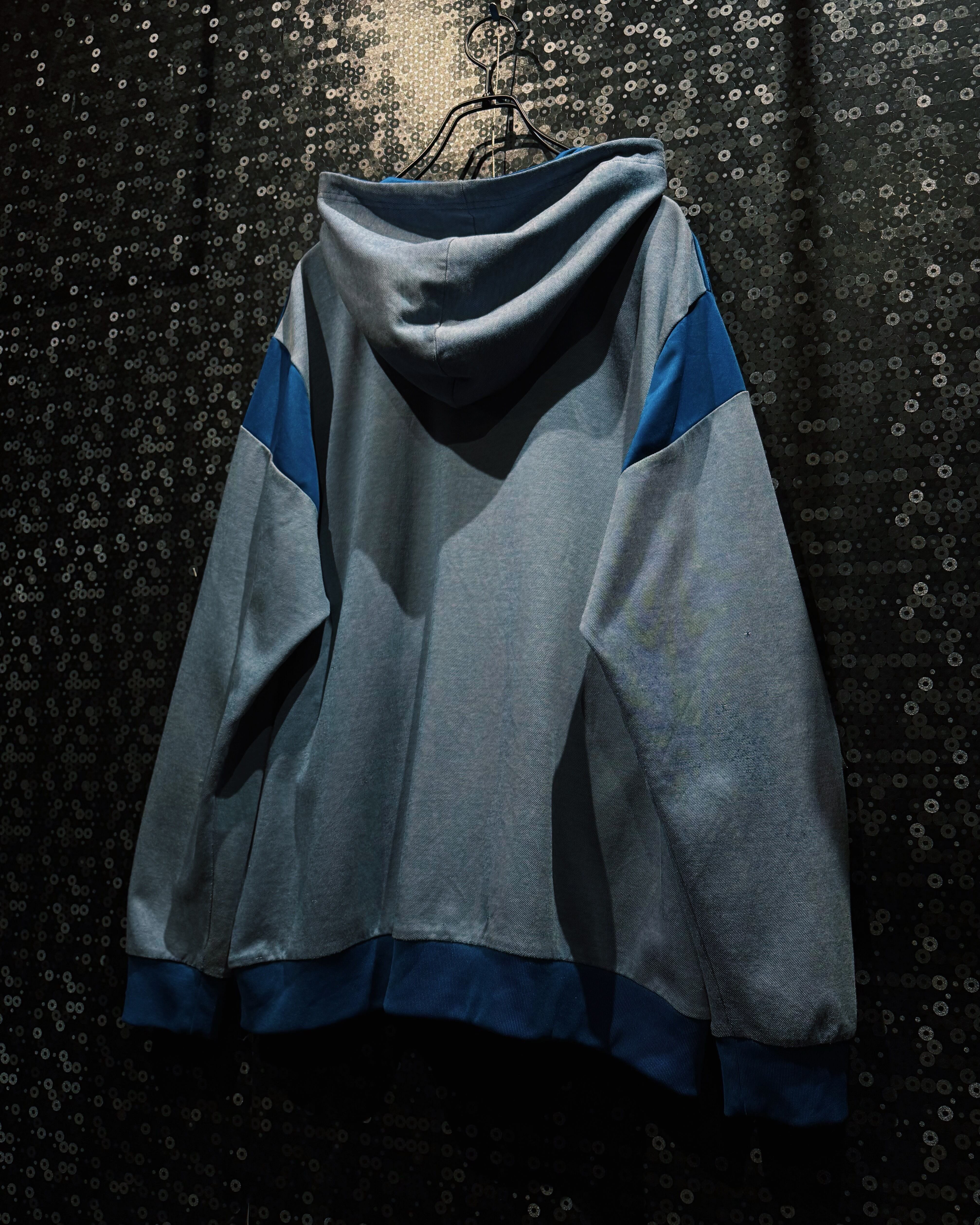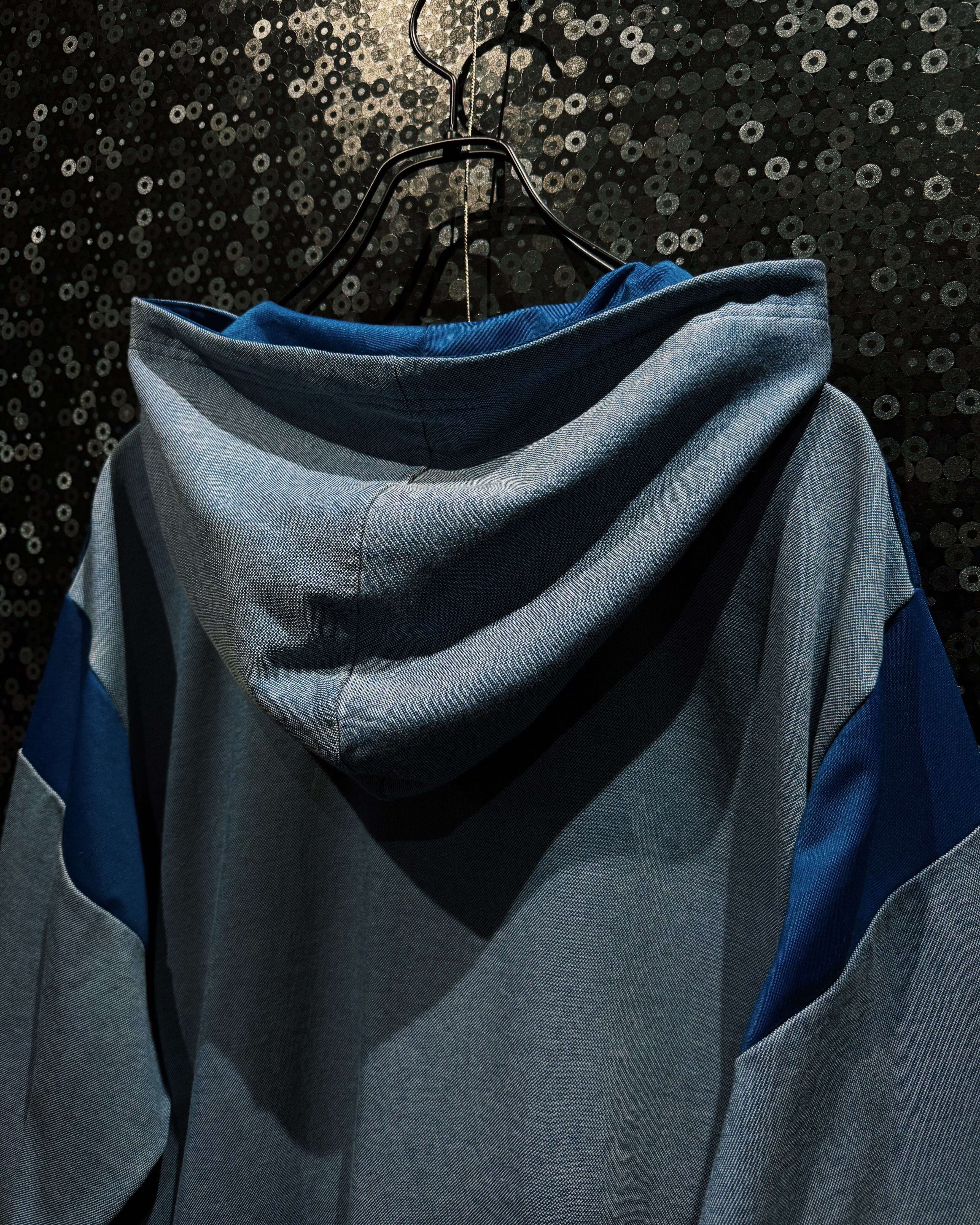 色気を醸し出すブルーカラーを身に纏ったフードデザインのトラックジャケット。