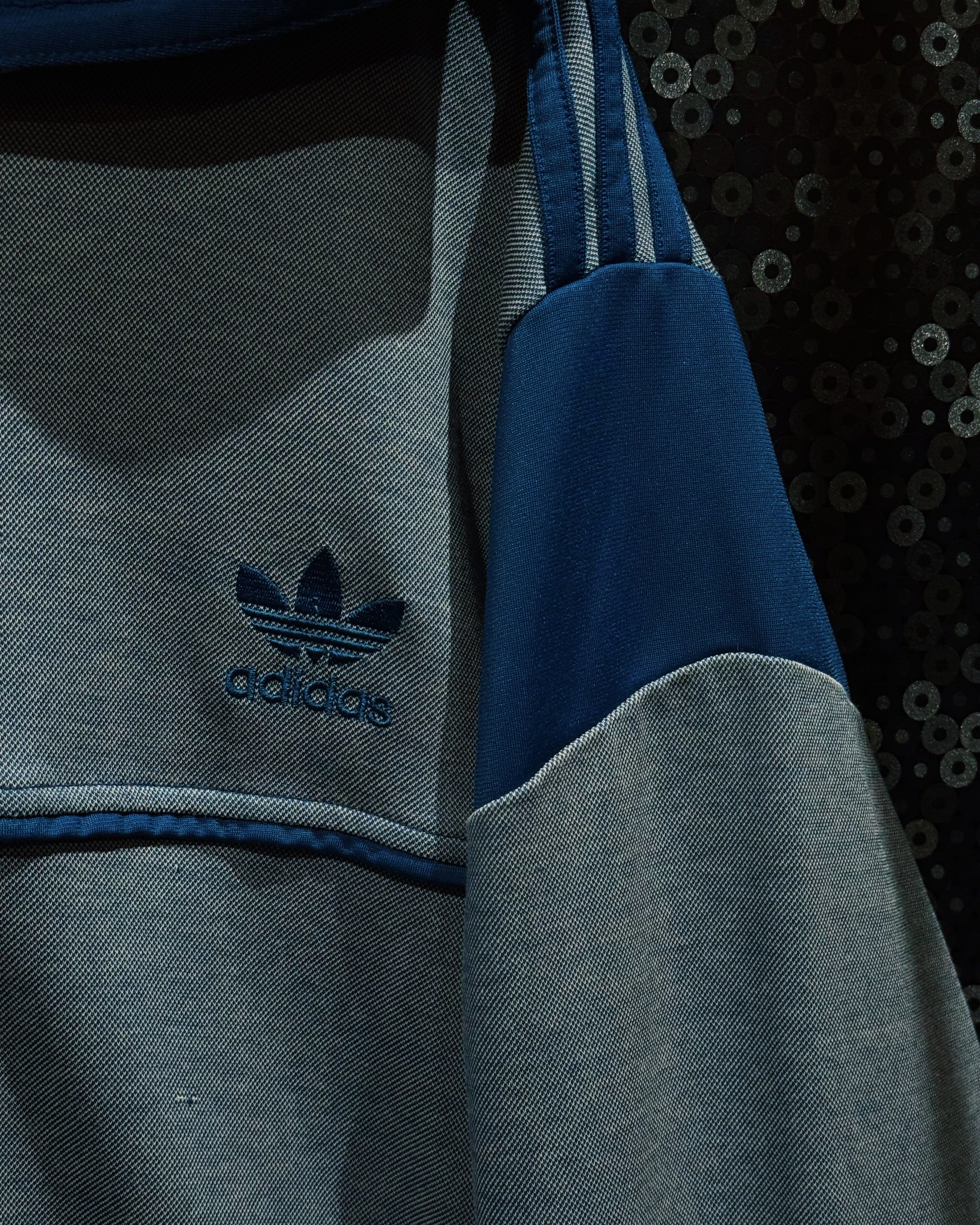 "ADIDAS"の代名詞であるトレフォイルのロゴが胸元やジップのスライダーにもあしらわれています。