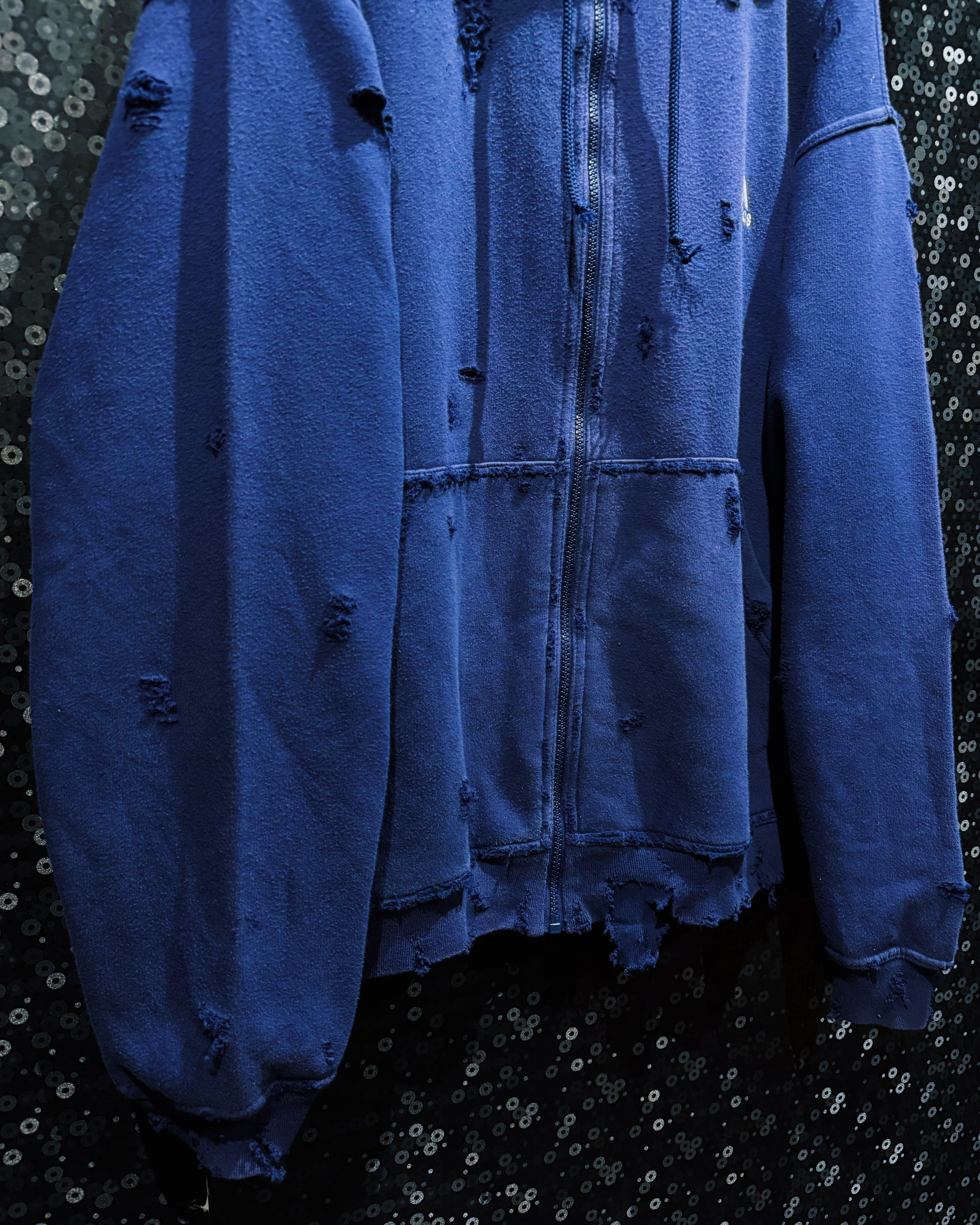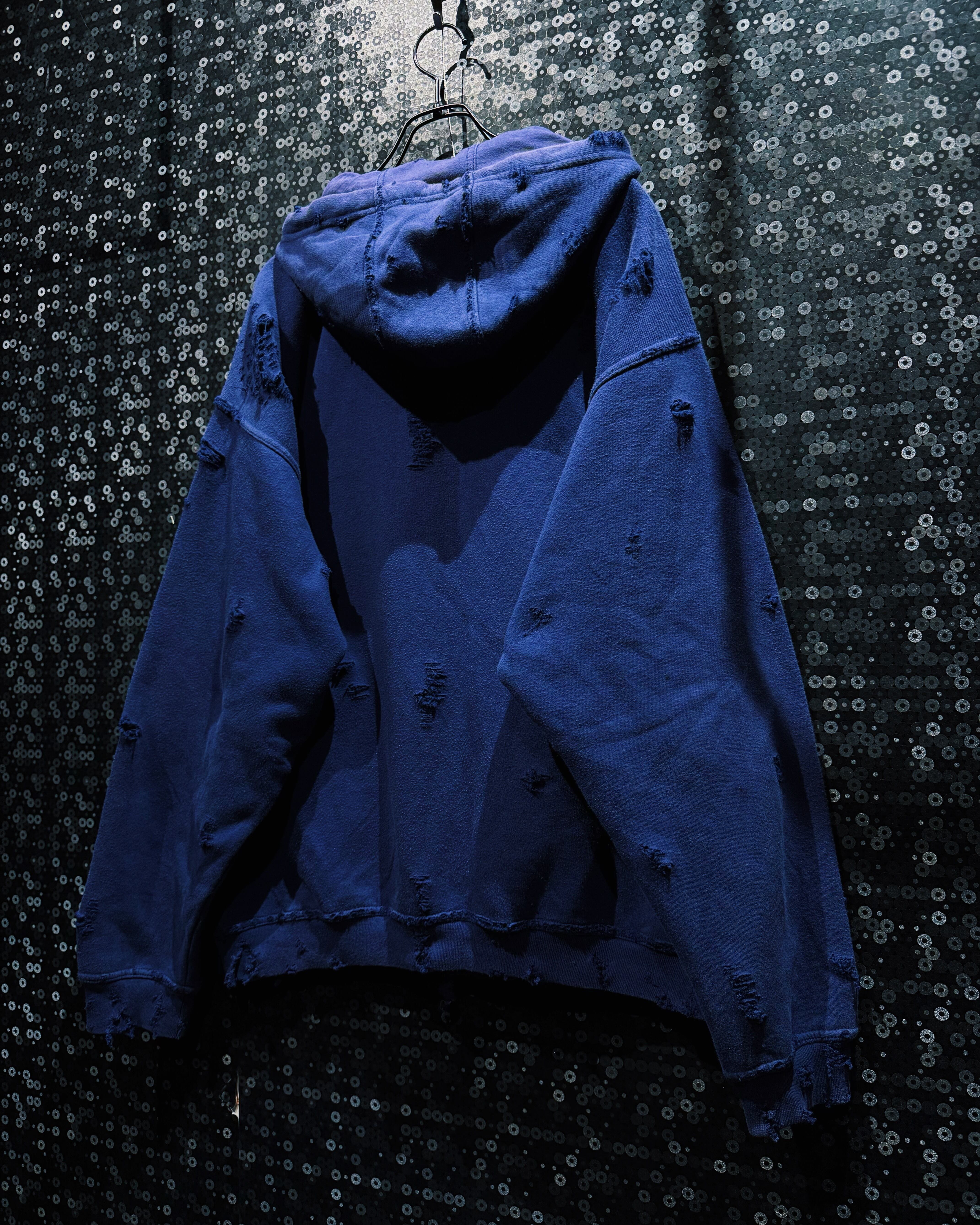 深いネイビーのボディに施されたボロ加工は、まるで時を重ねたようなリアルなエイジング感を演出。フードや袖、裾にかけてバランスよく配置されたダメージは、単なる装飾ではなく“経年と再生”をテーマにしたアート的仕上がり。