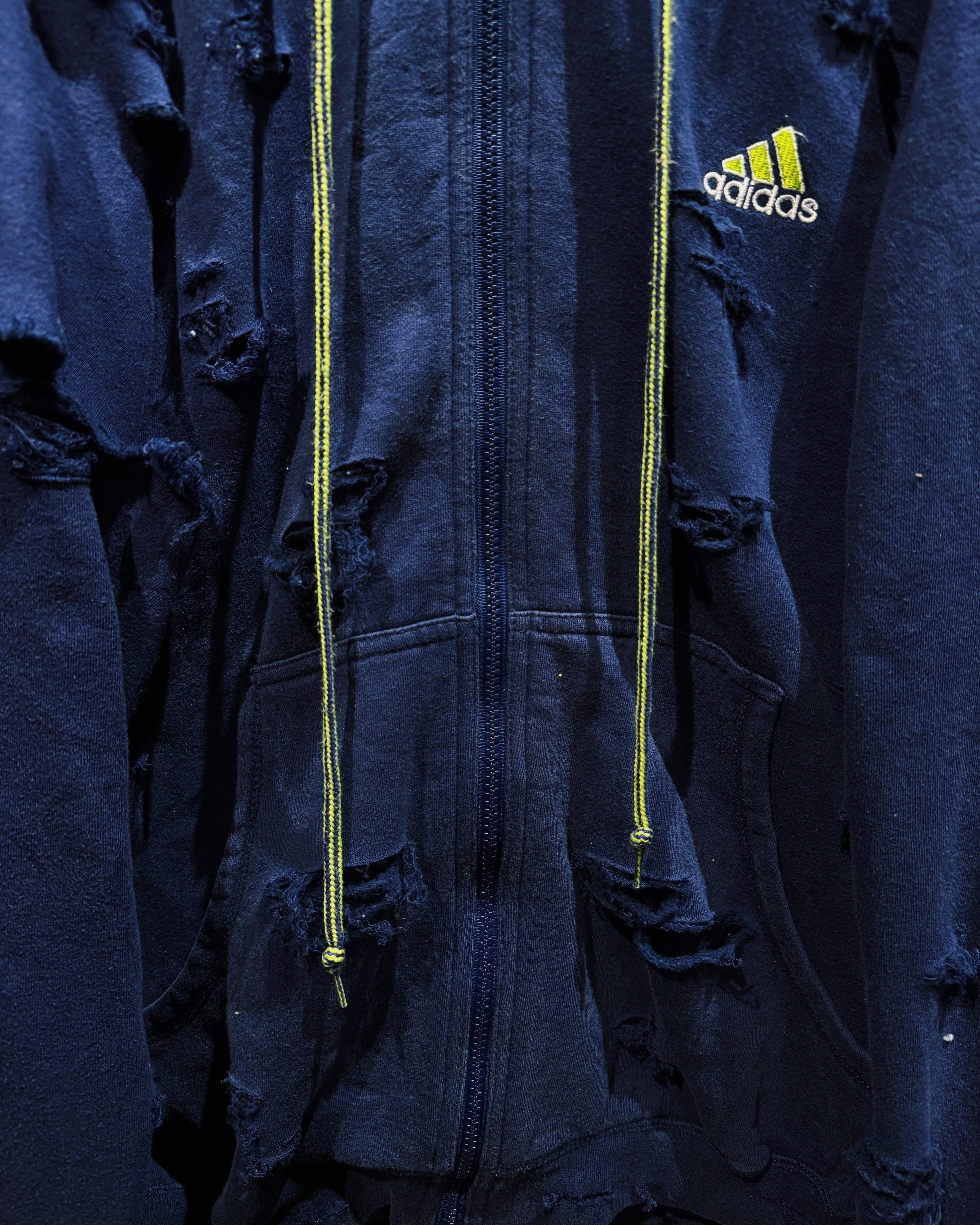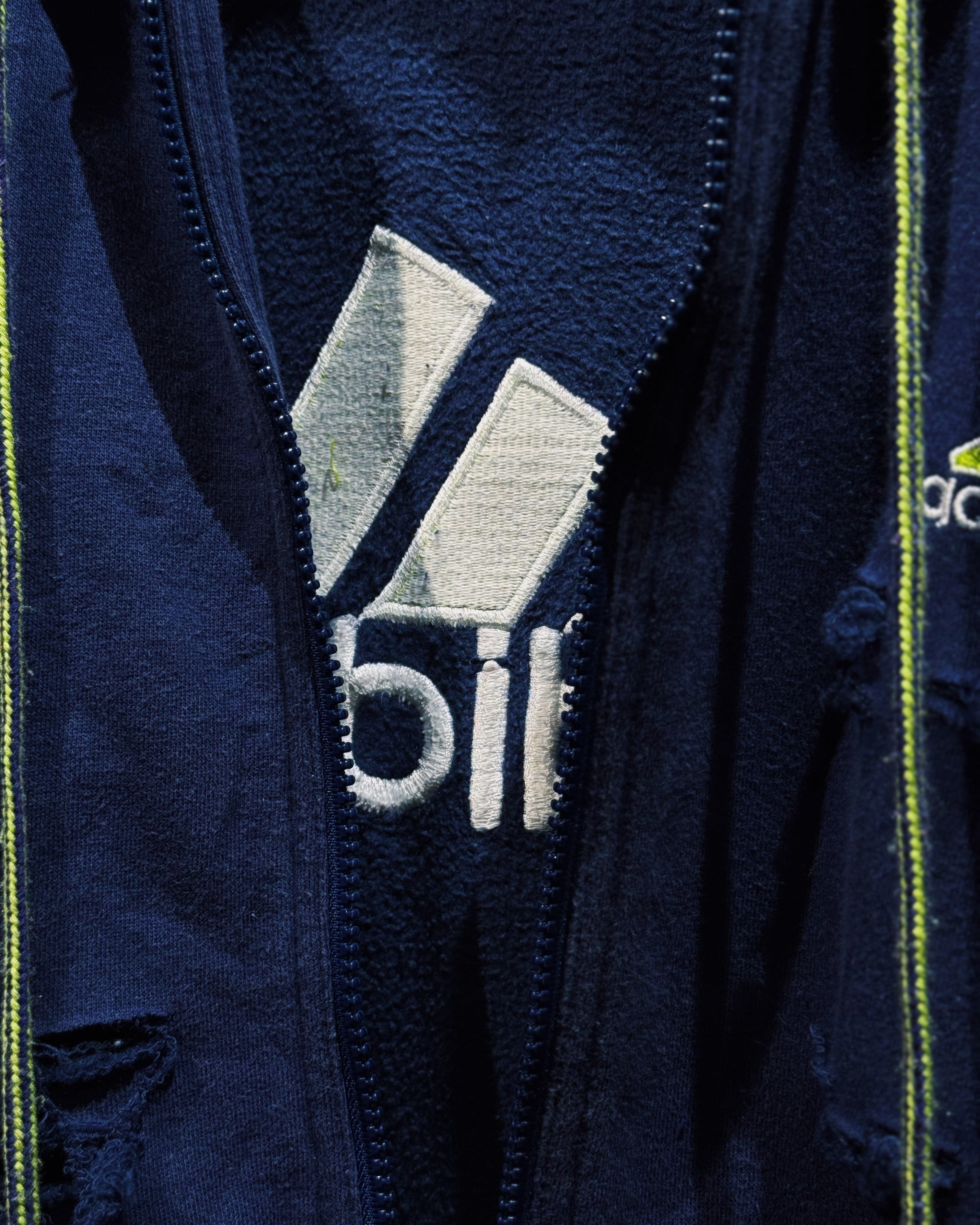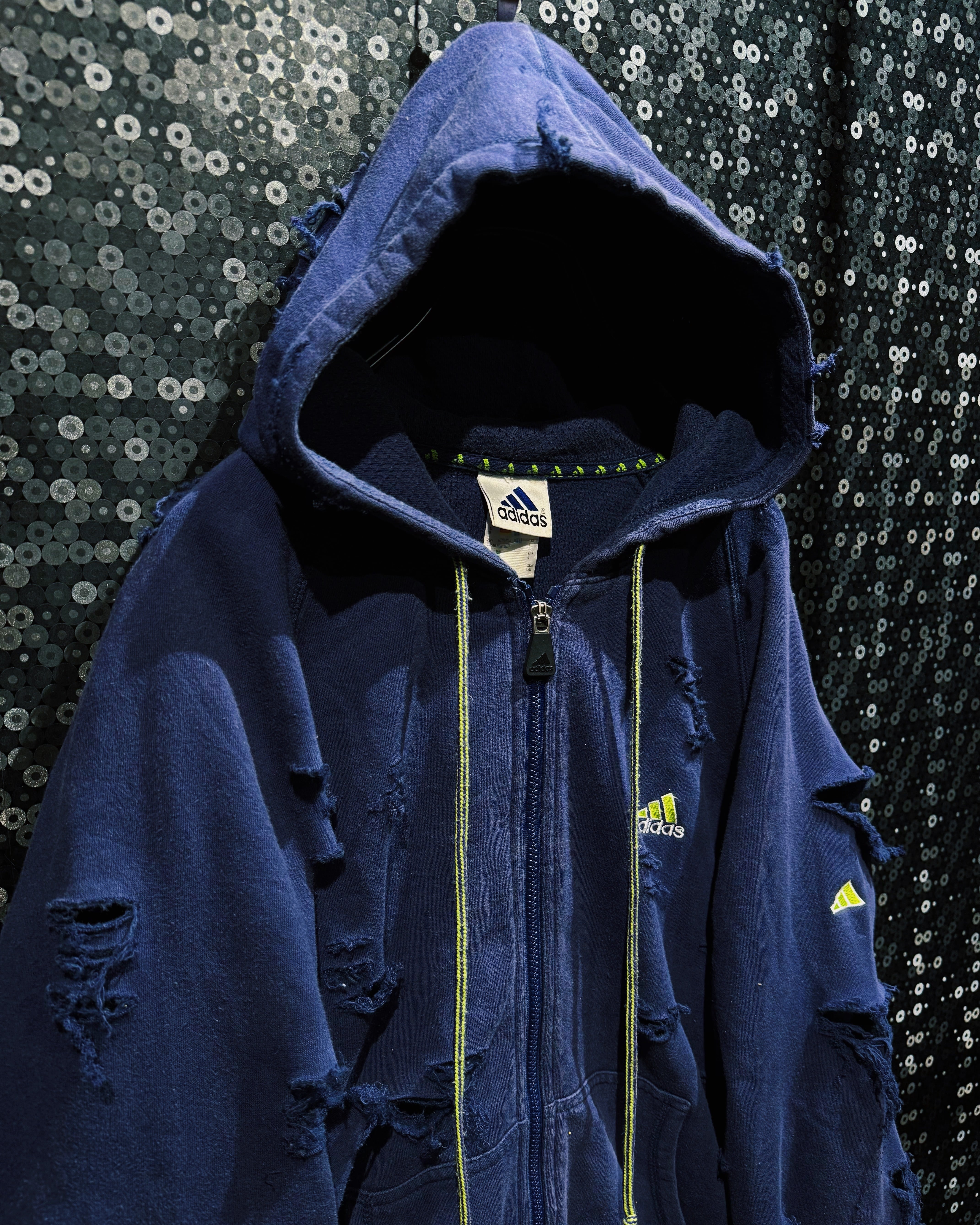 adidasのパフォーマンスロゴジップフーディーをベースに、AEIEM独自の“original boro re:make”加工を施したスペシャルモデル。