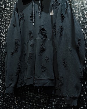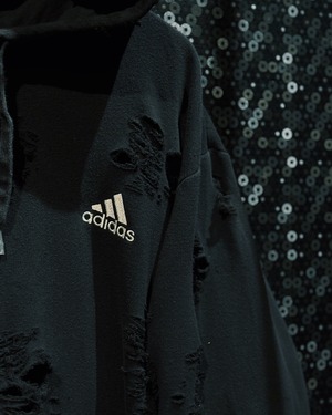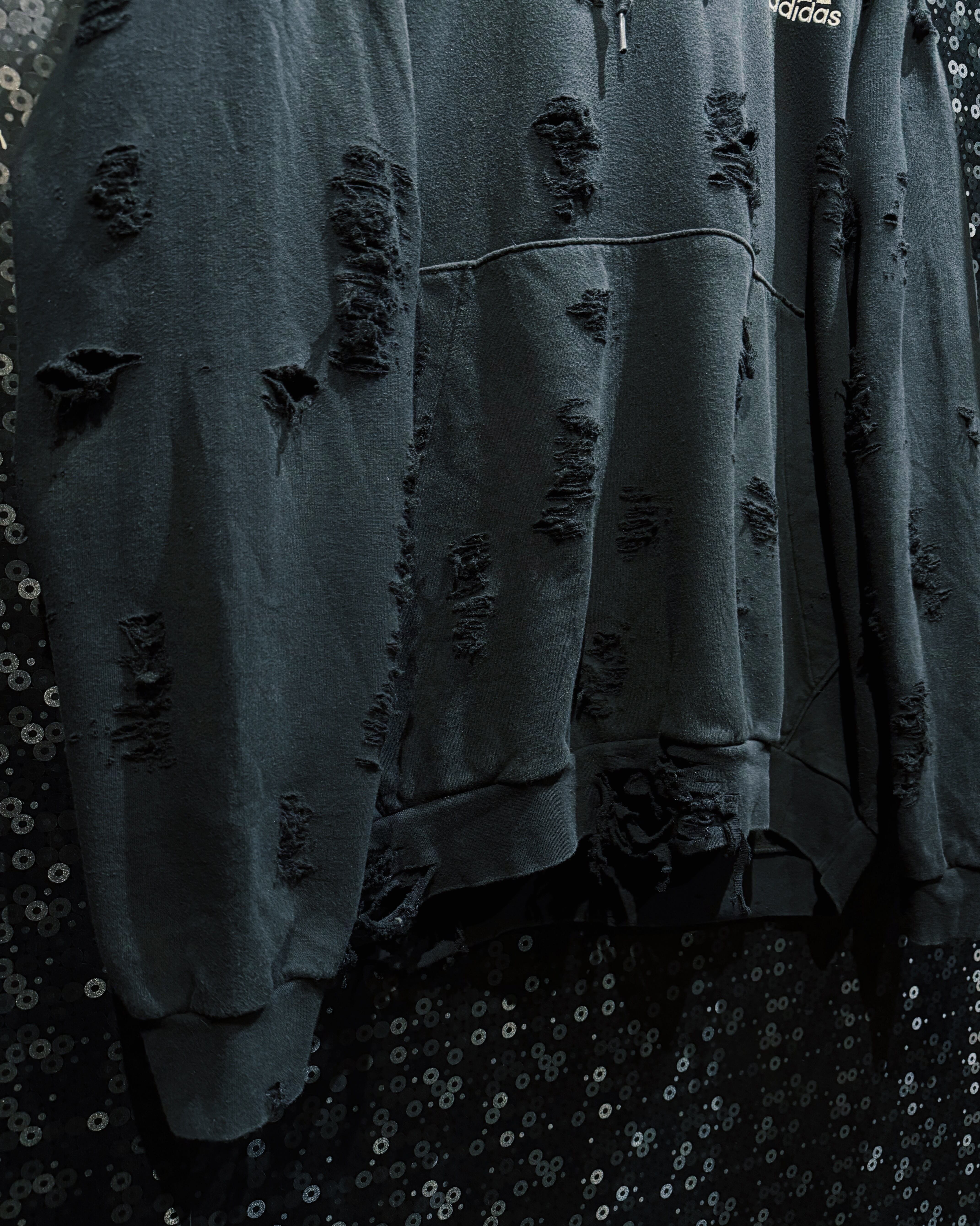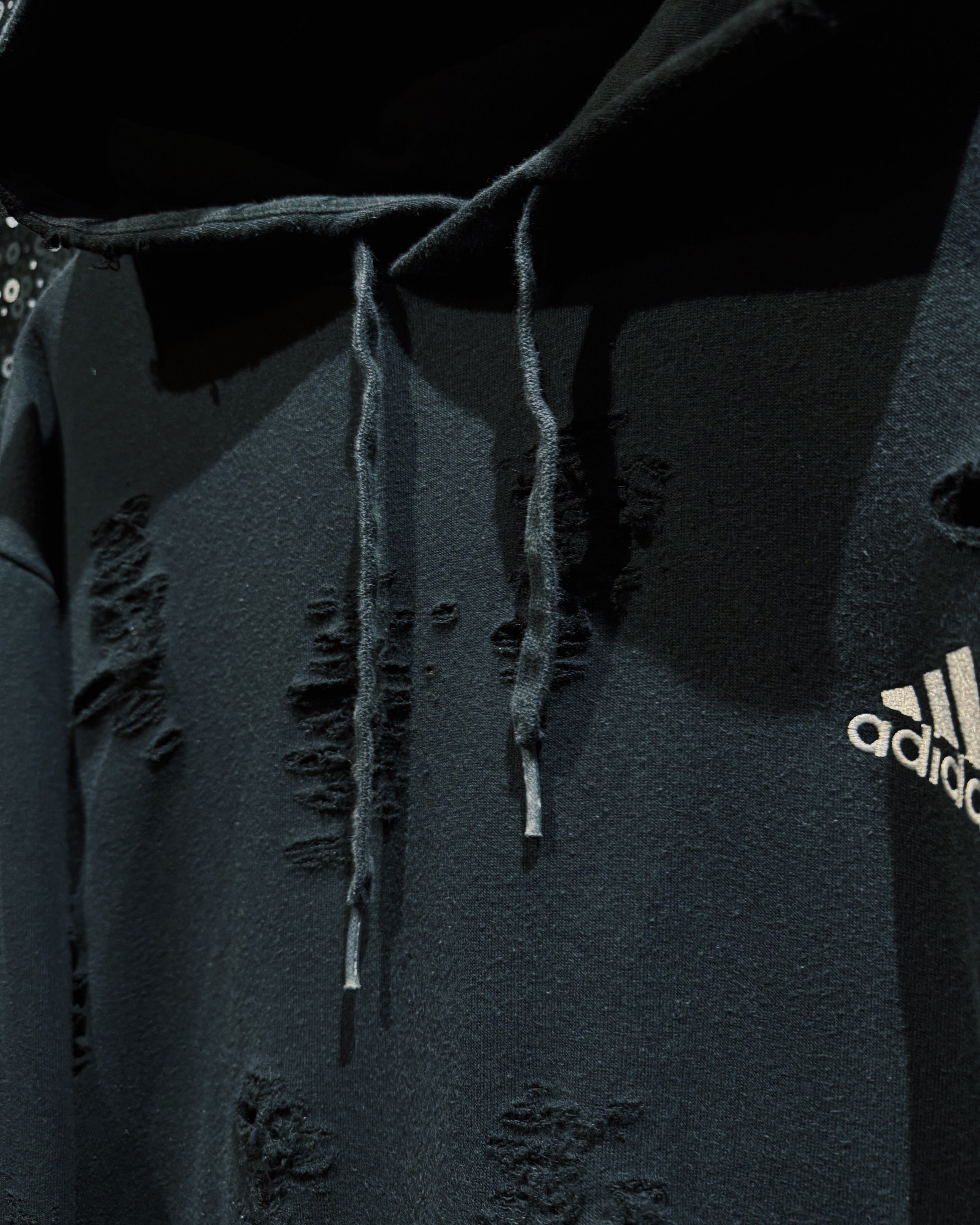 adidasのパフォーマンスロゴフーディーをベースに、ÆIEMが誇る“original boro re:make”加工を施した特別仕様モデル。