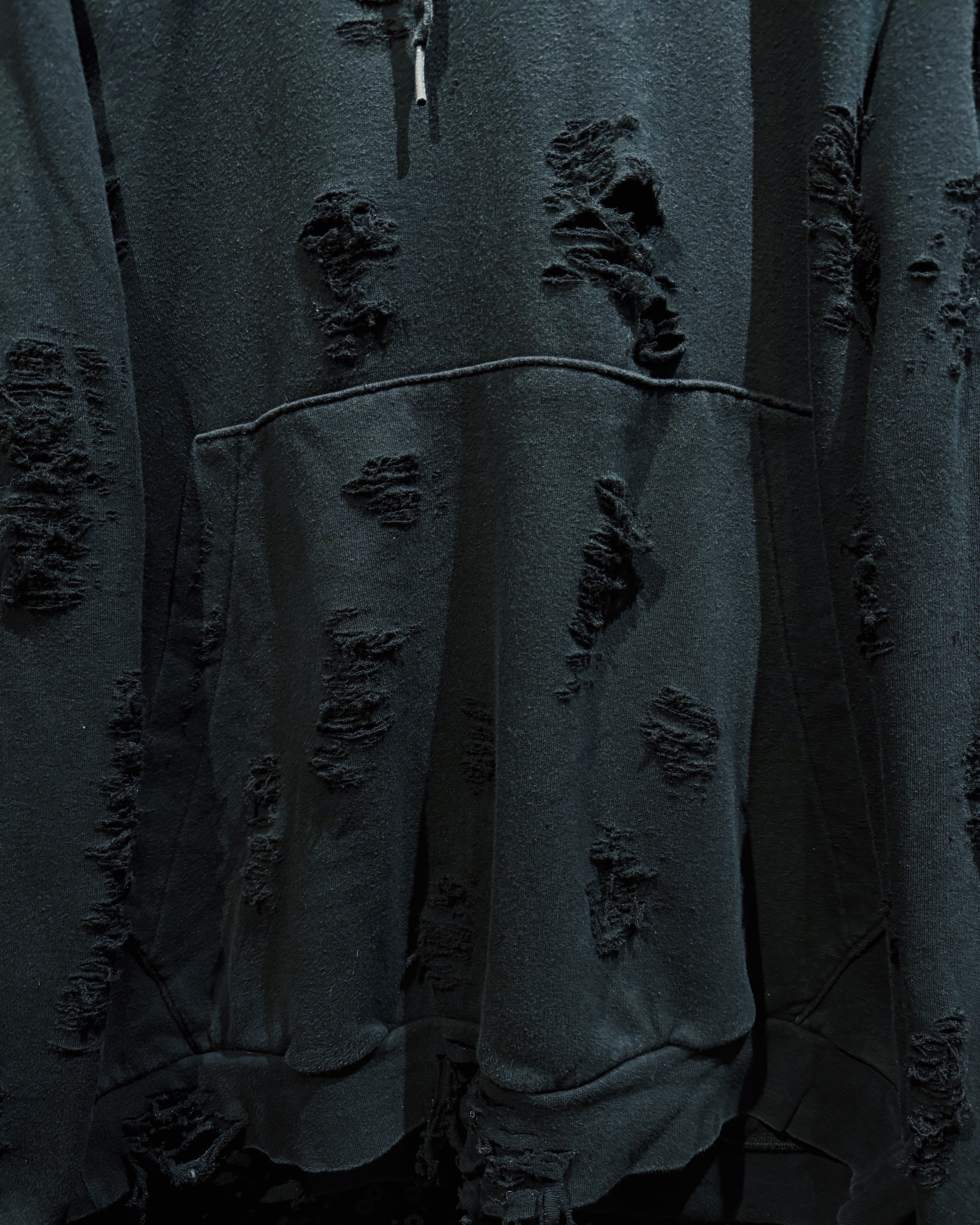 ミニマルでありながら圧倒的な存在感を放つ、ÆIEMのボロリメイクシリーズの中でも象徴的な一着。ストリート、アート、ファッションの境界を軽やかに飛び越える唯一無二のブラックパーカー。