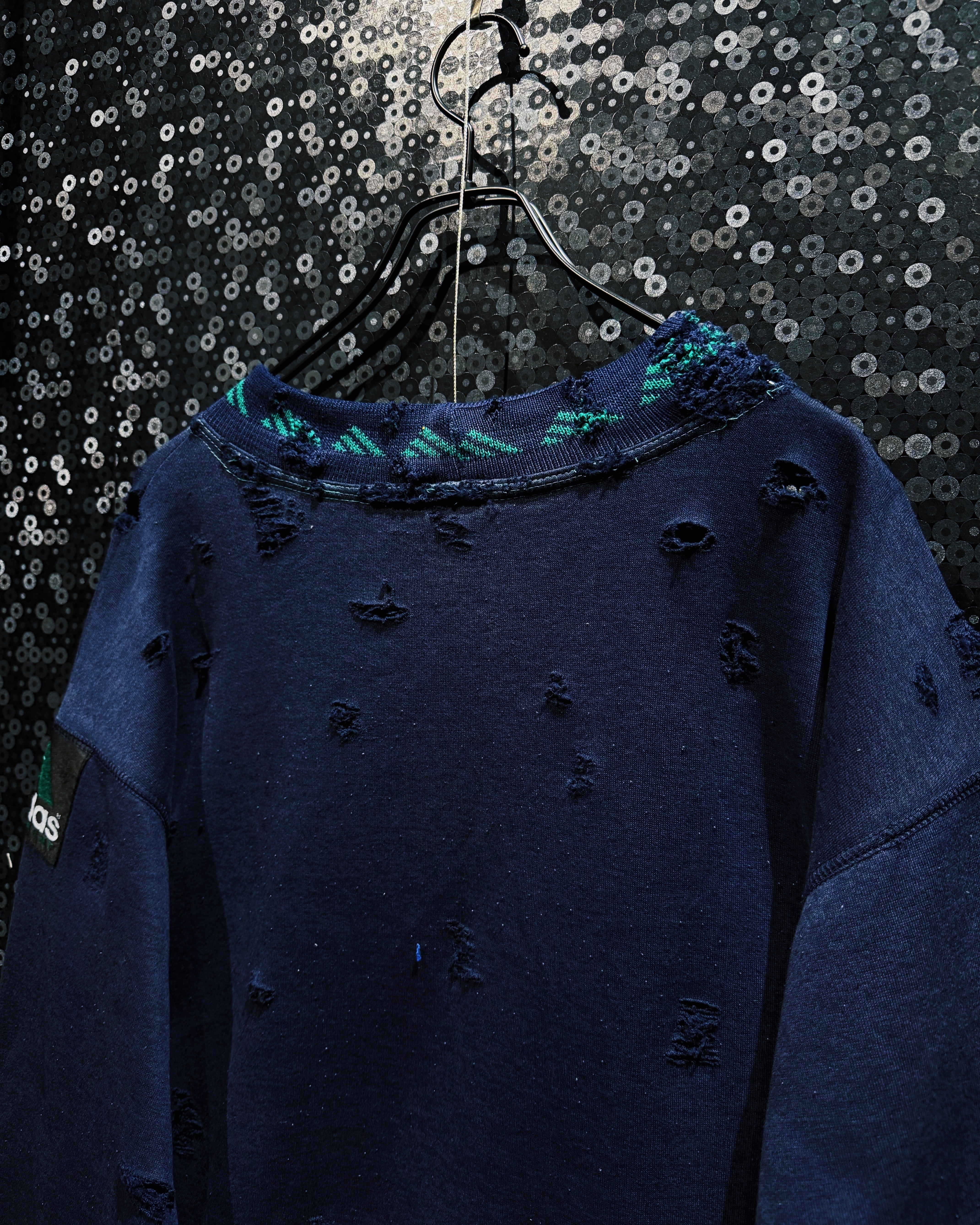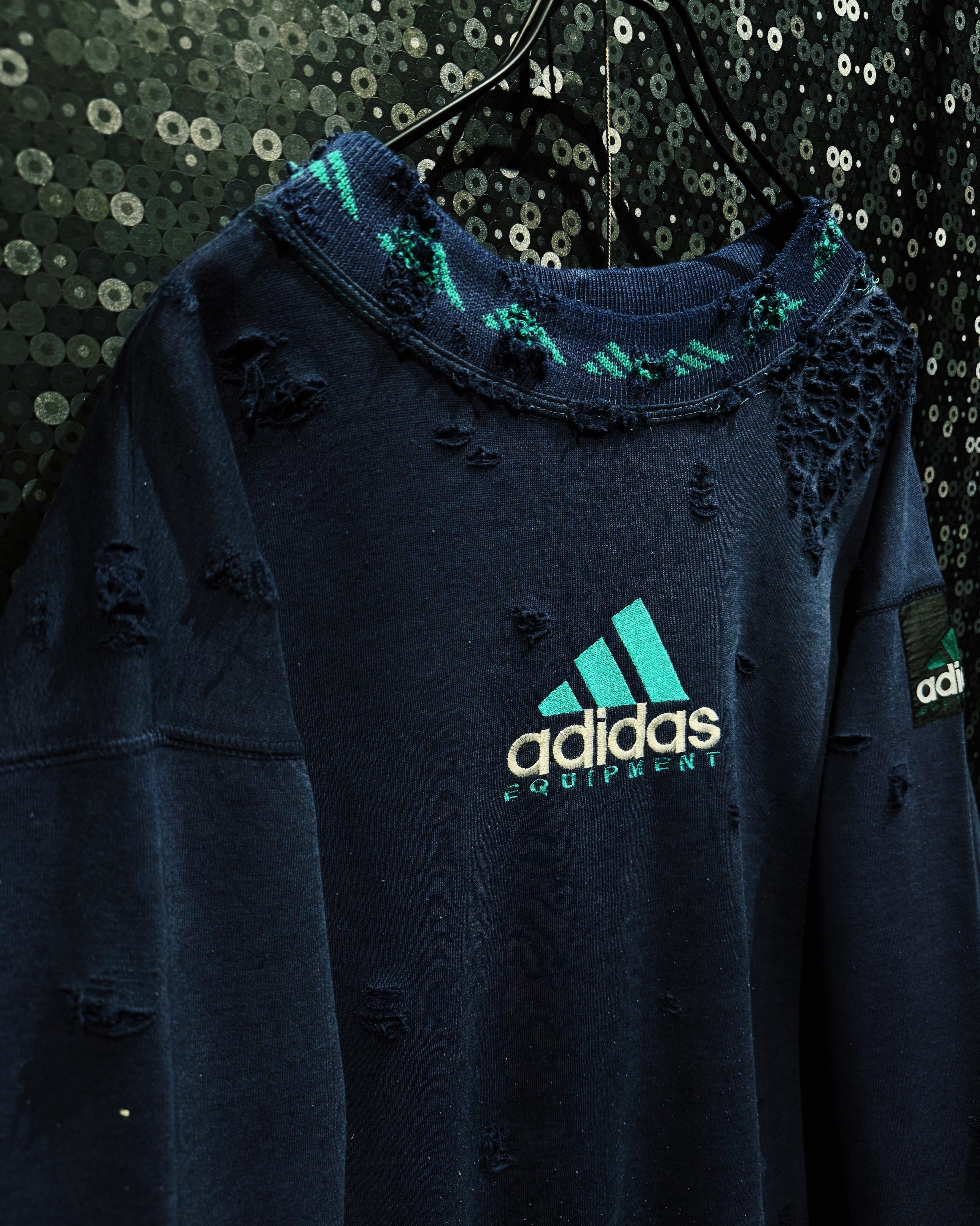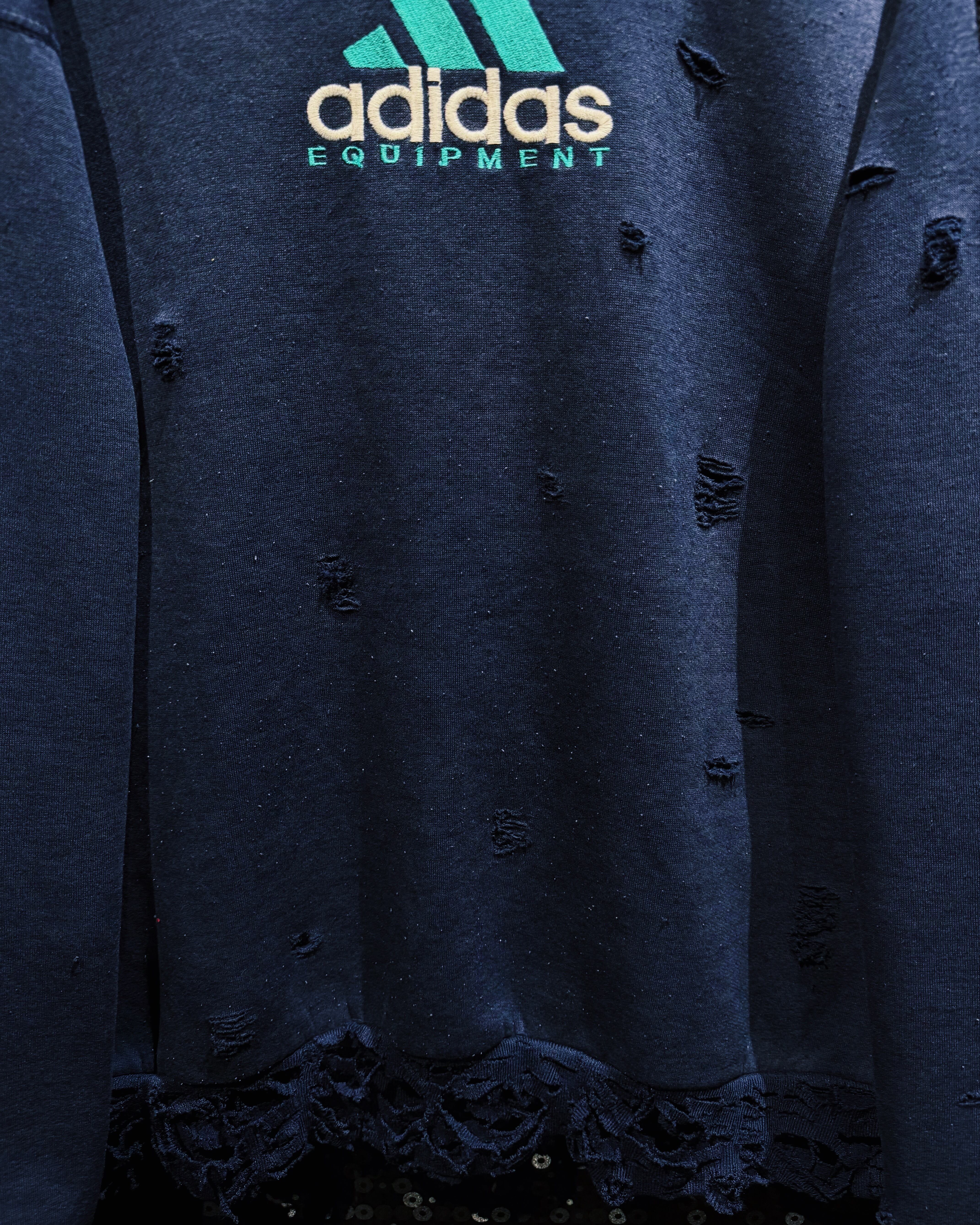 ネイビーボディにエメラルド寄りのターコイズロゴが輝き、EQT特有の機能美を引き立てる。ネック部分には同系色のニットリブをドッキングし、編み柄を残したまま大胆にダメージを加えることで、クラフト感と前衛的なムードを共存させている。