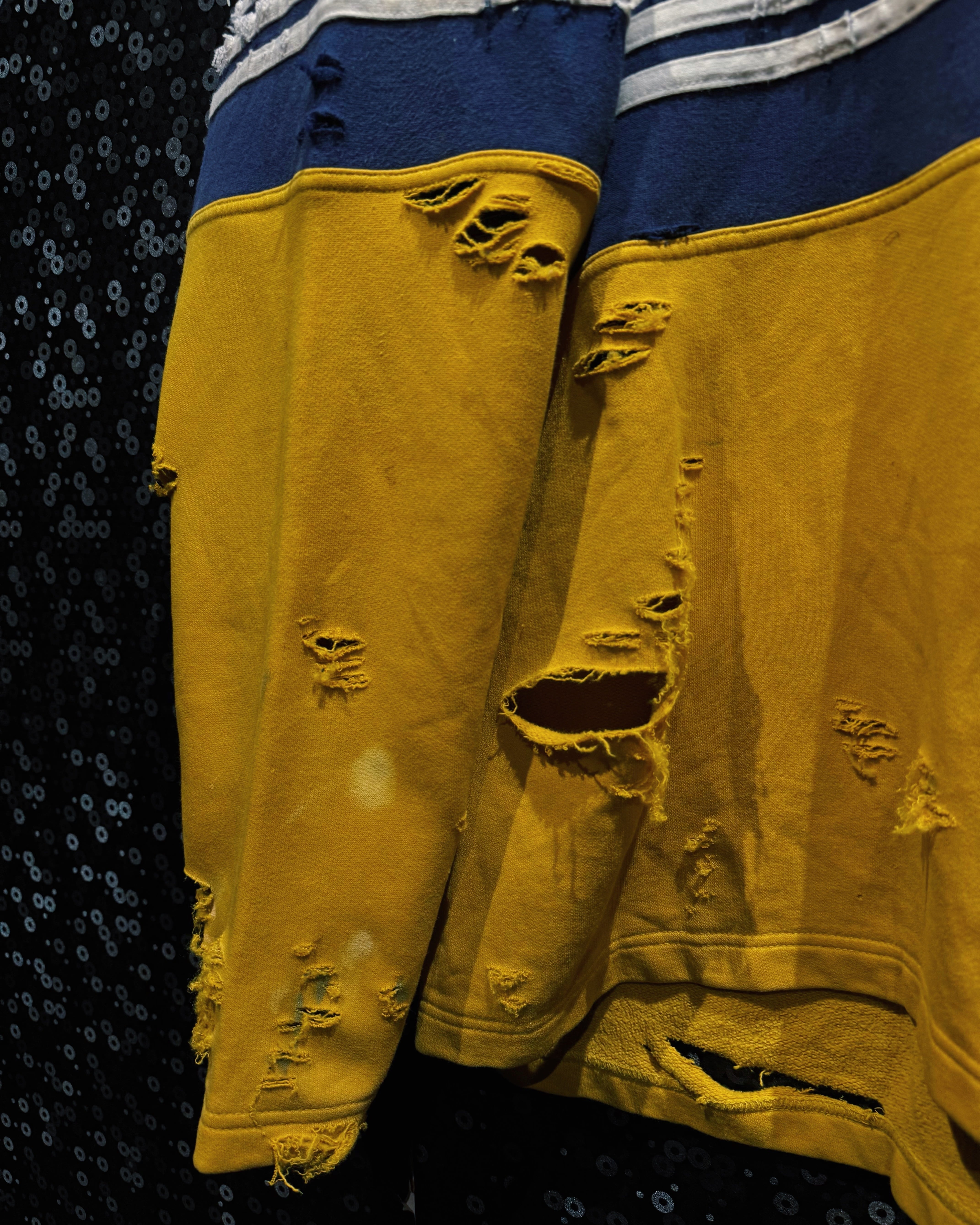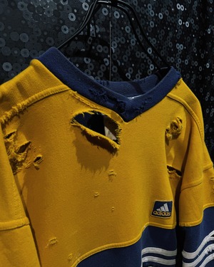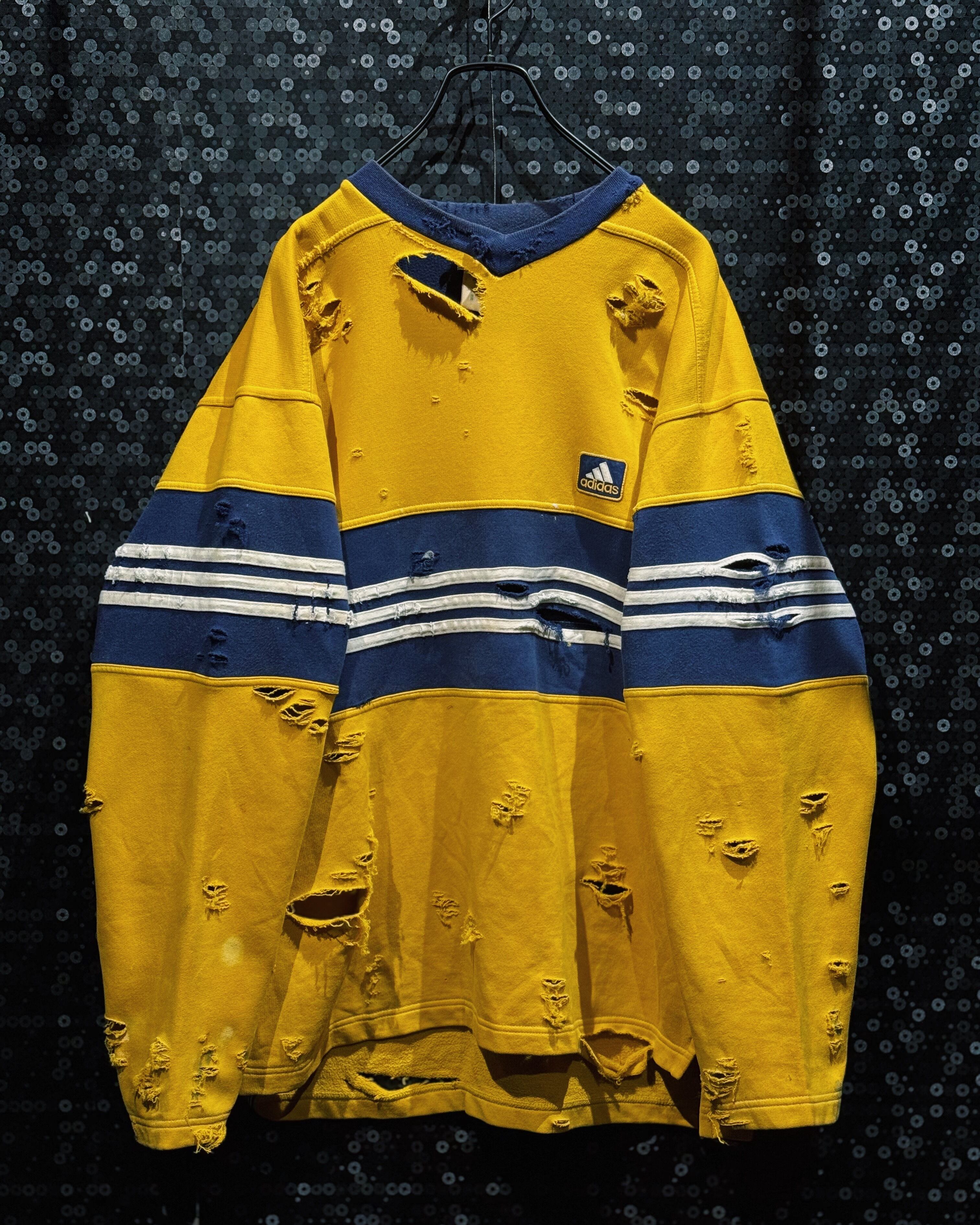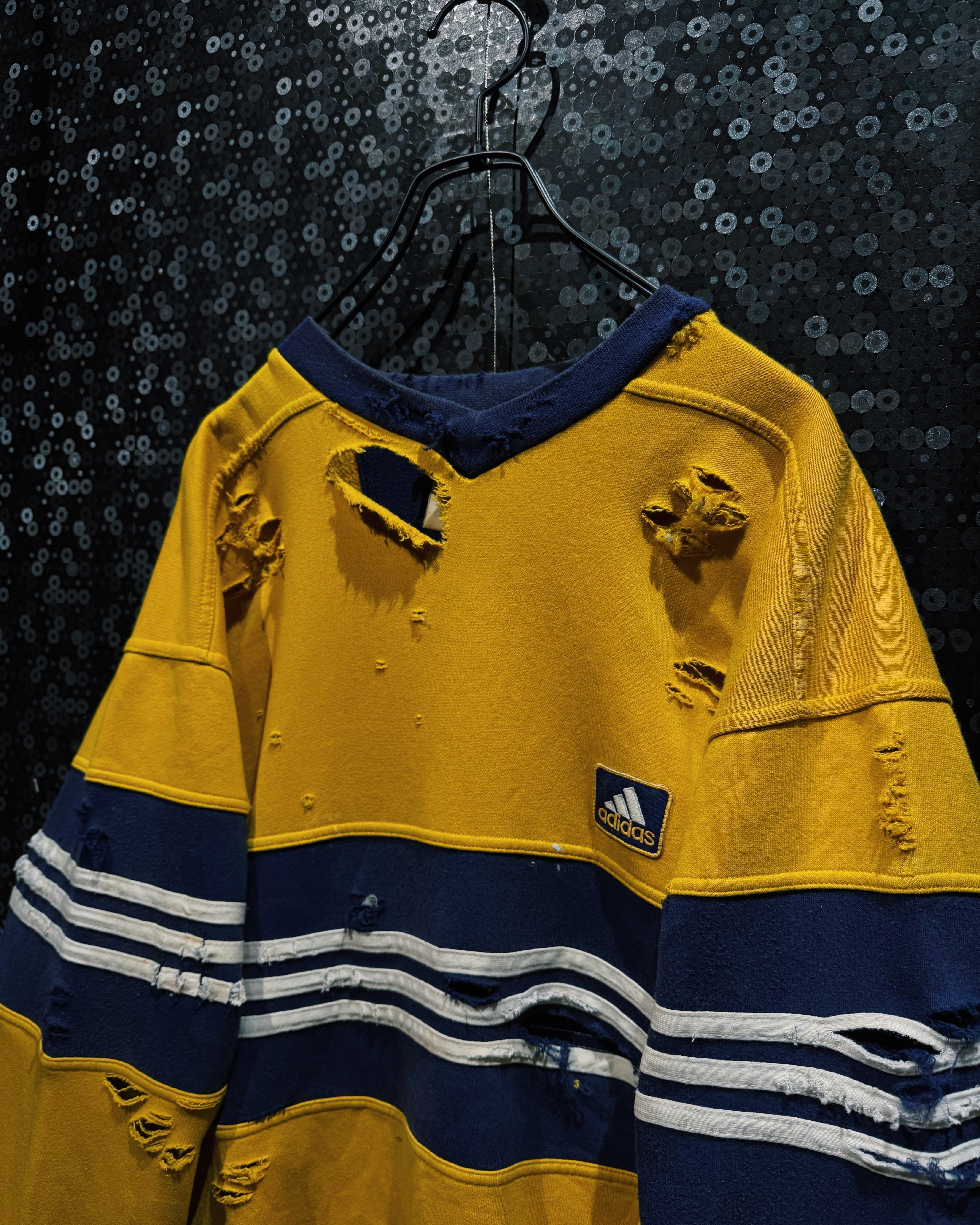 袖から身頃にかけて大胆に施されたダメージ加工は、ただの古着風ではなく、まるで時間とともに風化していったようなリアルなボロ感を表現。胸元にはadidasパフォーマンスロゴのワッペンが付き、ヴィンテージスポーツと現代アートが融合した唯一無二の存在感を放つ。