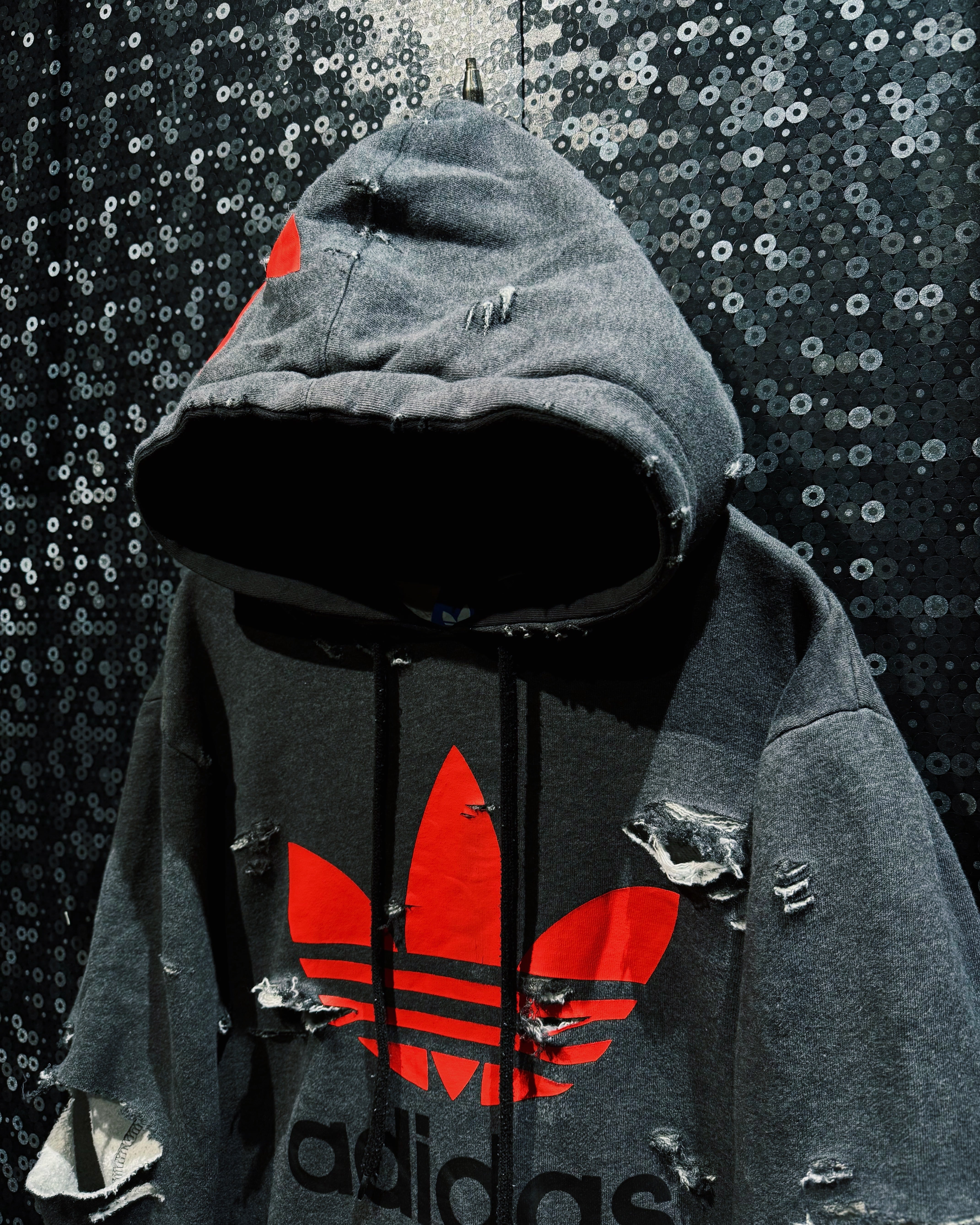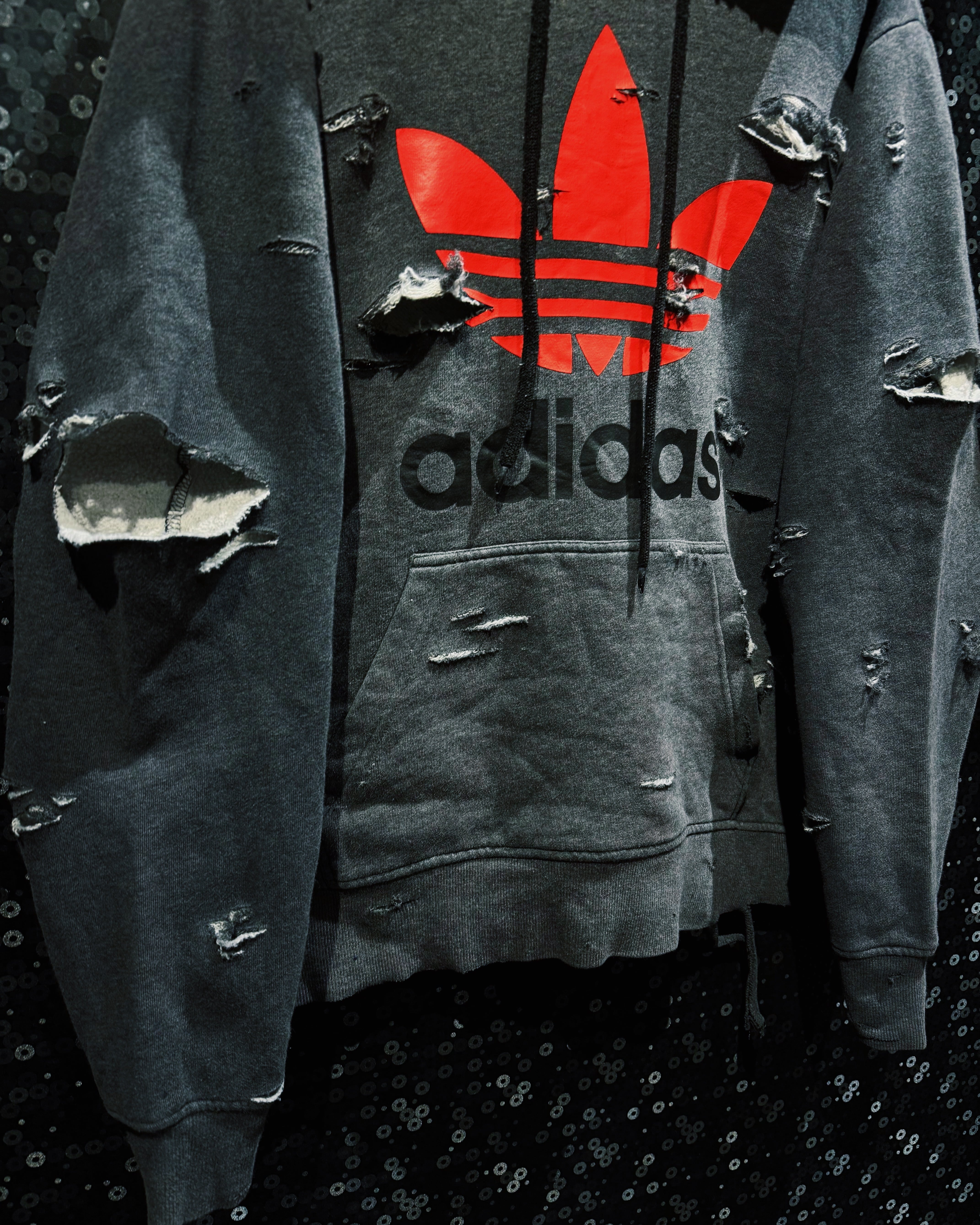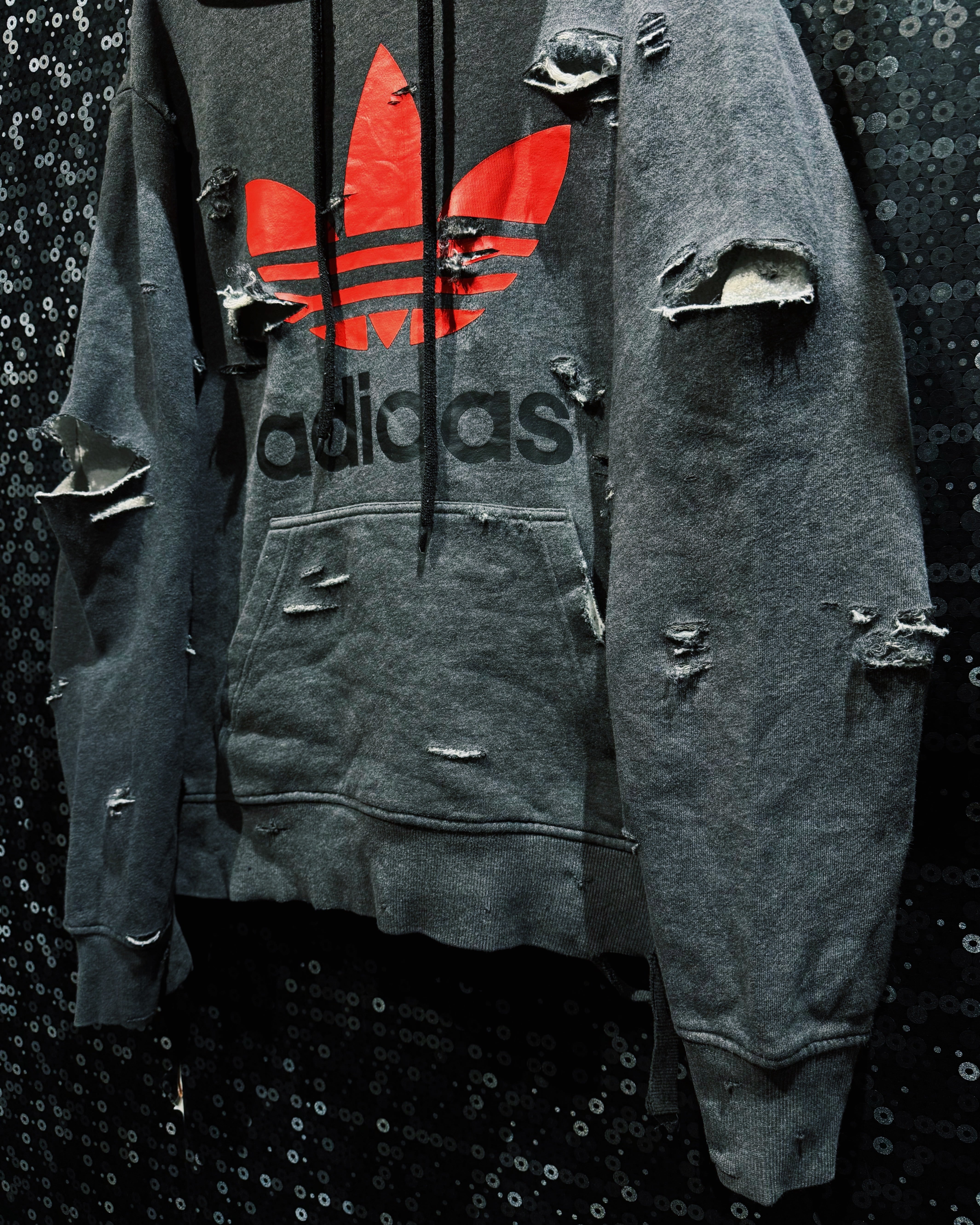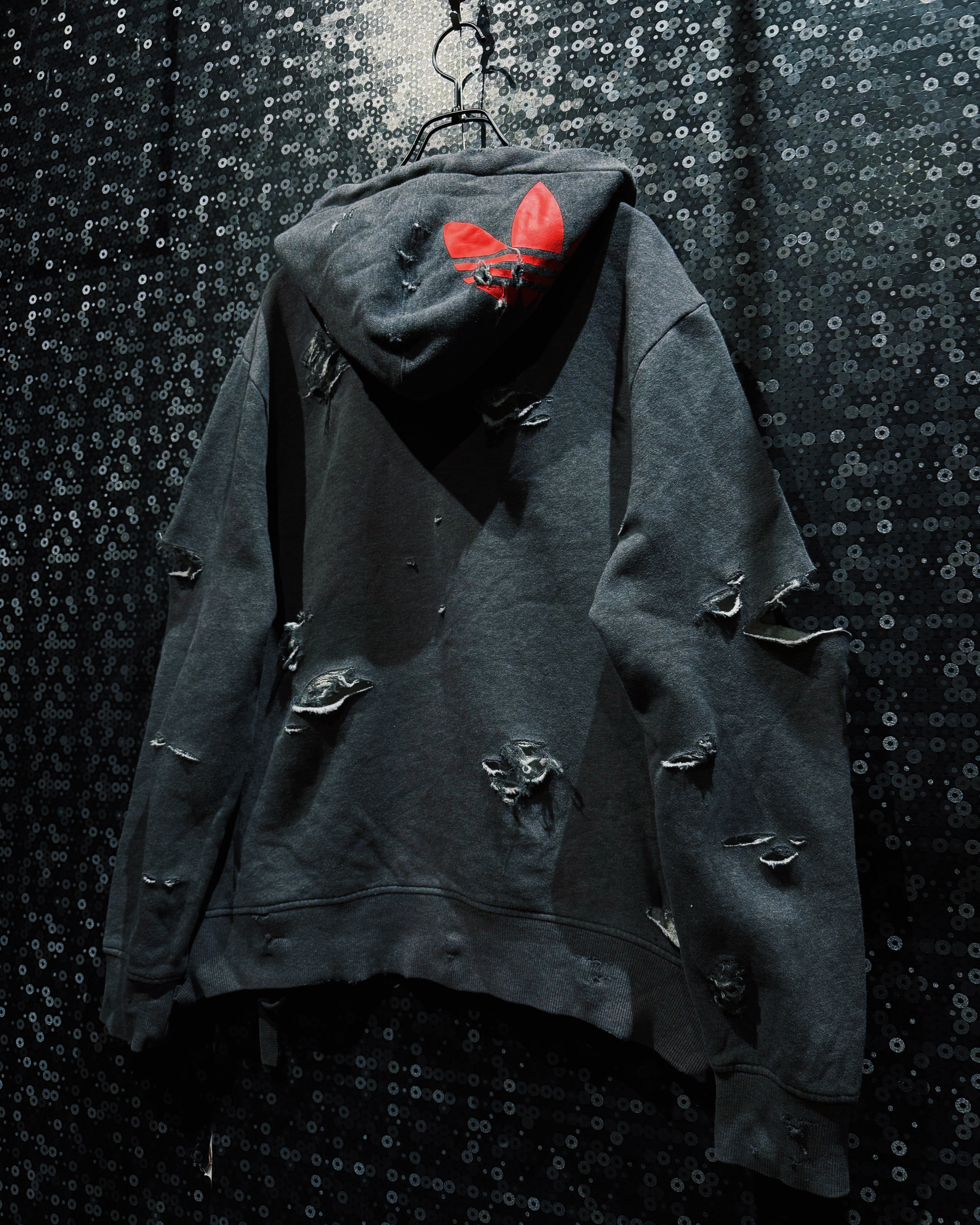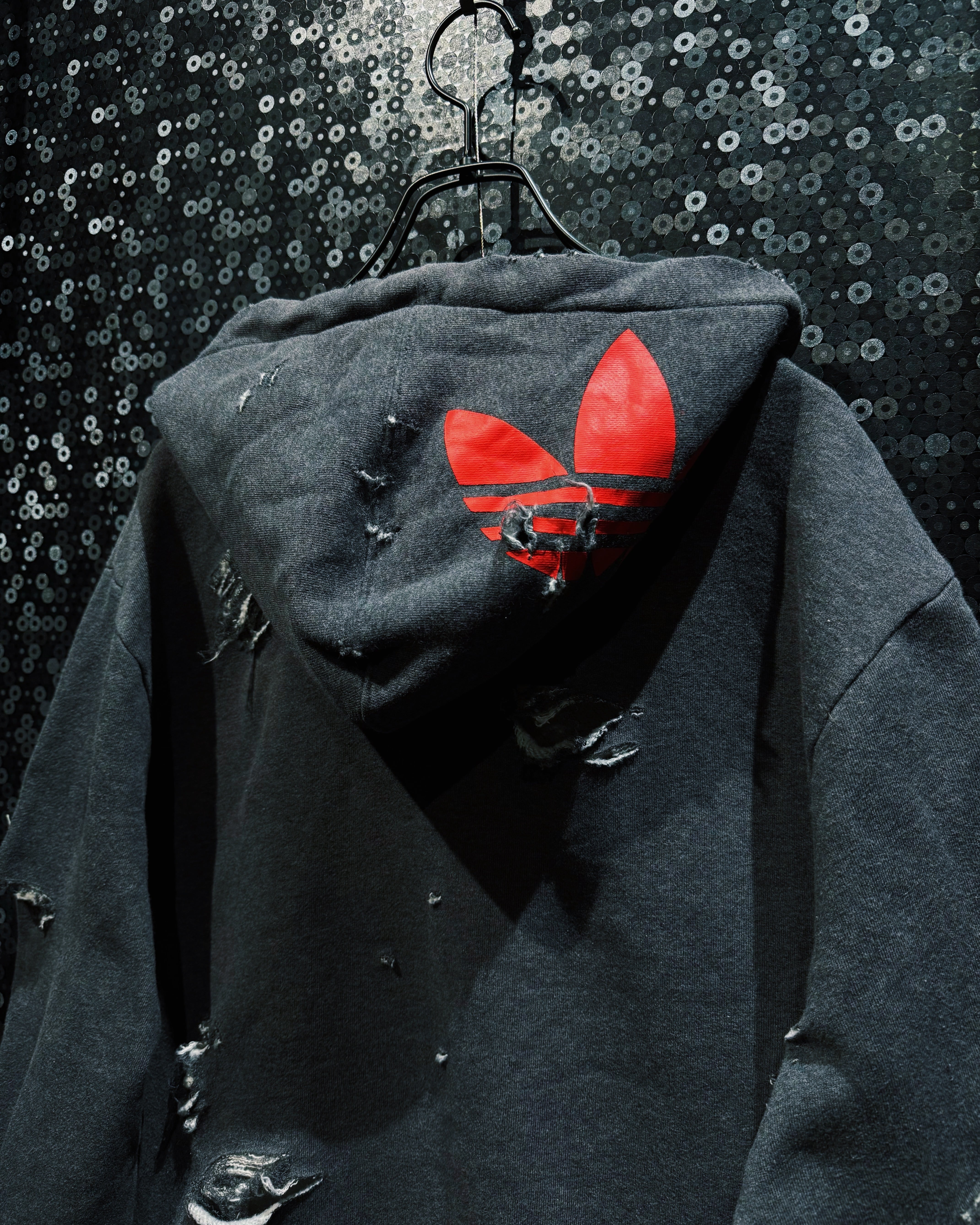 チャコールグレーのボディに、鮮烈なレッドのトレフォイルロゴが映えるadidas originalsフーディーをベースに、AEIEM独自の”boro re:make”加工を施した一着。