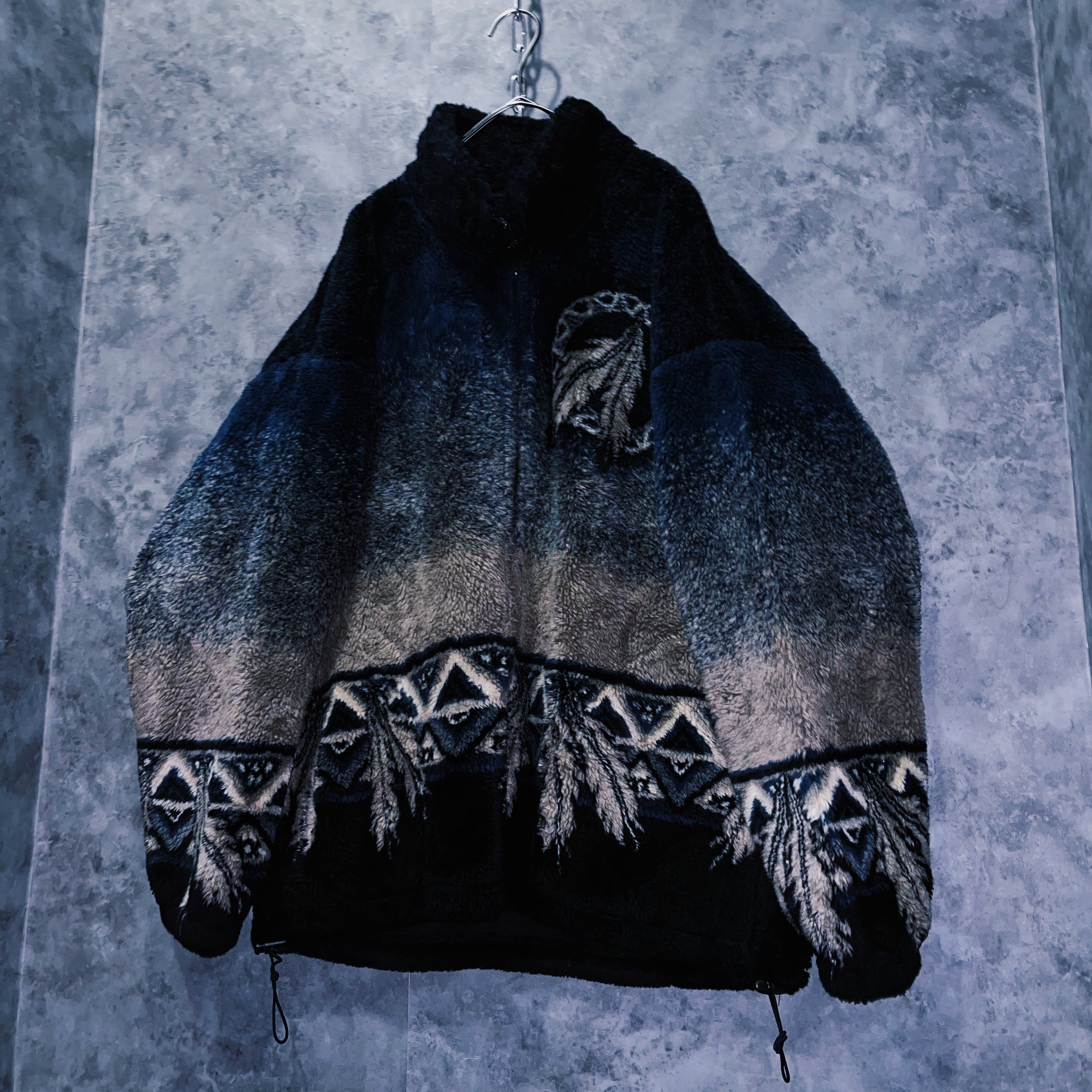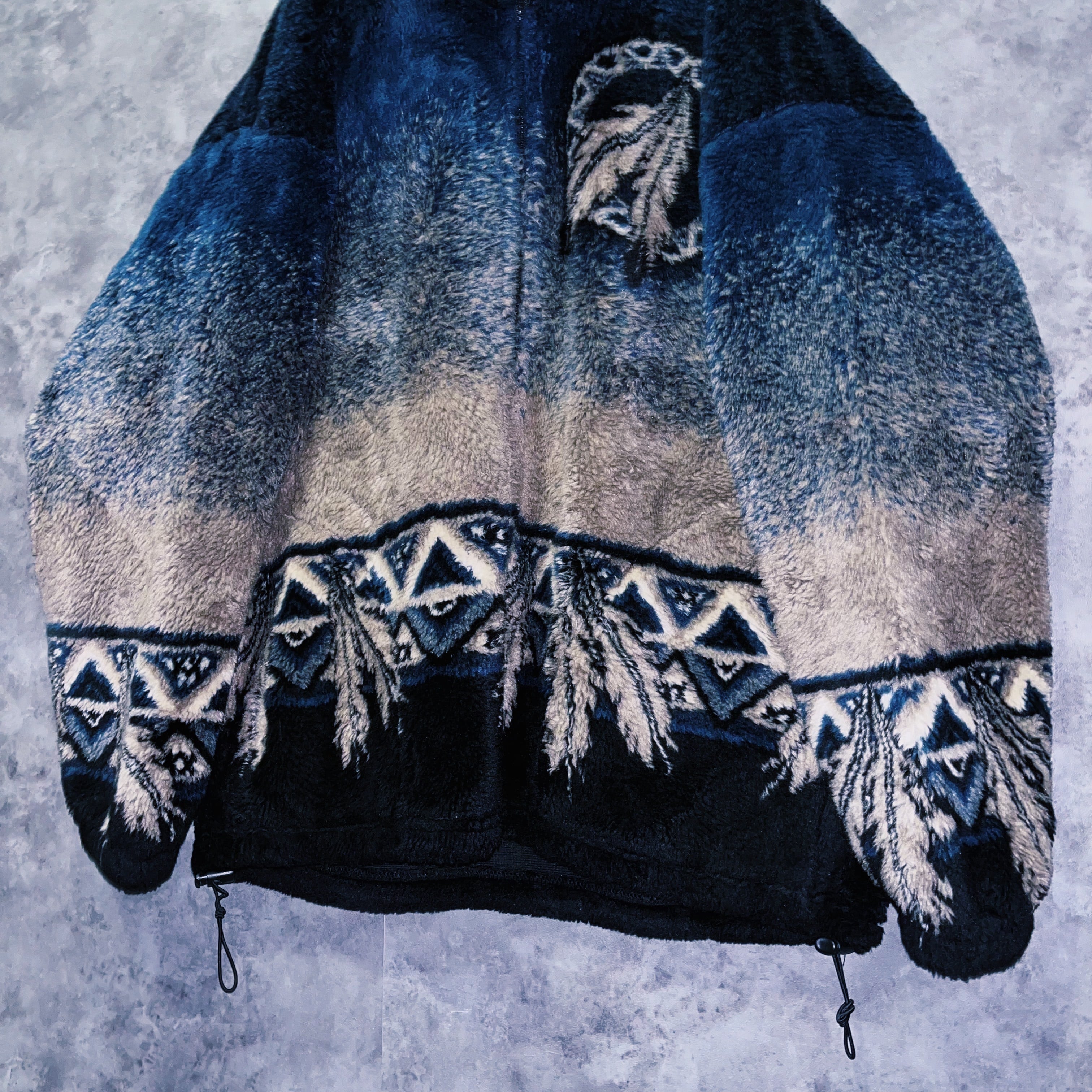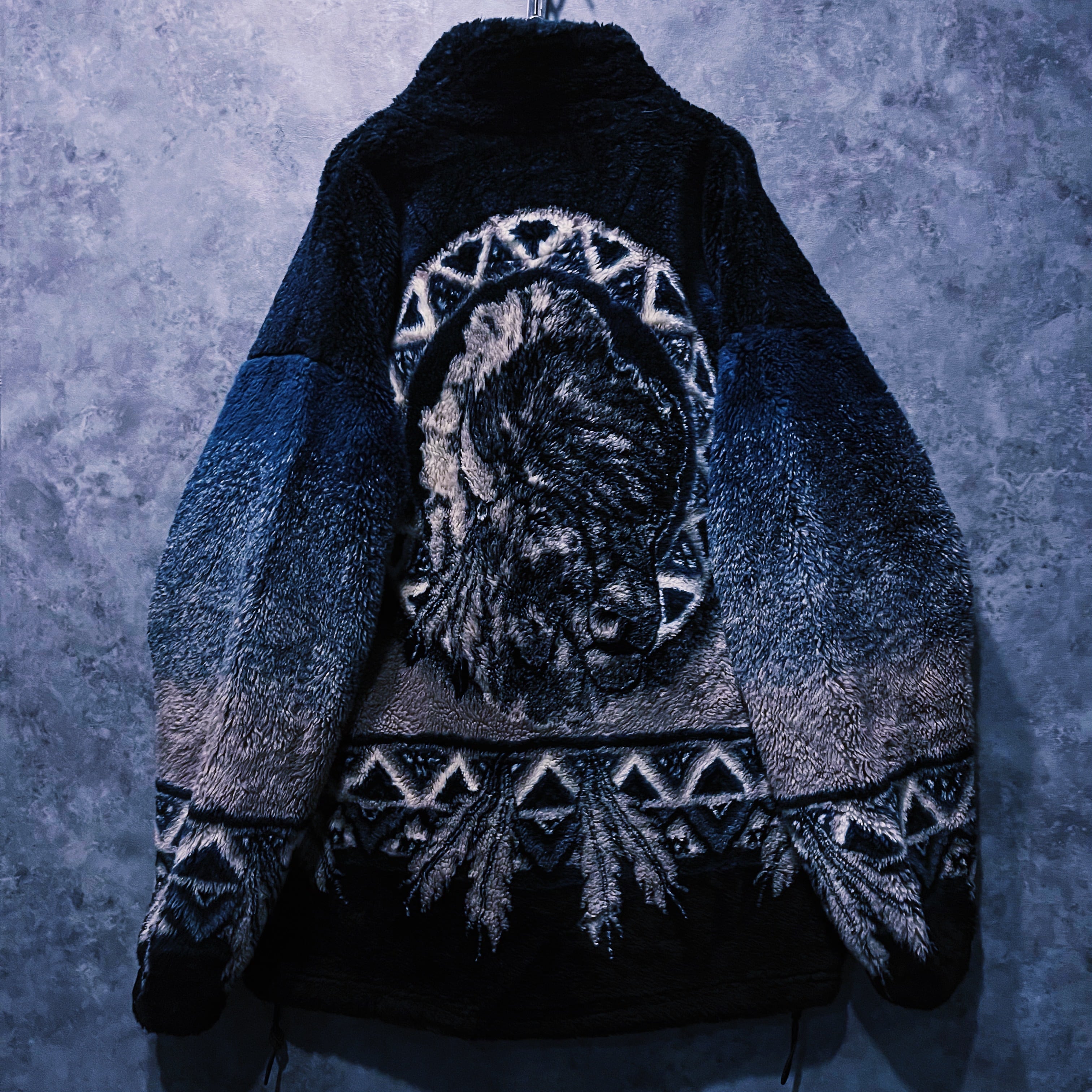 秋冬のコーデにぴったりな起毛フリース。インディゴカラーをベースにエスニックなネイティブアメリカンがデザインされた一枚。
