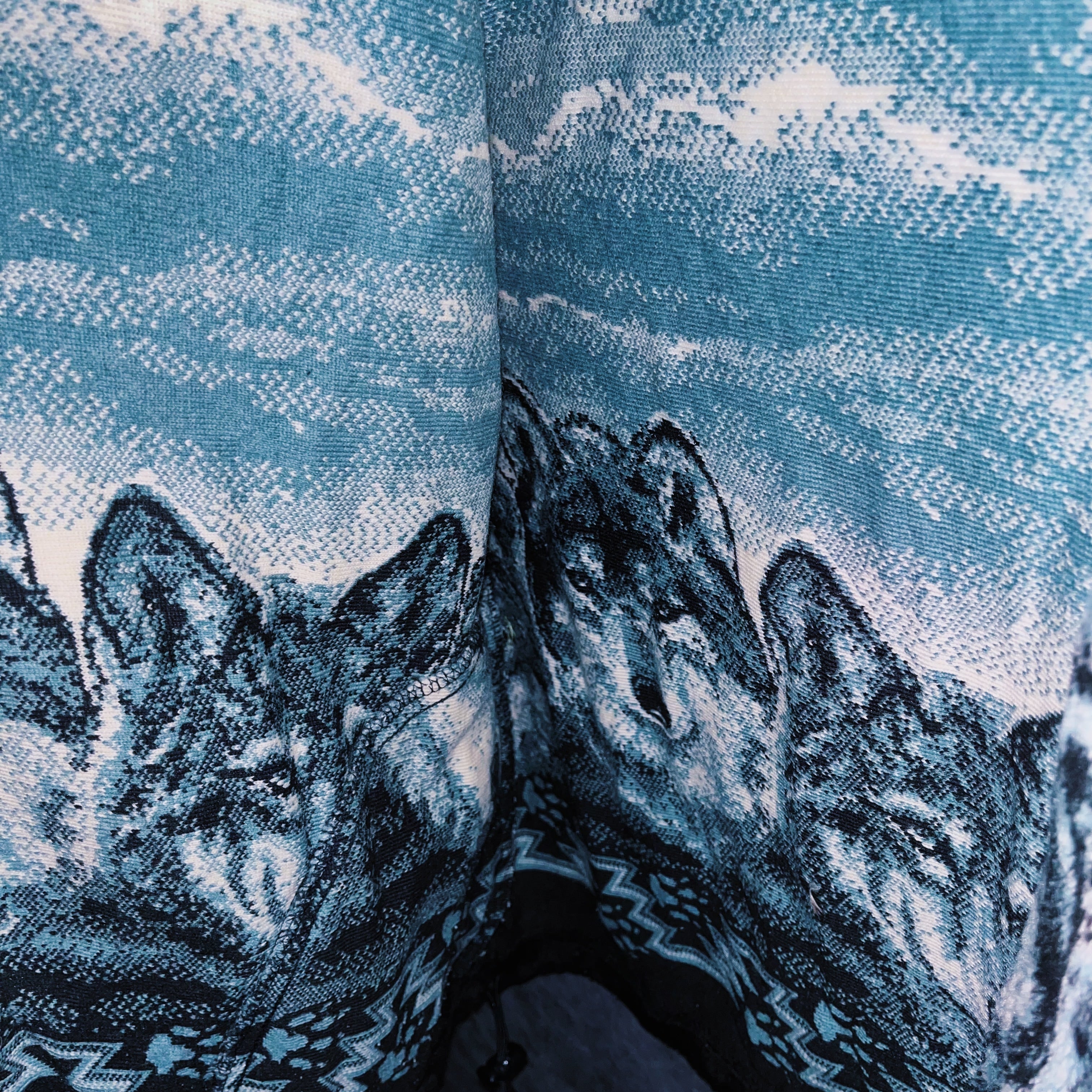 秋冬のコーデにぴったりな起毛フリース。ブラックカカラーをベースに森に佇む狼の群れがデザインされた一枚。