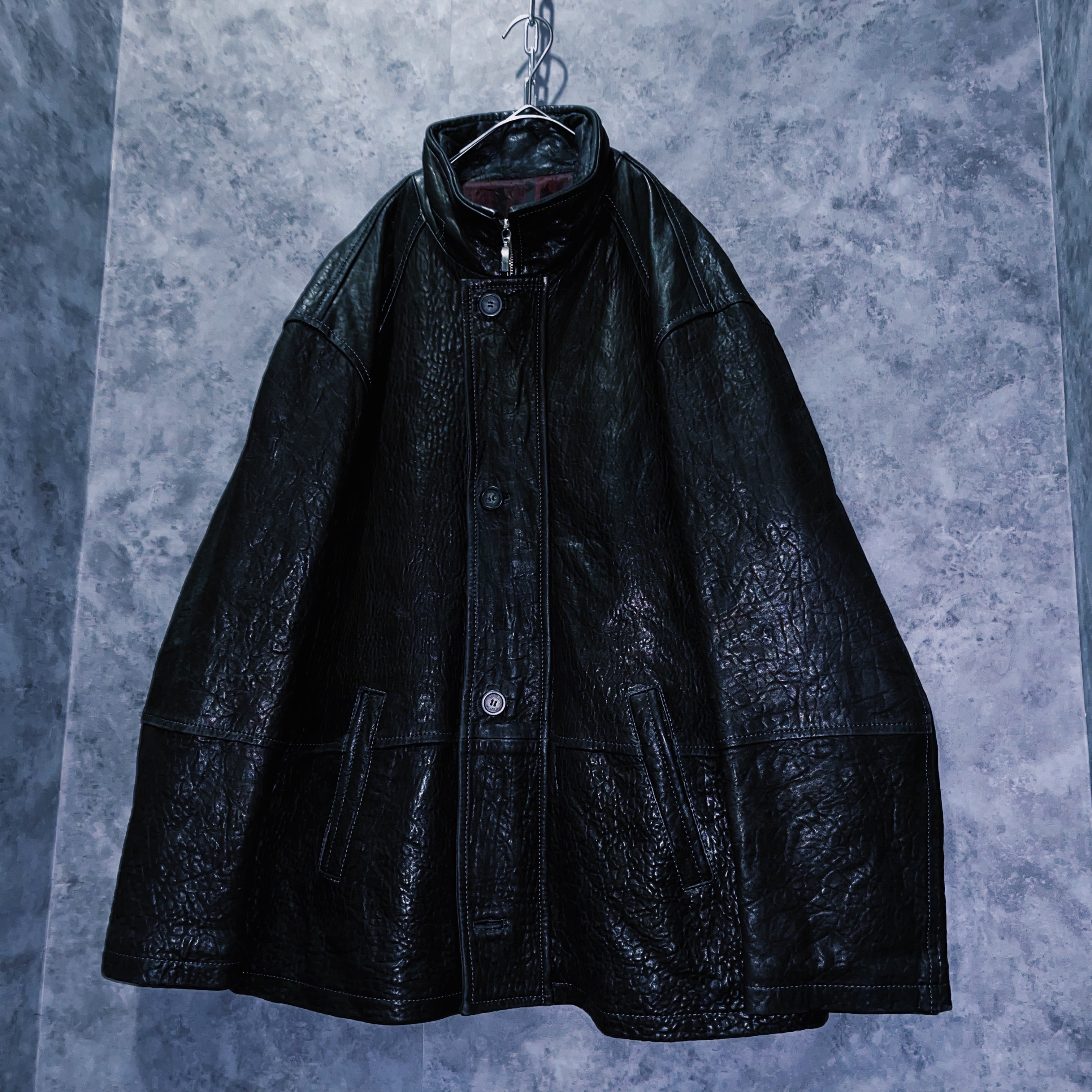 鈍く光るレザーらしい光沢を持ち、重厚感とダークな存在感たっぷりのデザイン。スタンドネックで冬の刺さるような寒さからしっかりと首元を守ってくれる性能。大きなボタンがフロントデザインを担い、存在感たっぷりなそのデザインは、長めの丈で構成されたルーズジャケットとの相性抜群。