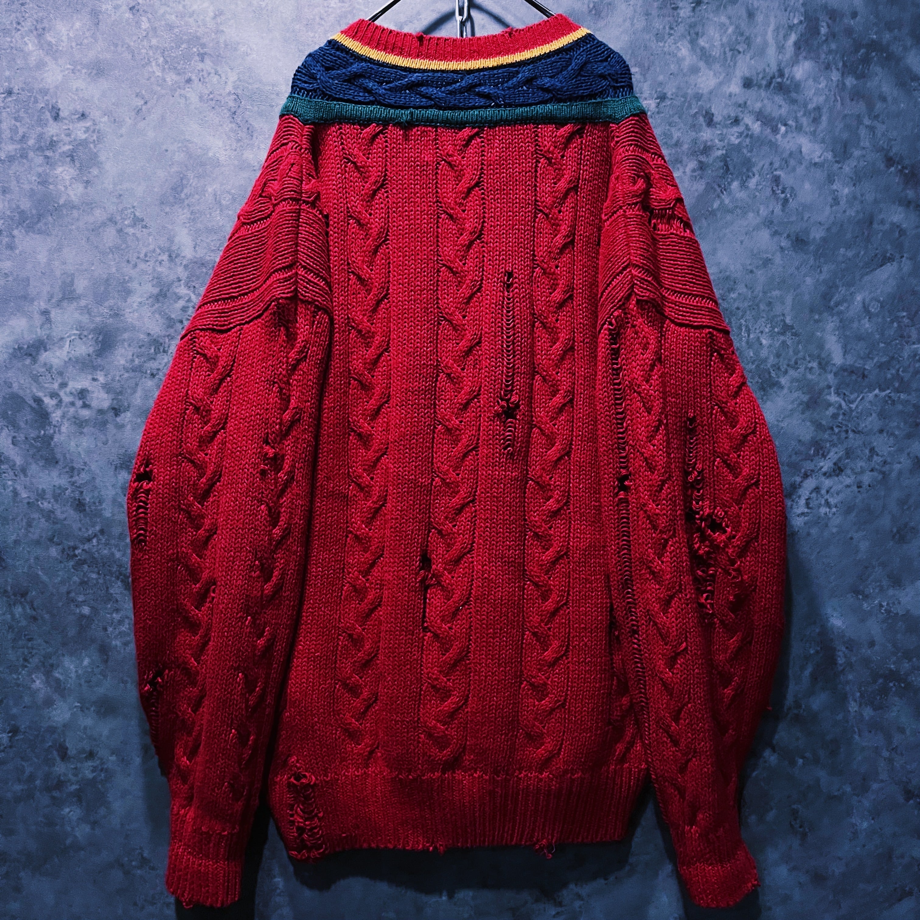 縄のように編み目が立体的に交差した模様が特徴的なケーブルニットを当店自慢のダメージ加工を施したことで立体感に加え、ロックテイストなデザインに仕上がった一枚。