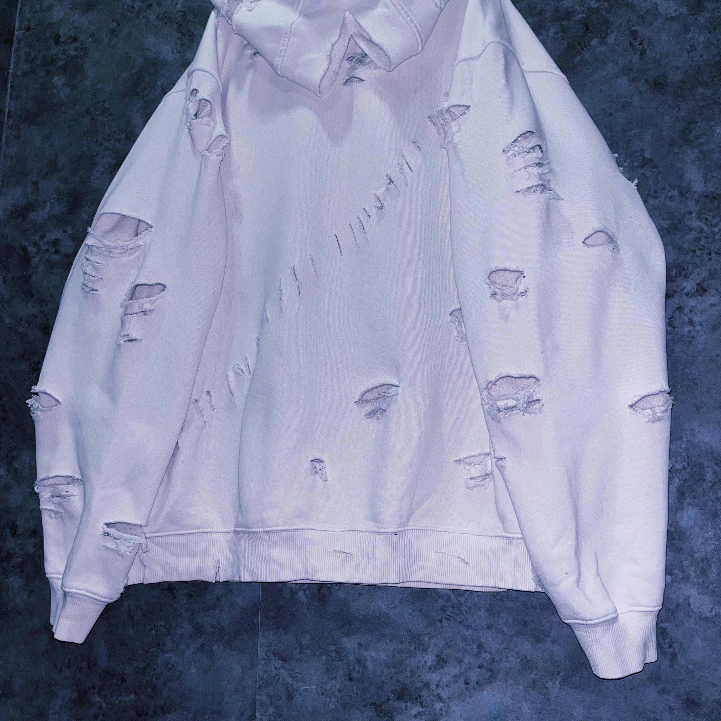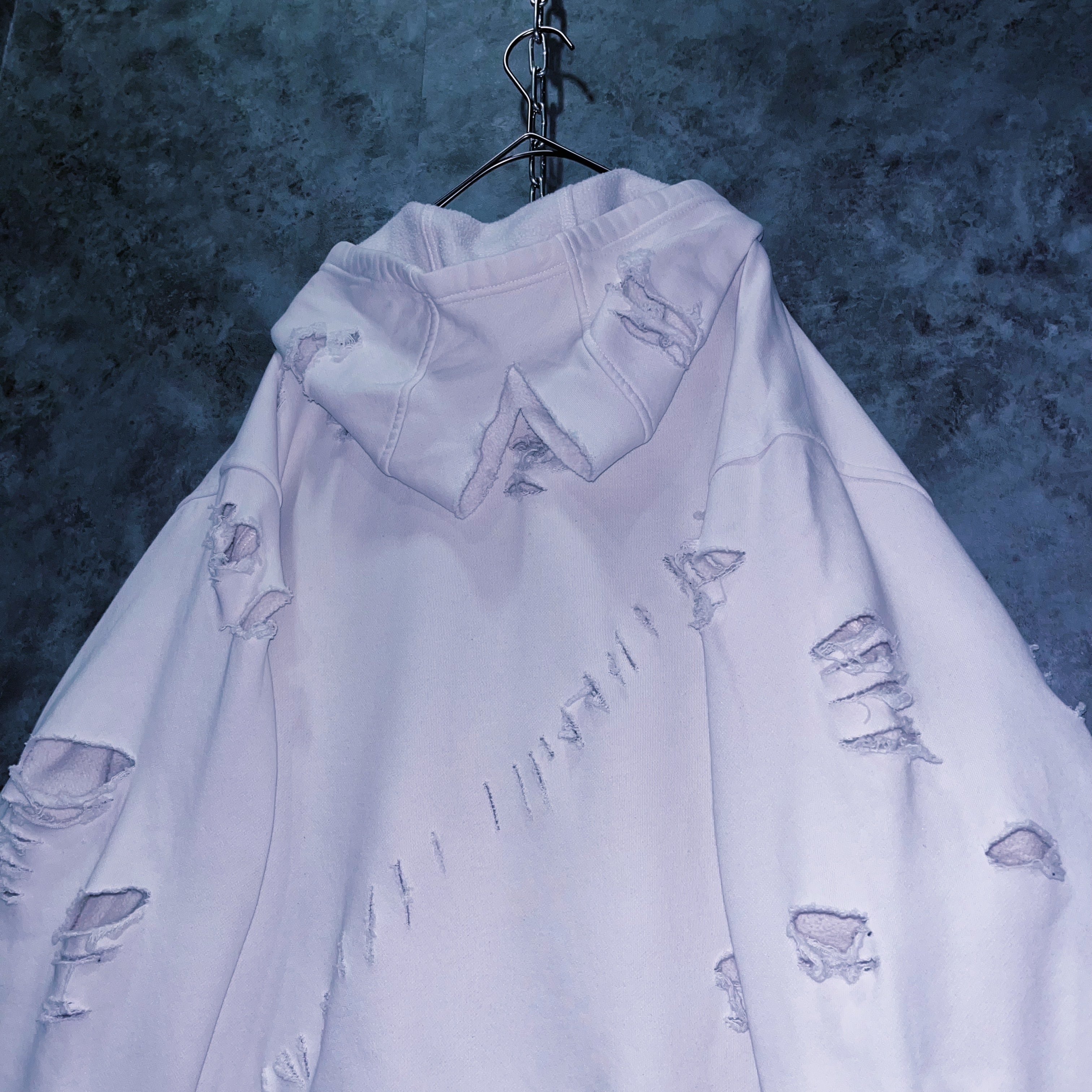 当店の人気アイテムであるボロカスタムの中でも特に毎回即完をいただいているホワイトカラー。フロントロゴデザインもその存在感とグランジ加工の相性が完璧で、一枚でサマになるのはもちろん、ジャケットやコートのインナーとしてもしっかり主張してくれるデザイン性の高さ。