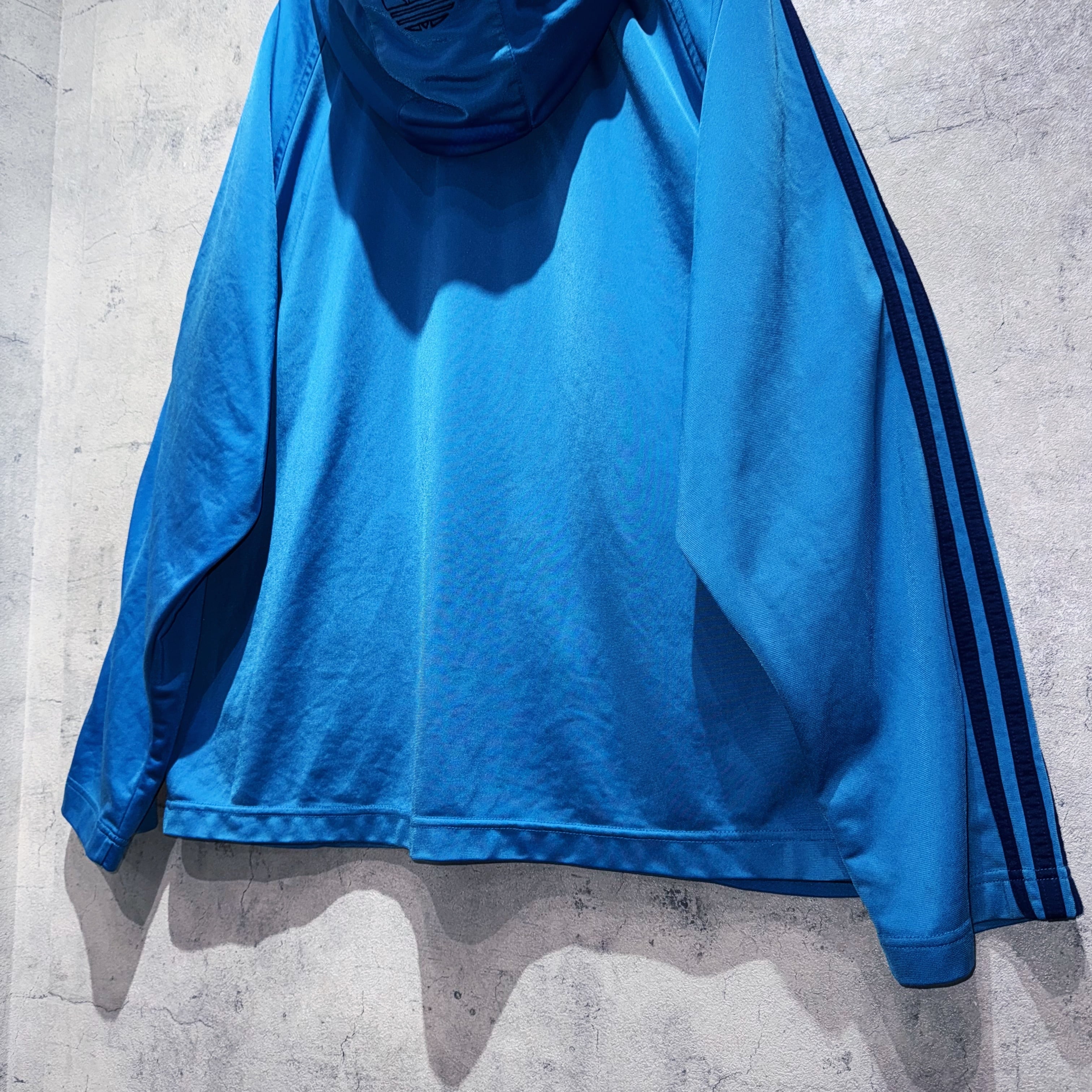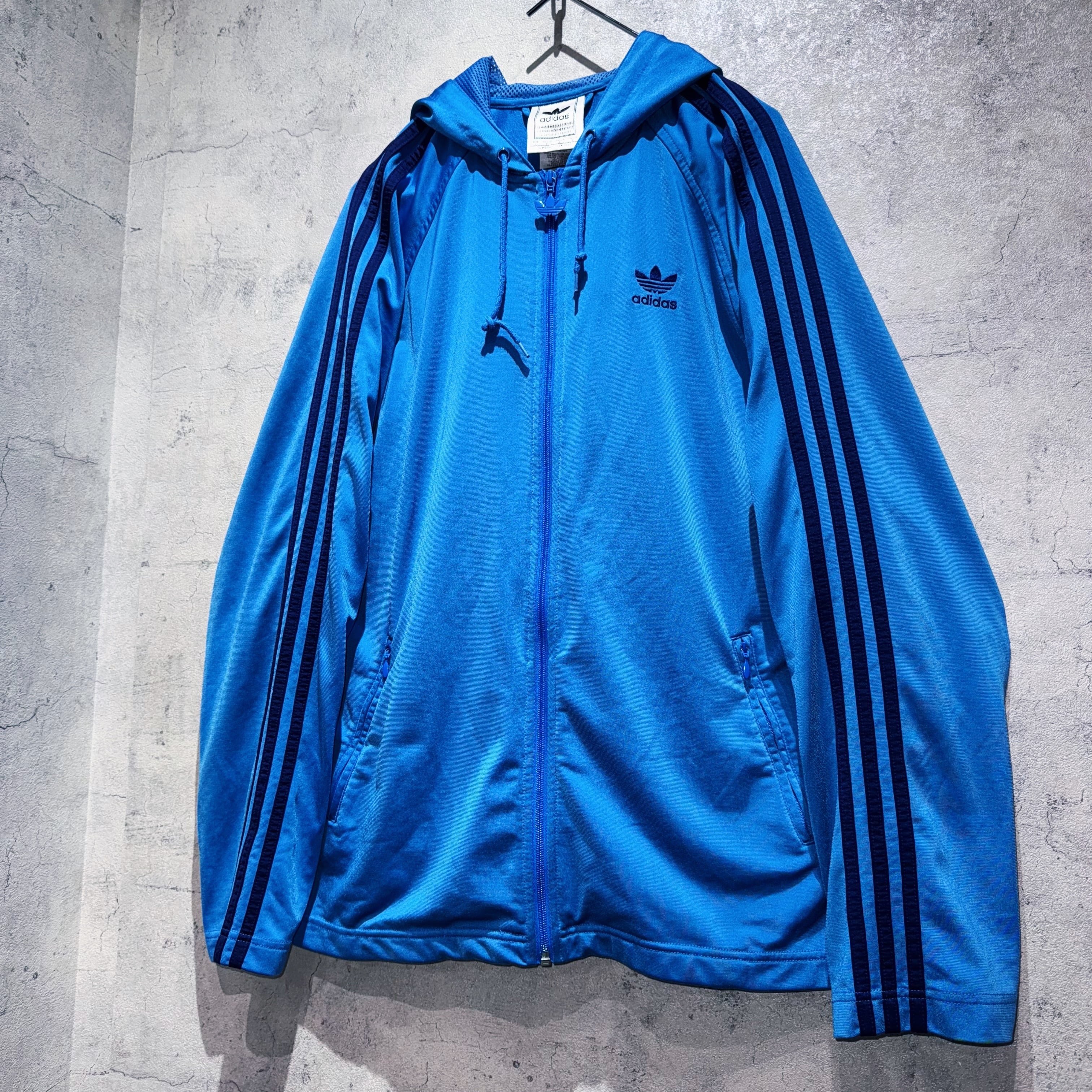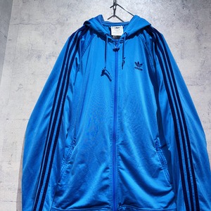 色鮮やかなブルーのボディに、アディダスの象徴であるトレフォイルのロゴと3ストライプスをあしらったアイコニックなフーディートラックジャケット。フロントのジップがトレフォイルの形になっているのも魅力的ですね。