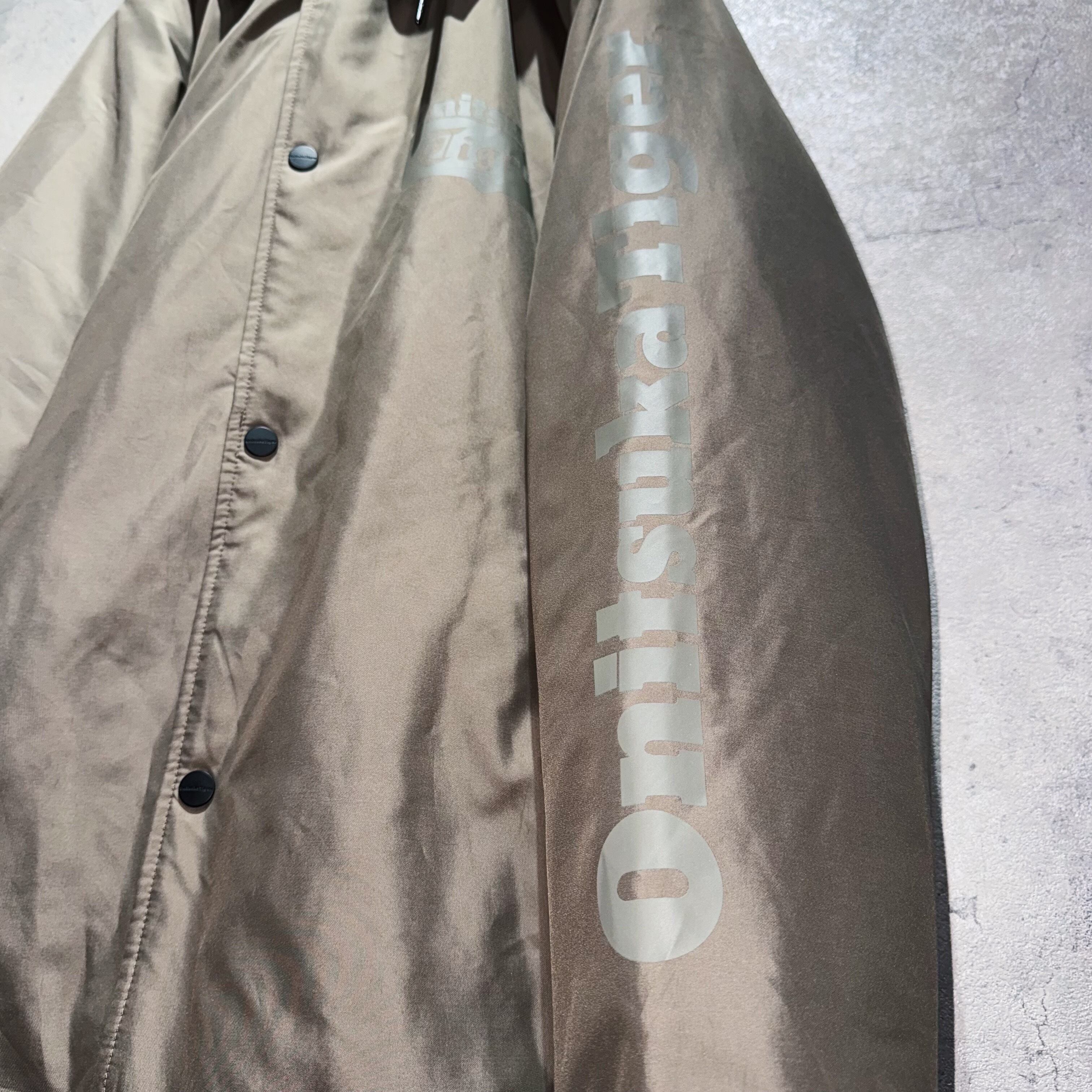 クラシカルなベージュのボディに、胸元と袖のラインにはブランドロゴ、背面にはアイコニックな虎のグラフィックを載せたコーチジャケット。