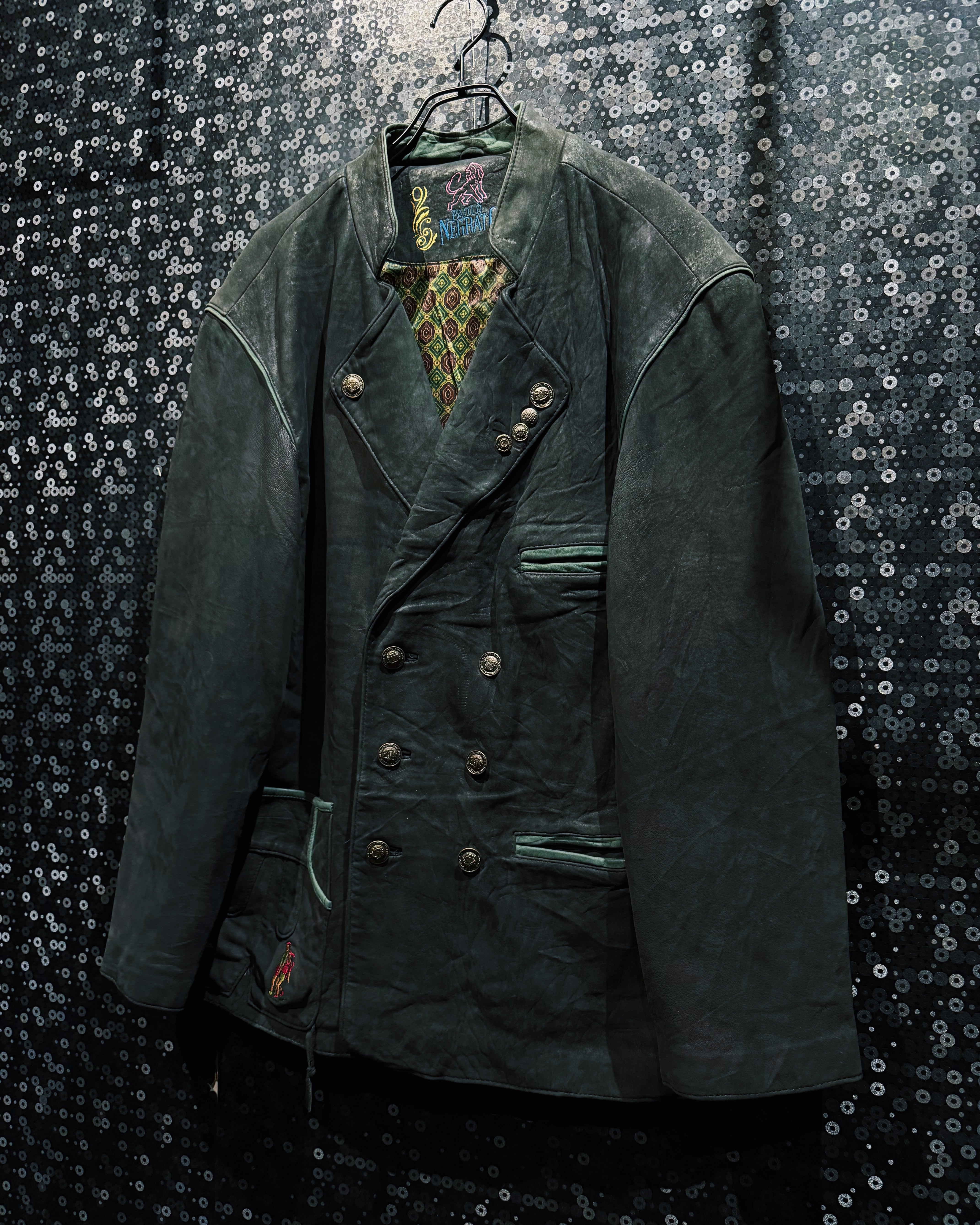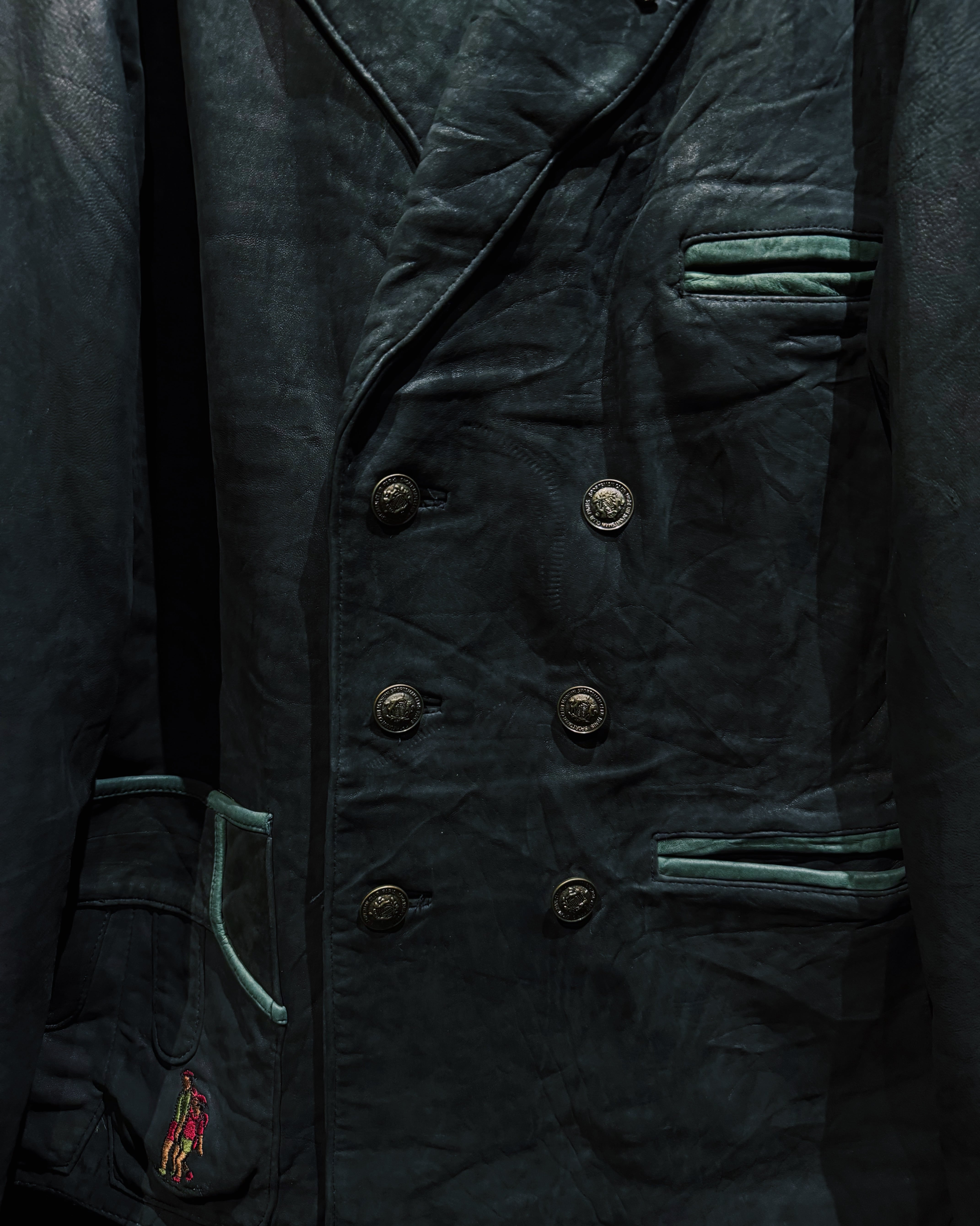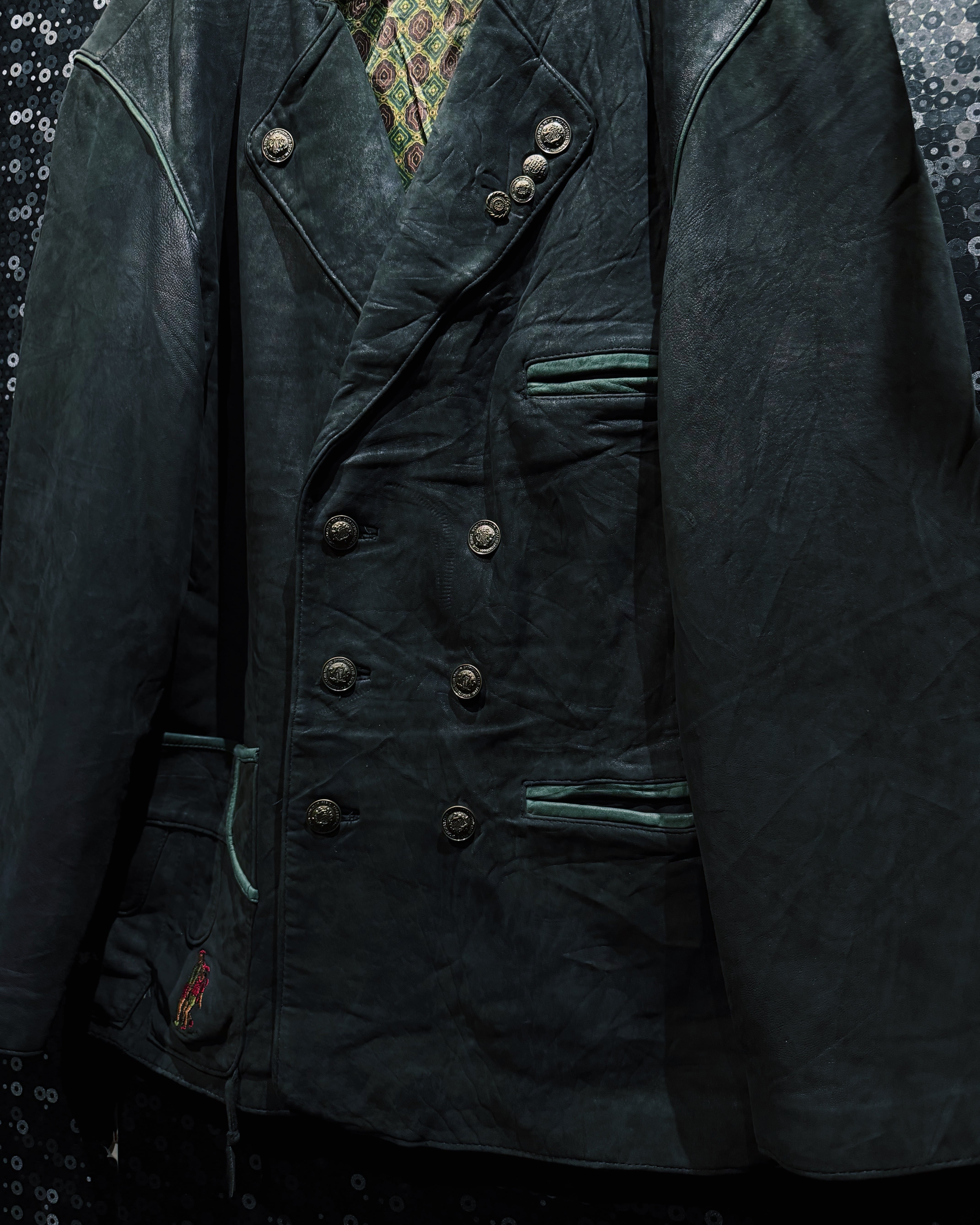 深いグリーンの艶を帯びたレザーを使用し、クラシックなダブルブレスト仕様と重厚なメタルボタンが印象的な一着。