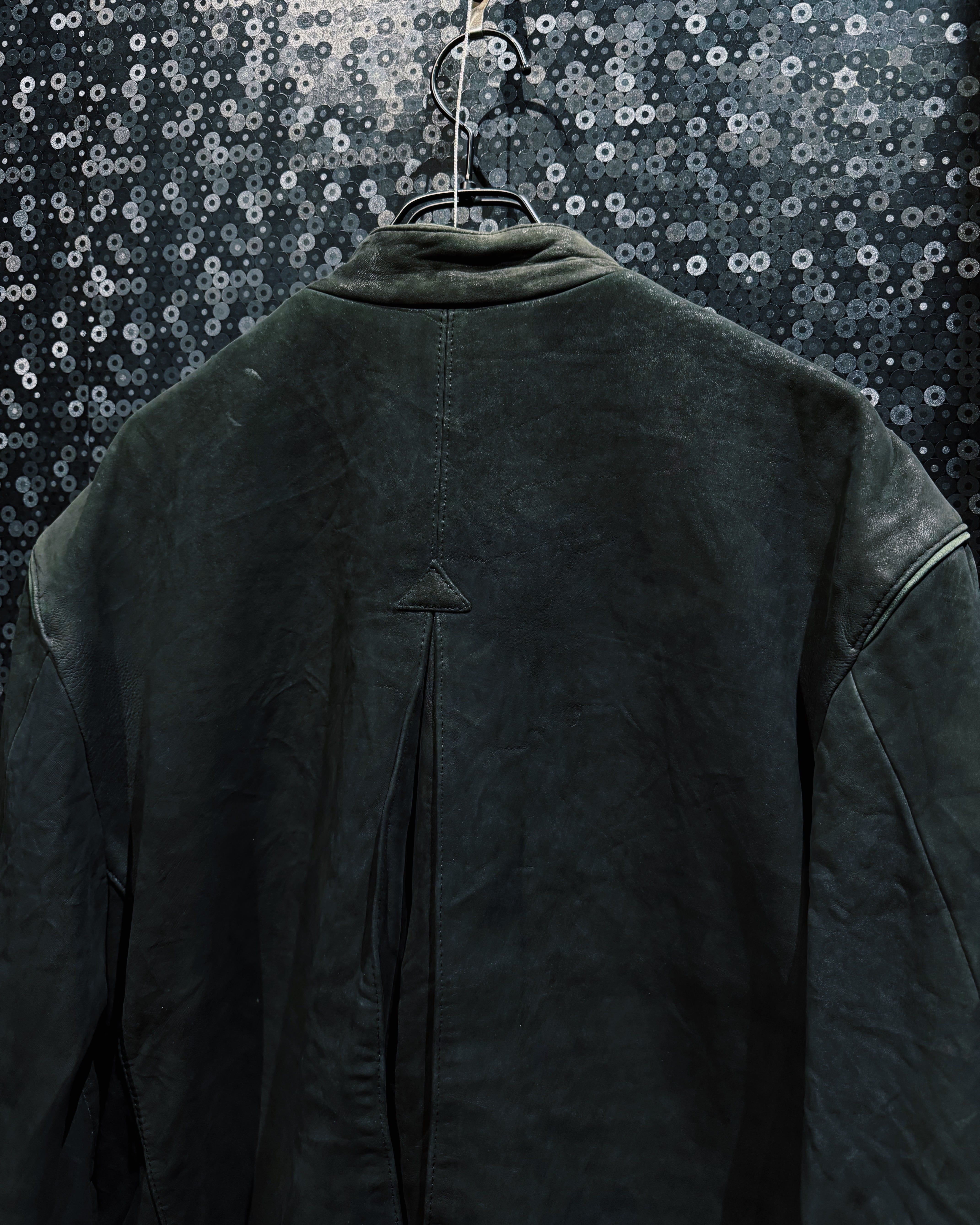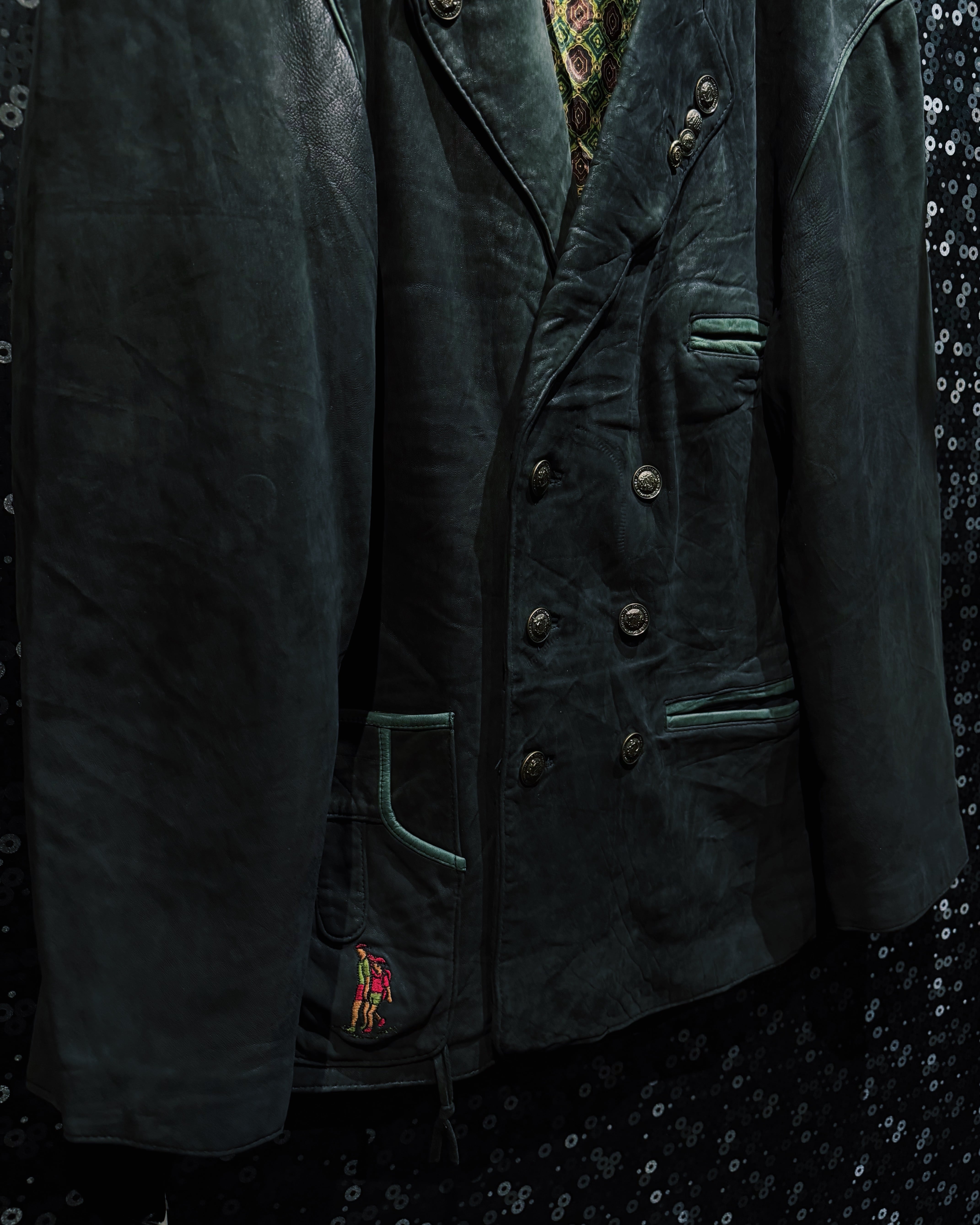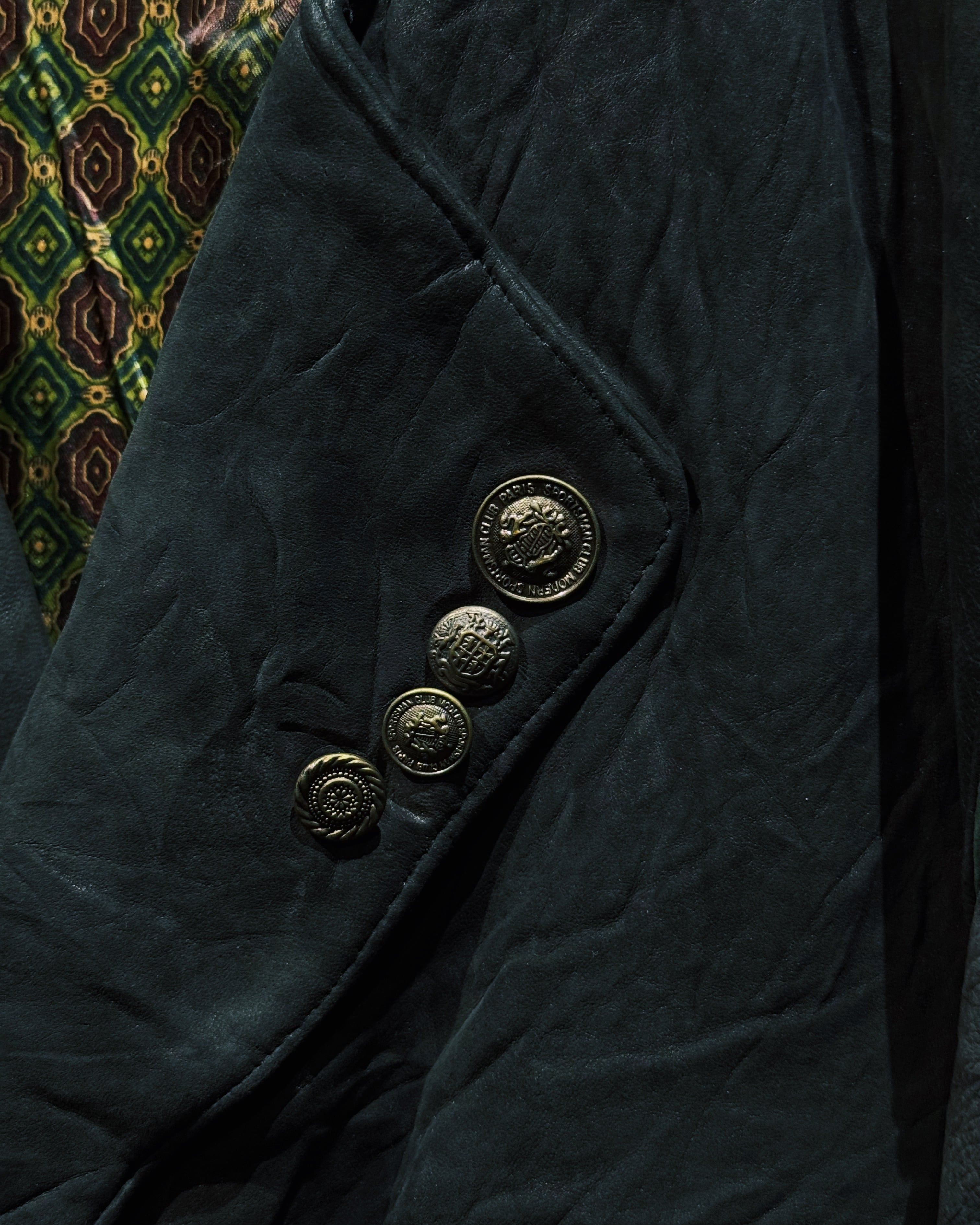 深いグリーンの艶を帯びたレザーを使用し、クラシックなダブルブレスト仕様と重厚なメタルボタンが印象的な一着。