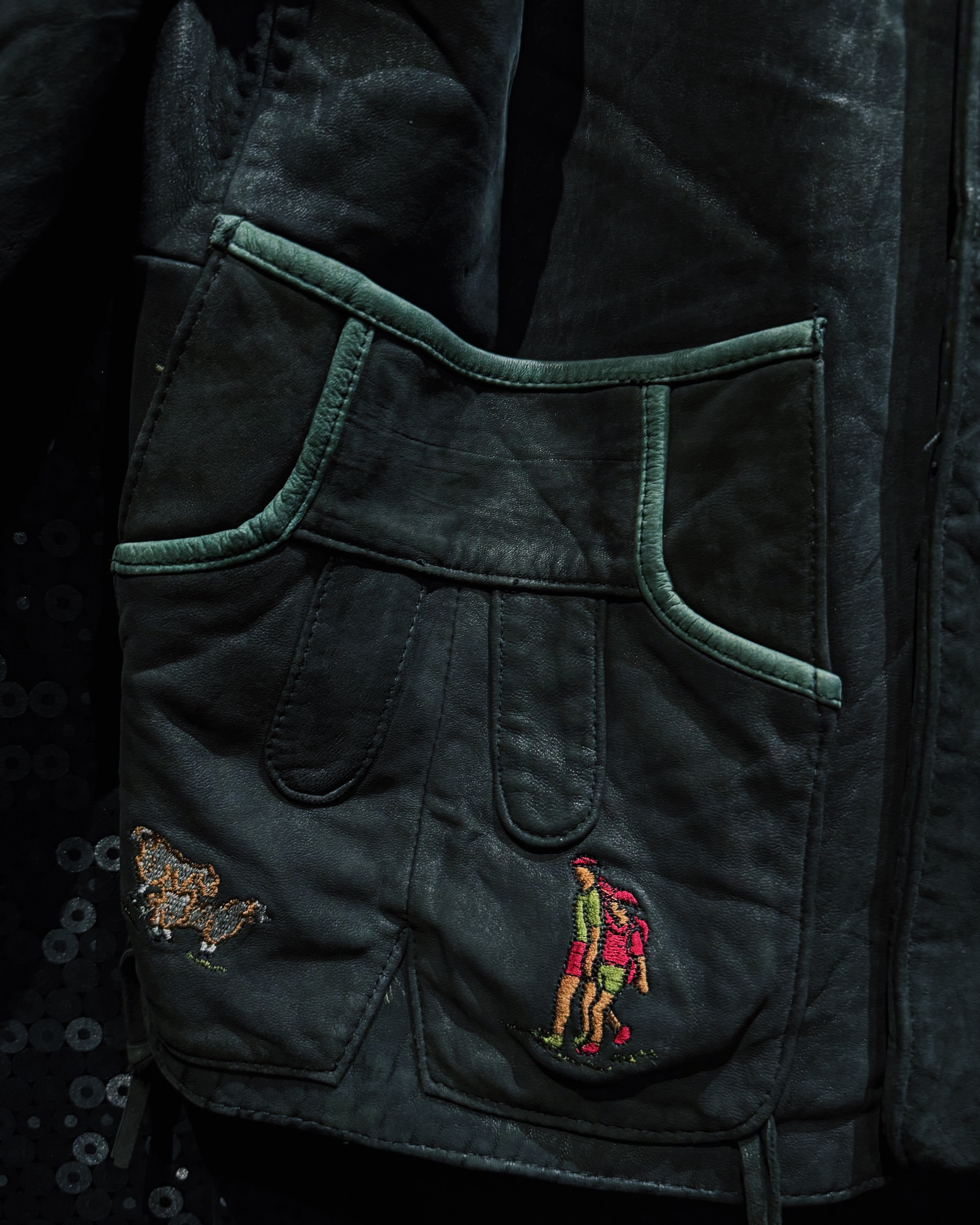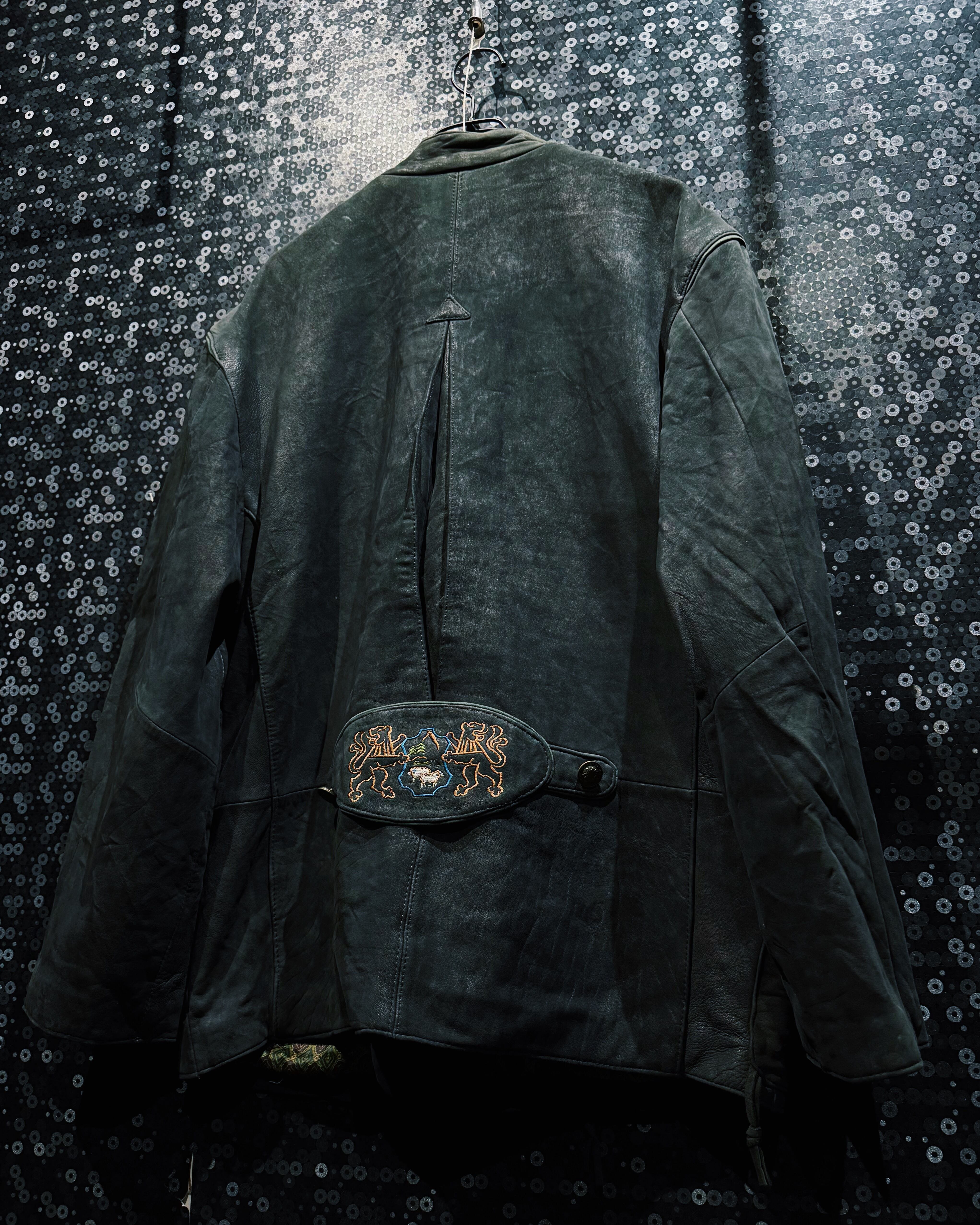 襟裏にはライオンモチーフとブランド刺繍が施され、職人技とデザイン性の高さを物語るディテール。構築的なショルダーラインと程よくルーズな身幅が、90’sヨーロピアンレザーファッションのエッセンスを凝縮。ドレスにもストリートにも落とし込める、唯一無二の存在感を放つアートピース。