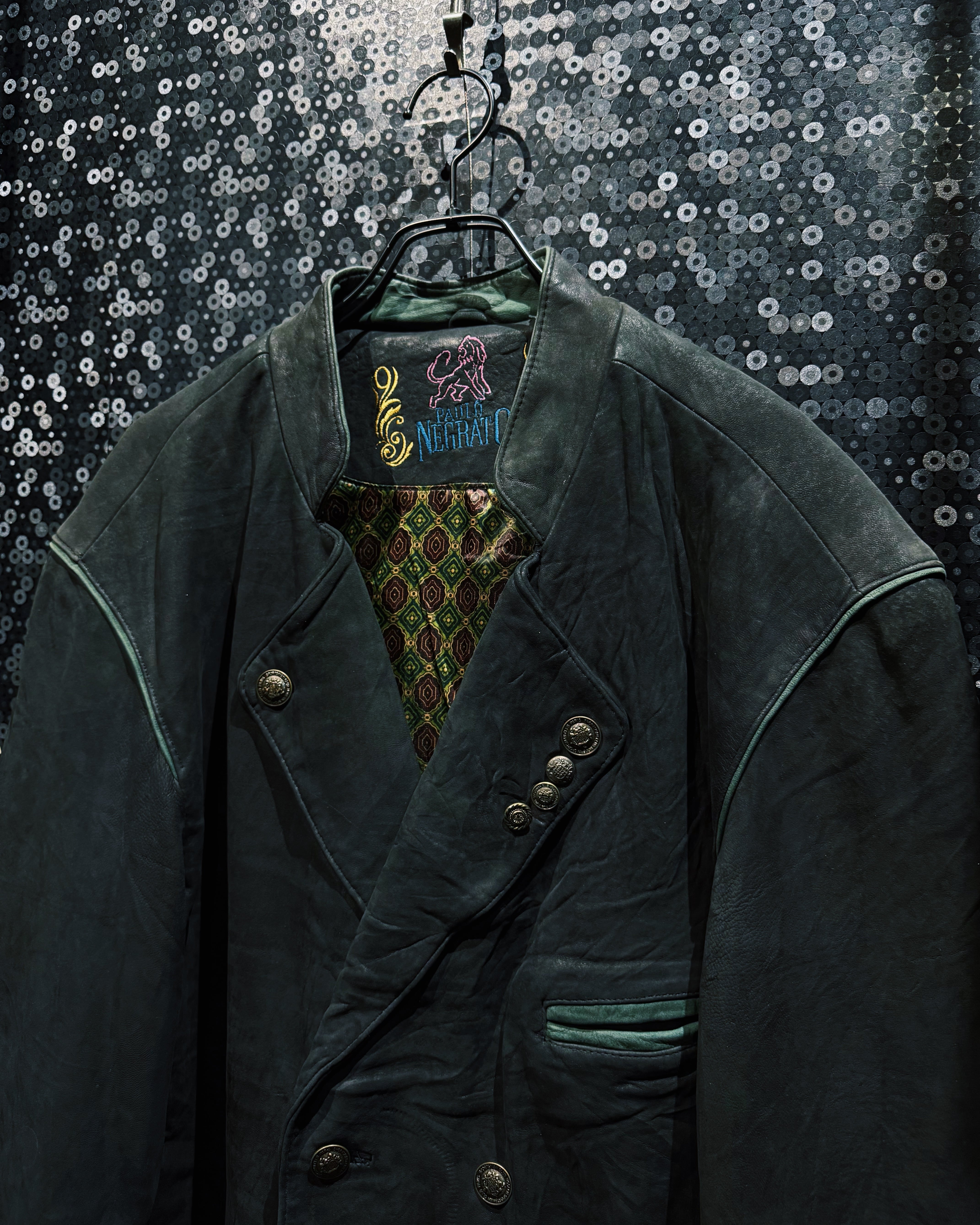 【ÆIEM】"Paulo Negrato"Vintage Double-Breasted Leather Jacket – Deep Green × Patterned Lining