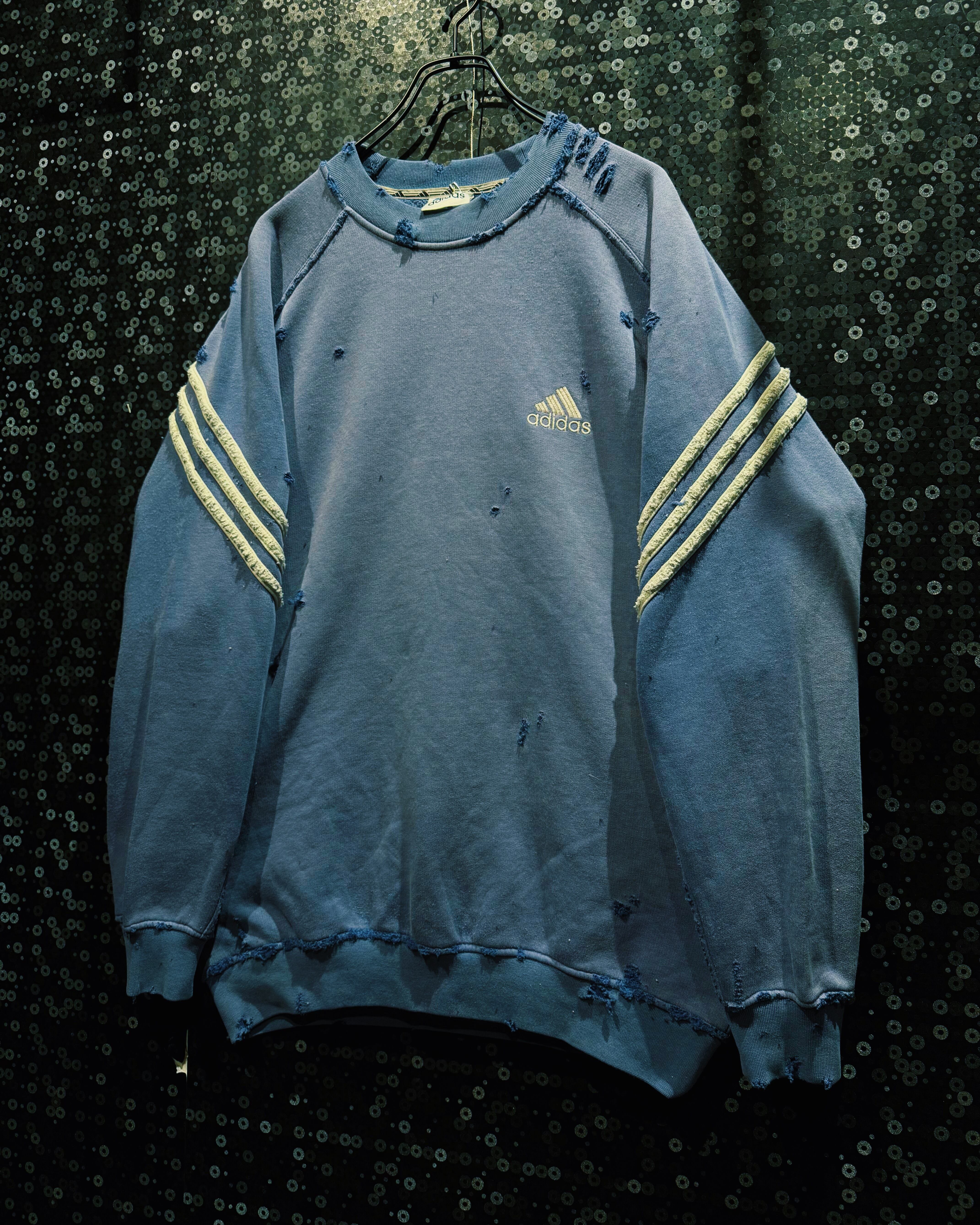 ゆるめのラグランシルエットとヴィンテージライクな素材感で、単体でも主役を張れるリメイクプロダクト。唯一無二のフェードカラーと手作業の荒々しい質感が光る、世界に一枚だけのアディダス。