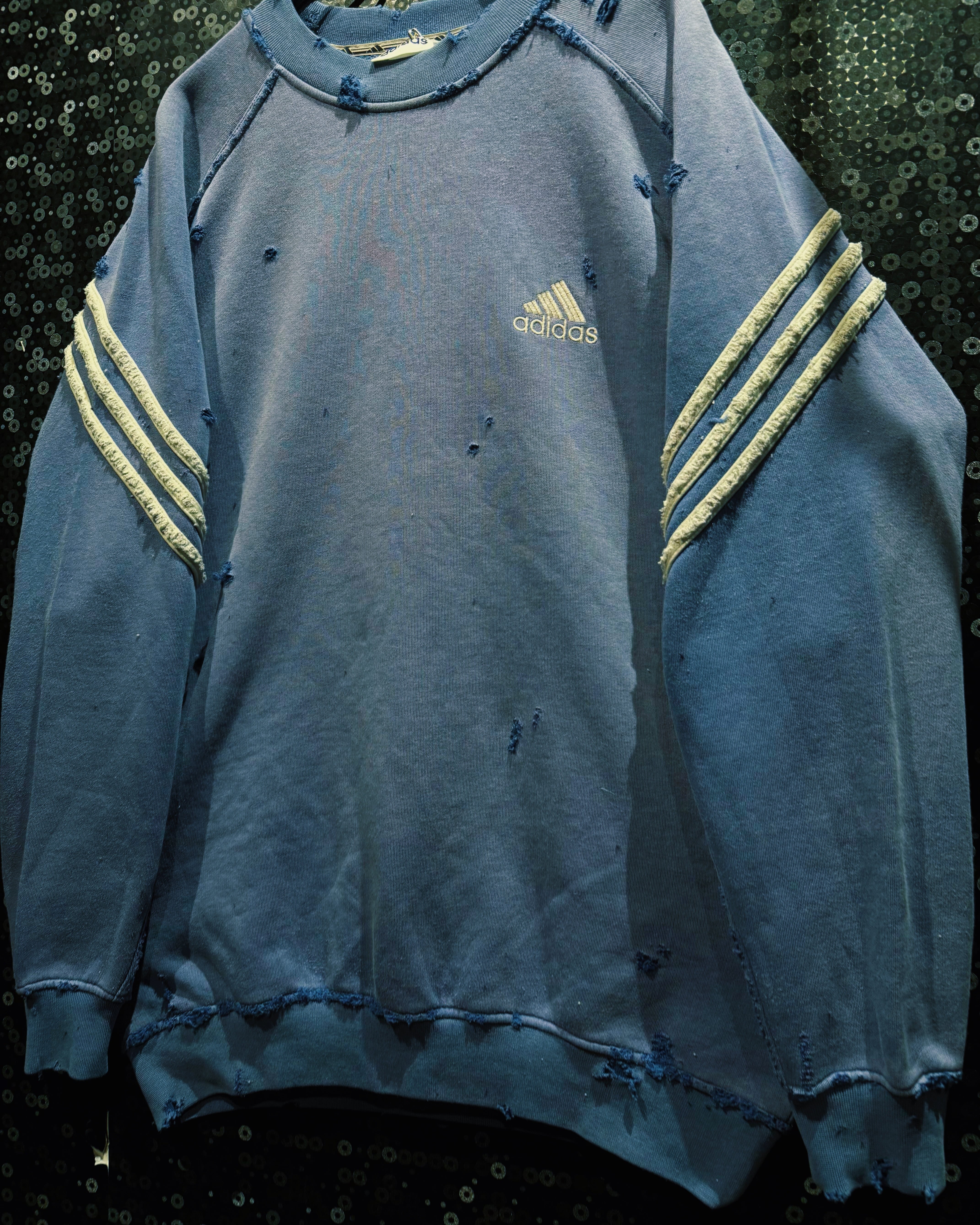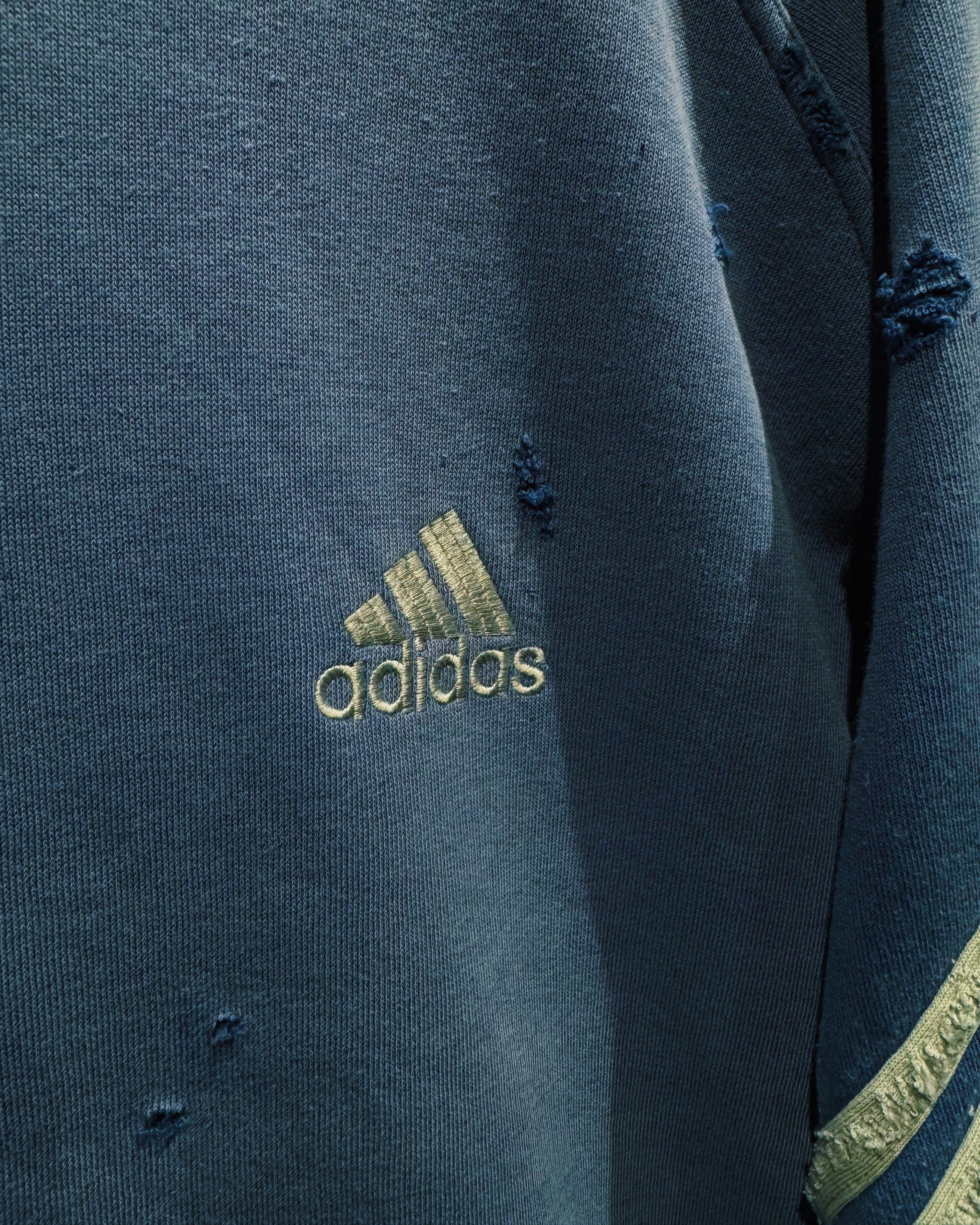 AEIEMが再構築を施した“original boro remake”シリーズのadidasスウェット。爽やかなフェードブルーのボディに、アイボリーの3ストライプが映えるパフォーマンスロゴ仕様。