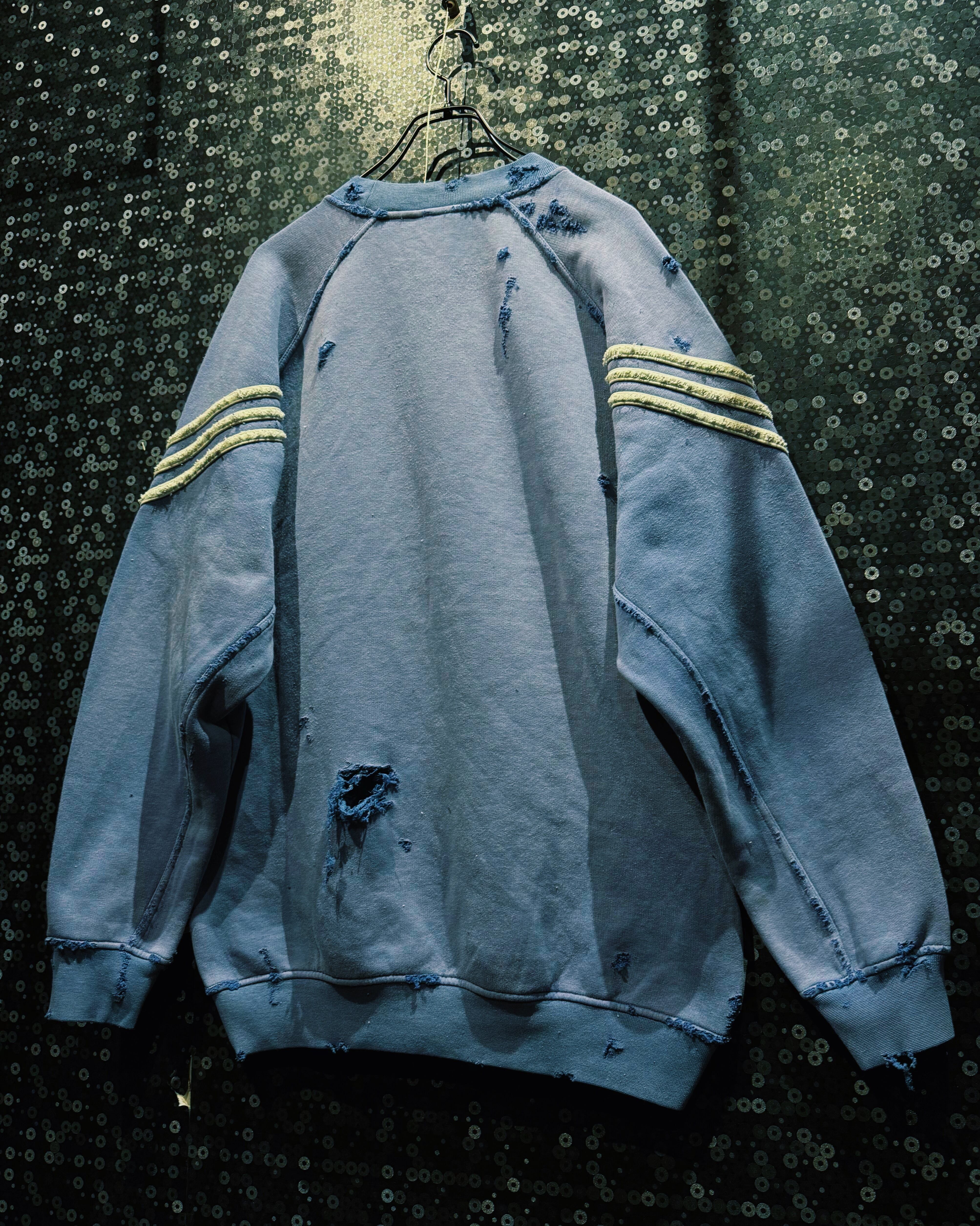 袖から背面にかけての大胆なフェードとパッチワーク的ダメージが一点物らしい存在感を放ち、ストリートとアートを融合させたAEIEMらしい解釈のスウェット。