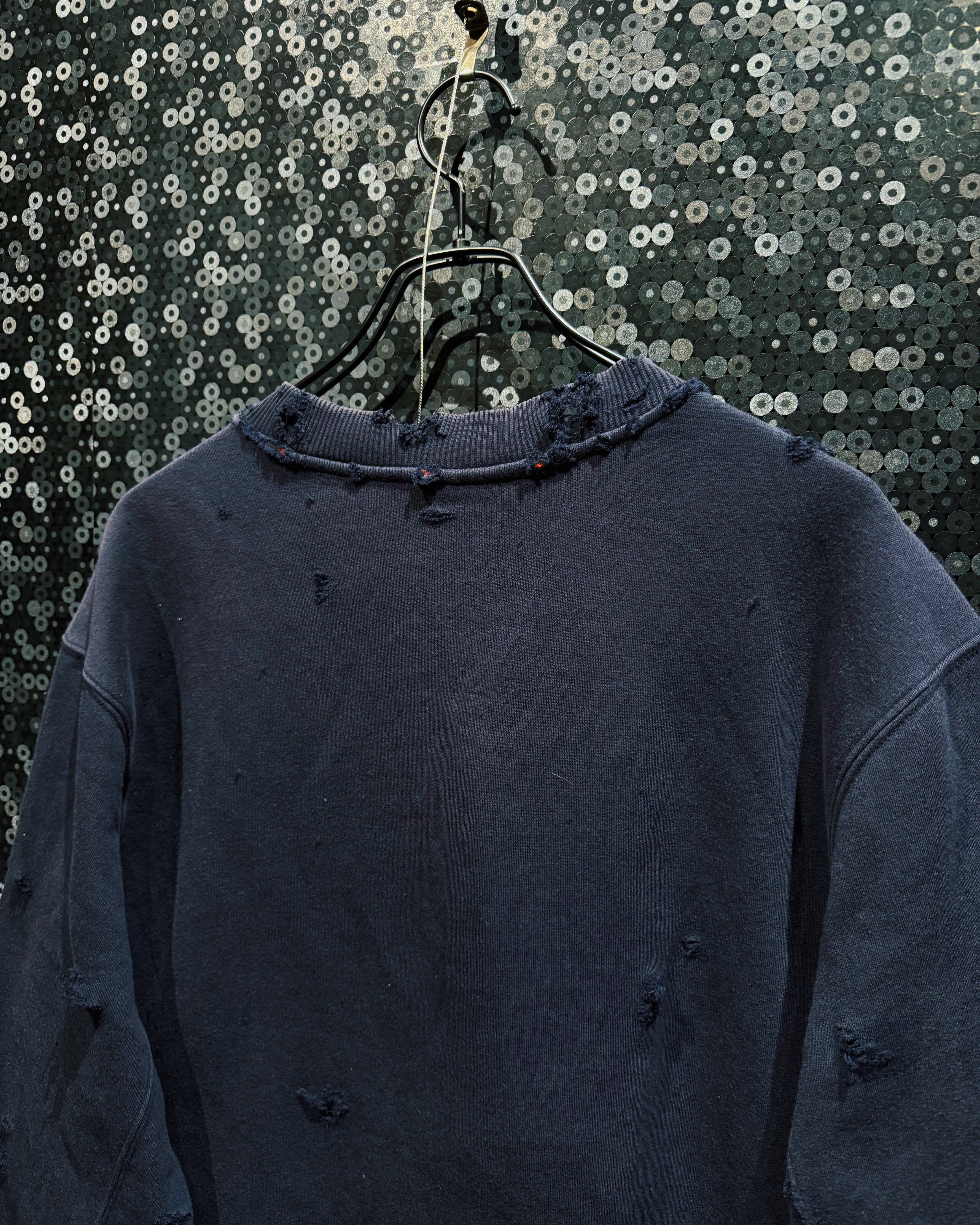 襟元や袖、ボディ全体に大胆なダメージを施し、退廃的なムードとリアルヴィンテージの空気感を共存させた一枚。首周りのオレンジのパイピングが差し色となり、スポーティな印象の中にAEIEMらしいアートリメイクの個性が際立つ仕上がり。