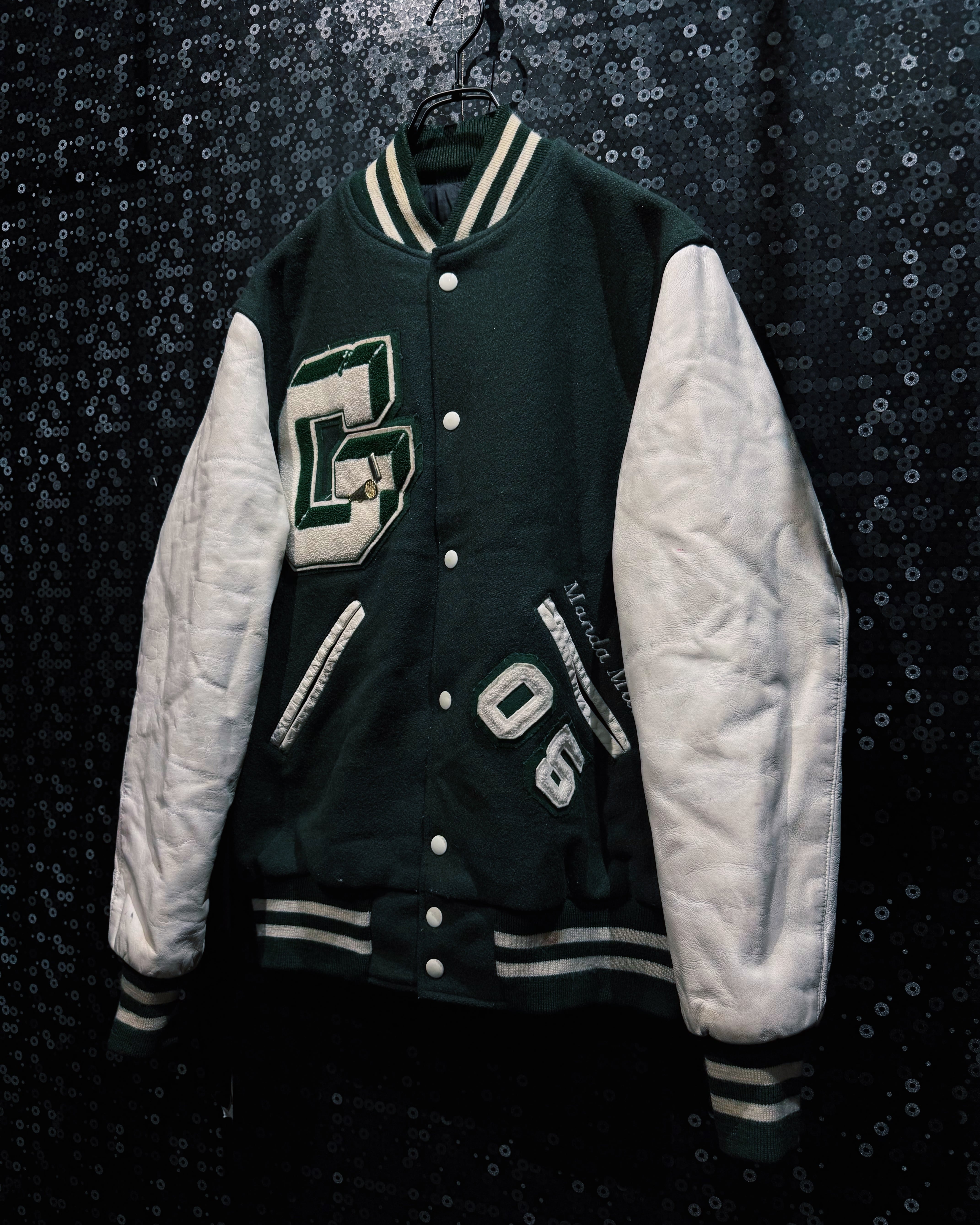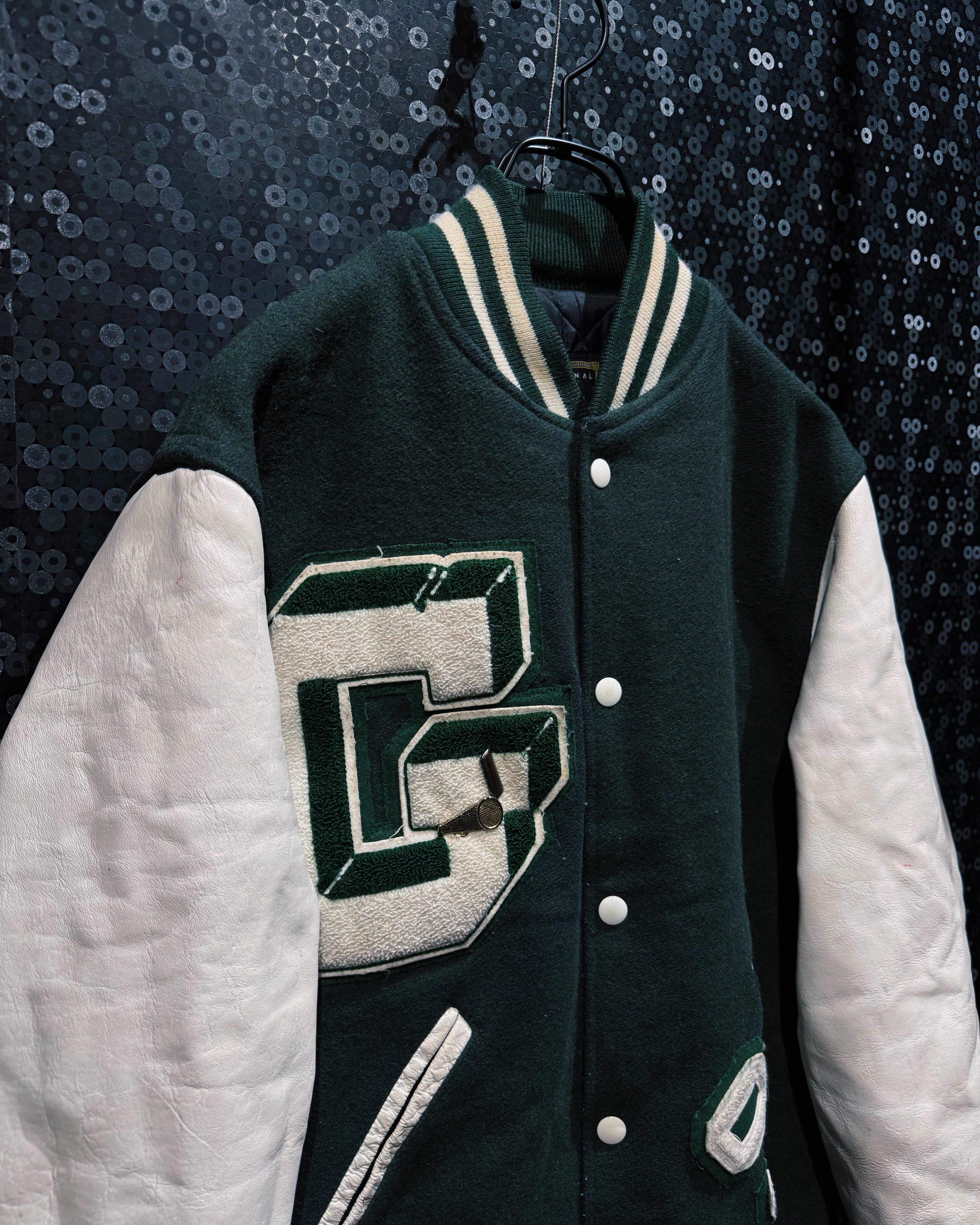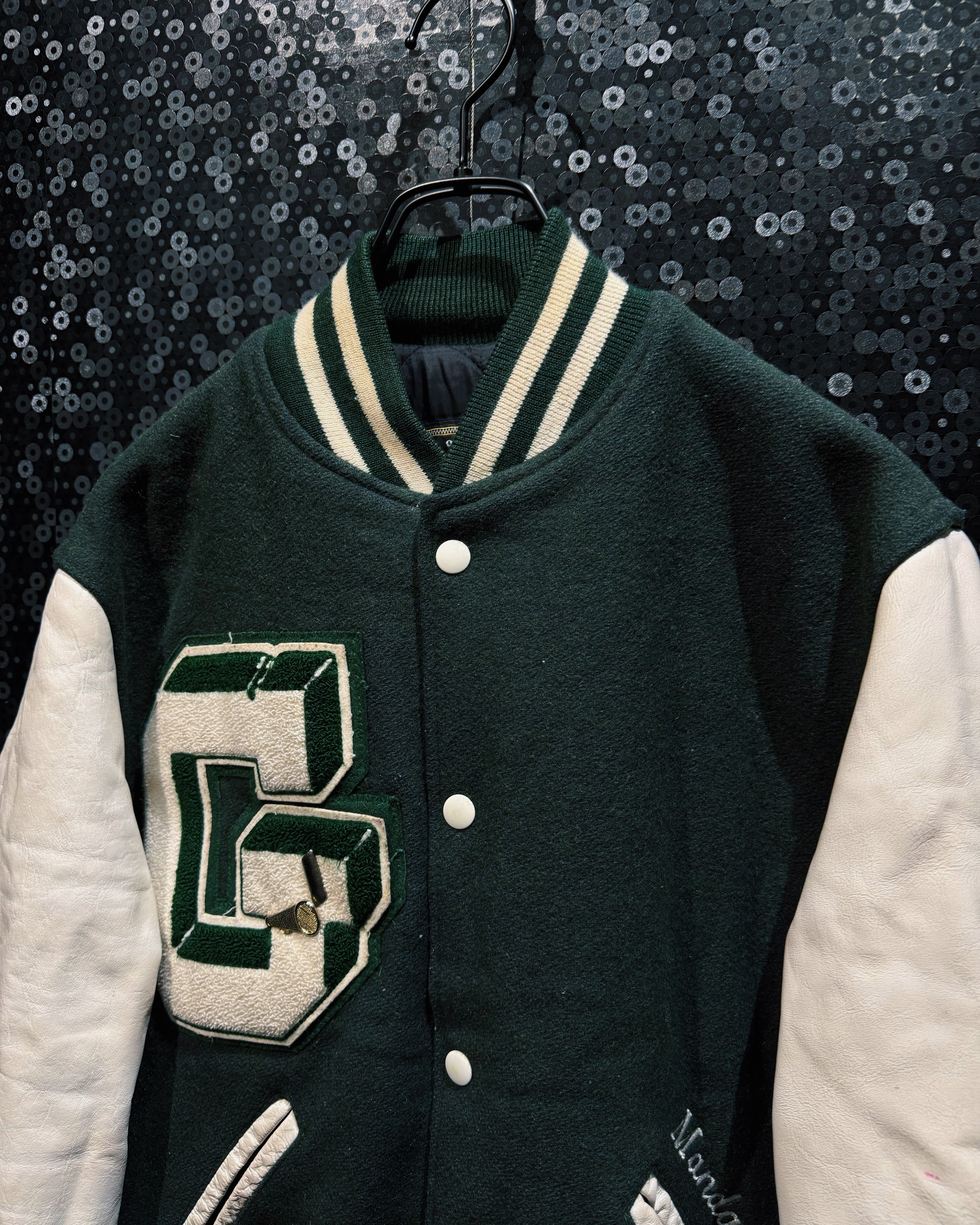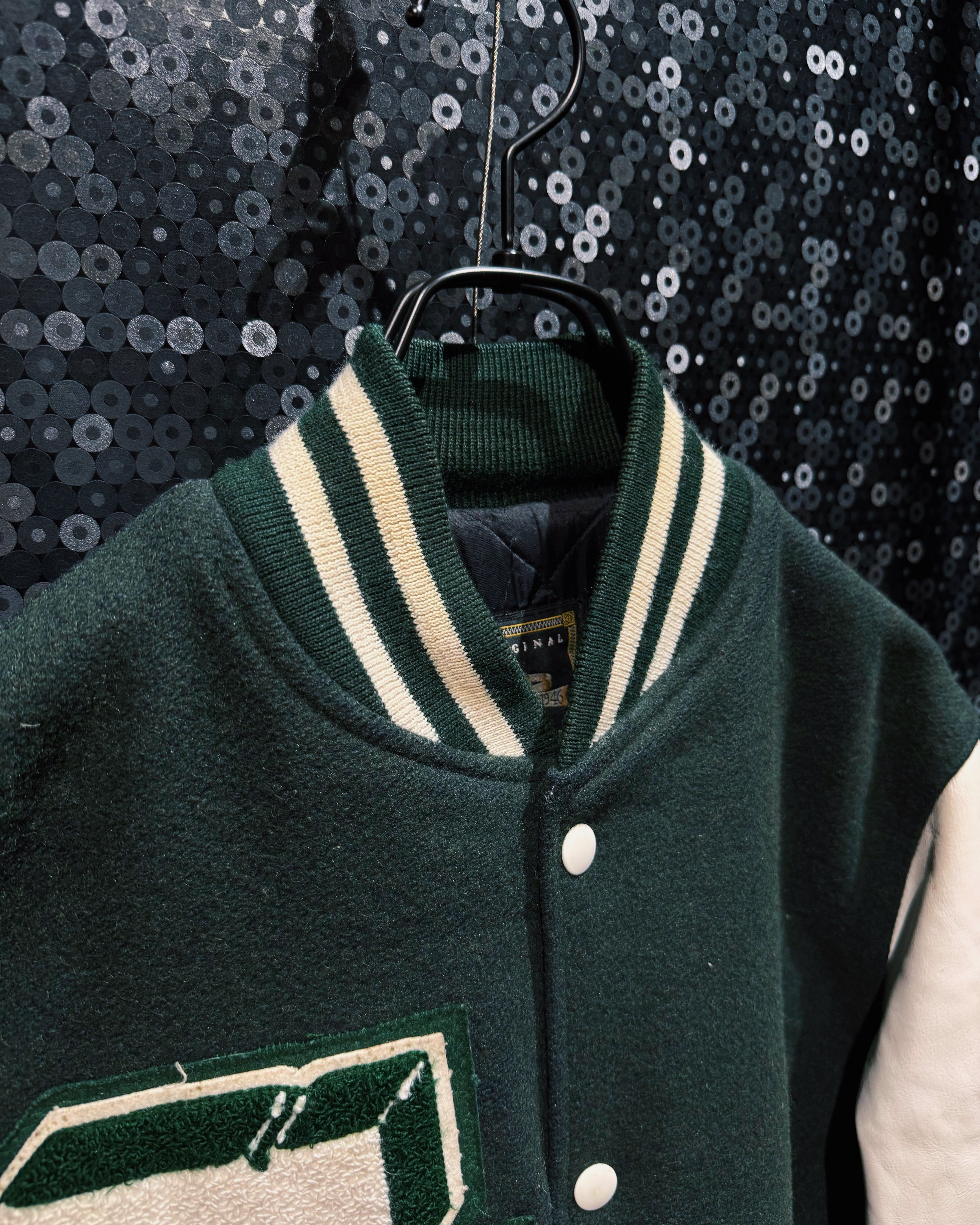 鮮やかなグリーンカラーにホワイトカラーのレザーの切り替えのデザインはスタジャンの中でも高級と言わんばかりのラグジュアリーなデザイン。モッチモチのホワイトレザーは美しく綺麗な色味ですね。