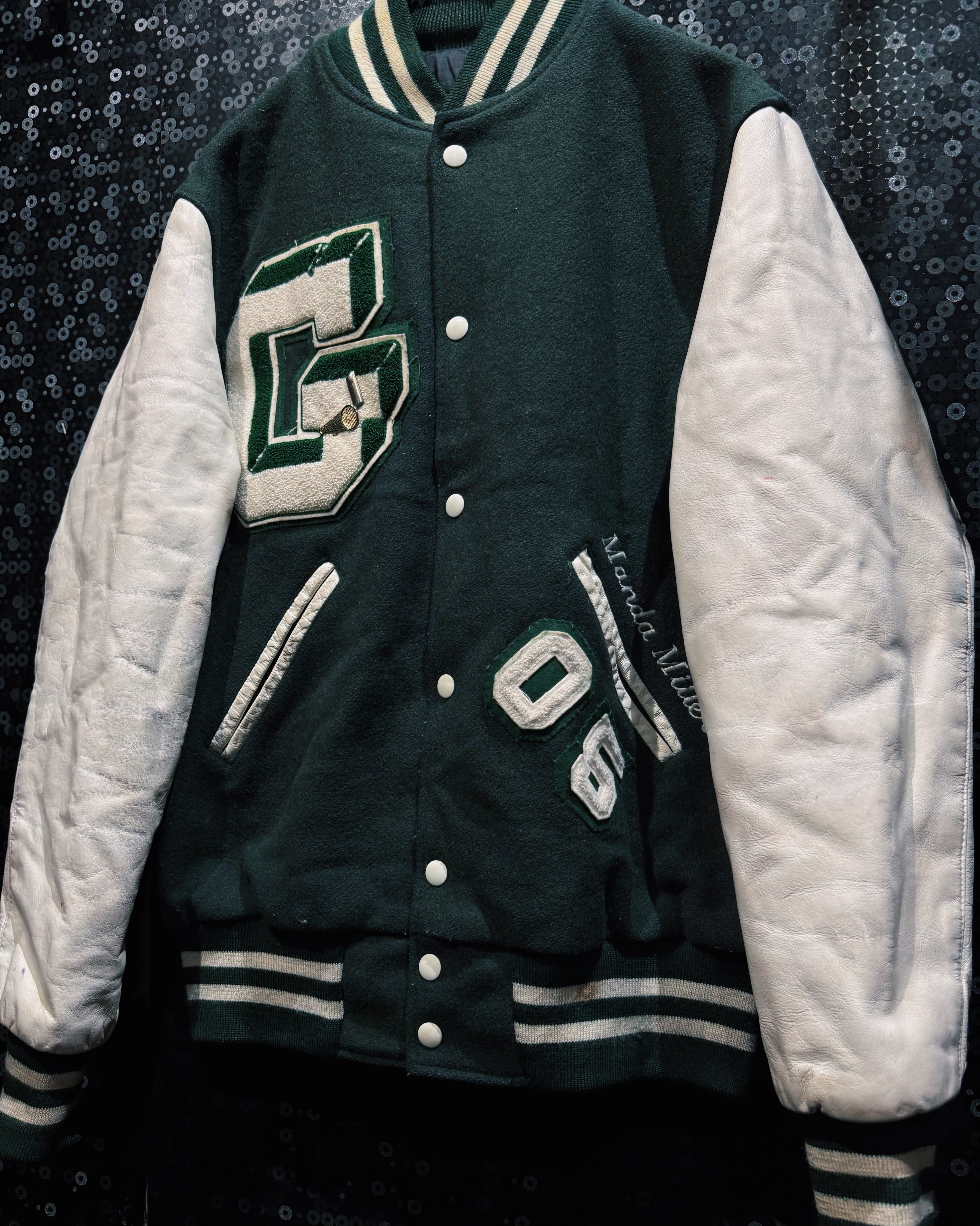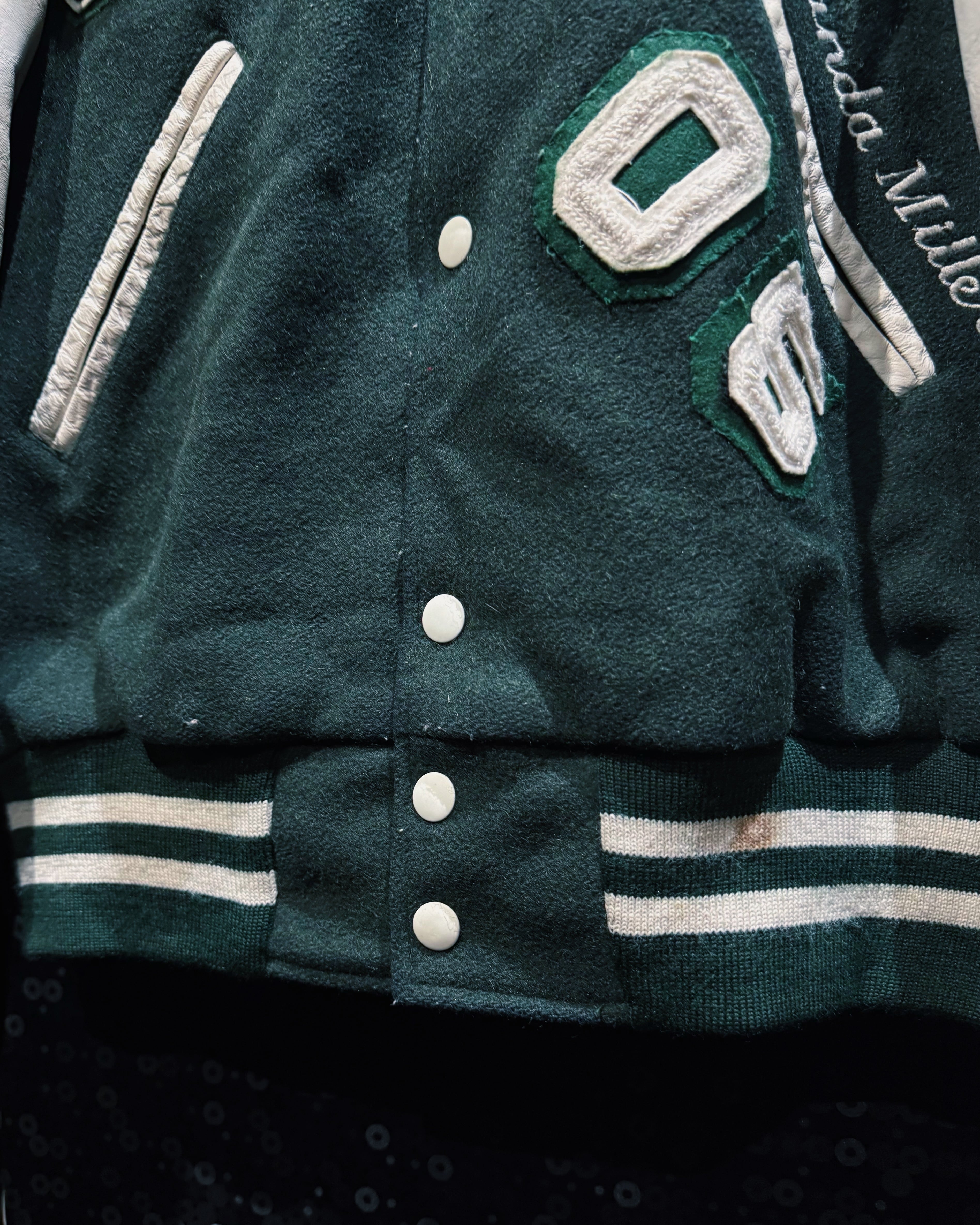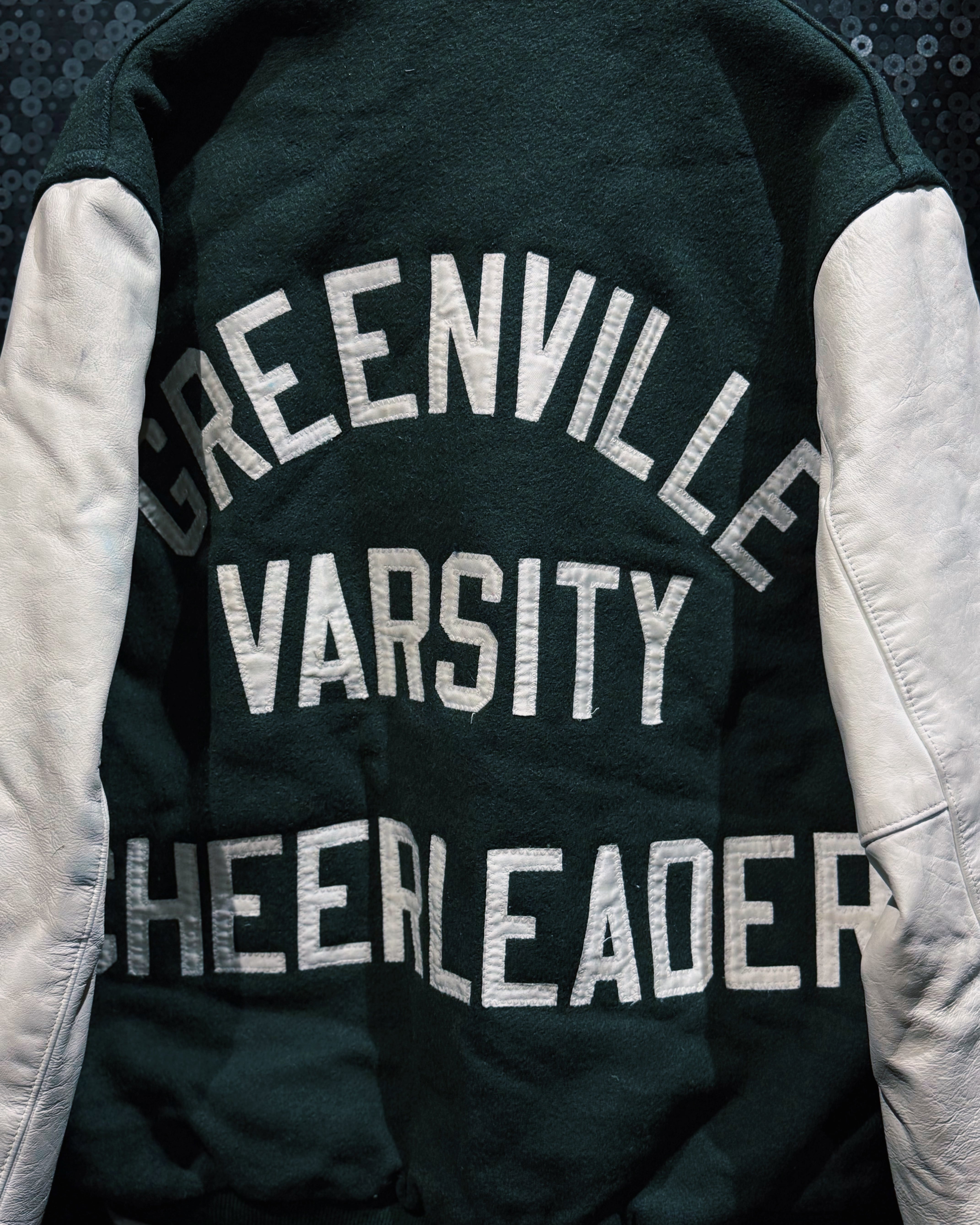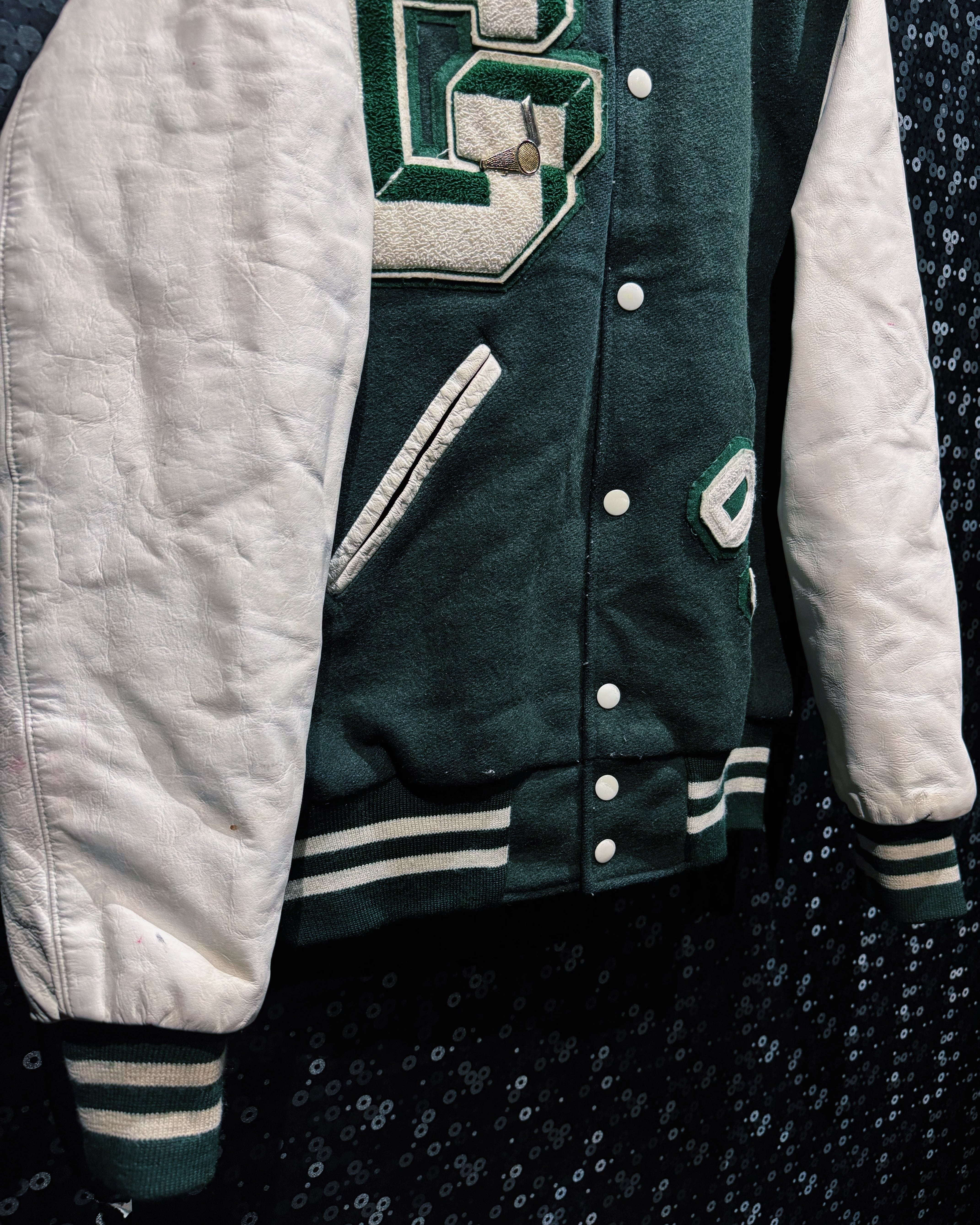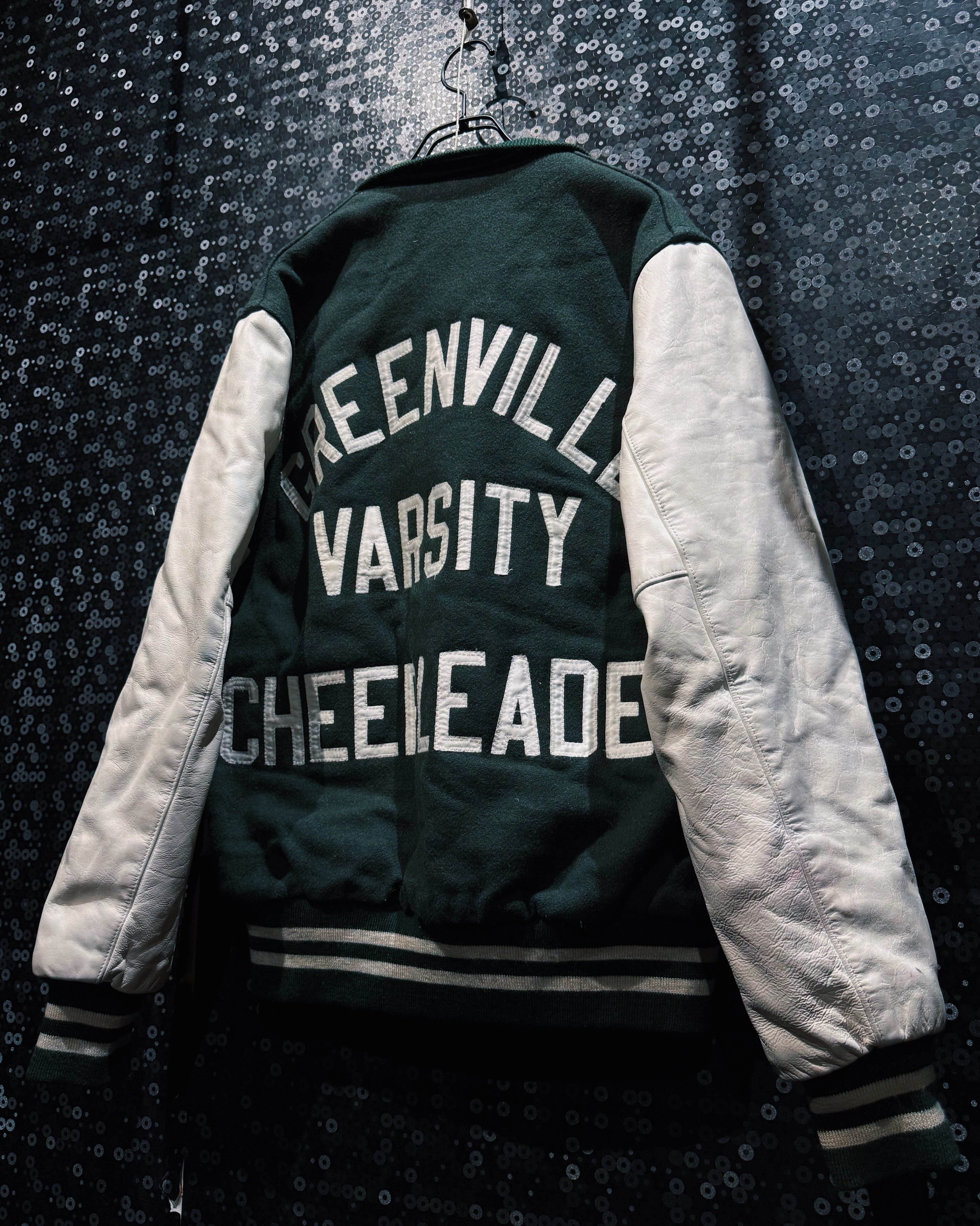 鮮やかなグリーンカラーにホワイトカラーのレザーの切り替えのデザインはスタジャンの中でも高級と言わんばかりのラグジュアリーなデザイン。モッチモチのホワイトレザーは美しく綺麗な色味ですね。