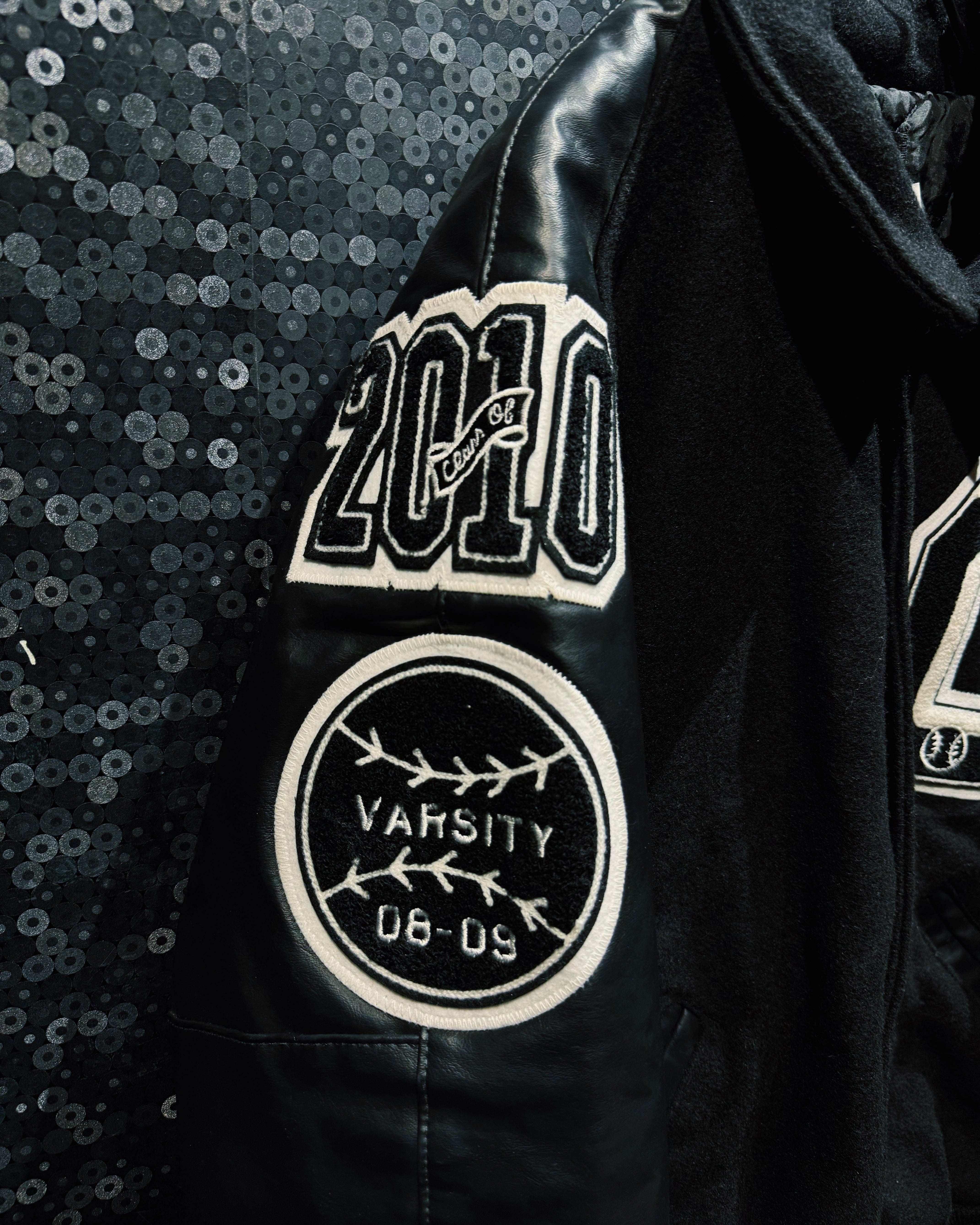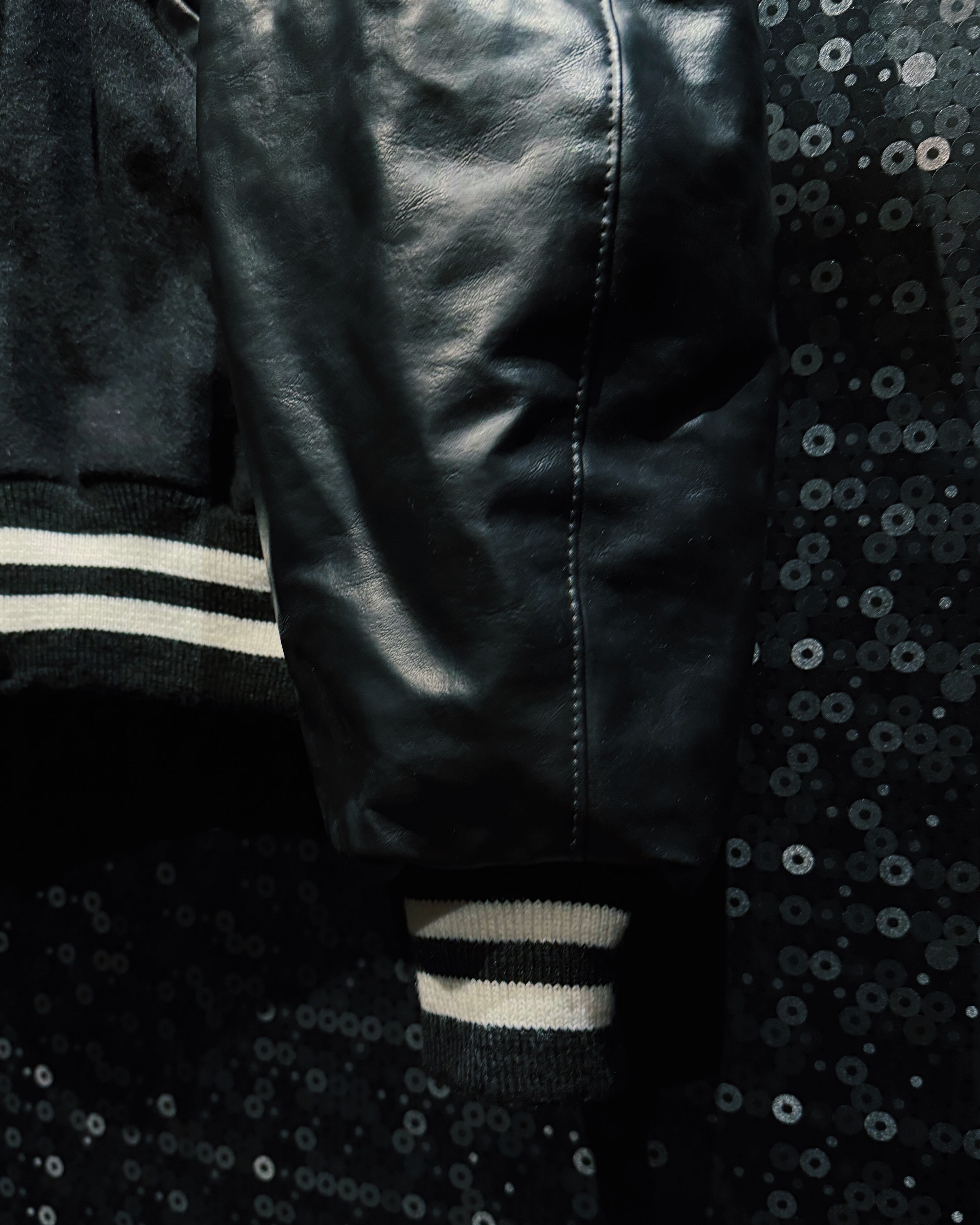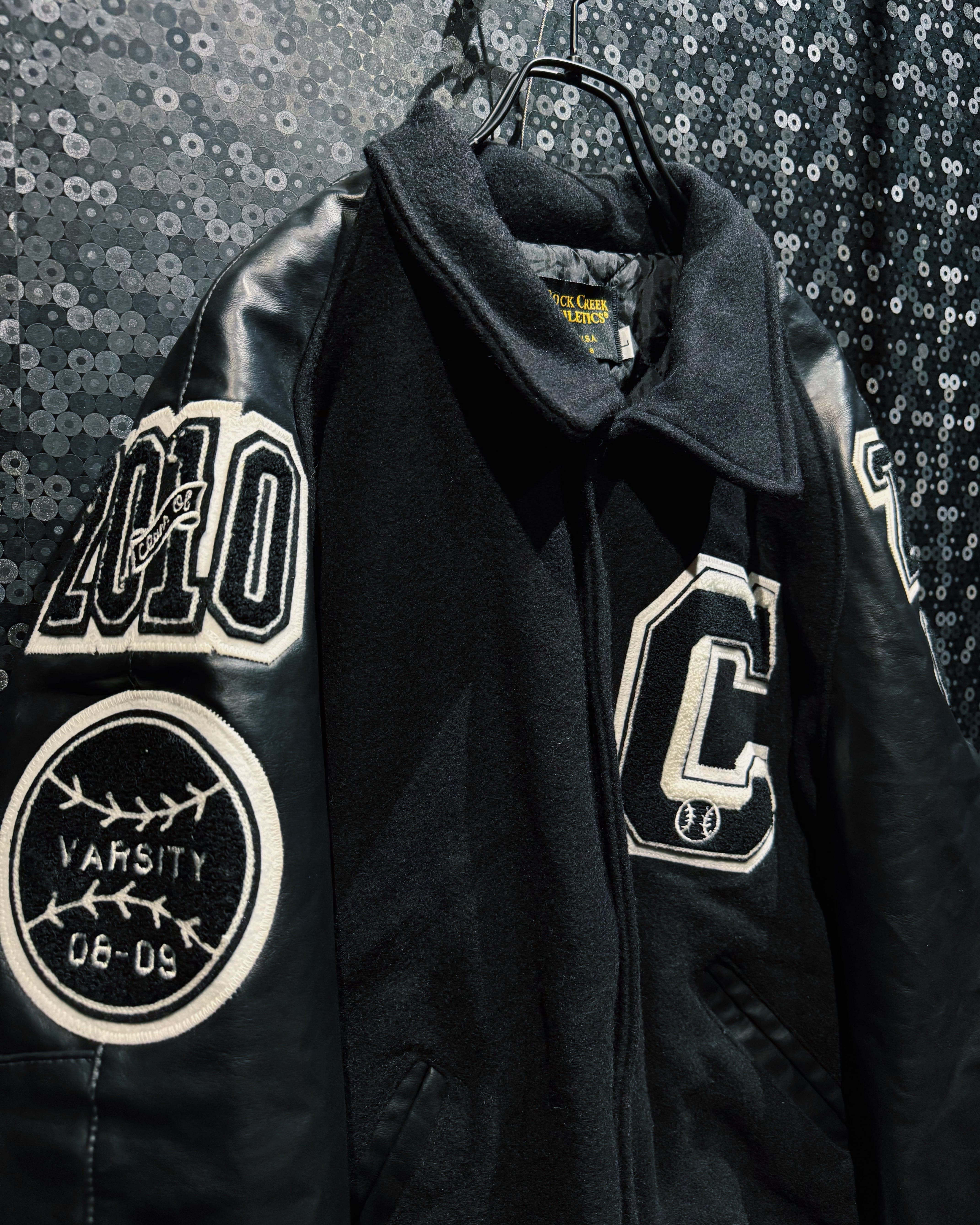 ロックな印象のブラックカラーウールにブラックカラーのレザーの切り替えのデザインはスタジャンの中でも定番なデザイン。モッチモチのレザーアームは美しく綺麗な色味ですね。