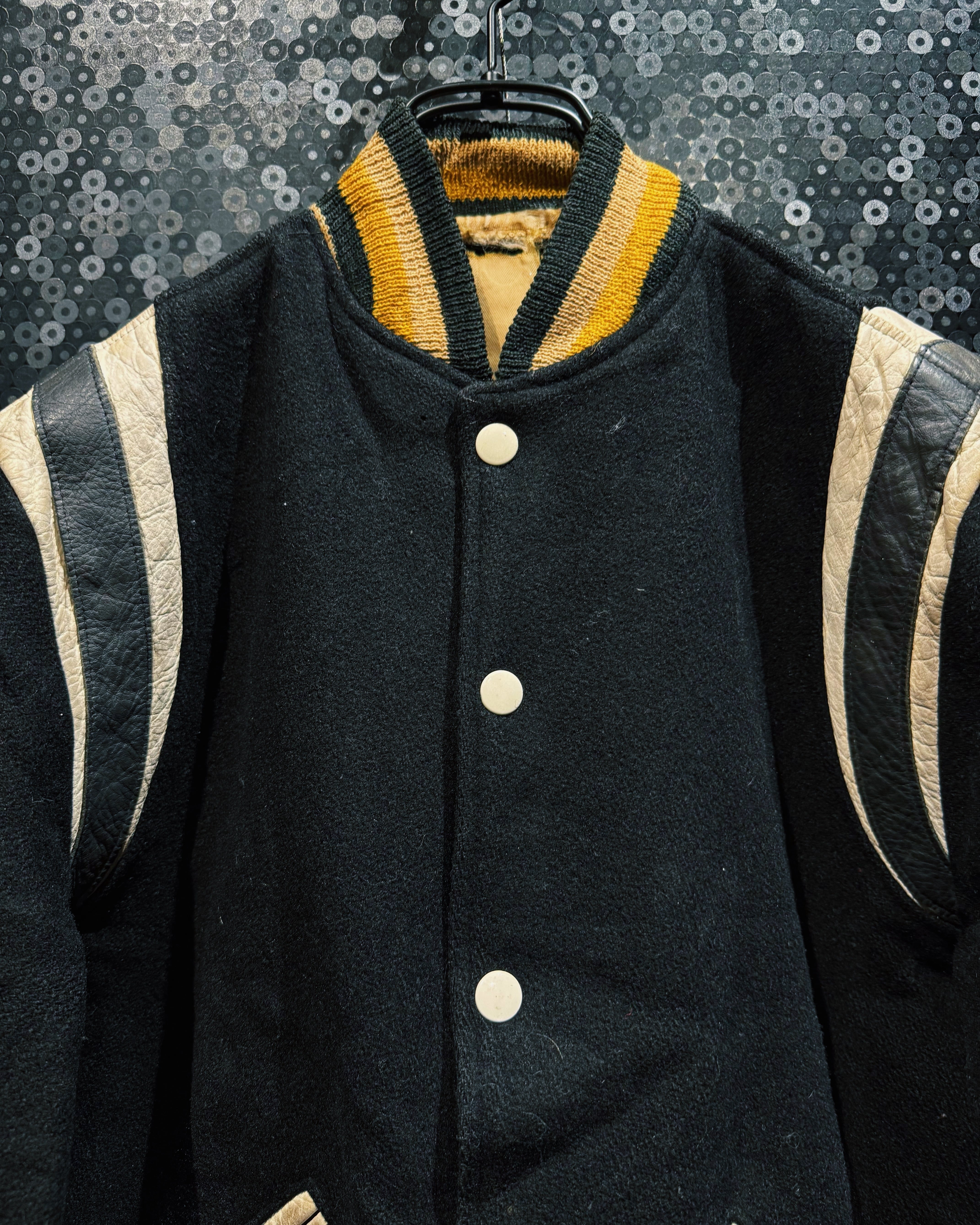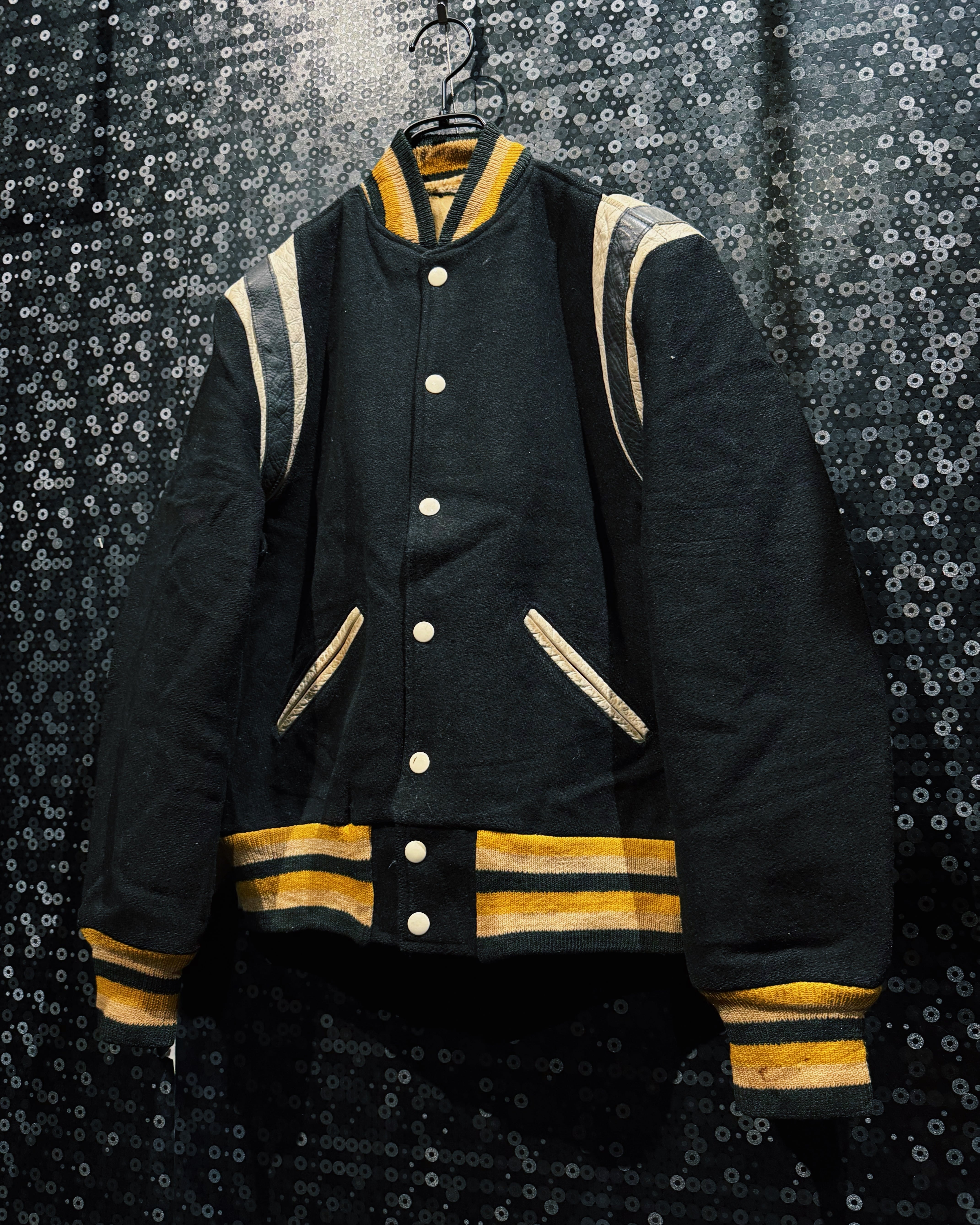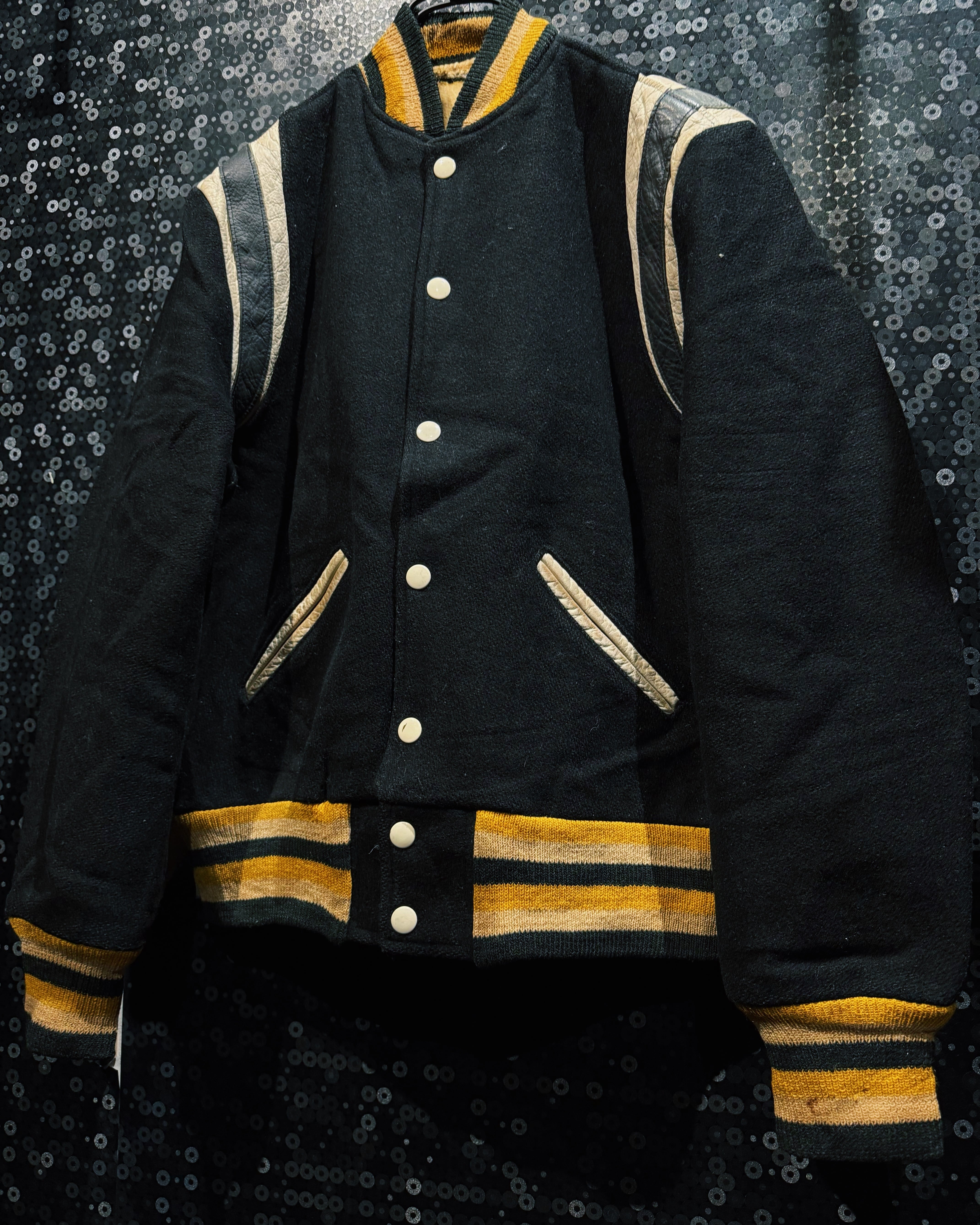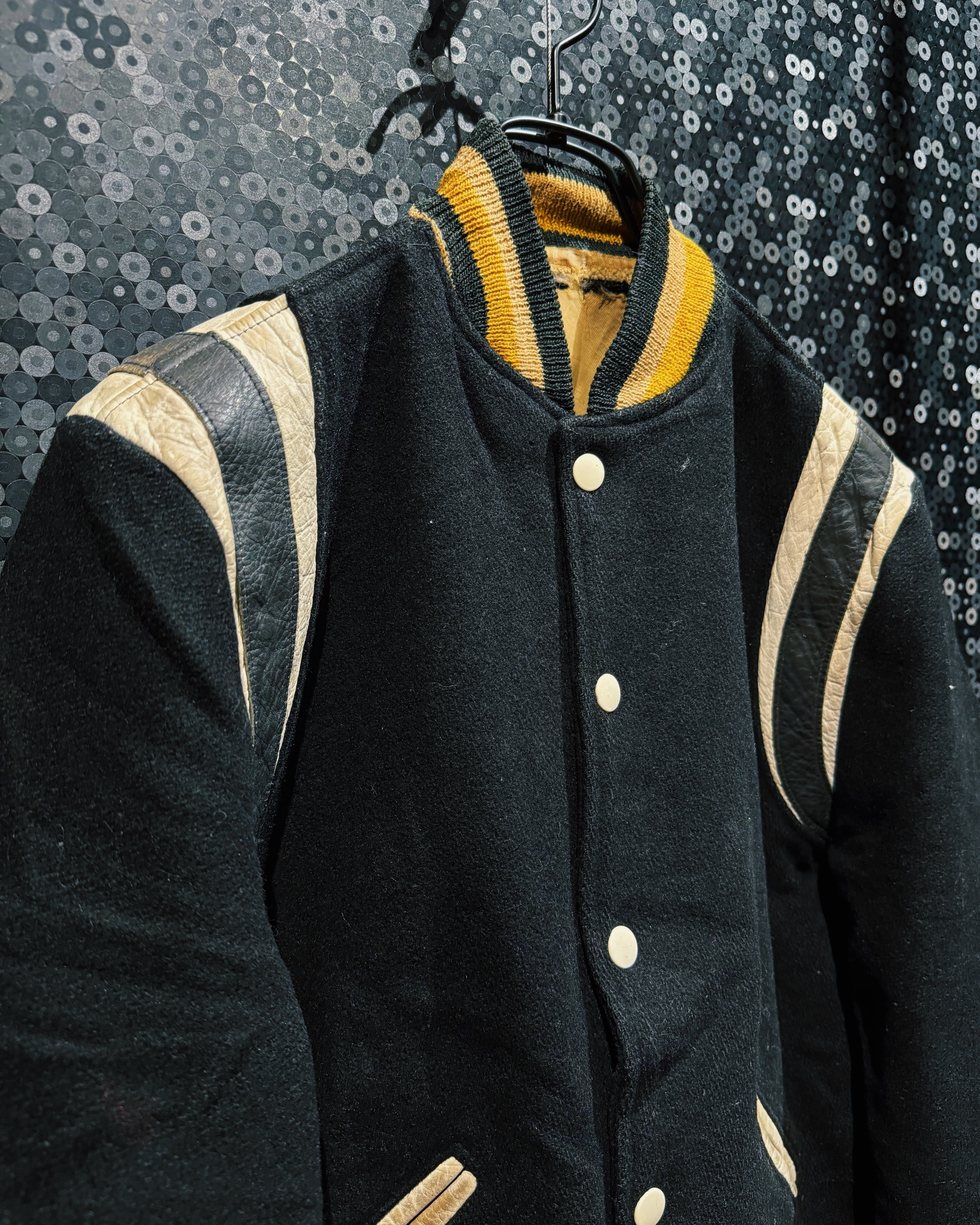 ブラックボディにマスタードイエローのリブラインが映える、クラシックなヴィンテージバーシティジャケット。