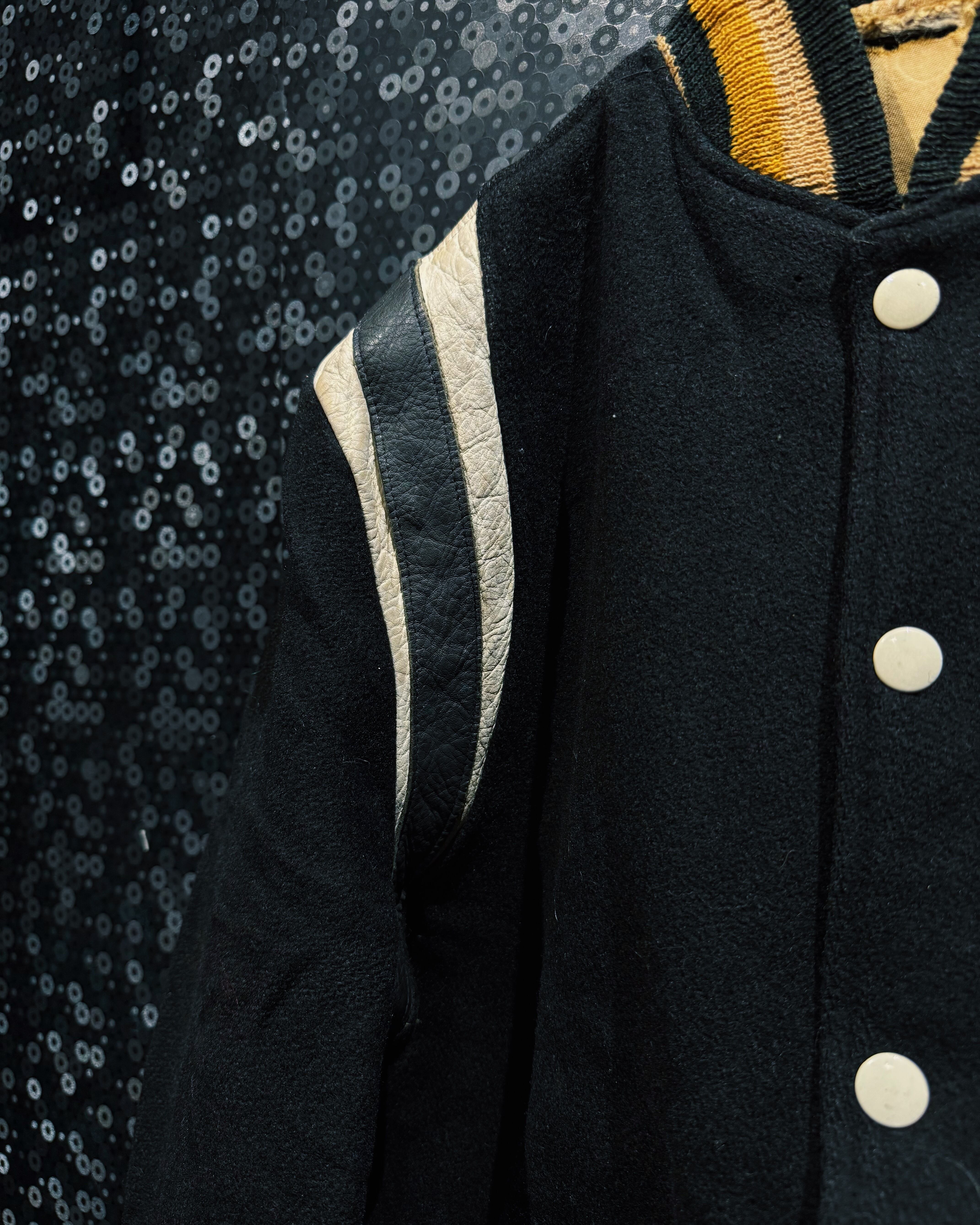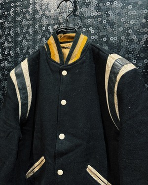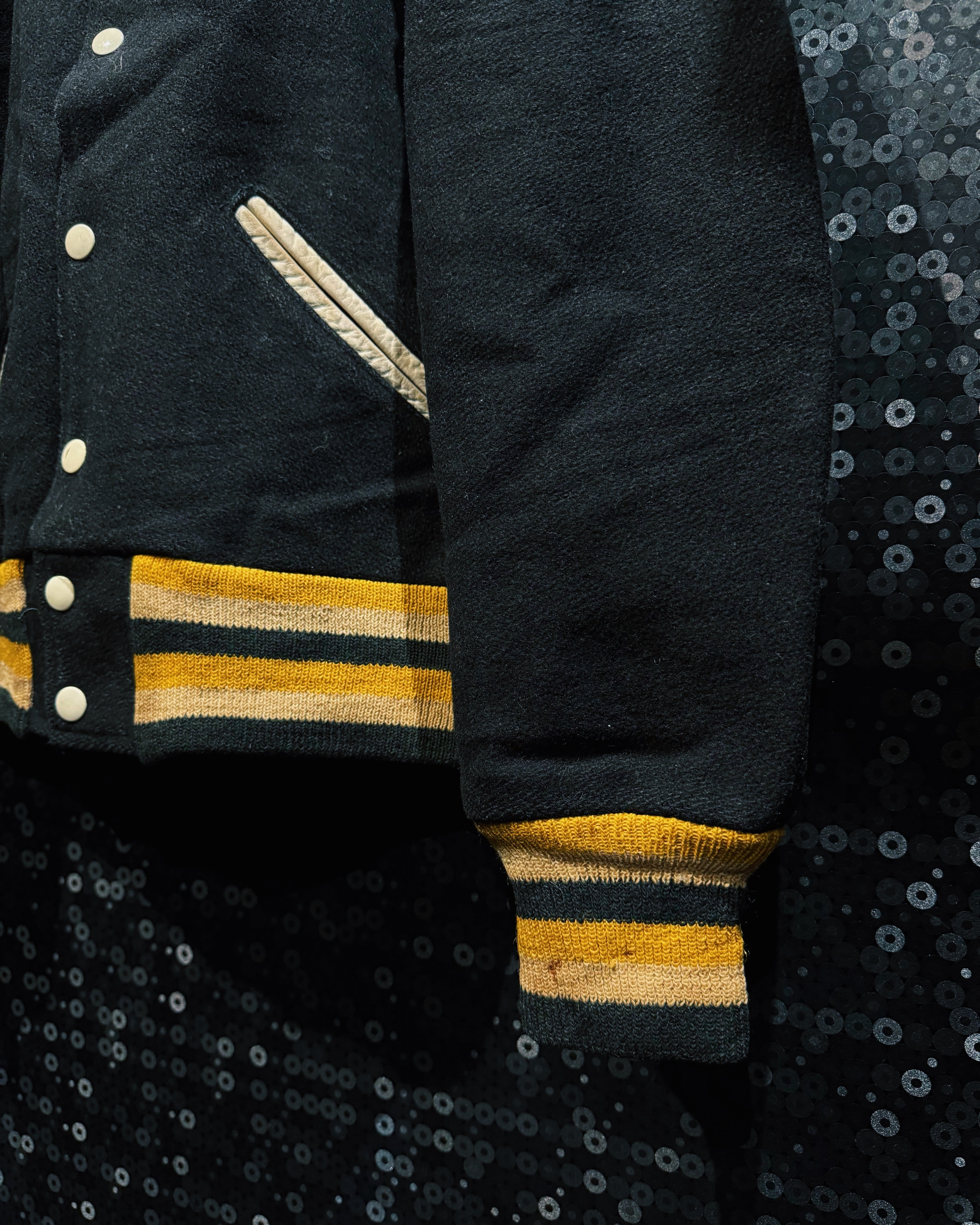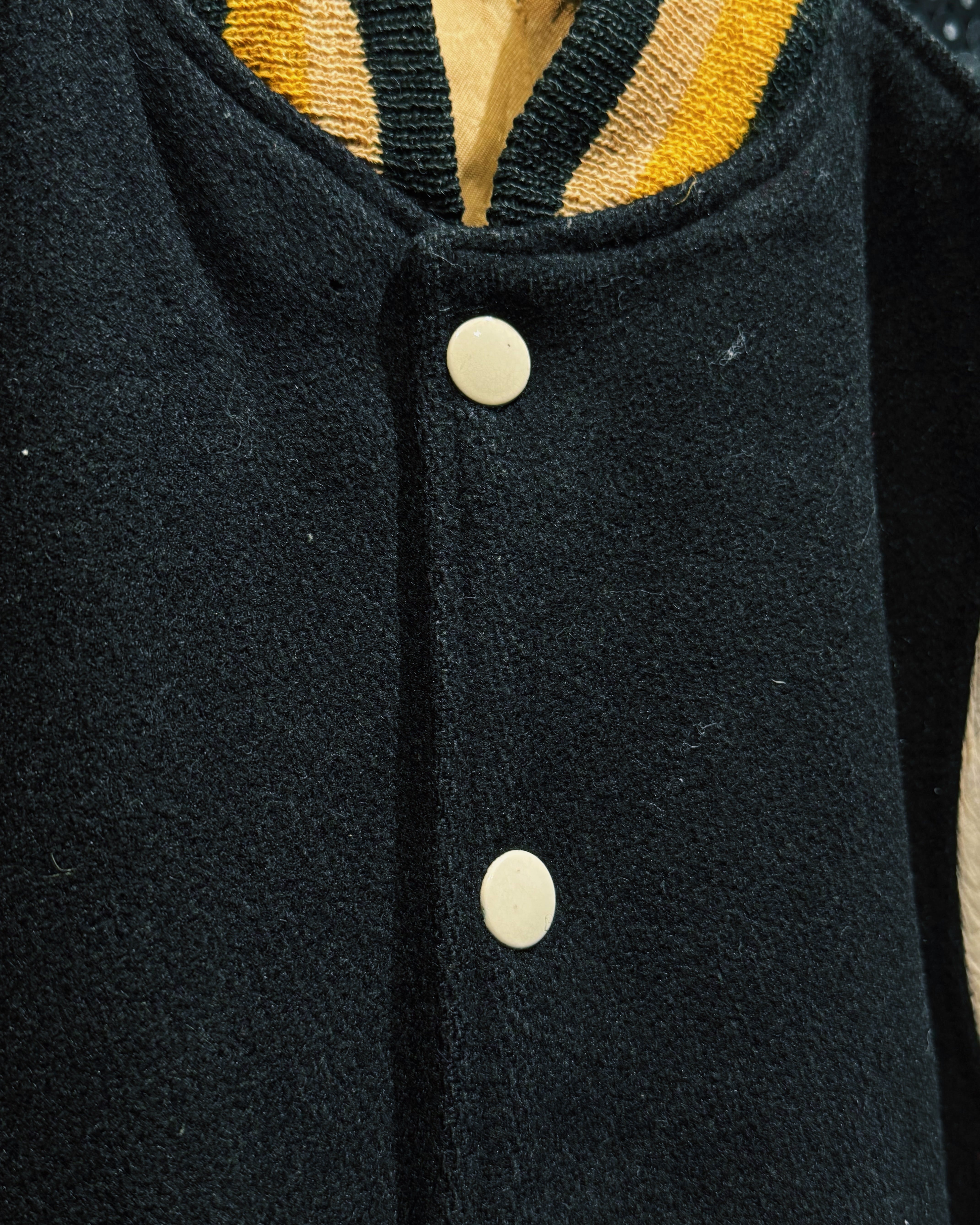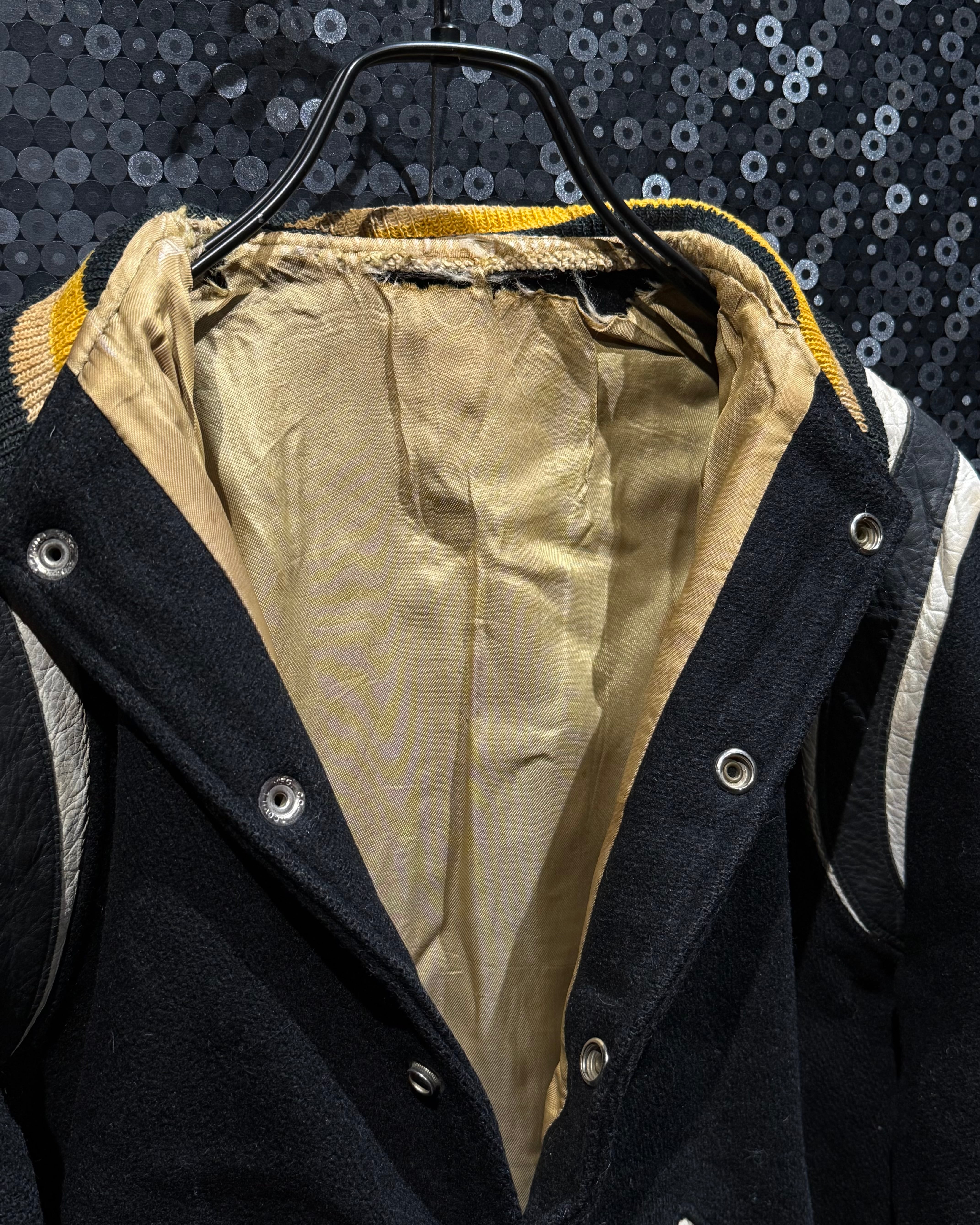 ブラックボディにマスタードイエローのリブラインが映える、クラシックなヴィンテージバーシティジャケット。