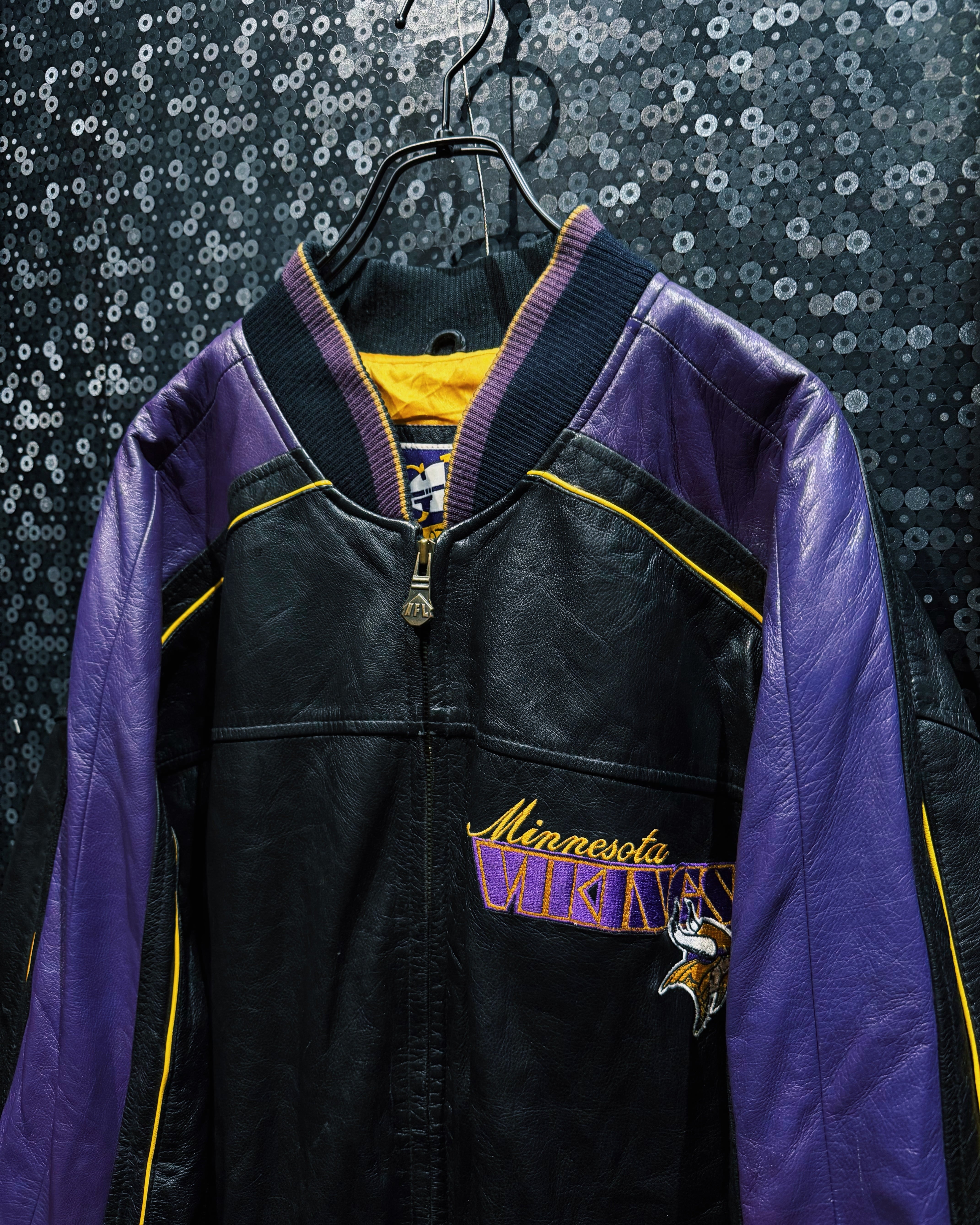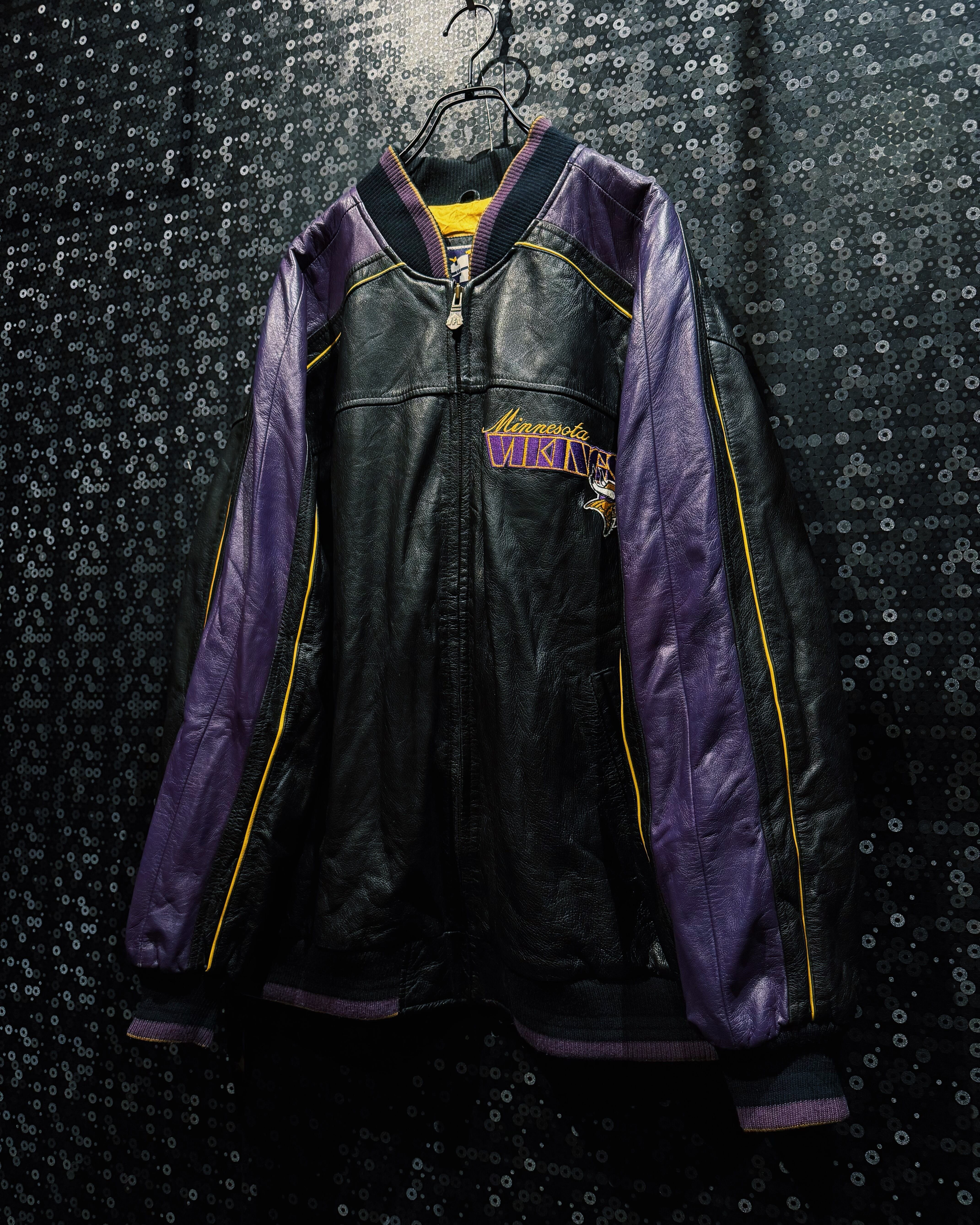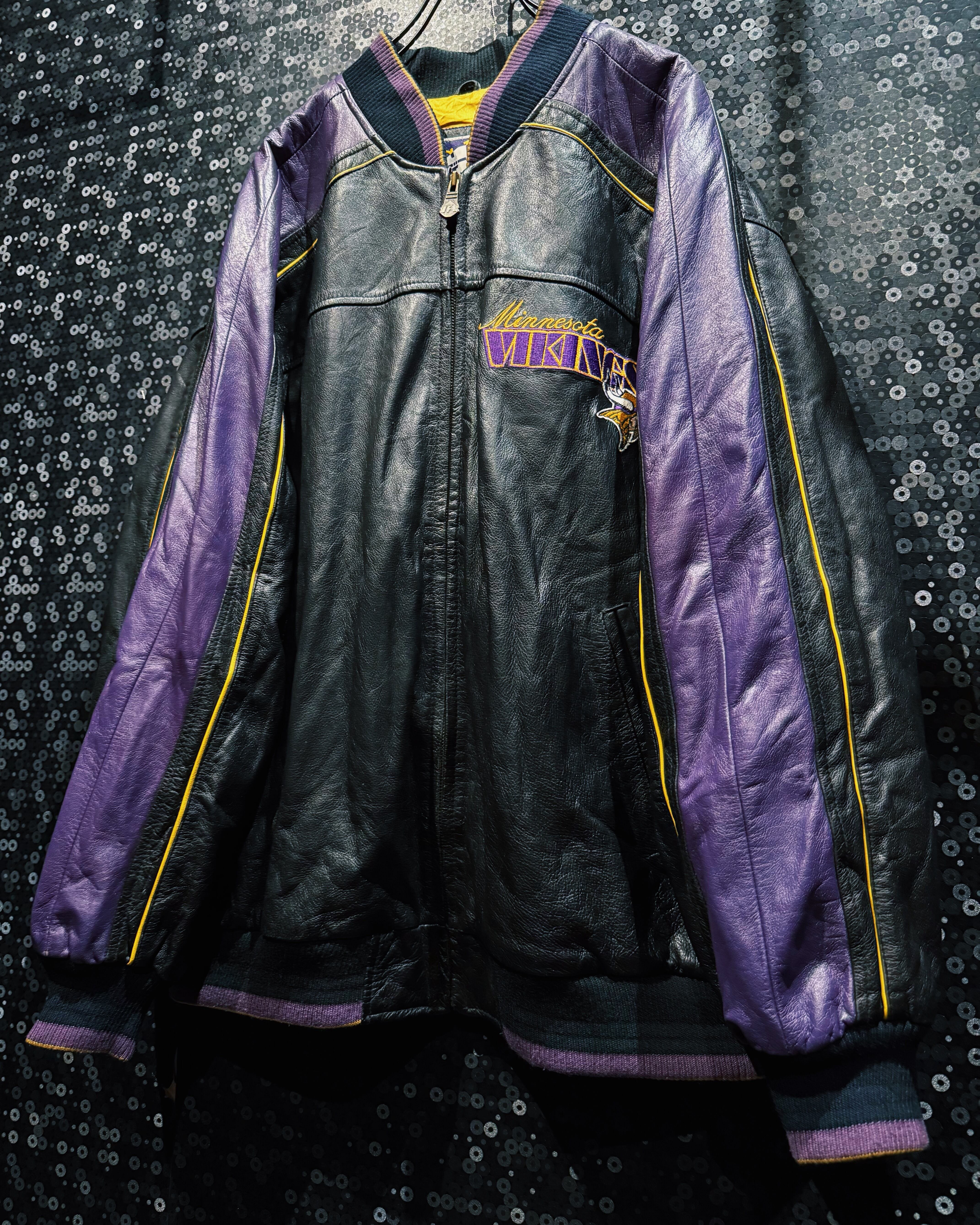 NFLチーム「Minnesota Vikings(ミネソタ・バイキングス)」のチームカラーを纏った、G-III by Carl Banks製のレザースタジアムジャケット。