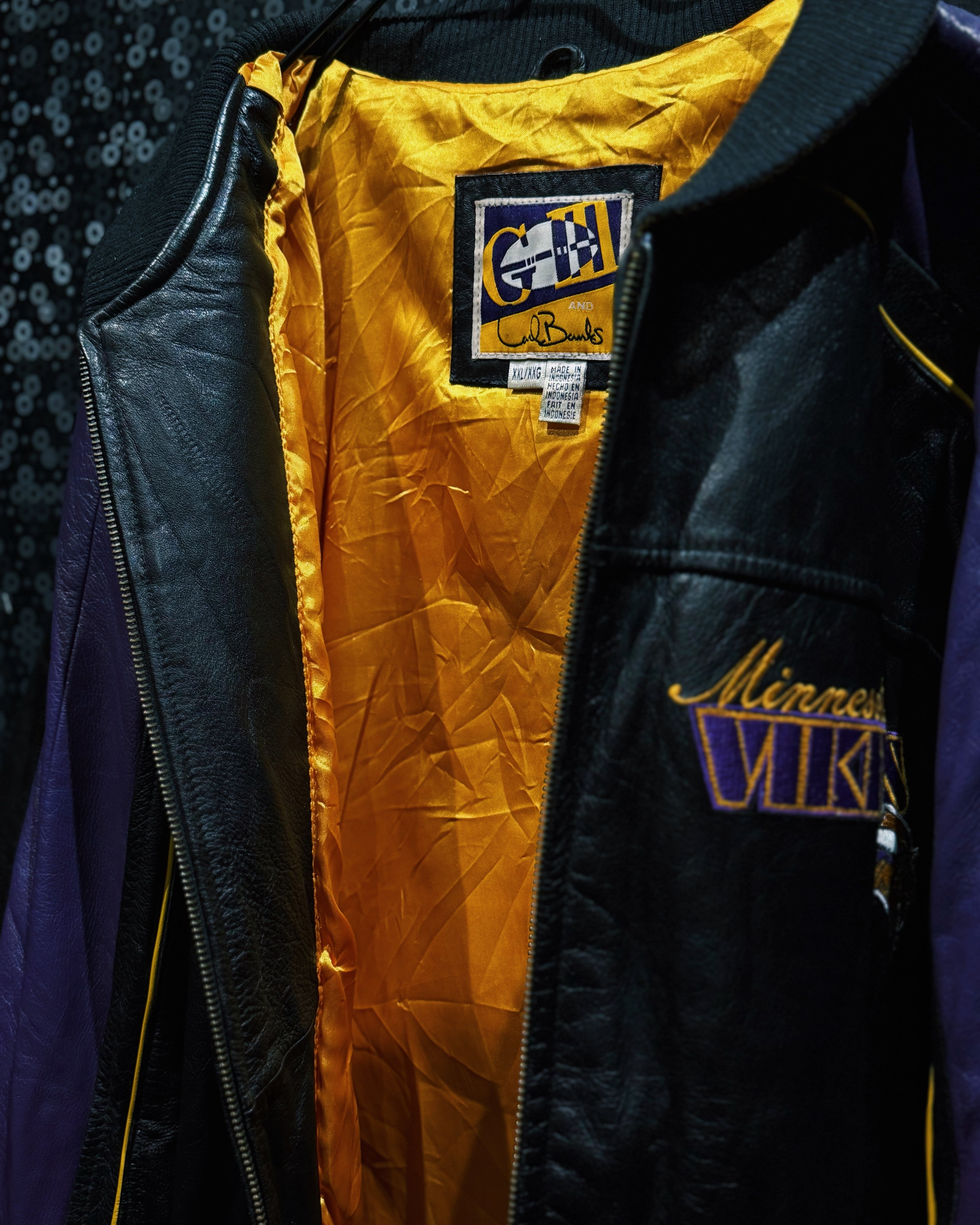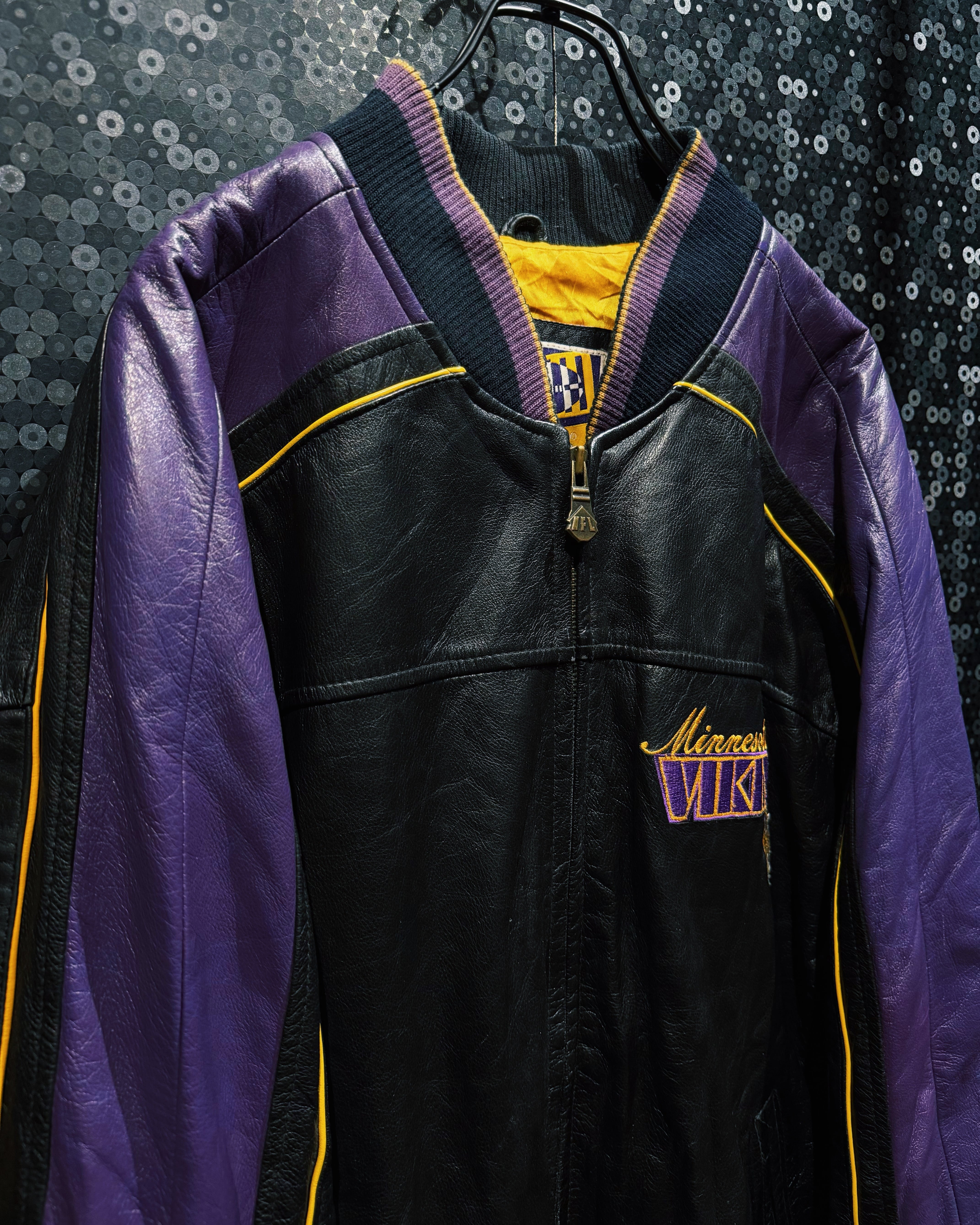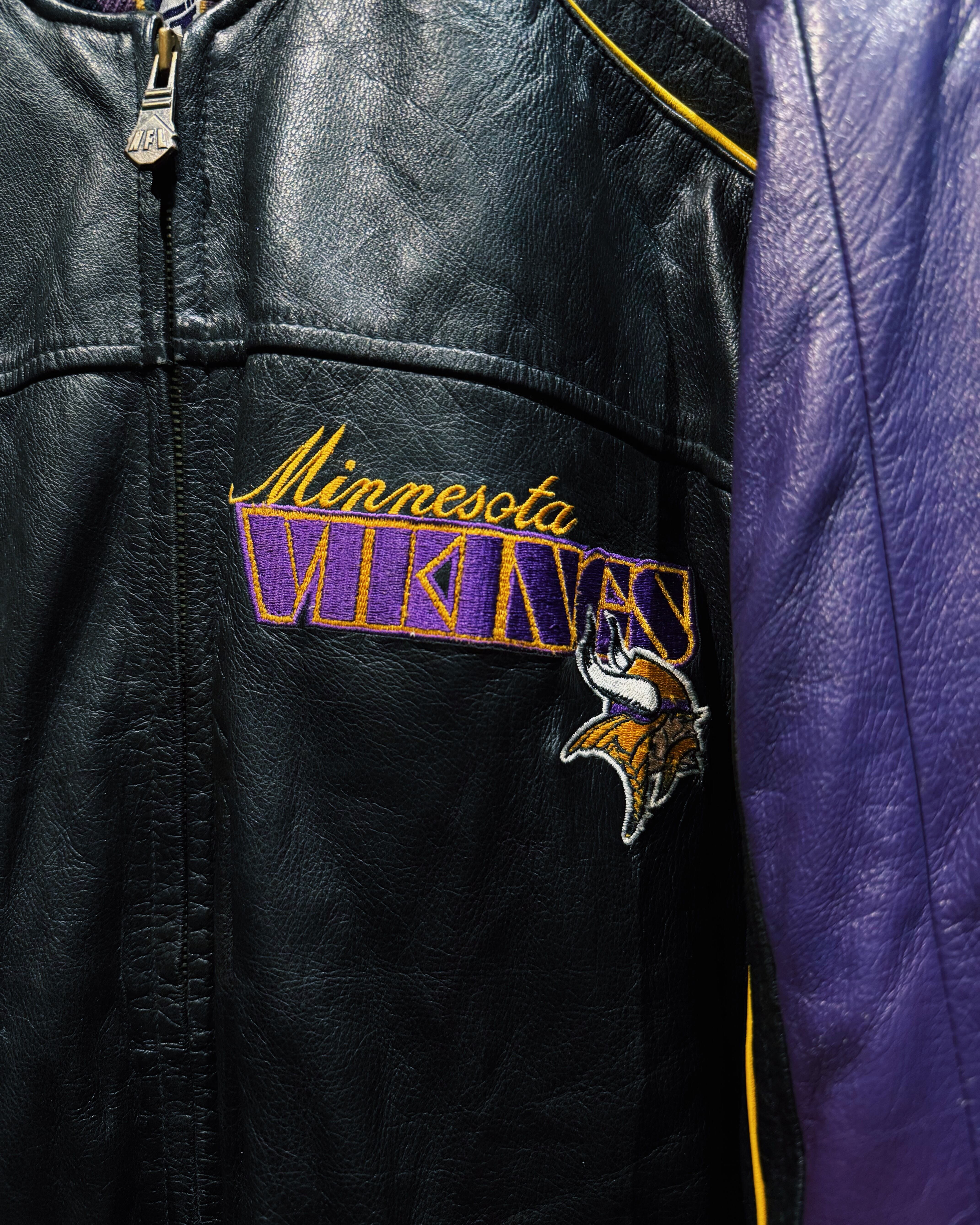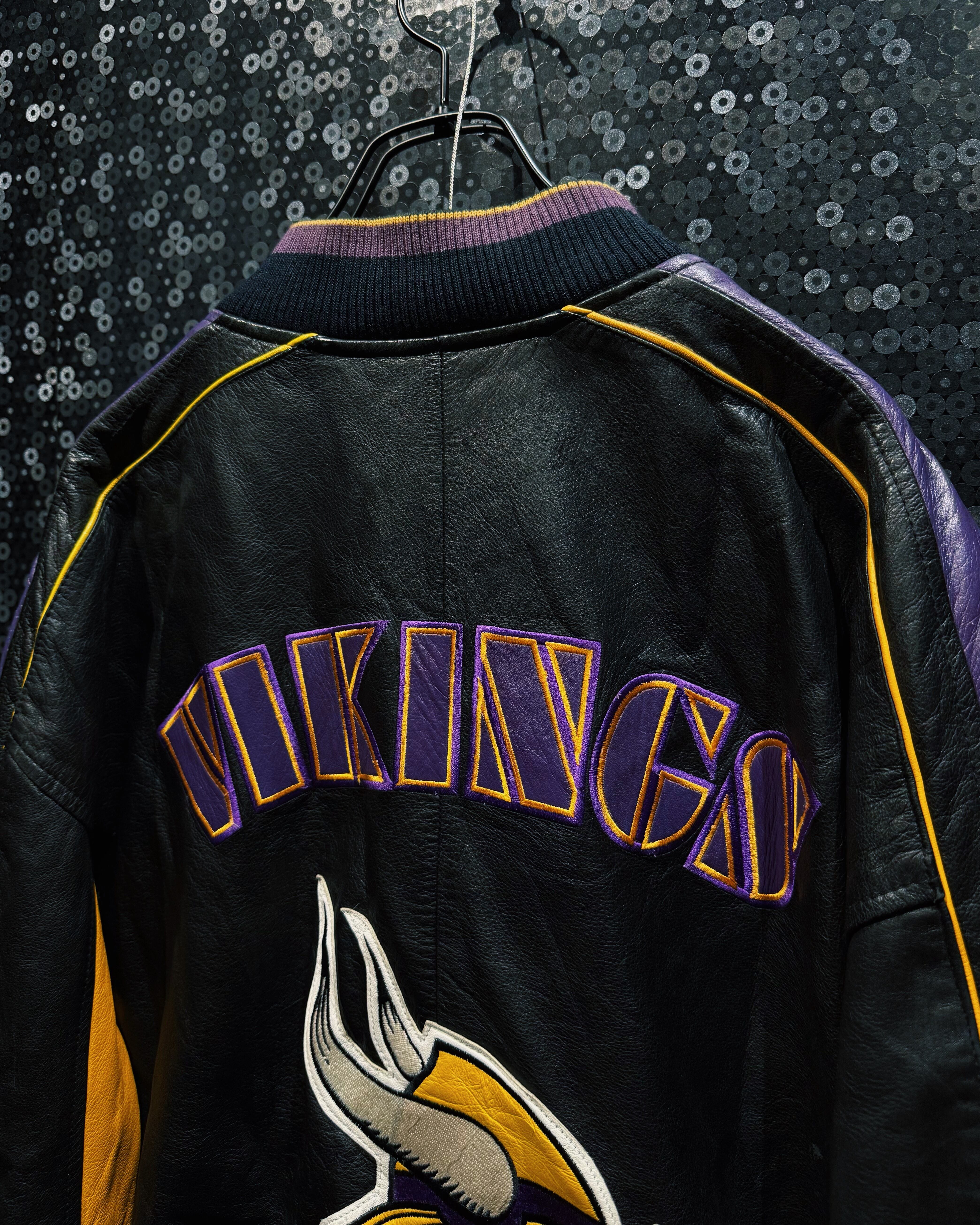 NFLチーム「Minnesota Vikings(ミネソタ・バイキングス)」のチームカラーを纏った、G-III by Carl Banks製のレザースタジアムジャケット。