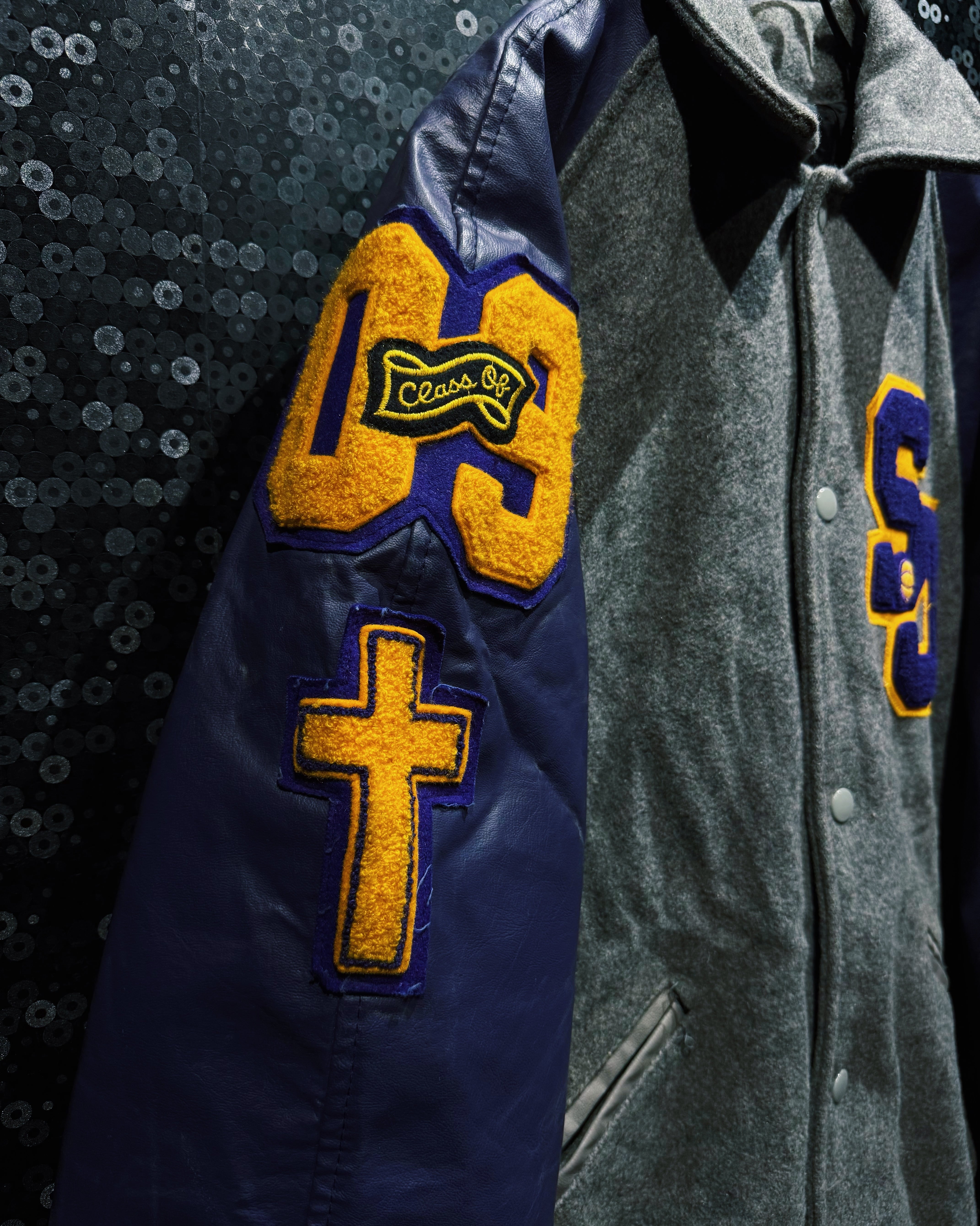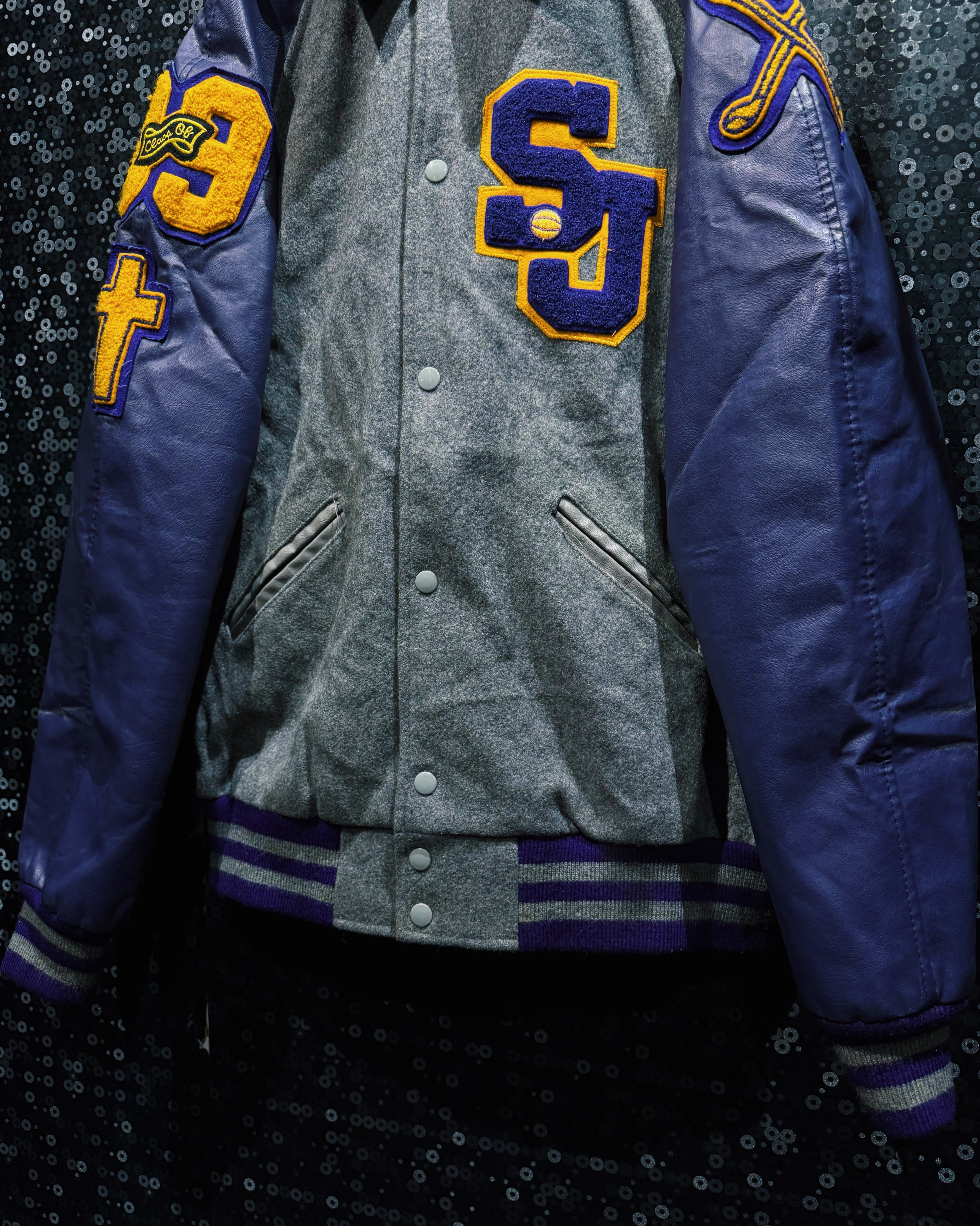クラシックな印象のグレーカラーウールにパープルカラーのレザーの切り替えのデザインはスタジャンの中でもクラシックでポップなカレッジワッペンが施された1着。。モッチモチのレザーアームは美しく綺麗な色味ですね。