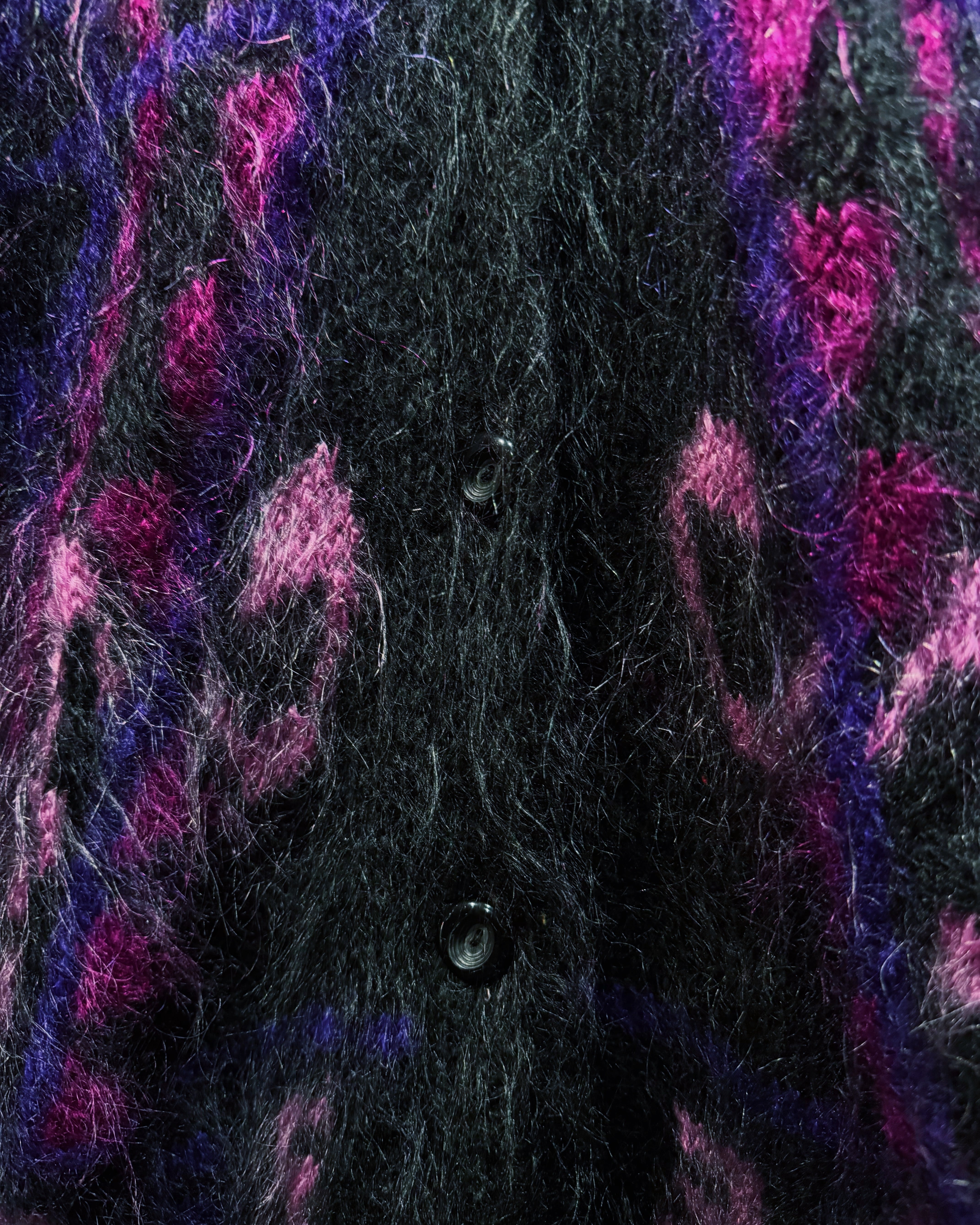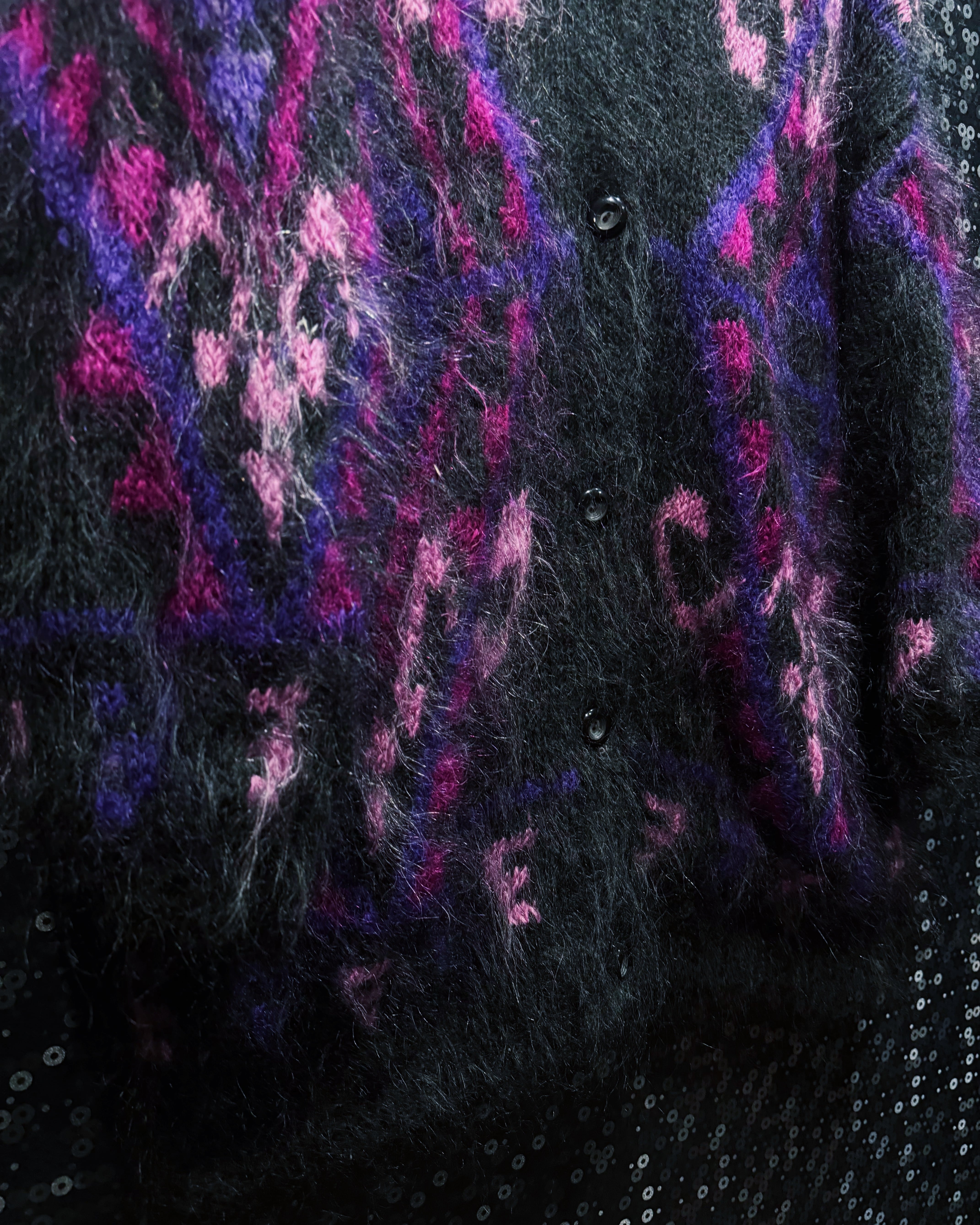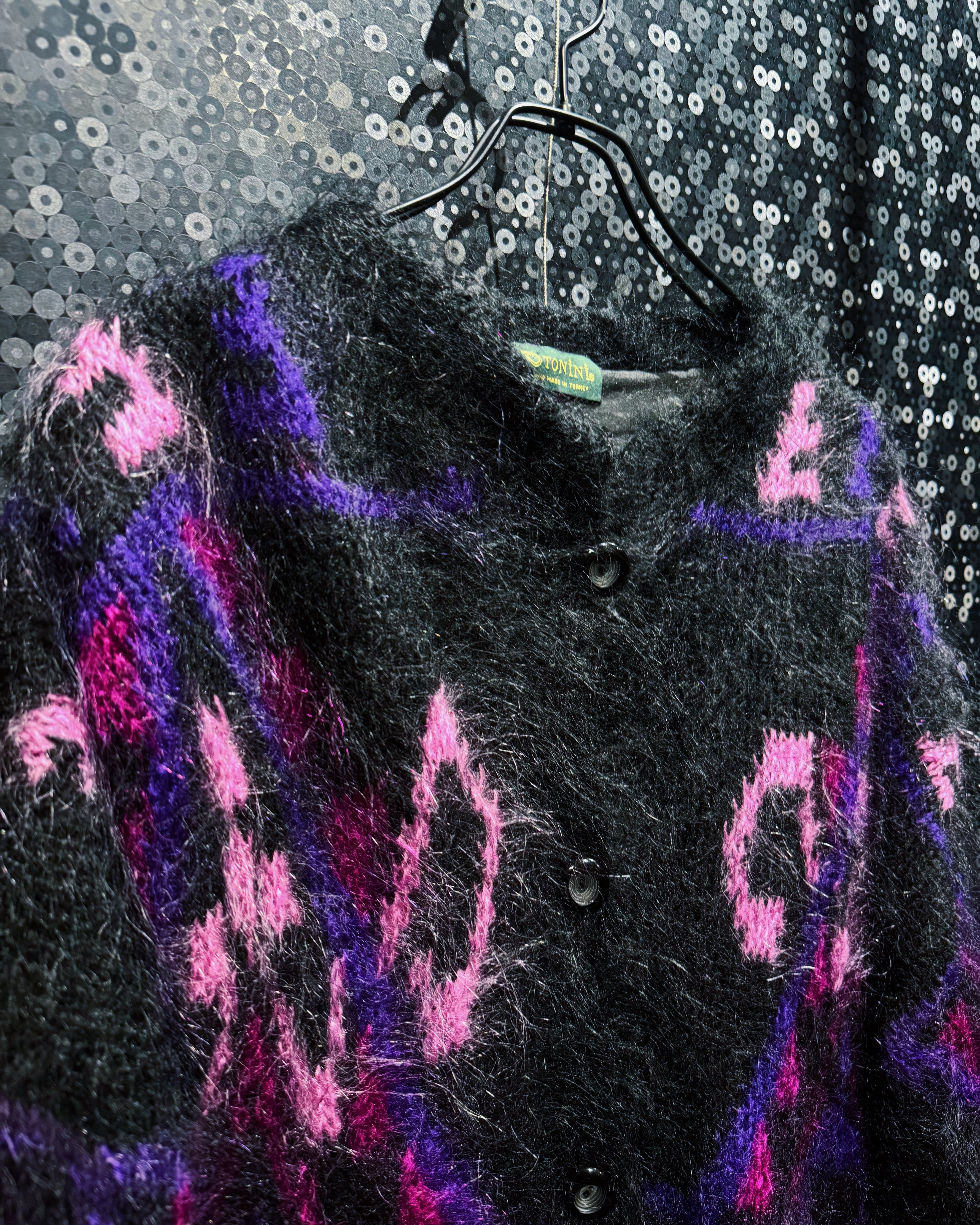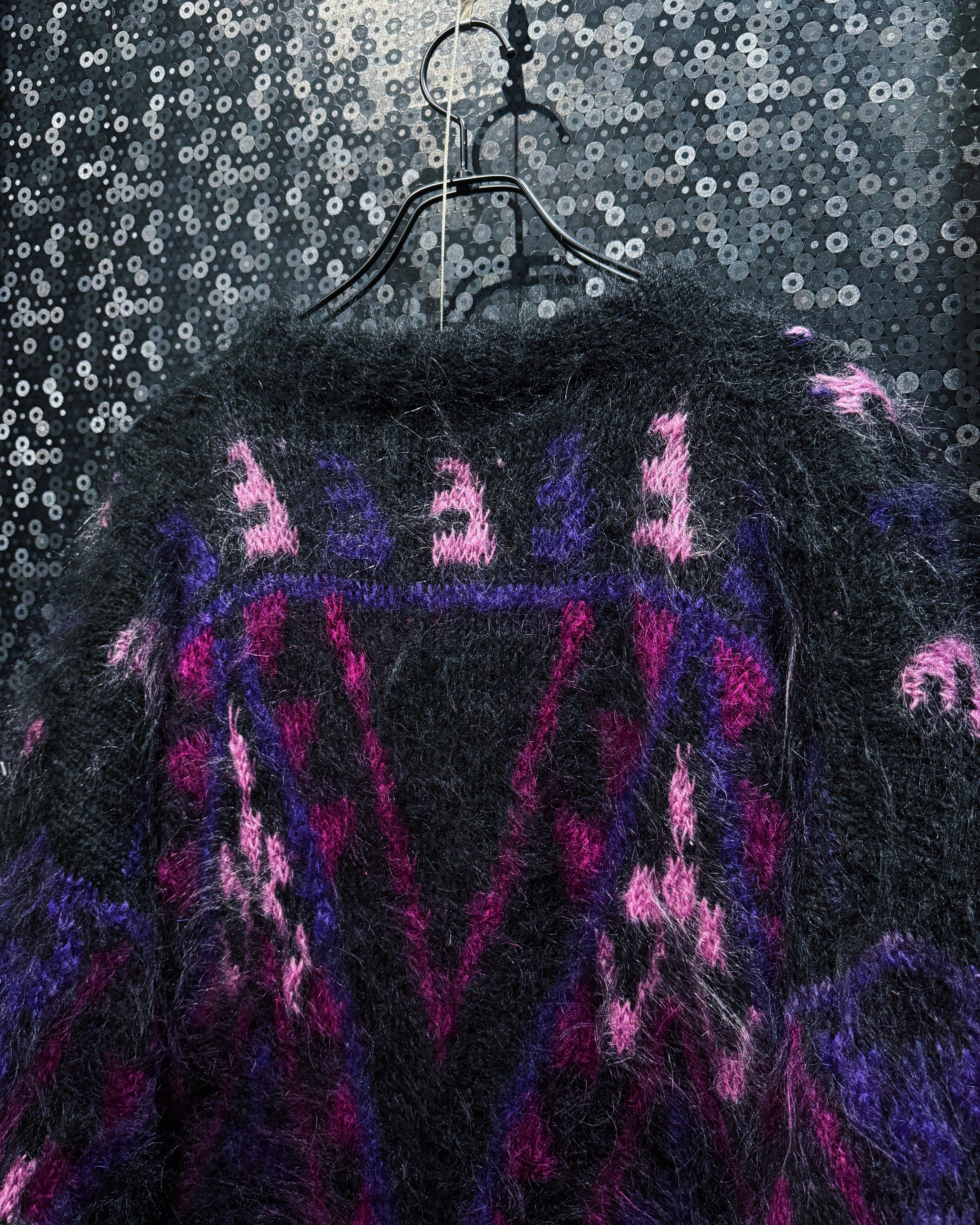 深いブラックをベースに、パープル・ピンク・ヴァイオレットの濃淡がランダムに走る、まさに“90sモヘアの魔力”を凝縮した一着。トルコ製ハンドメイドならではの荒々しくも温かみのある起毛感が魅力で、ライトの当たり方で表情が変わるヘアリーな質感は圧倒的な存在感。身頃からスリーブまでびっしりと入る幾何学×アブストラクトな織り柄は、量産ニットでは絶対に再現できない職人仕事で、1着ごとに微妙な表情が異なる“アートピース”のような仕上がり。