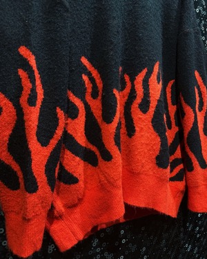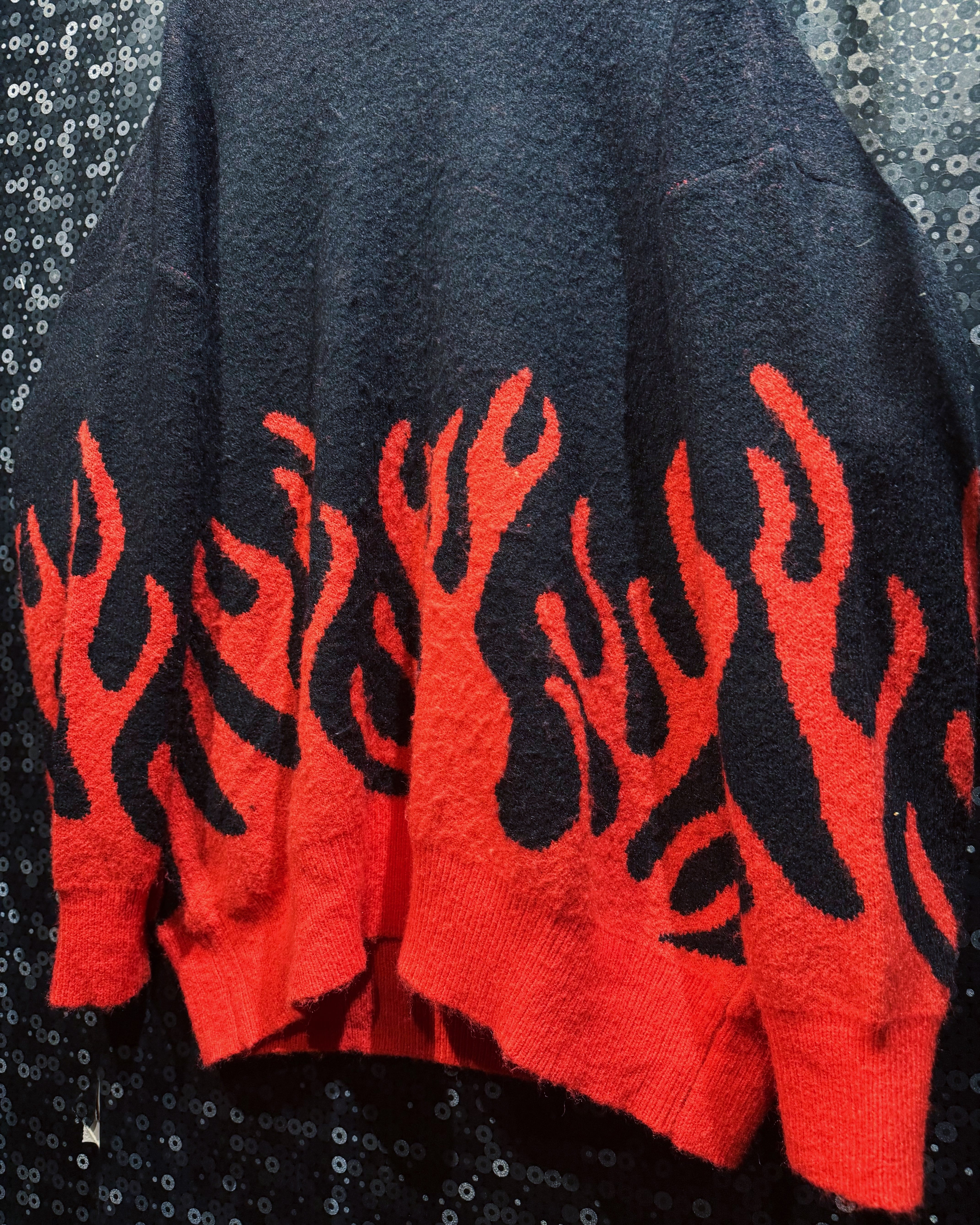 ダメージデニムからレザーパンツまで相性抜群で、主役として圧倒的に使える。火炎柄ニットの中でも特にグラデーションが綺麗な優良デザイン。