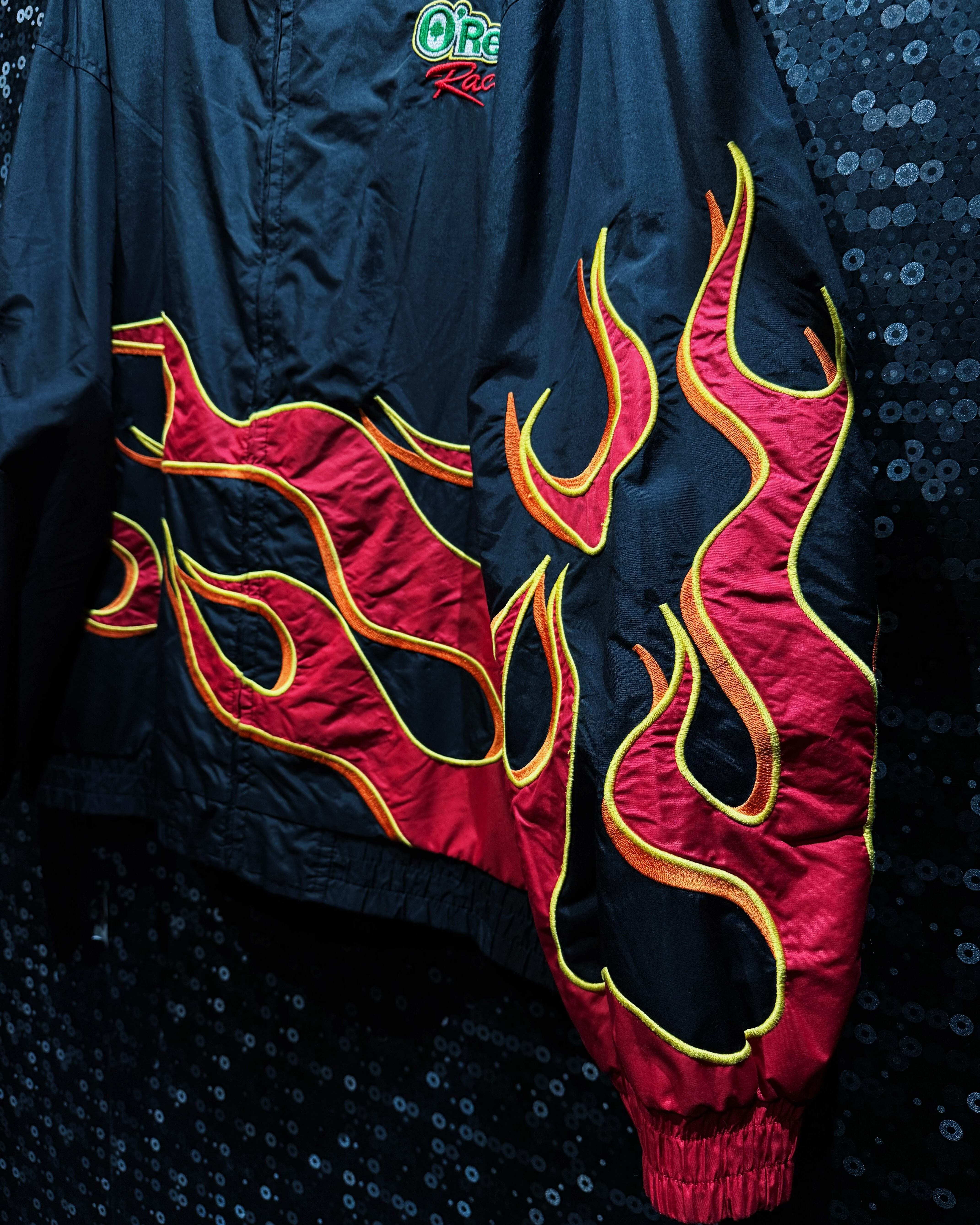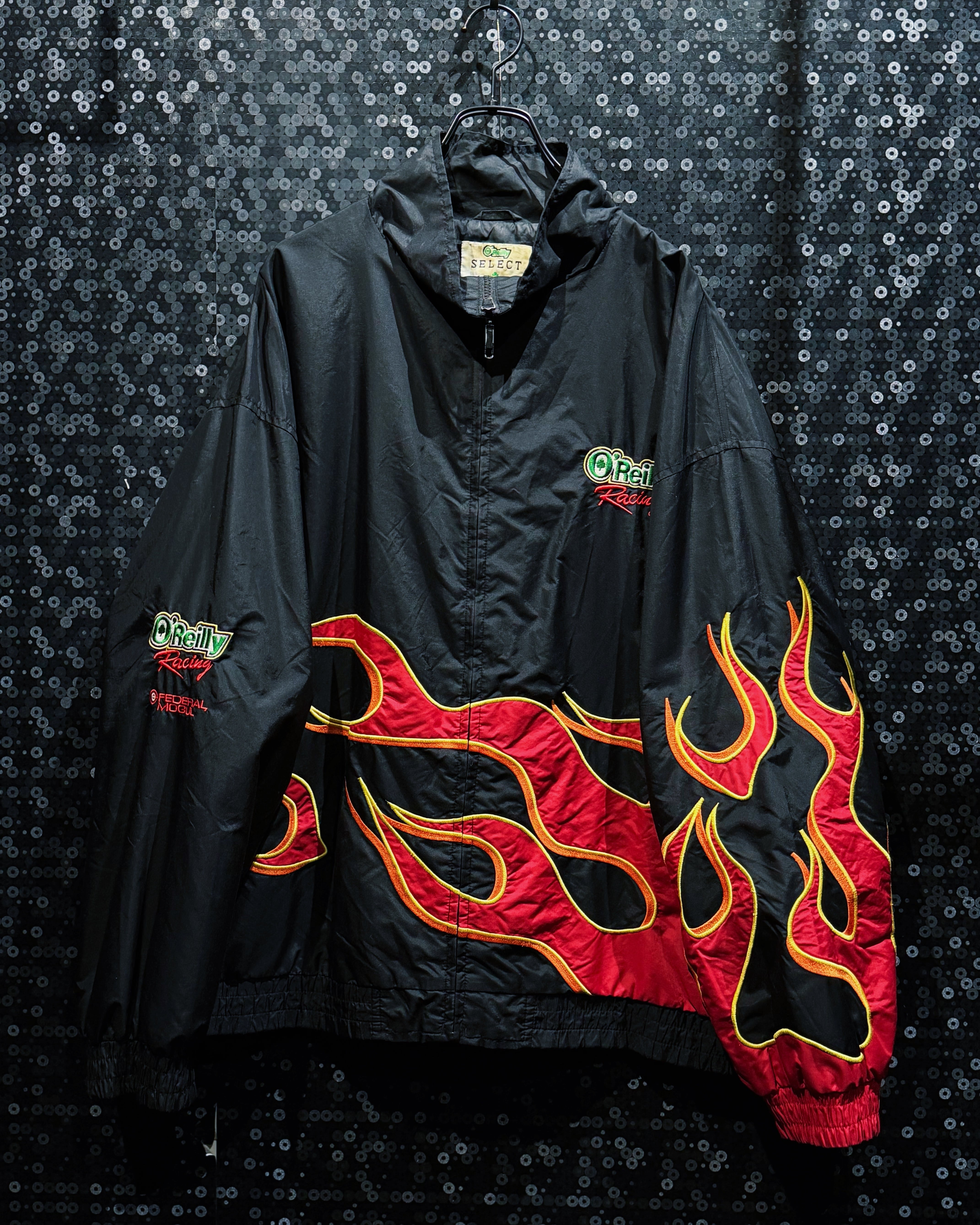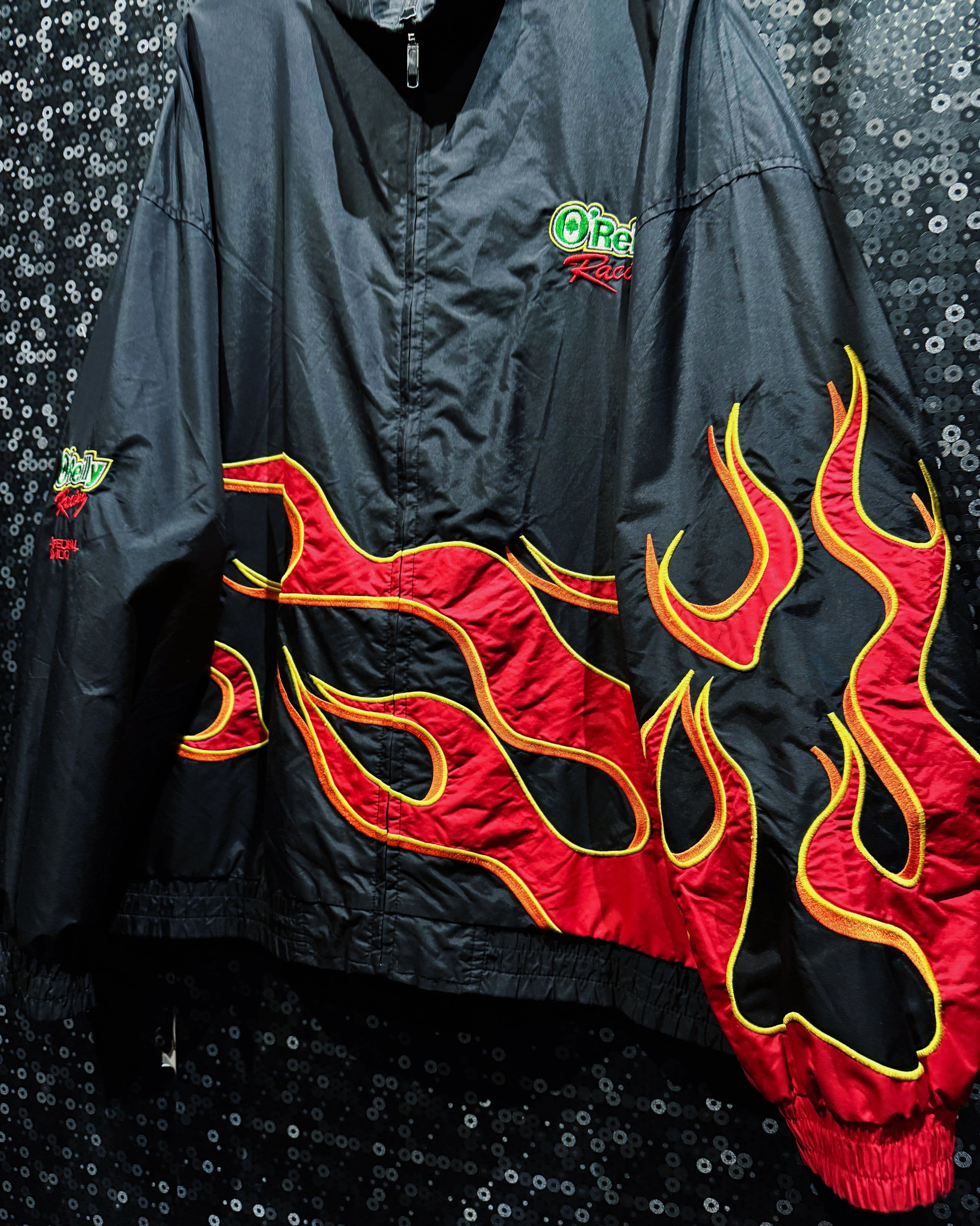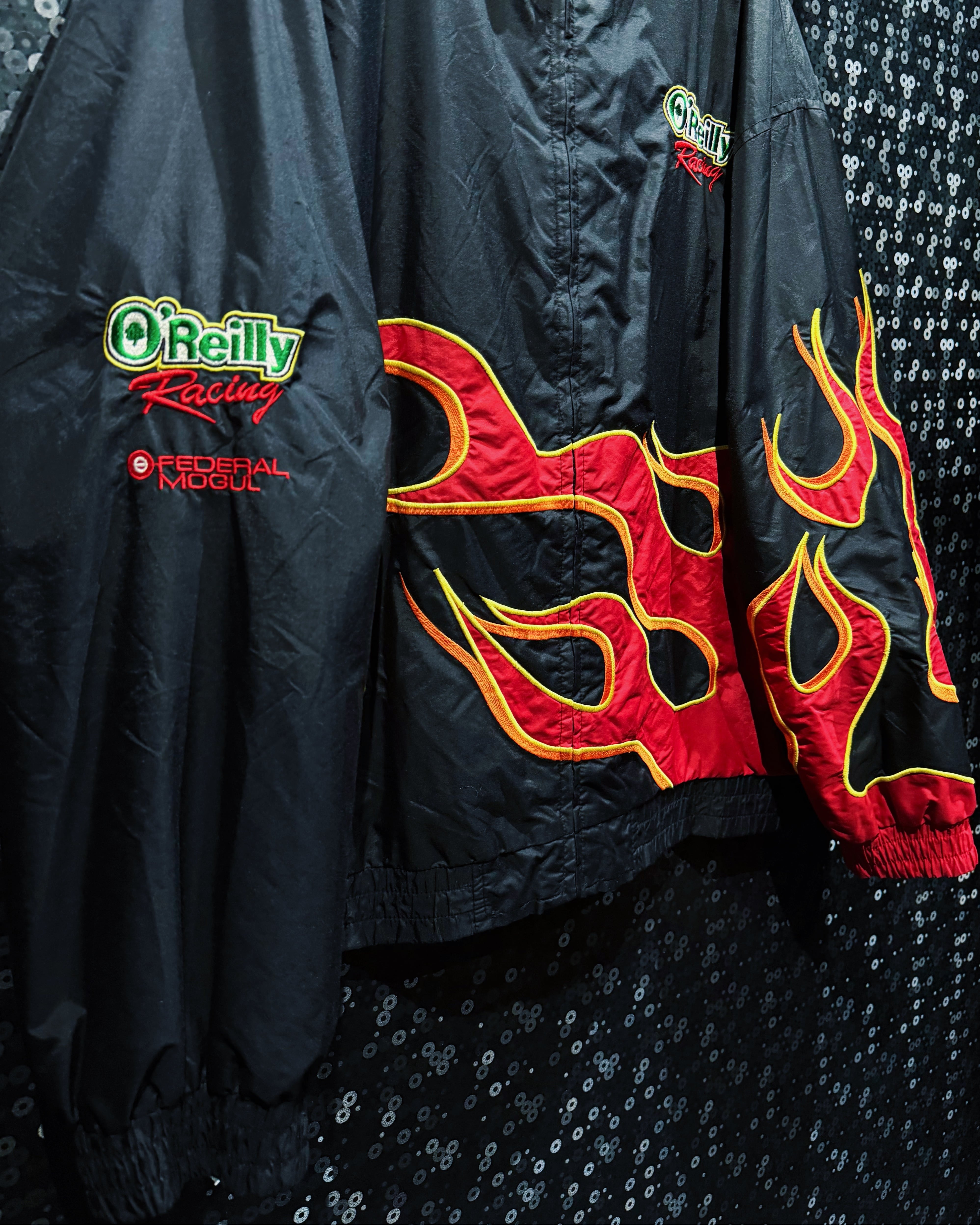 ブラックボディに、真っ赤なファイヤーパターンを大胆に叩き込んだ、90sストリートの暴れ馬みたいな“ホットロッド系レーシングナイロンジャケット”。胸と袖には O’Reilly Racing の立体刺繍ワッペン、腹部から袖先にかけて走る赤×黄のフレイム刺繍は完全に主役級。ひと目で“アメリカのレースカルチャー”とわかる強烈なインパクトで、現行では絶対に出ない90s特有の荒々しいデザイン性が魅力。
