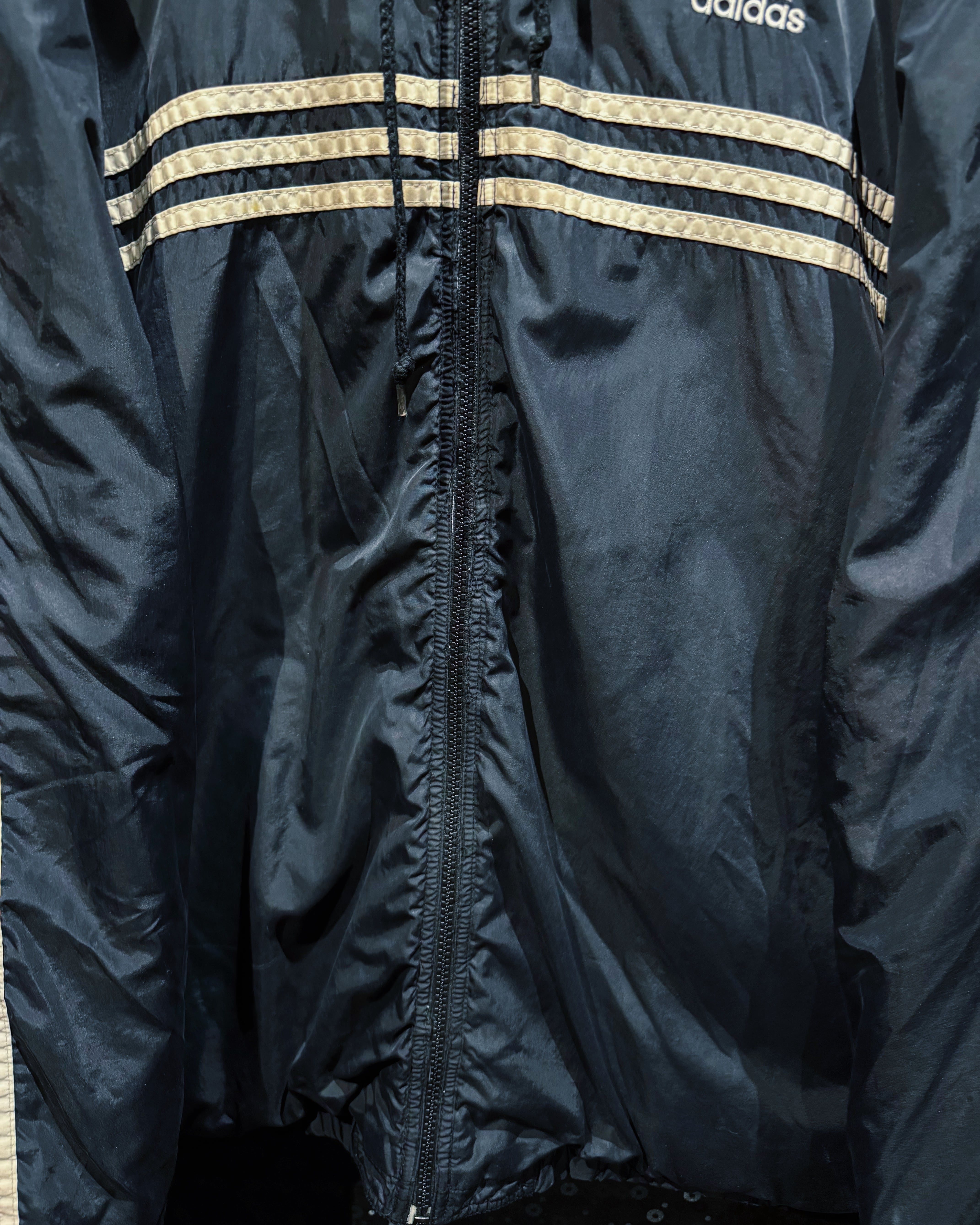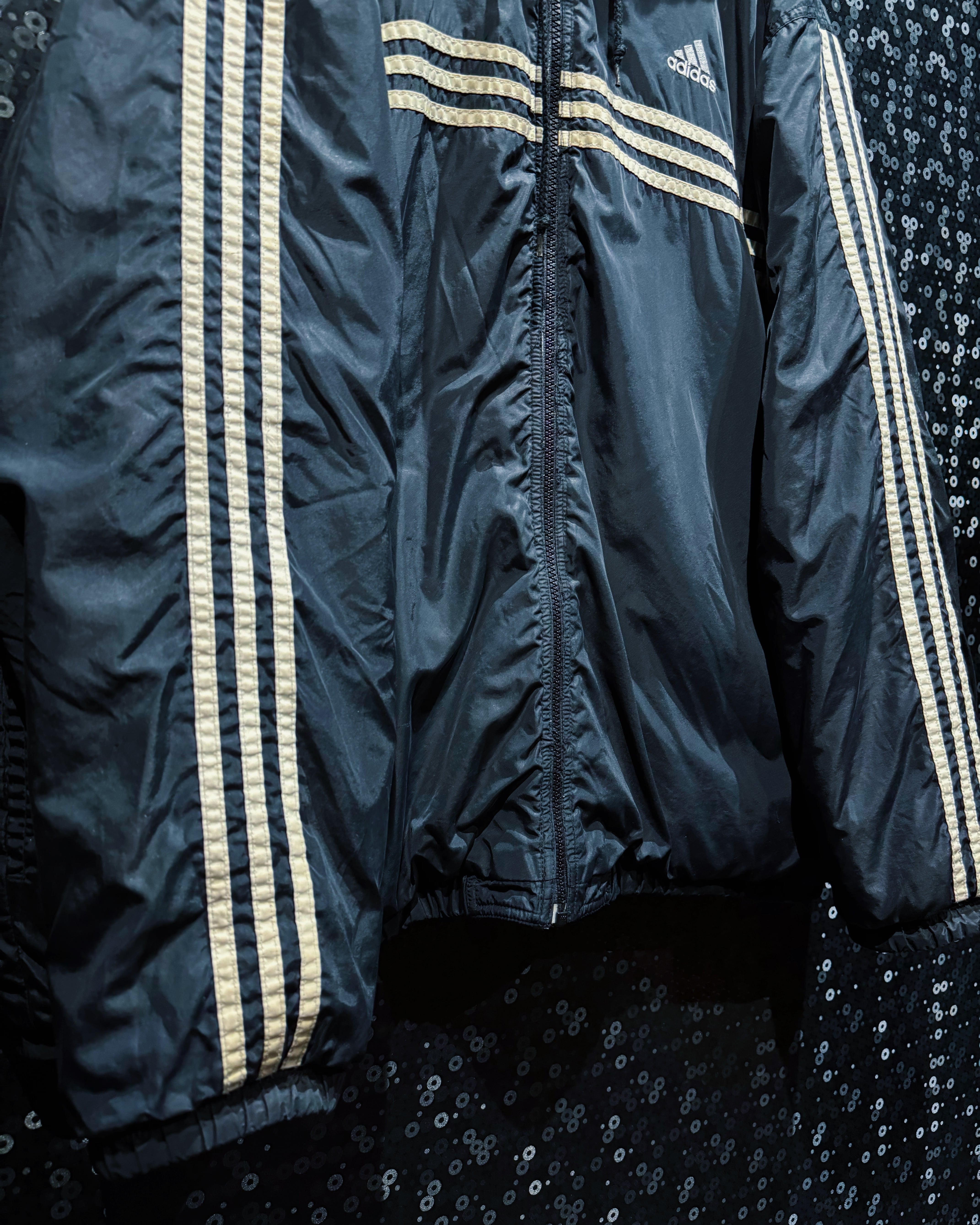 内側にはグレーの肉厚スウェットライニングが全面に敷かれており、裏返すとほぼ“フーディージャケット”と呼べるほどの存在感。内側のadidasロゴはラバープリント仕様で、スウェット単体としても成立するデザイン性を持つ。ナイロンのハリとスウェットの柔らかさという異素材の魅力が一着に濃縮されており、着用時の保温性も高く、真冬のアウターとしても抜群。