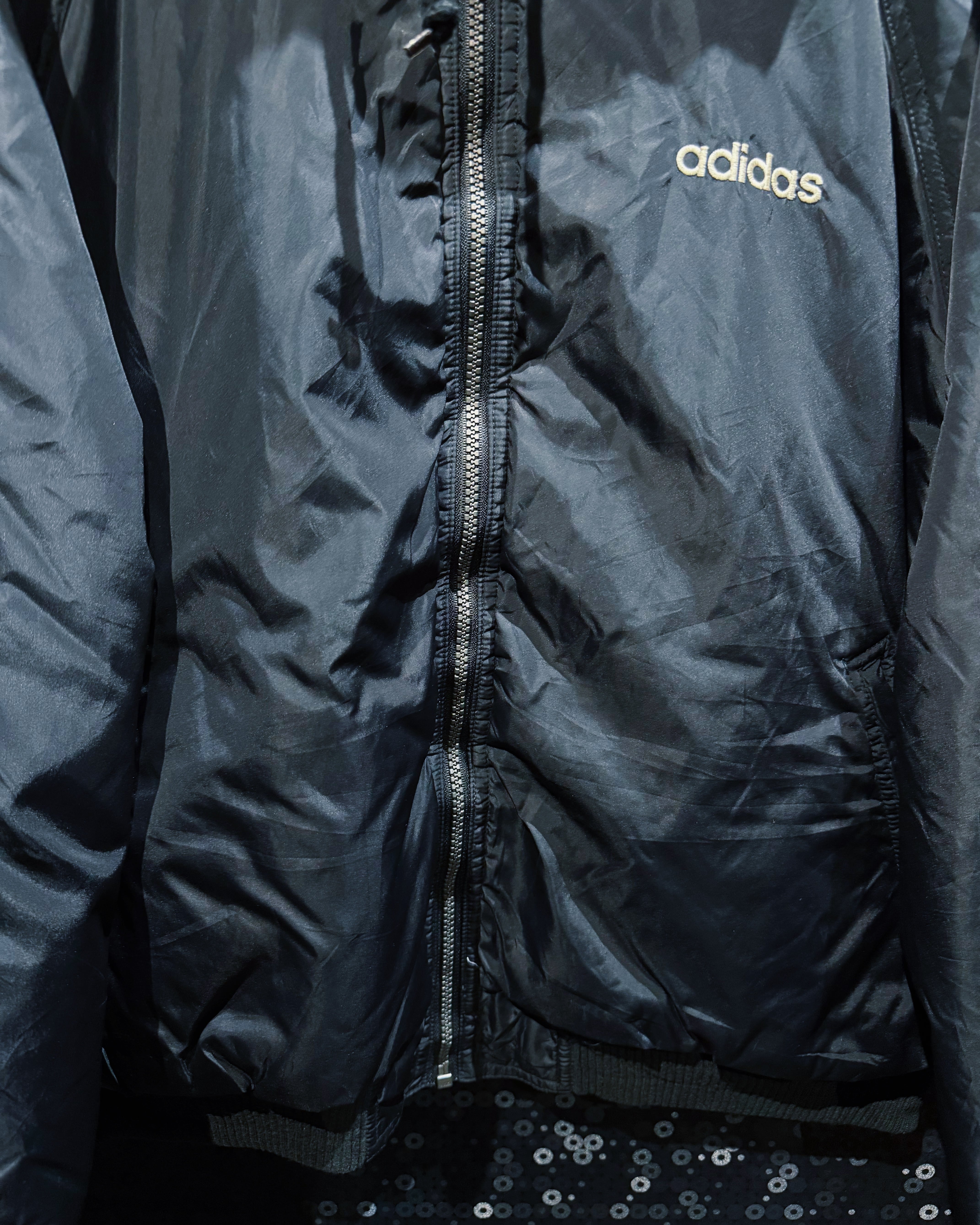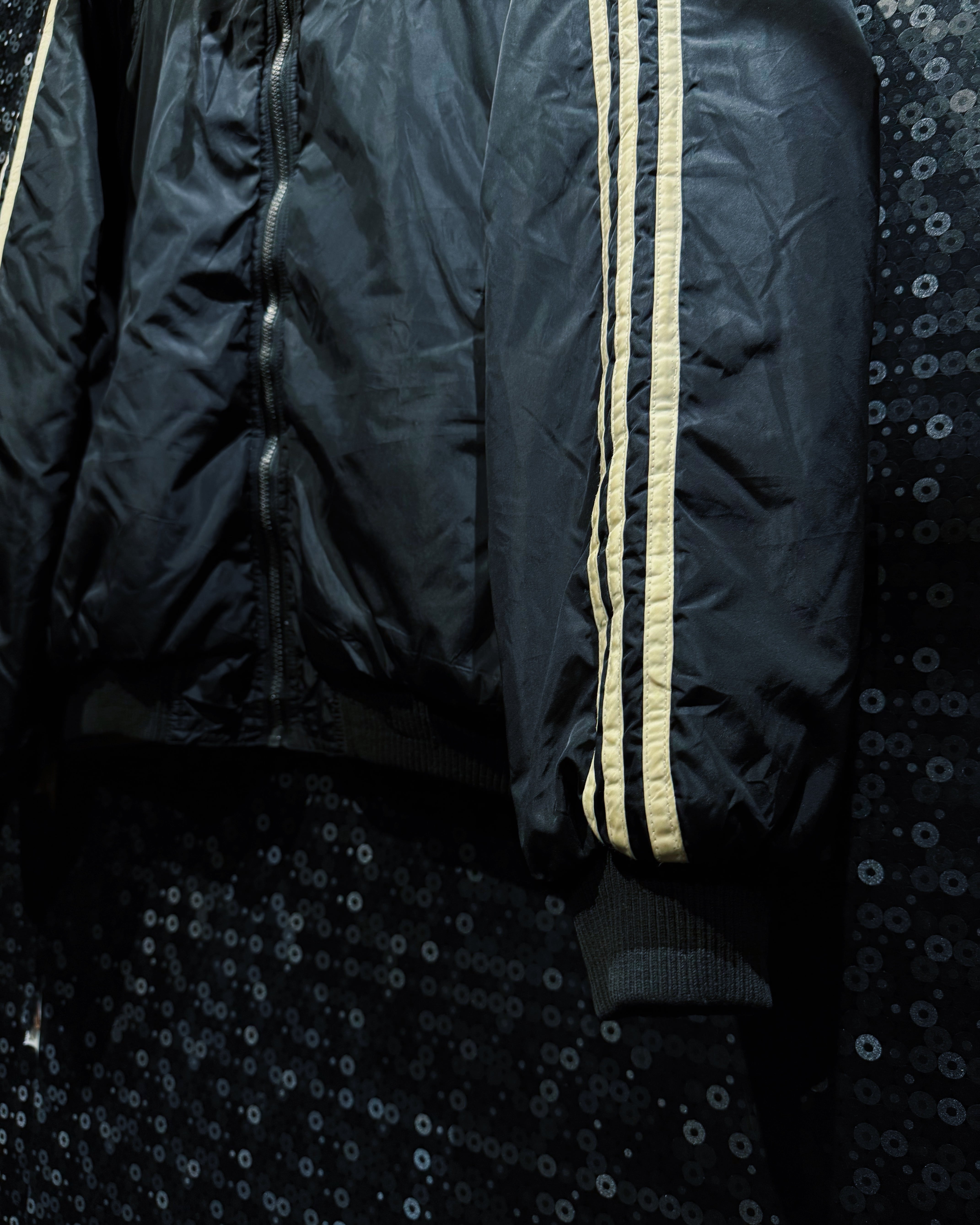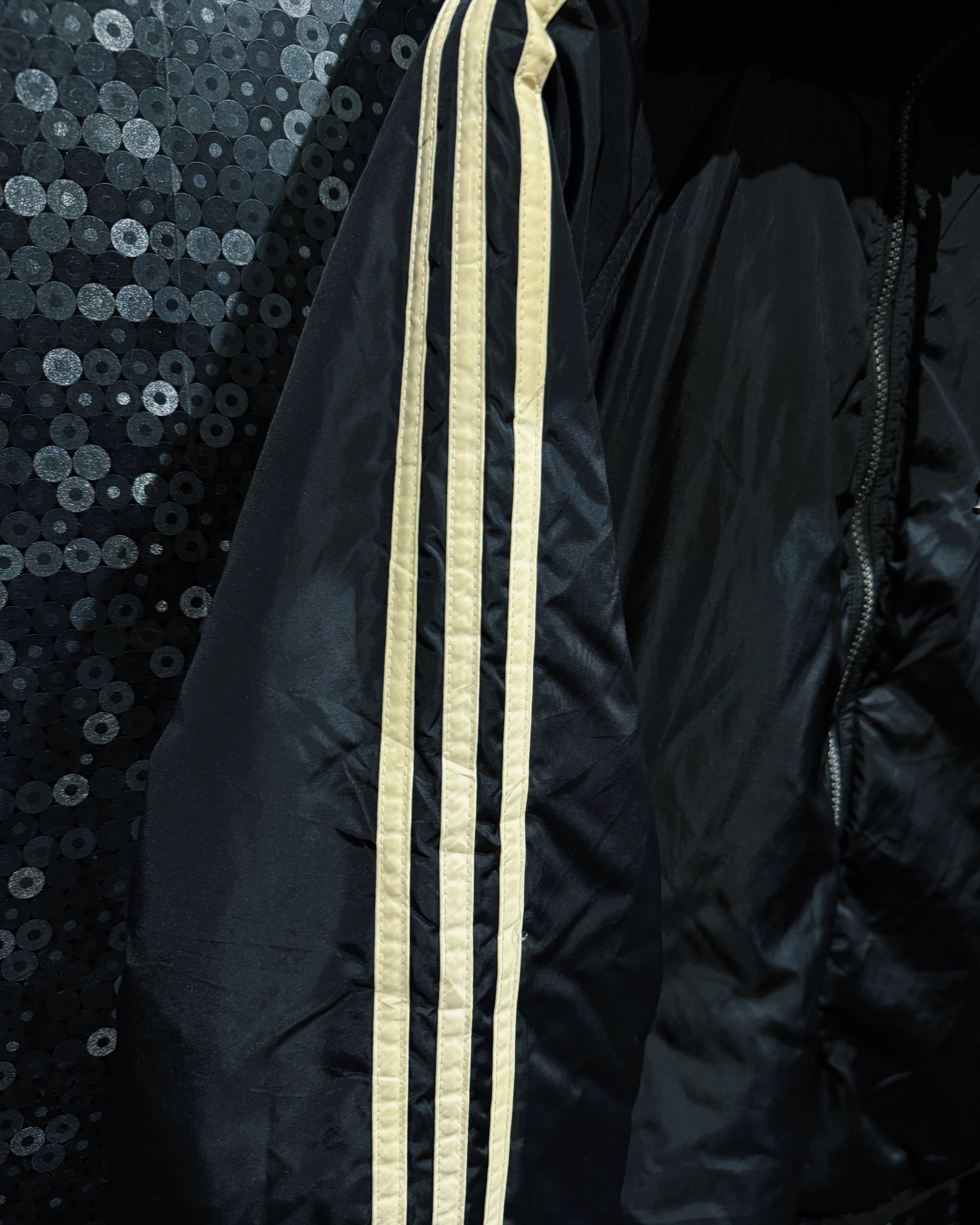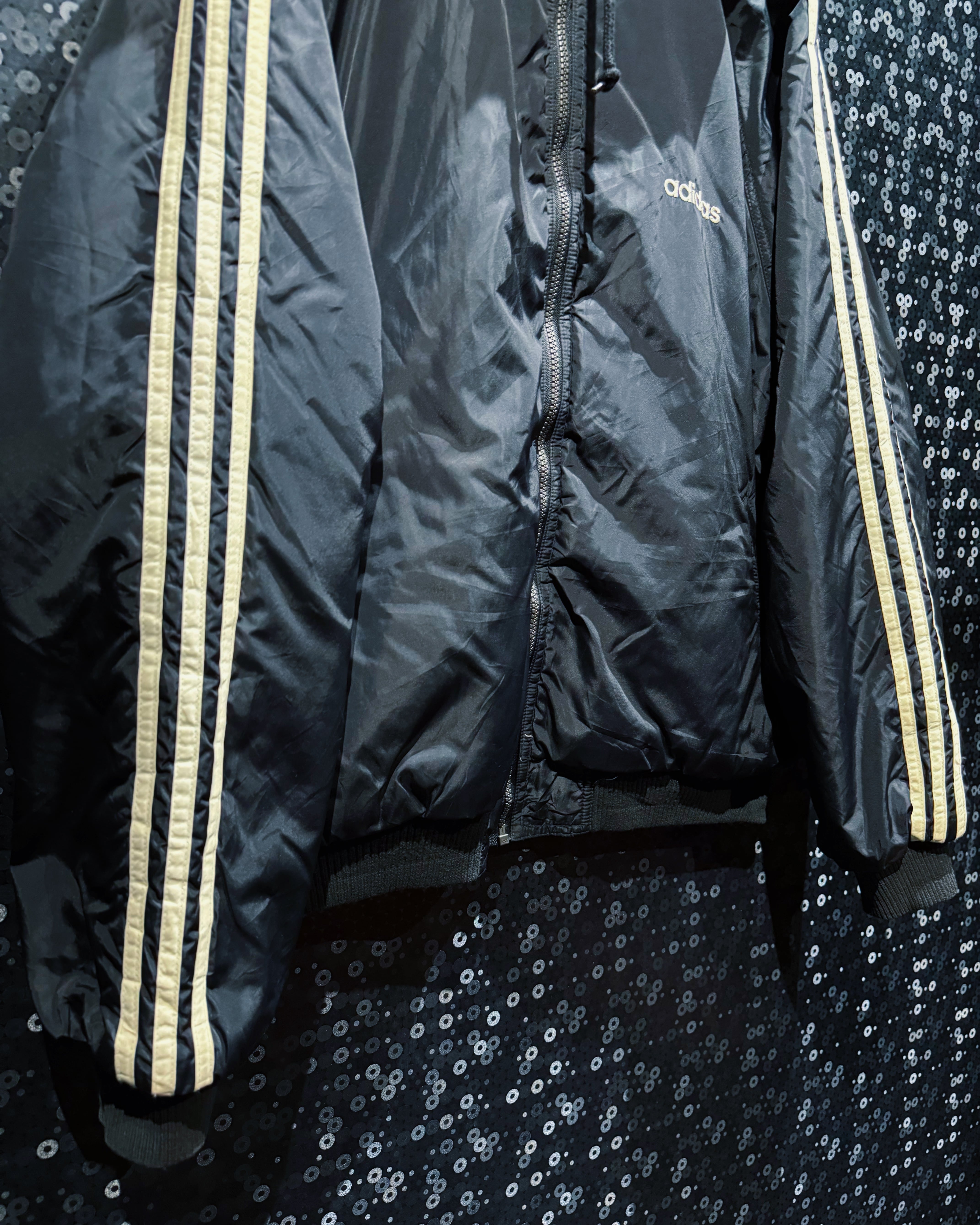 ナイロン面は、程よい光沢が魅力のブラックボディに、生成り寄りのホワイト3ストライプを肩から袖までストンと落とした王道デザイン。胸のトレフォイル刺繍もホワイトで統一され、シンプルなのに圧倒的な存在感を持つ。中綿もほどよく入り、風を通しにくいタフな作りで、真冬のアウターとして十分なスペックを備えている。