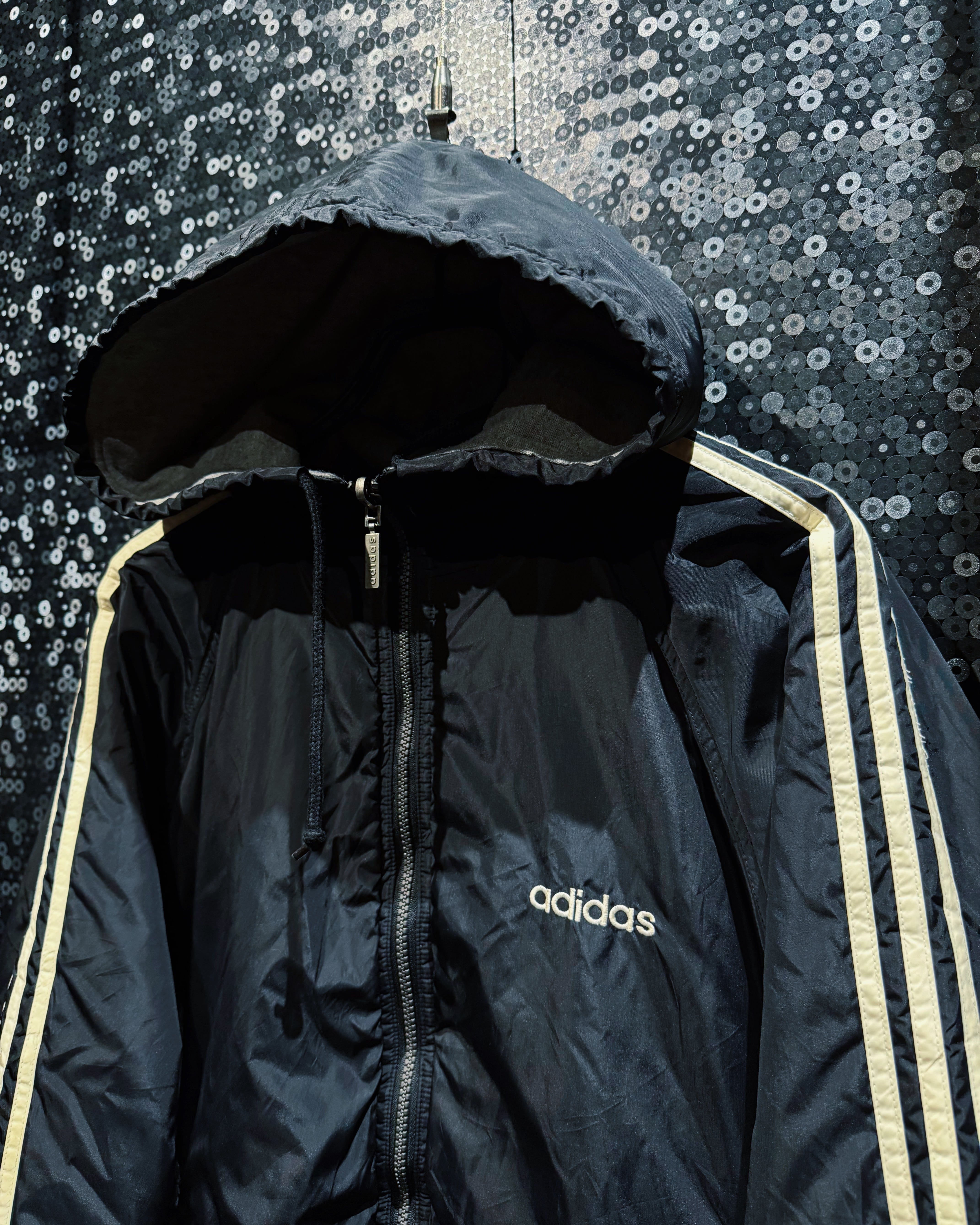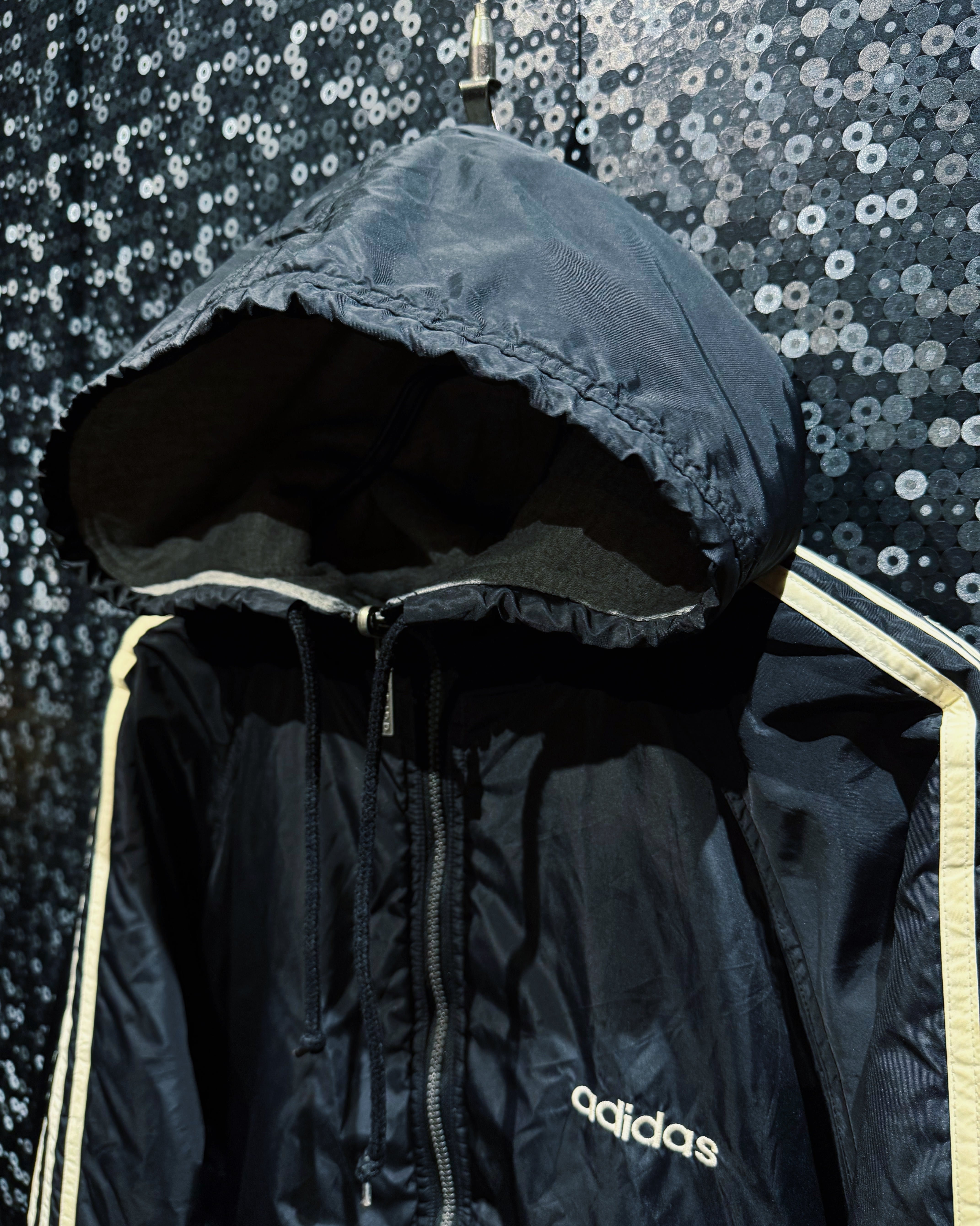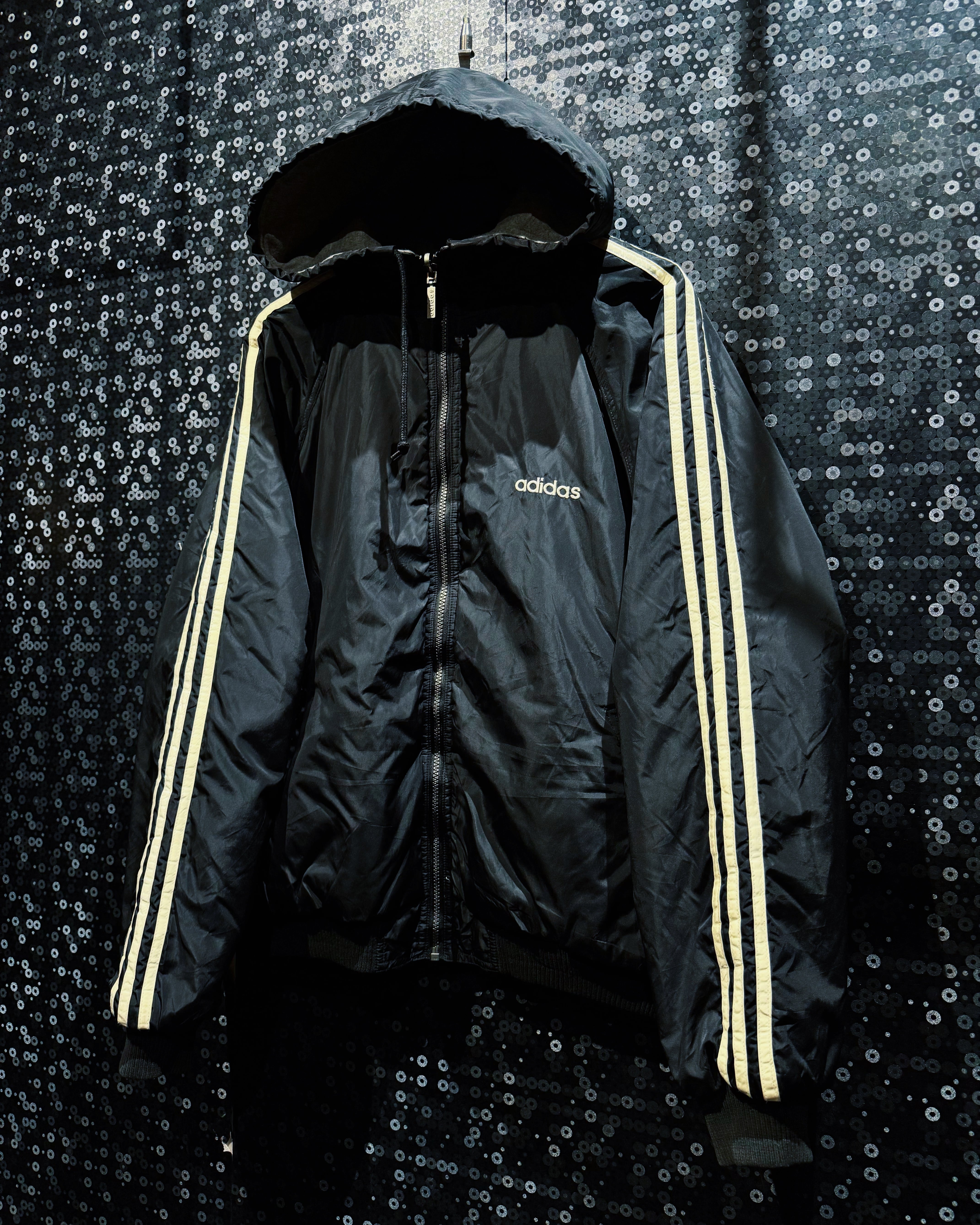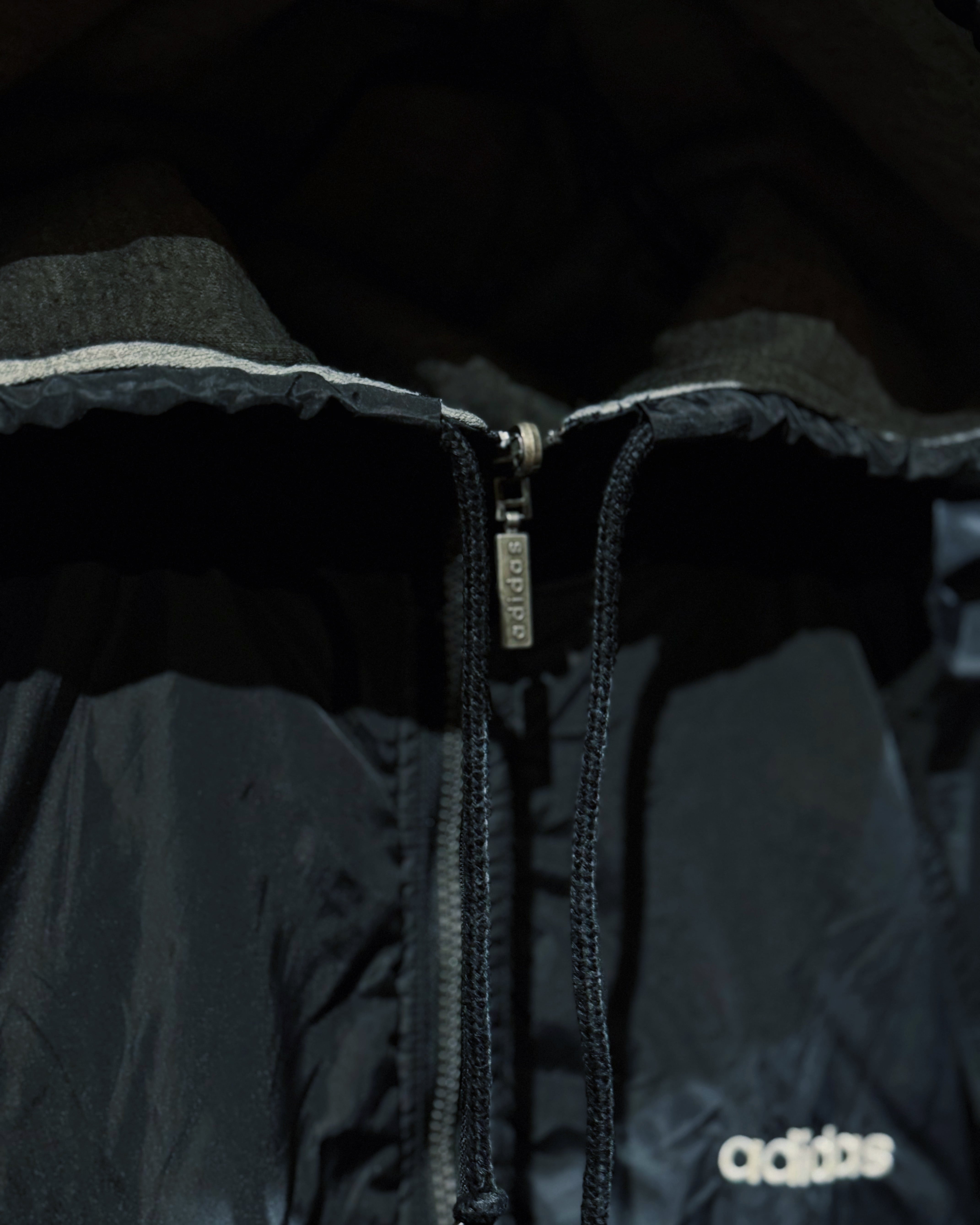 ナイロン面は、程よい光沢が魅力のブラックボディに、生成り寄りのホワイト3ストライプを肩から袖までストンと落とした王道デザイン。胸のトレフォイル刺繍もホワイトで統一され、シンプルなのに圧倒的な存在感を持つ。中綿もほどよく入り、風を通しにくいタフな作りで、真冬のアウターとして十分なスペックを備えている。