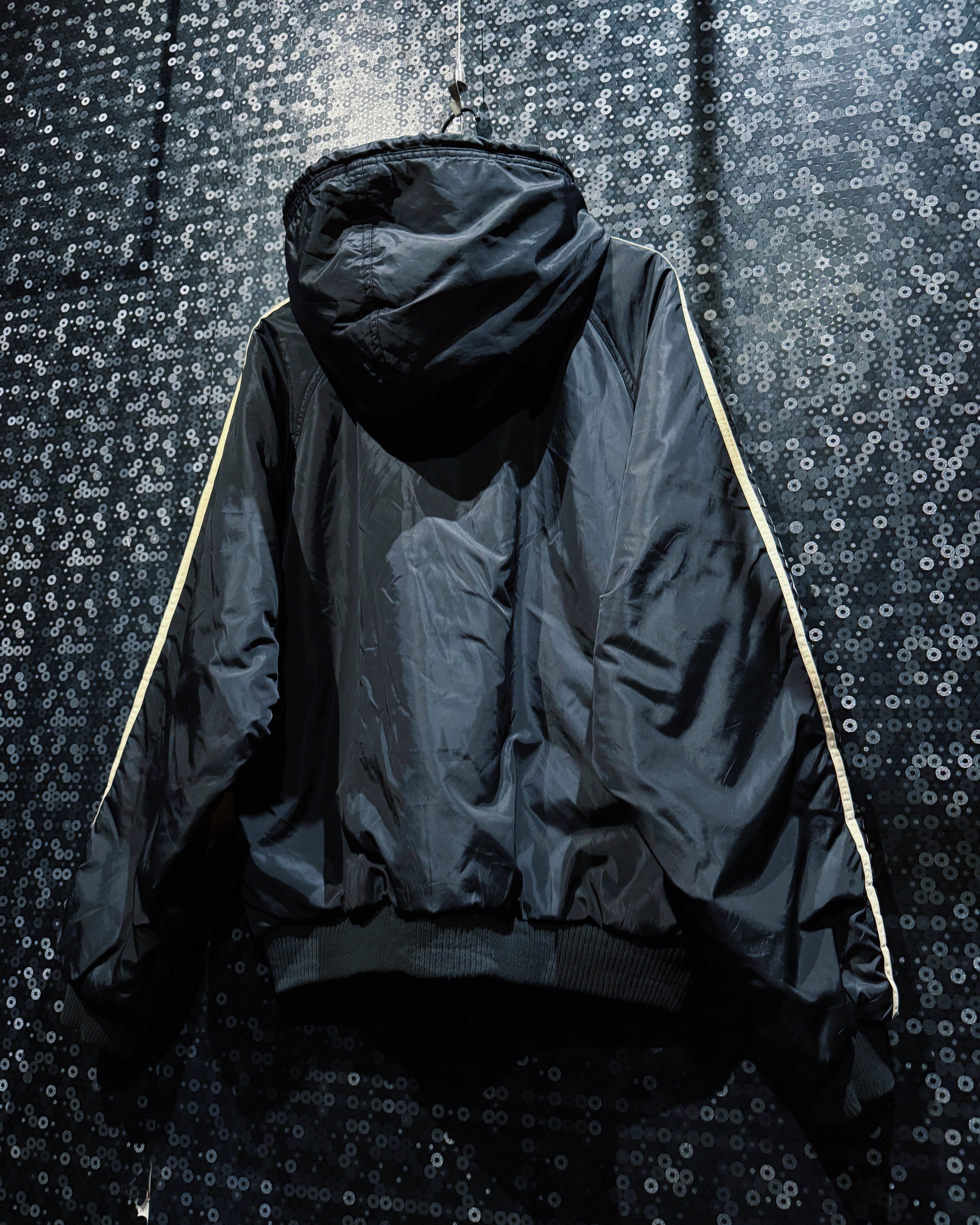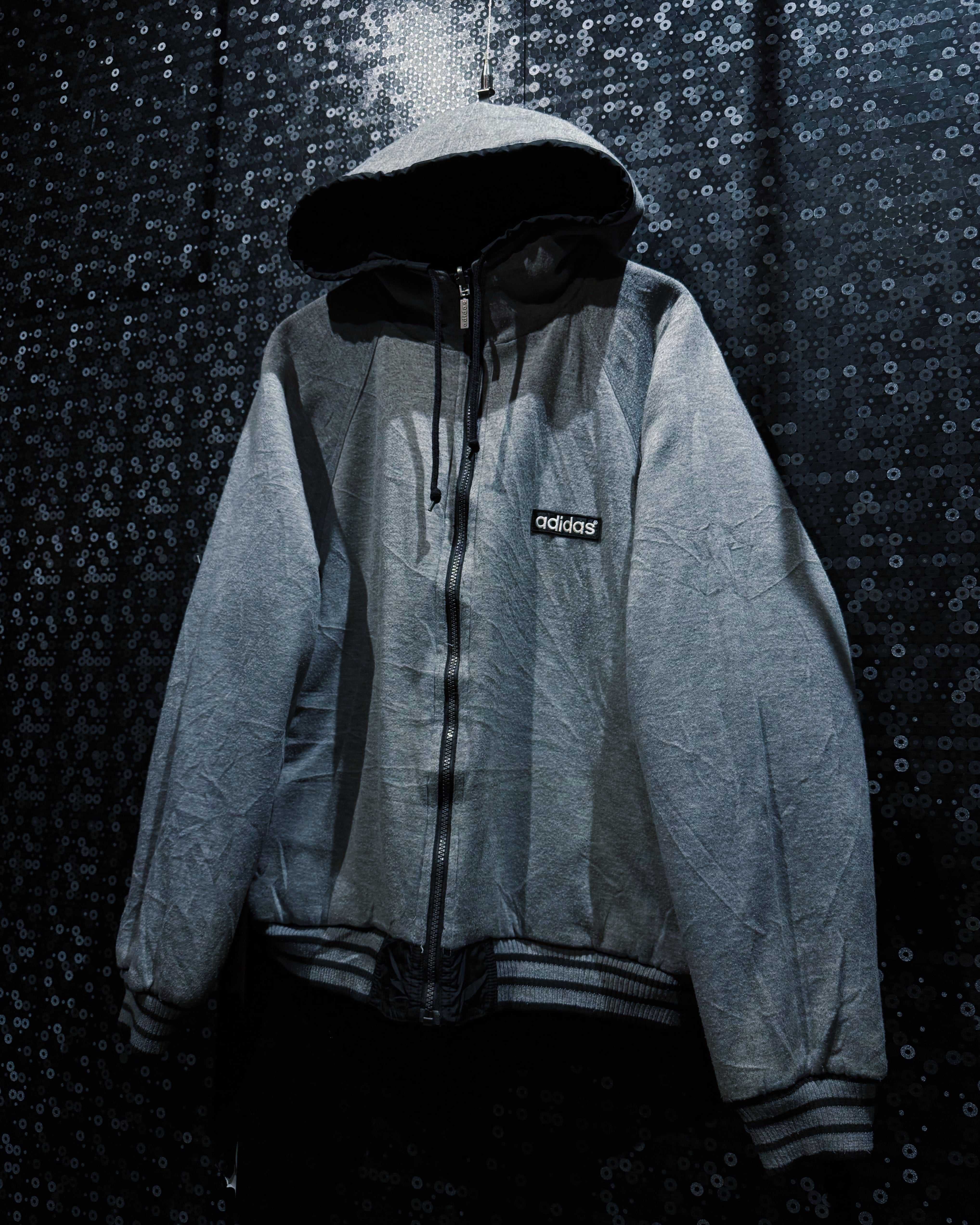 片面は3ストライプを大胆に走らせたブラックナイロンジャケット、もう片面はシンプルで重厚感のあるグレースウェットフーディーへと変貌する、1着で2着分以上の表情を持つスペシャルピース。