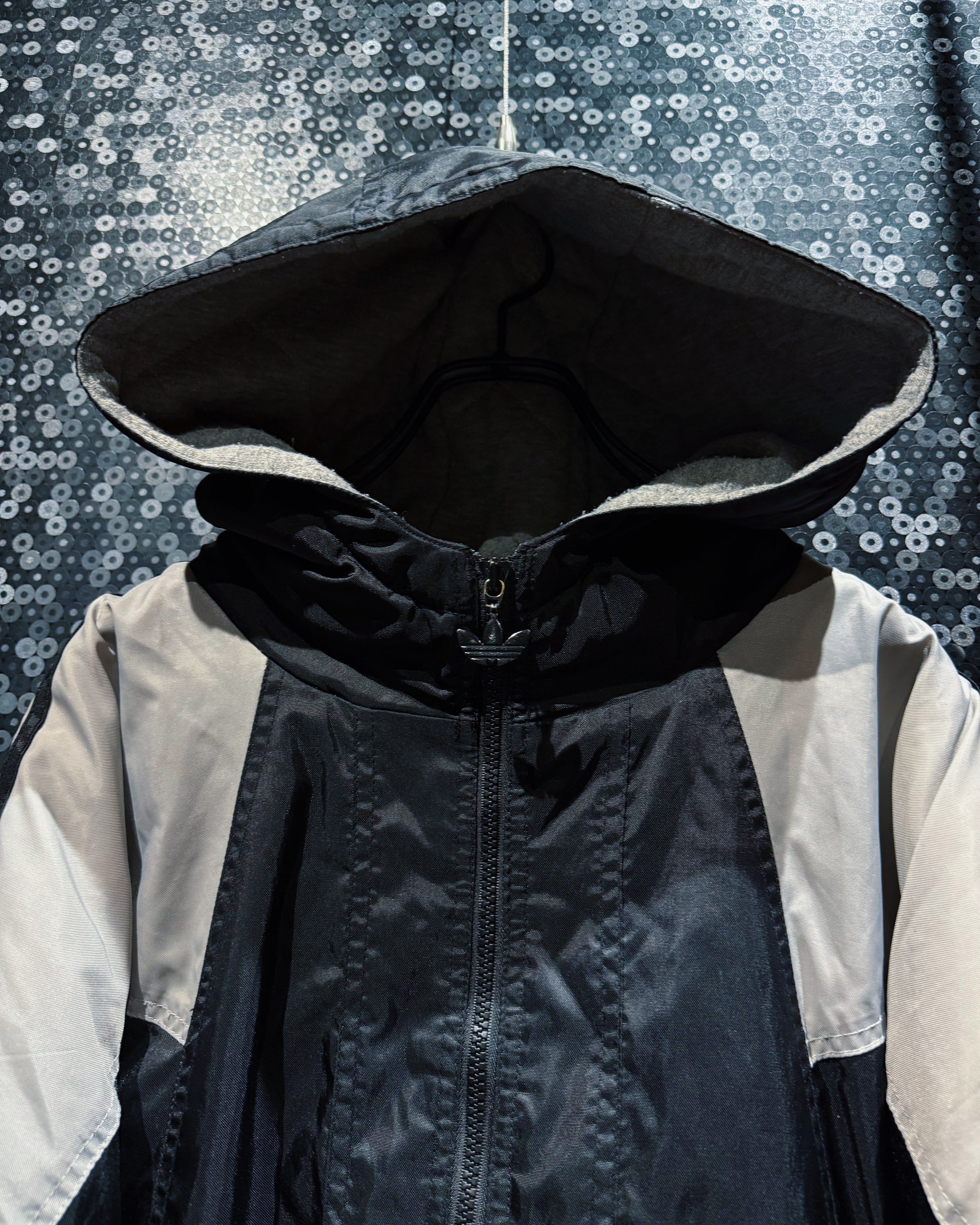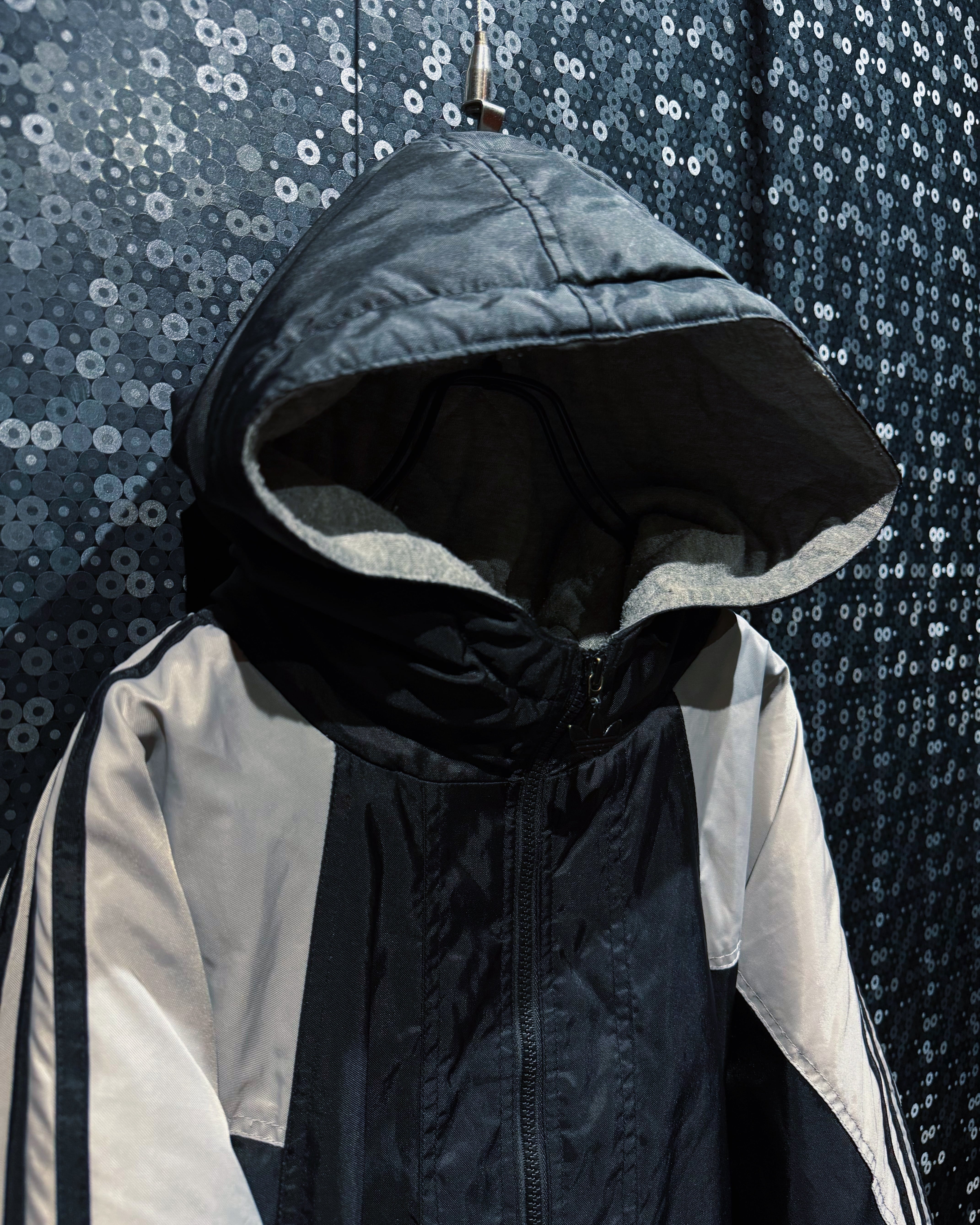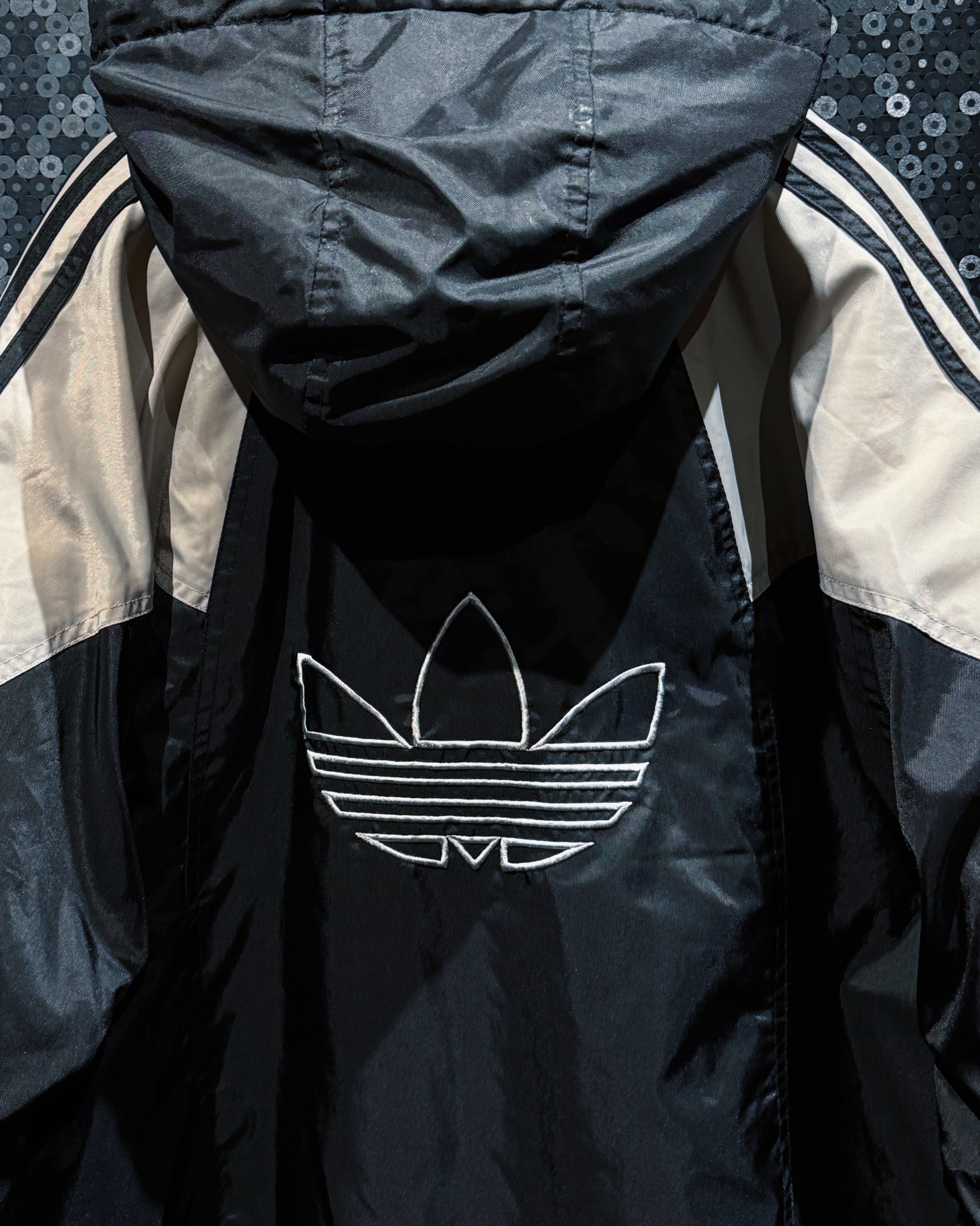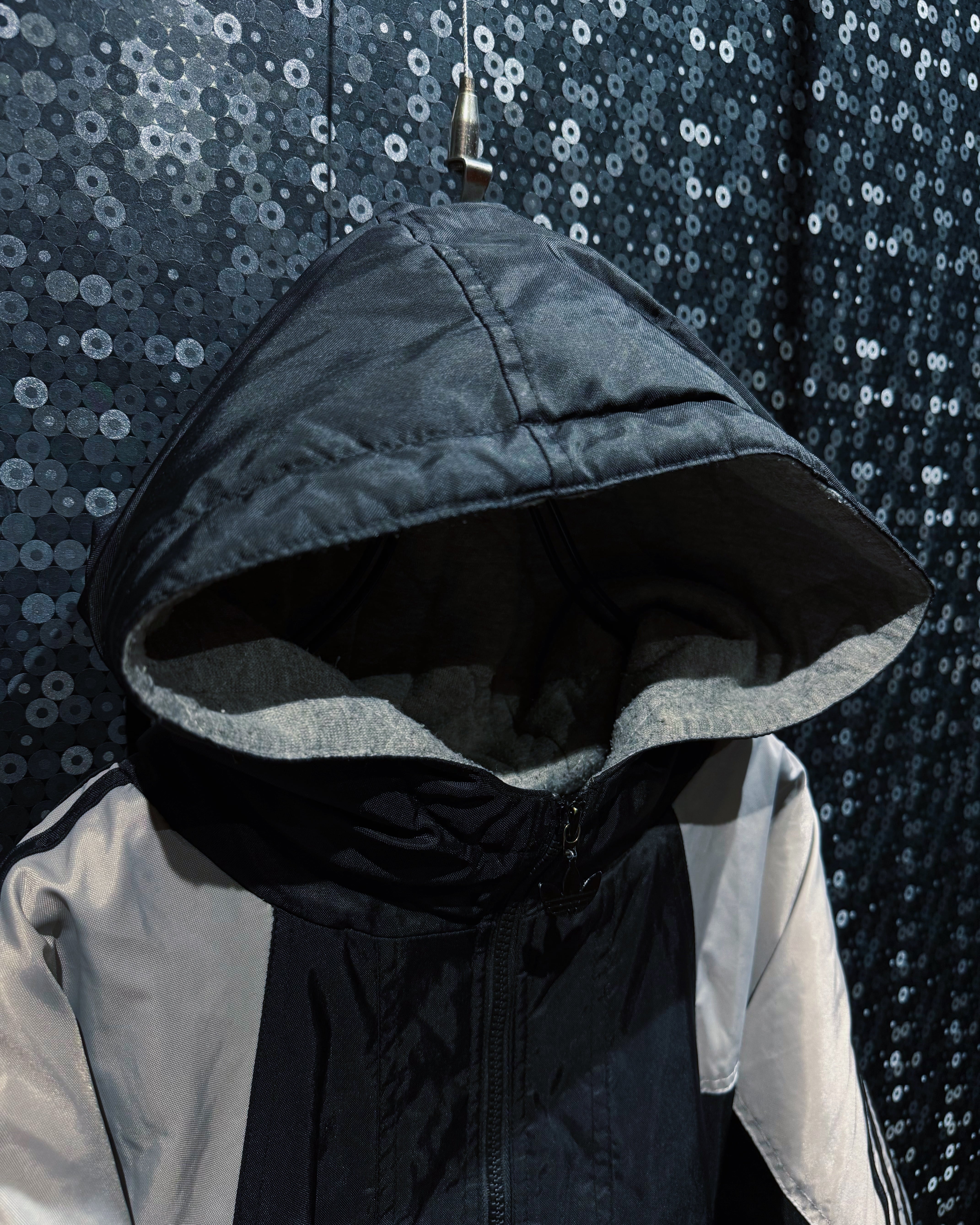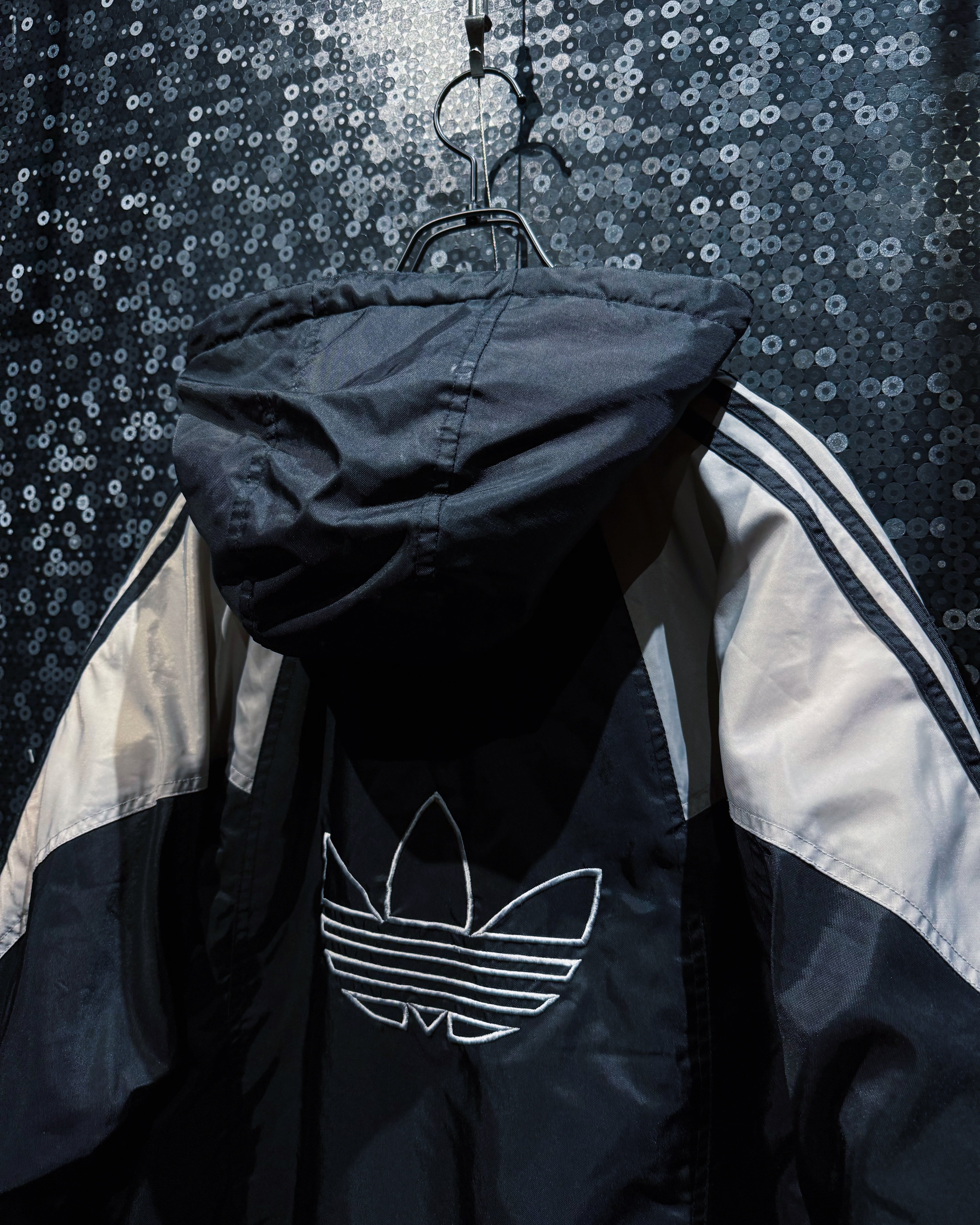 フード付きの90sナイロンジャケット自体が希少だが、その中でもこのブラック×ホワイトの切替構成はストリートで圧倒的人気を誇る黄金配色。袖のホワイトブロックと3ストライプは視覚的に腕のラインを強調し、ボディの黒とのコントラストでシルエットがよりシャープに映える。実際に着たときの立体感、肩幅の広がり方、袖の落ち感など、90sアディダス特有の“ゆるく強いシルエット”が完璧に表現されている。