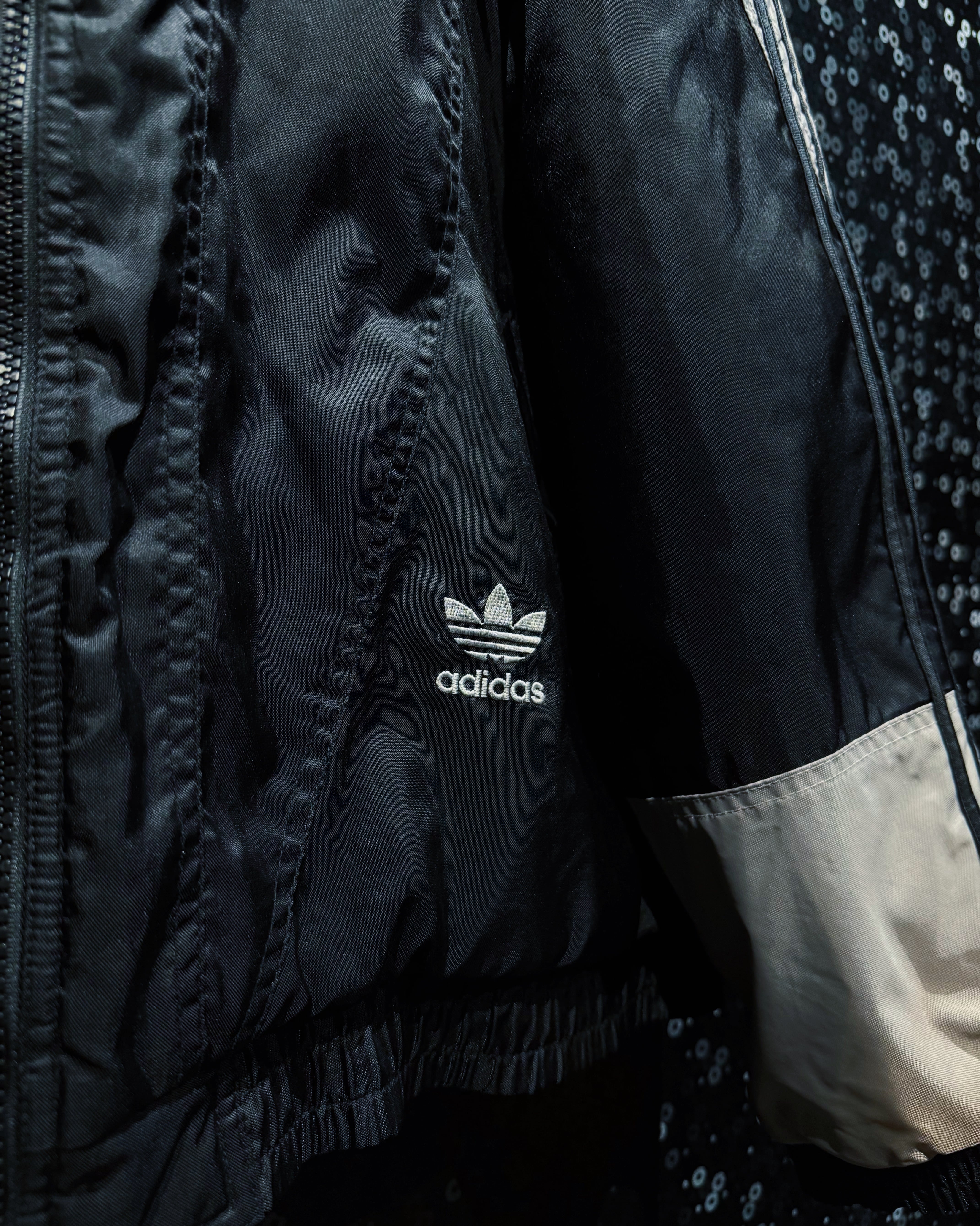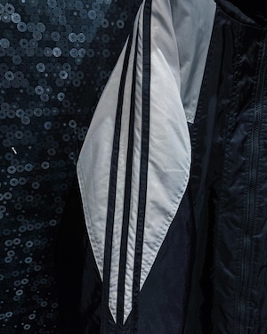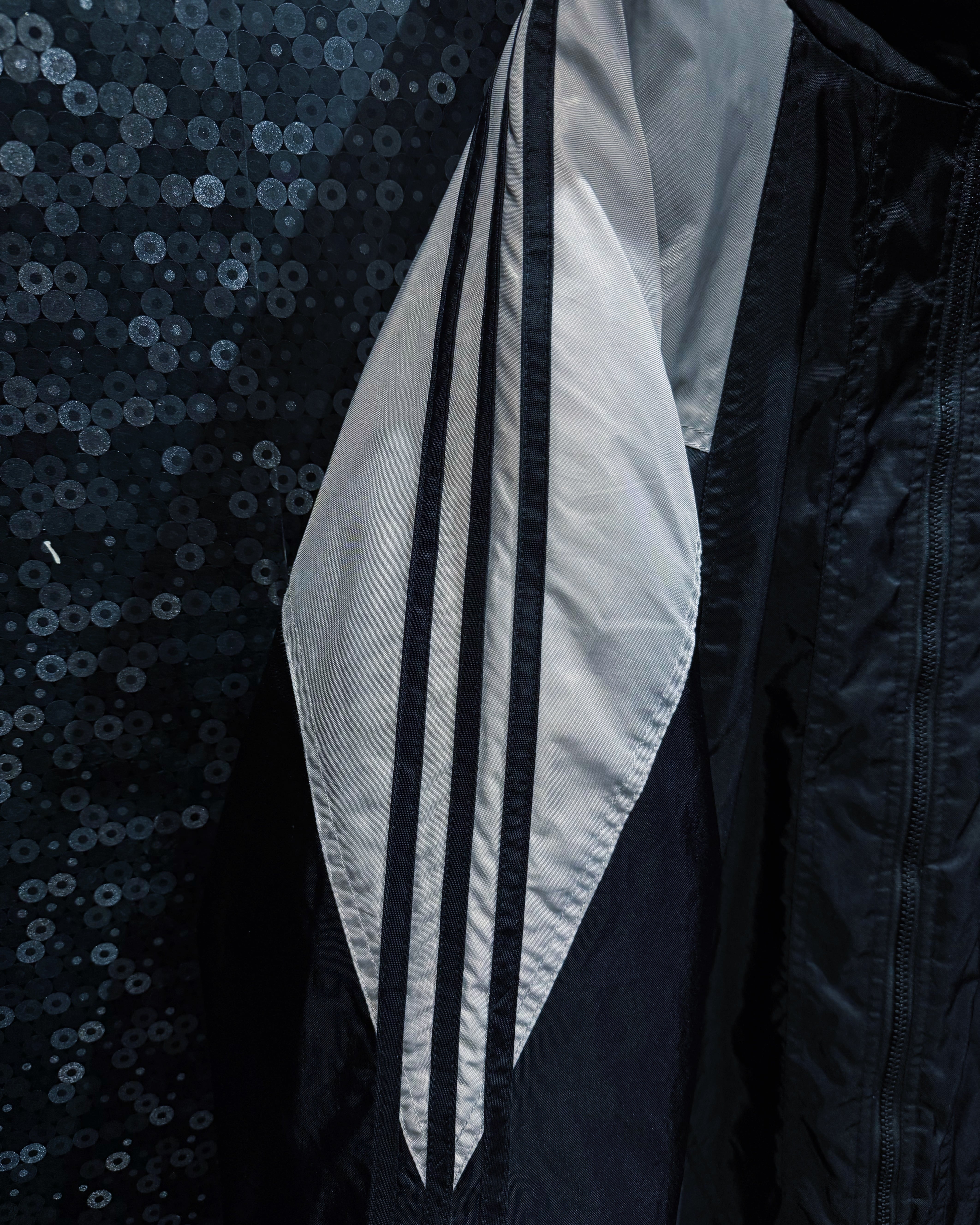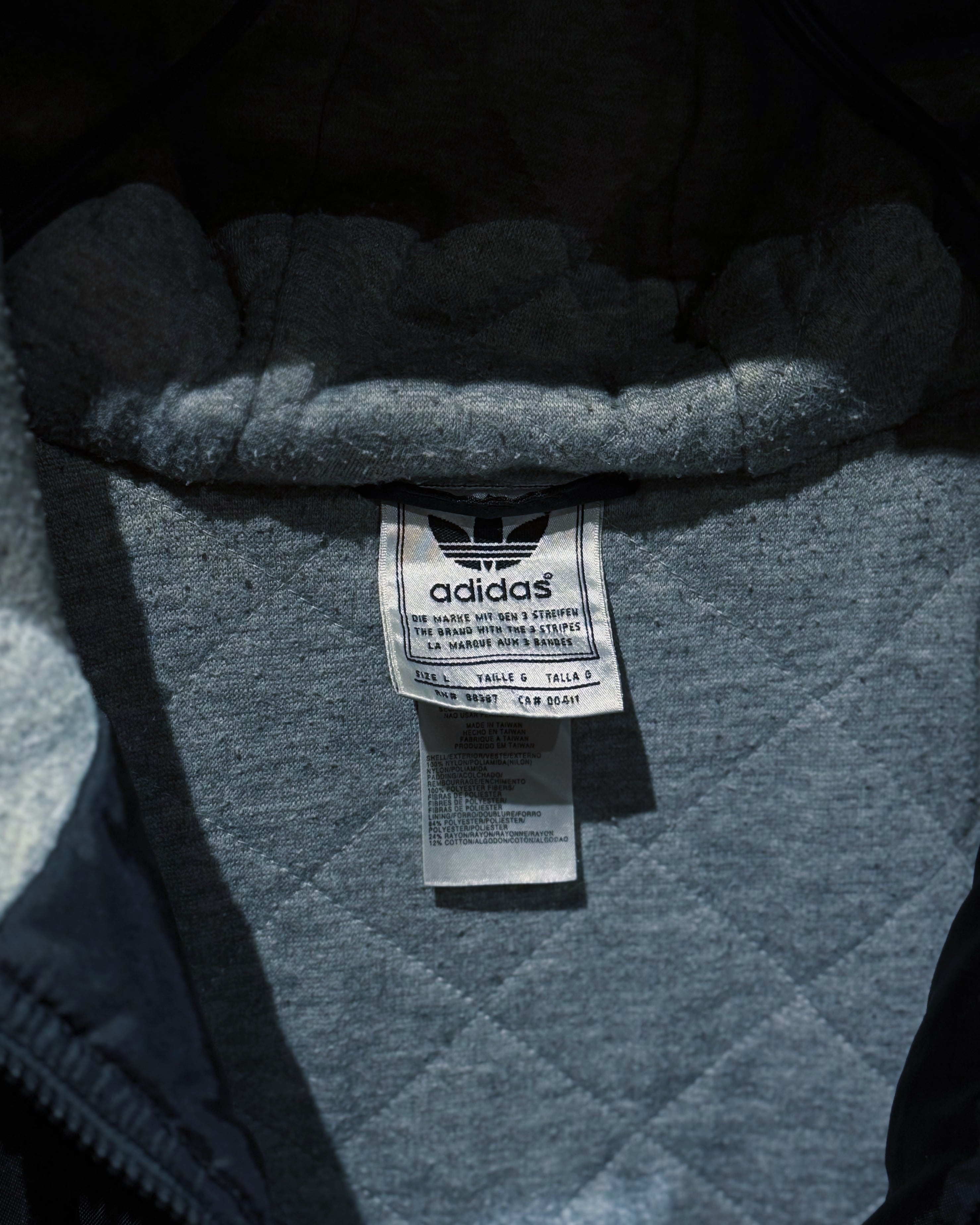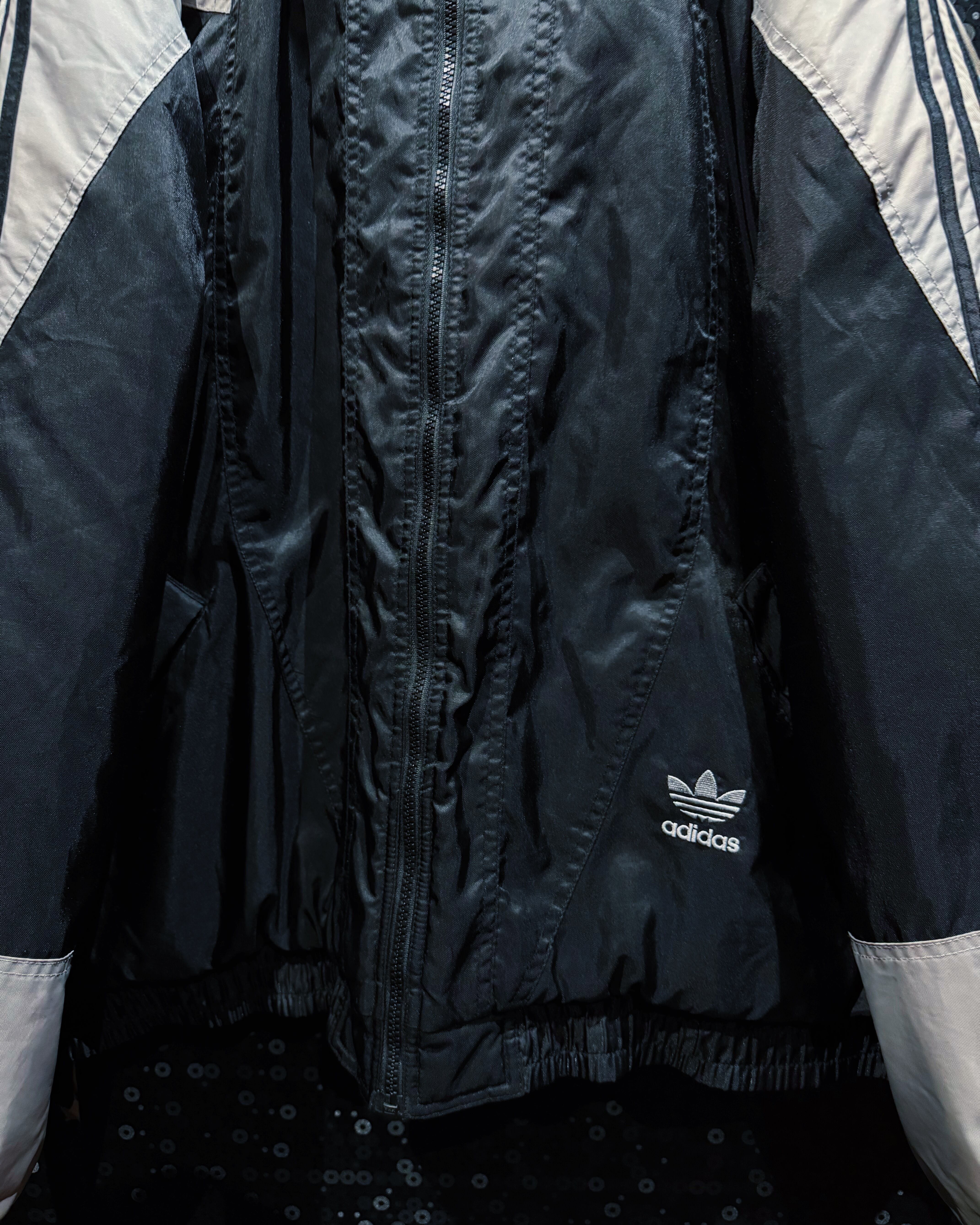 フード付きの90sナイロンジャケット自体が希少だが、その中でもこのブラック×ホワイトの切替構成はストリートで圧倒的人気を誇る黄金配色。袖のホワイトブロックと3ストライプは視覚的に腕のラインを強調し、ボディの黒とのコントラストでシルエットがよりシャープに映える。実際に着たときの立体感、肩幅の広がり方、袖の落ち感など、90sアディダス特有の“ゆるく強いシルエット”が完璧に表現されている。