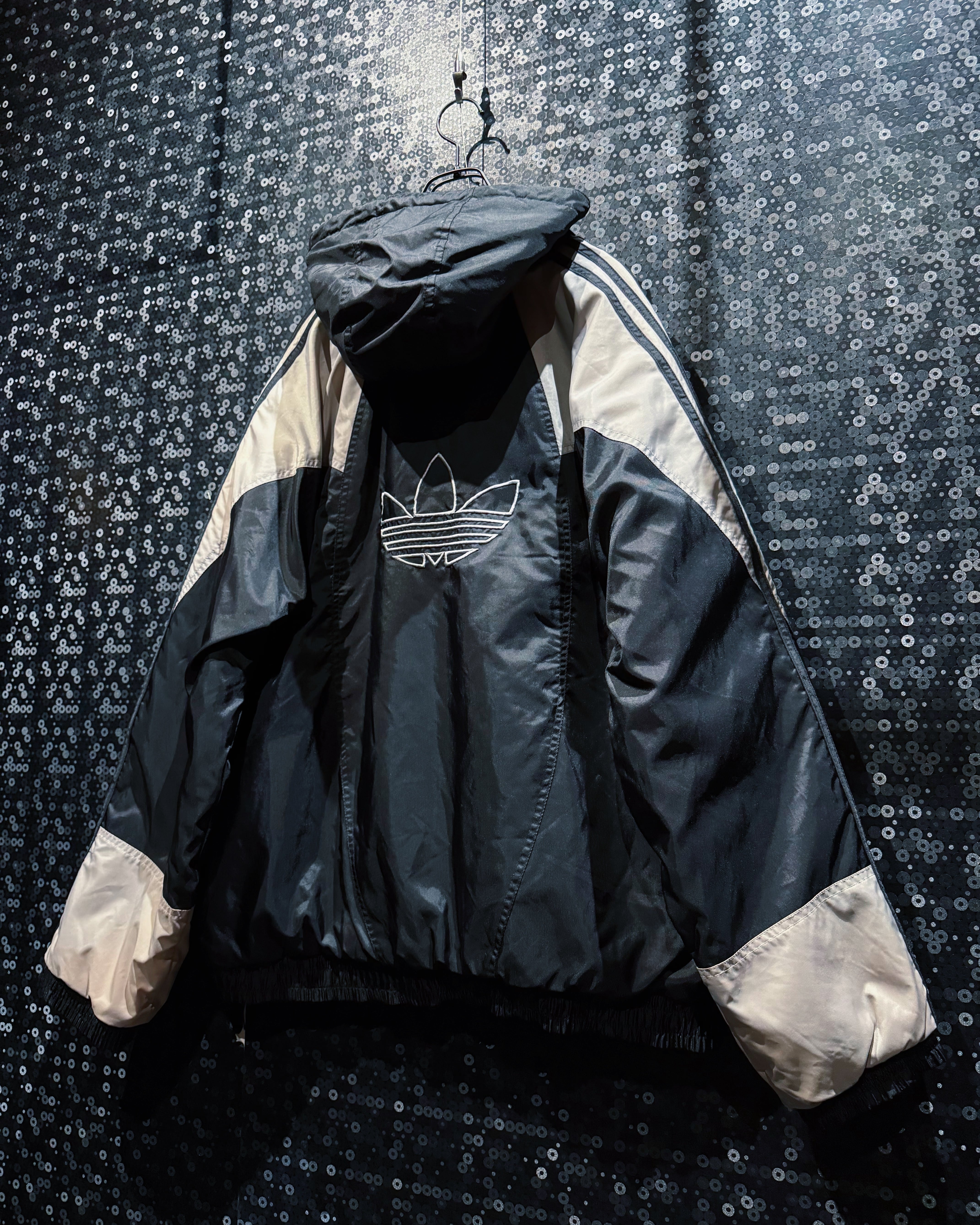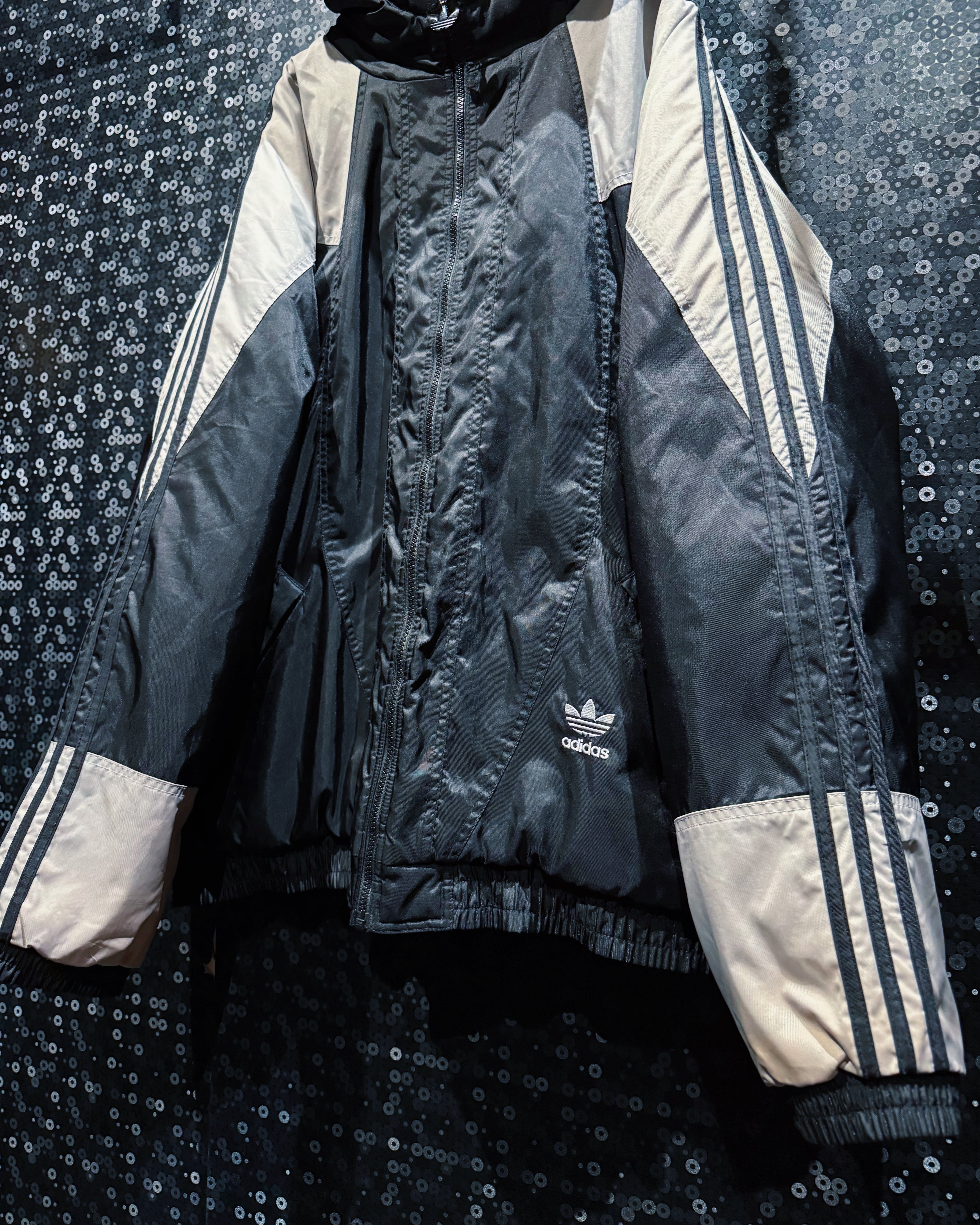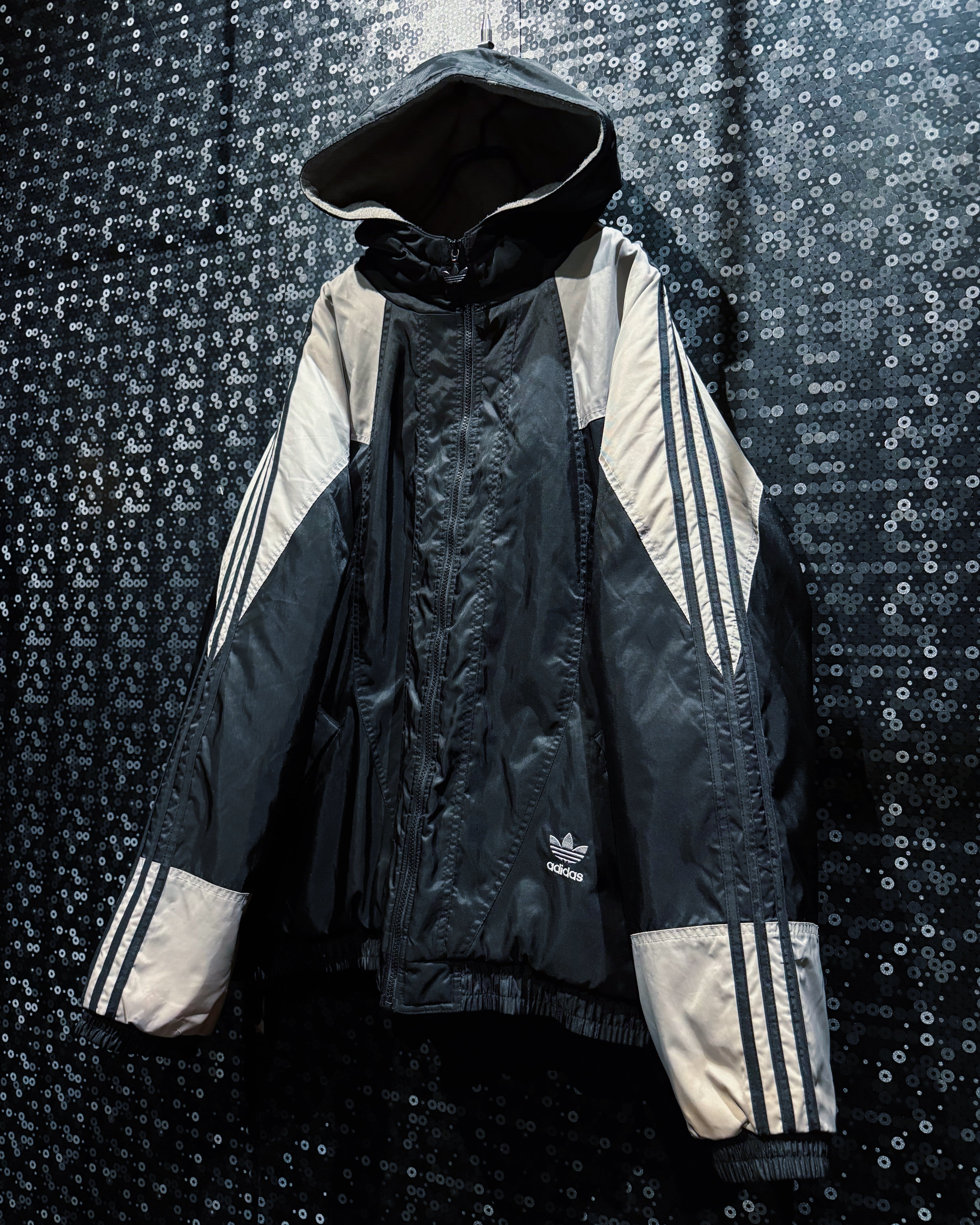 ブラックを基調に、袖から肩にかけて大胆なホワイト切替と3ストライプを落とし込んだ、アディダスオリジナルスの“重厚フーディー型ナイロンアウター”。胸にはホワイトのトレフォイル刺繍、ボディはしっかり厚みのある中綿仕様で、通常のナイロンジャケットよりも“アウター寄り”の存在感と保温性を備えた一本。